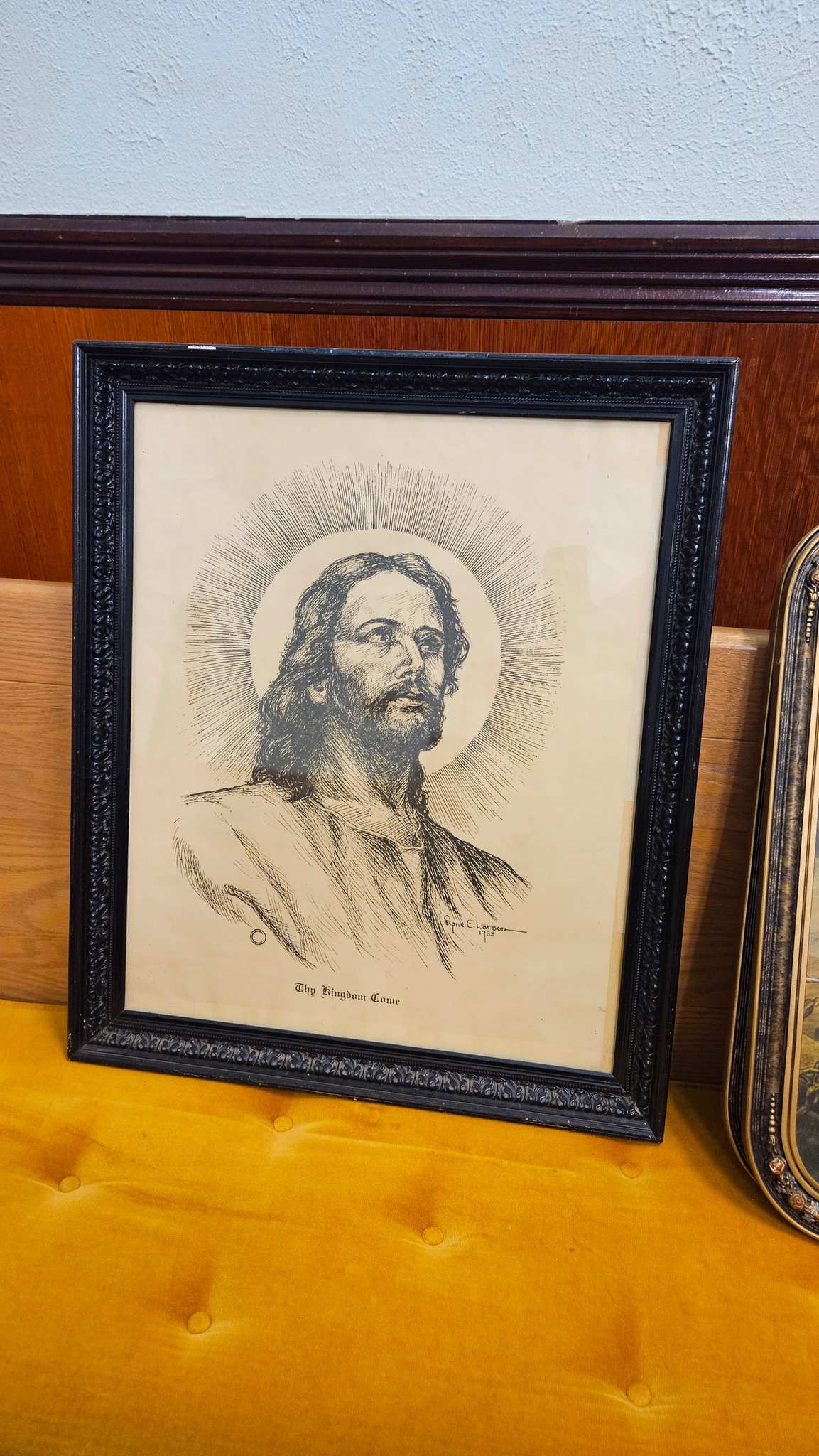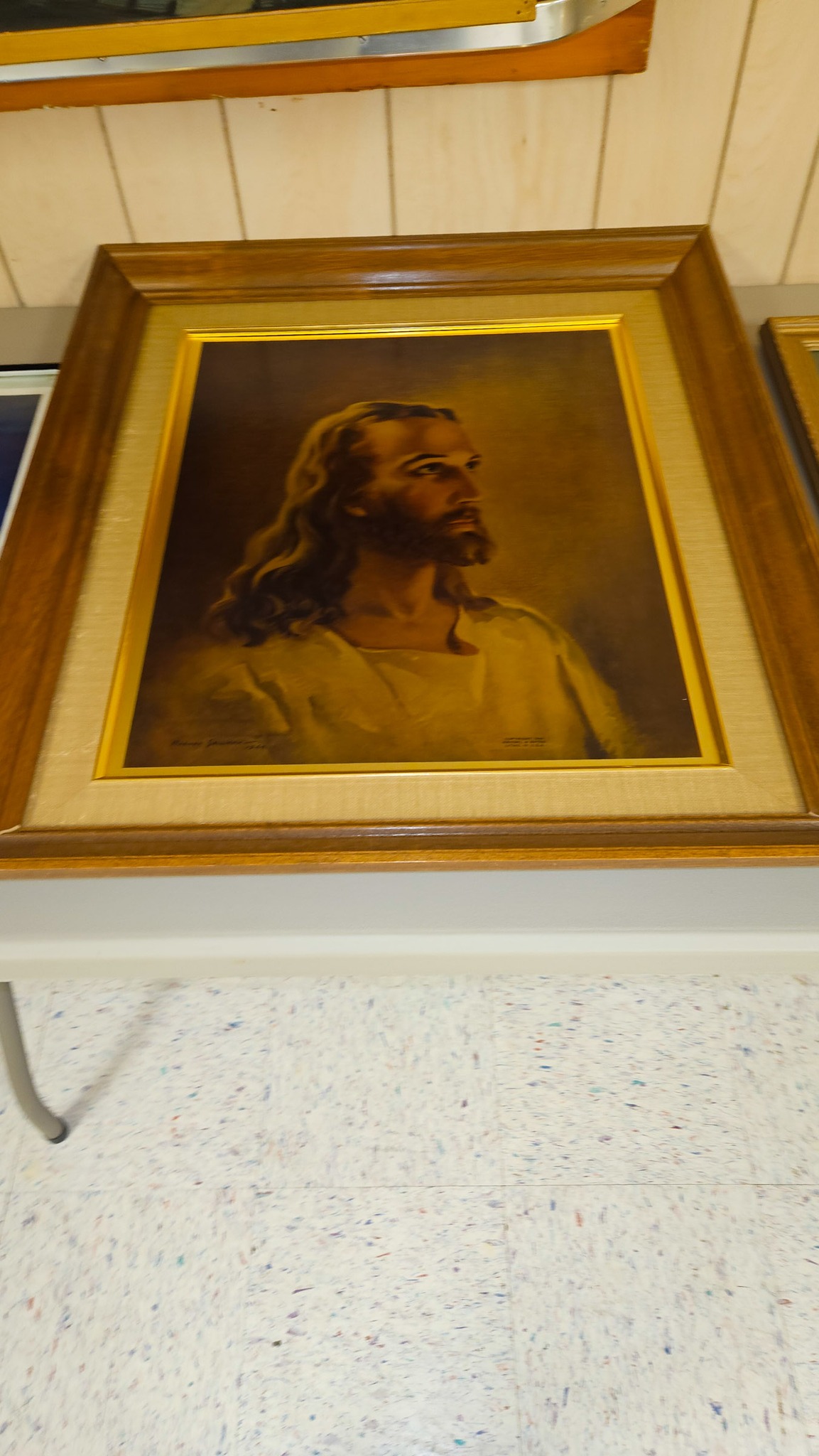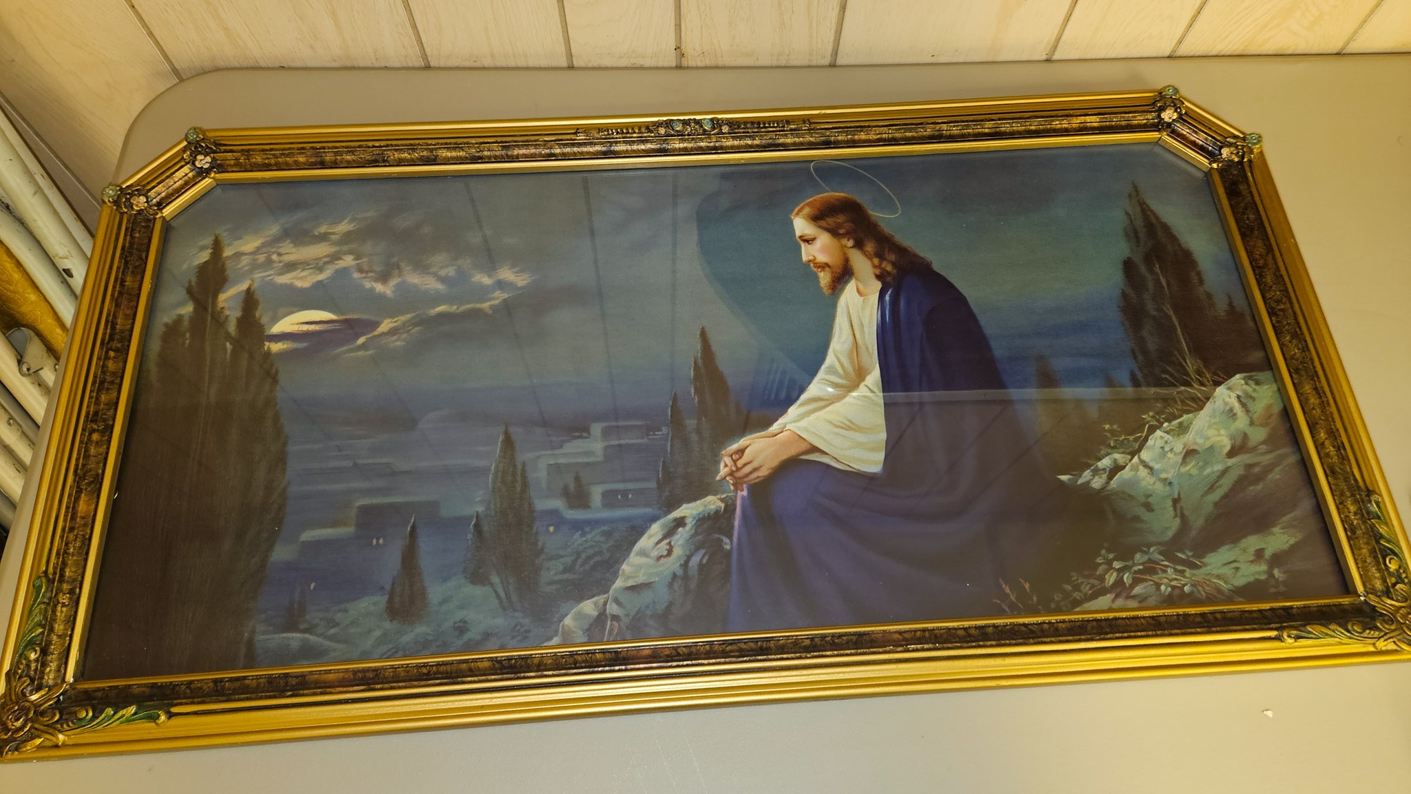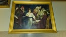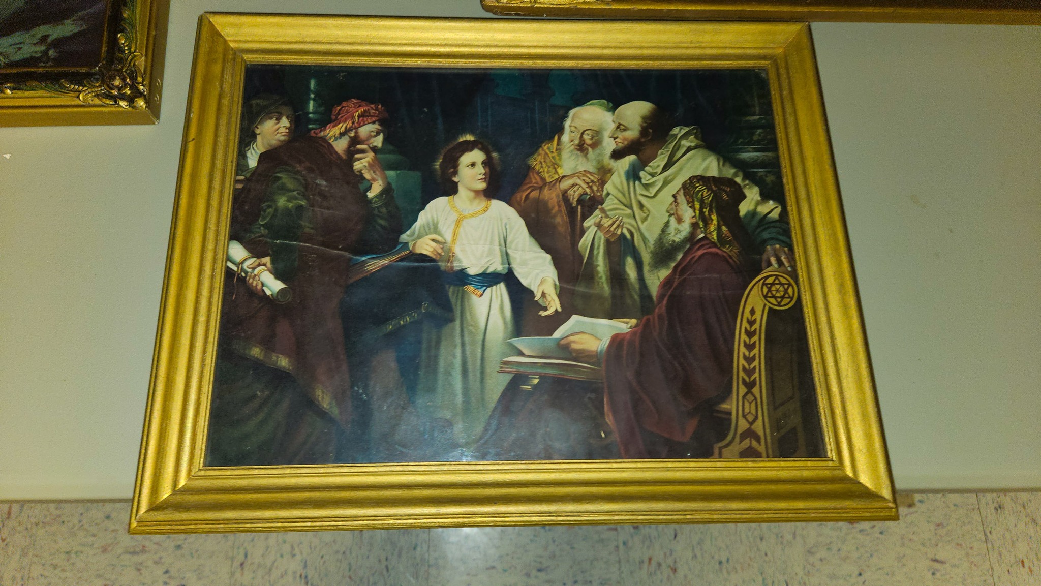 Several pictures; Jesus looking down on the town 32"x16", Gold framed last supper 24"x16", The Lord is my Shepherd 20"x17", Jesus 28"x24", young Jesus 22"x18", Ten Commandments 18"x10", Young Jesus with scholars 18"x14",