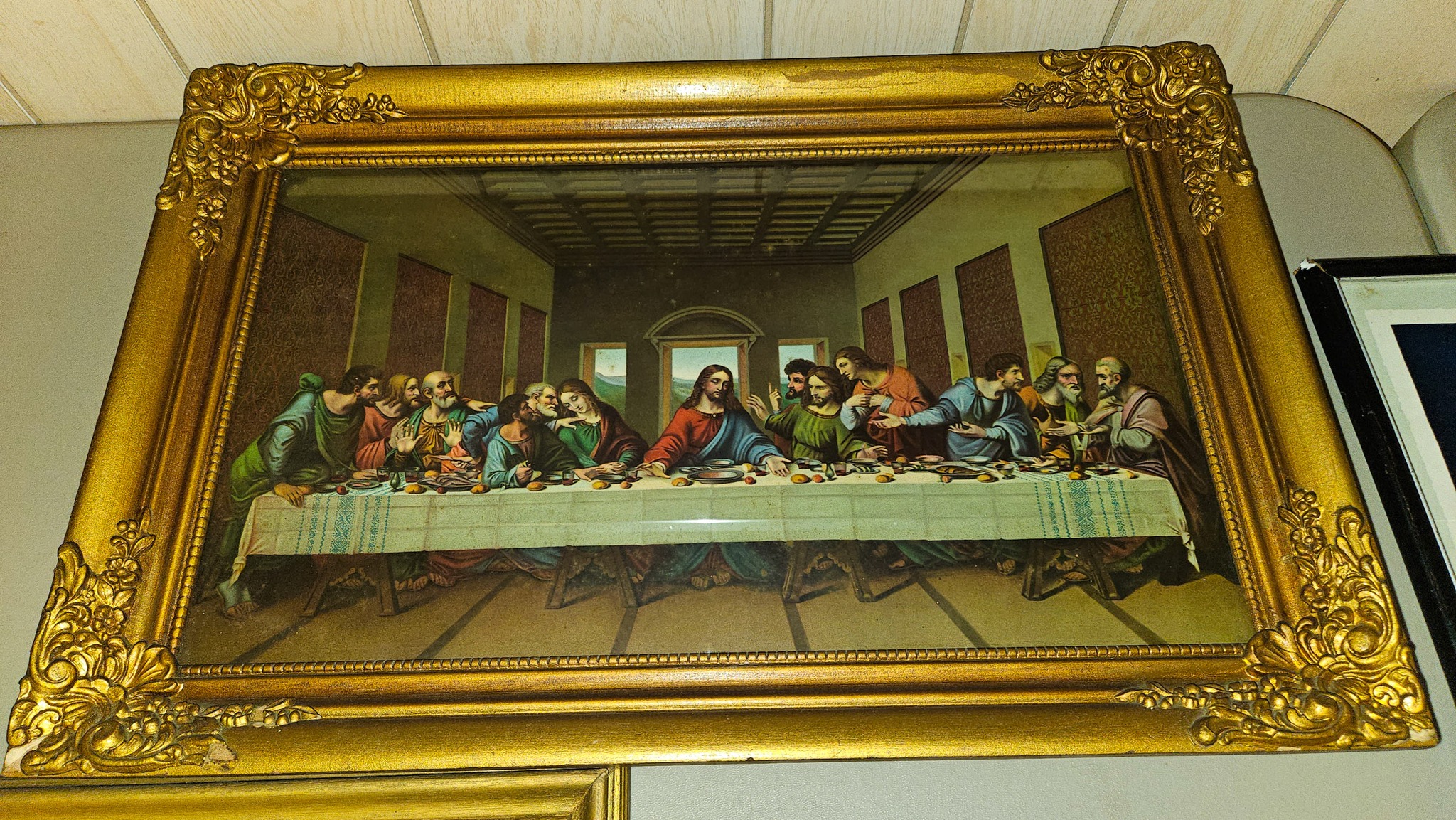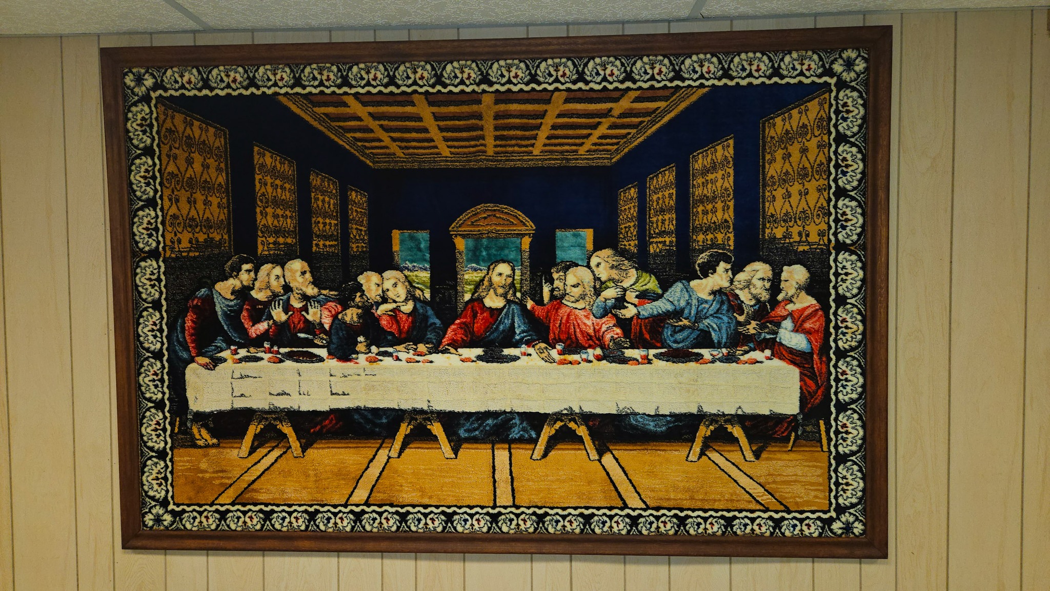 Large tapestry of the last supper with wood frame 77 ½ x 51 ½