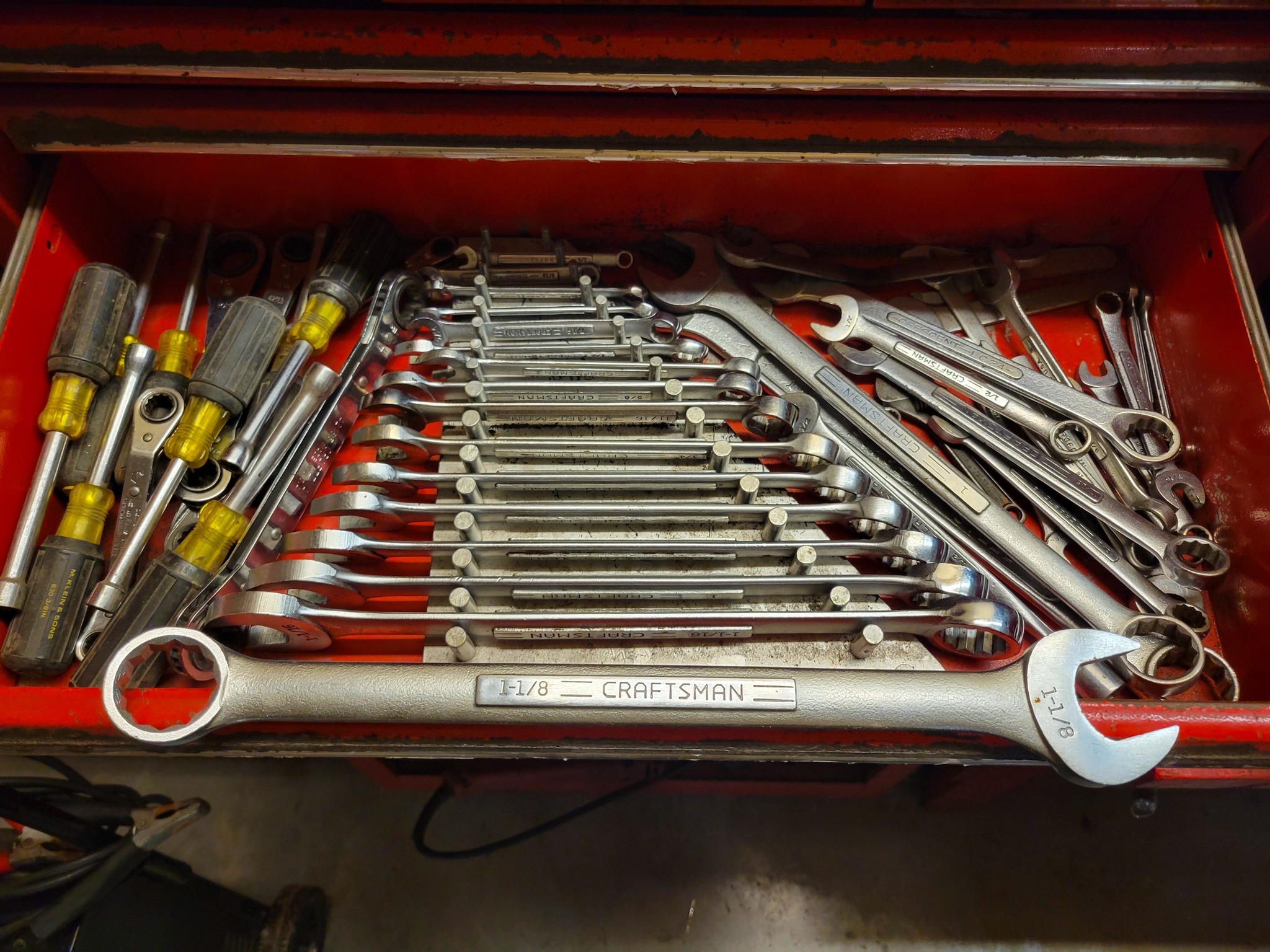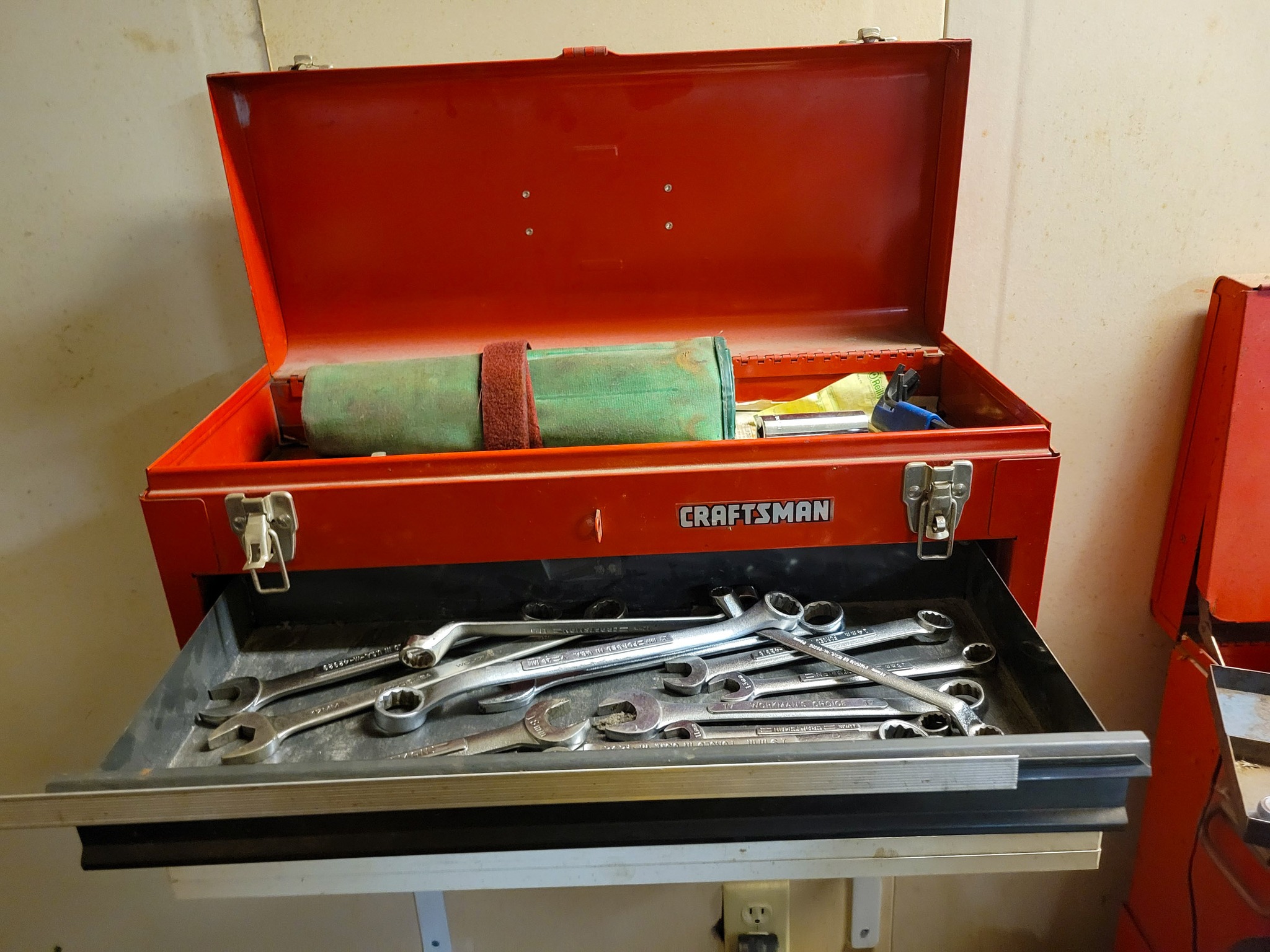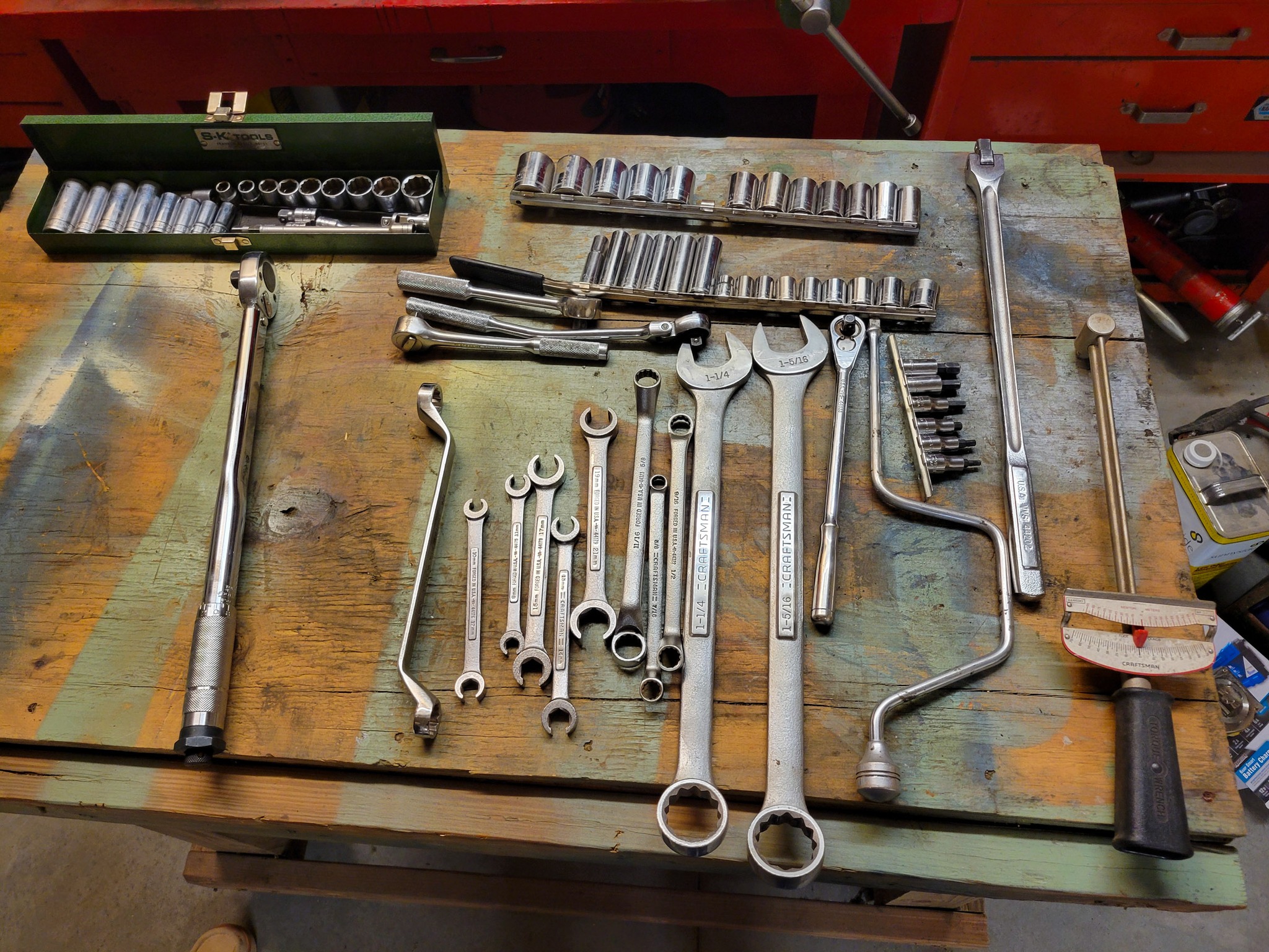 Craftsman: ½ in break over bar, 3 / 8 drive ratchets, open end wrenches 5 / 16- 1 5 / 16, tubing wrenches, sockets, 15" drill press.