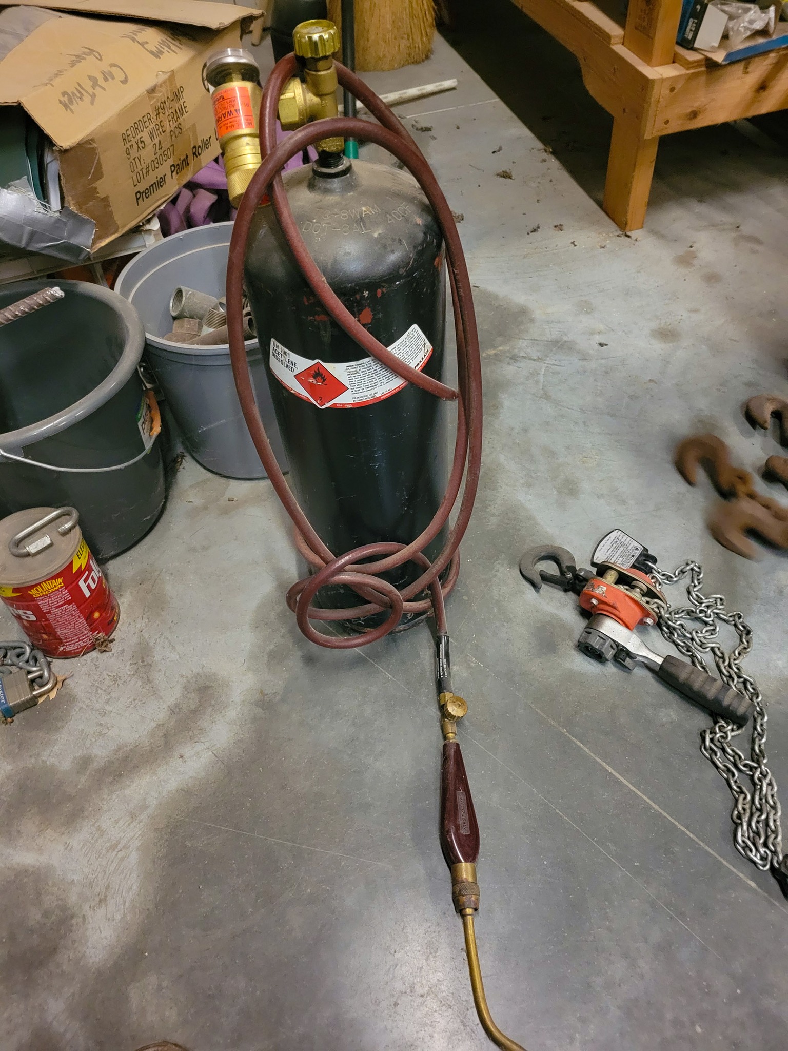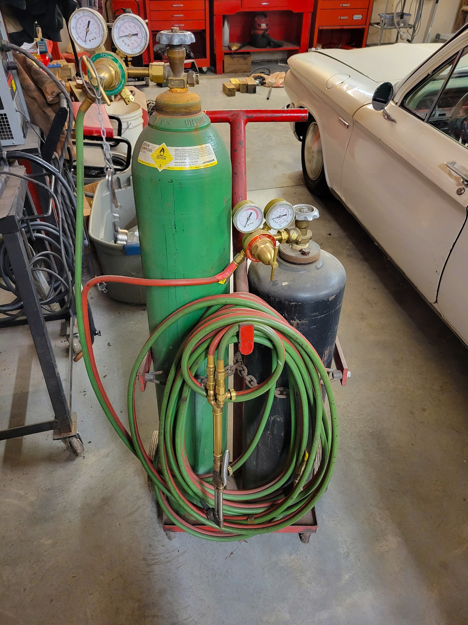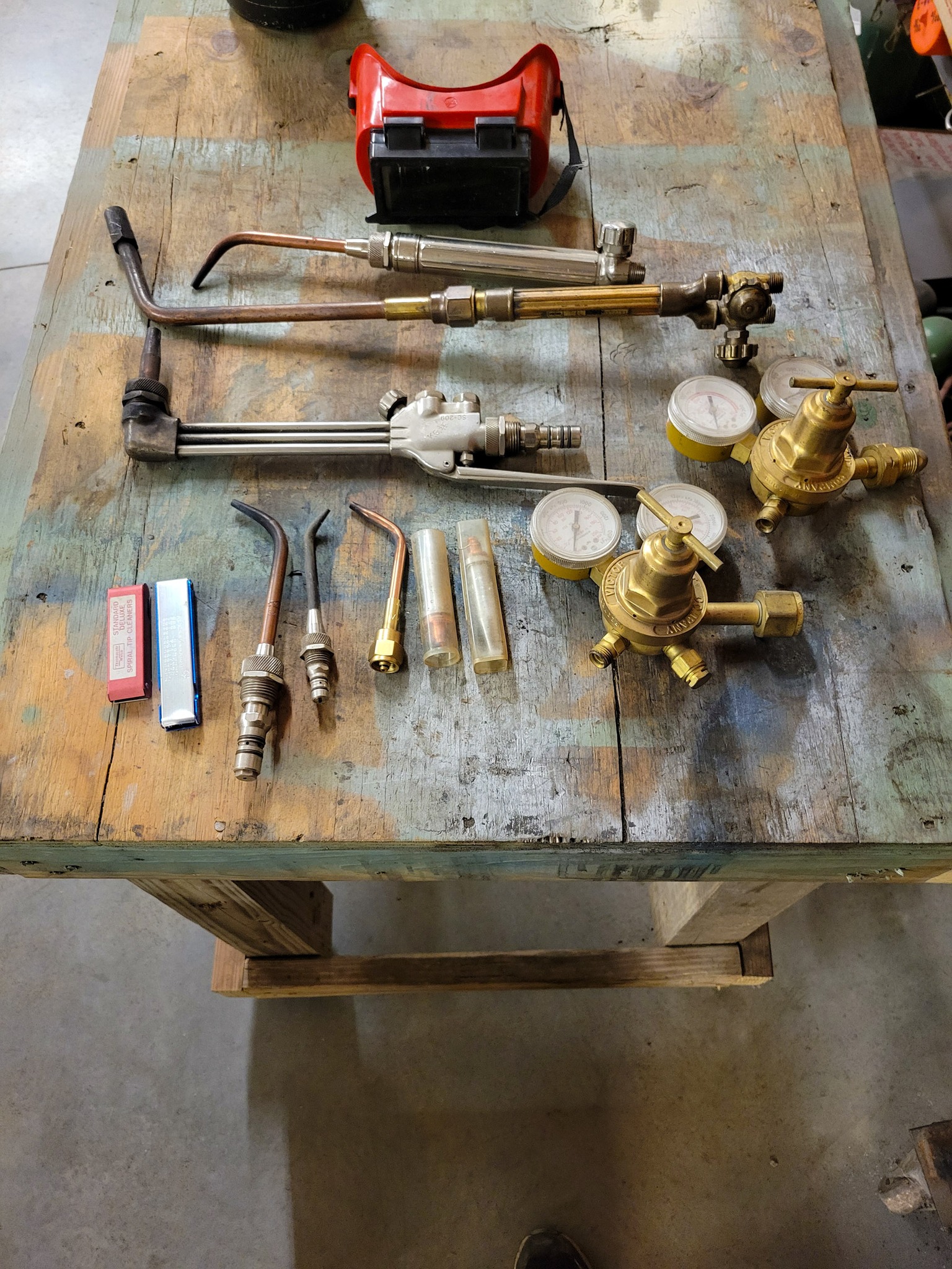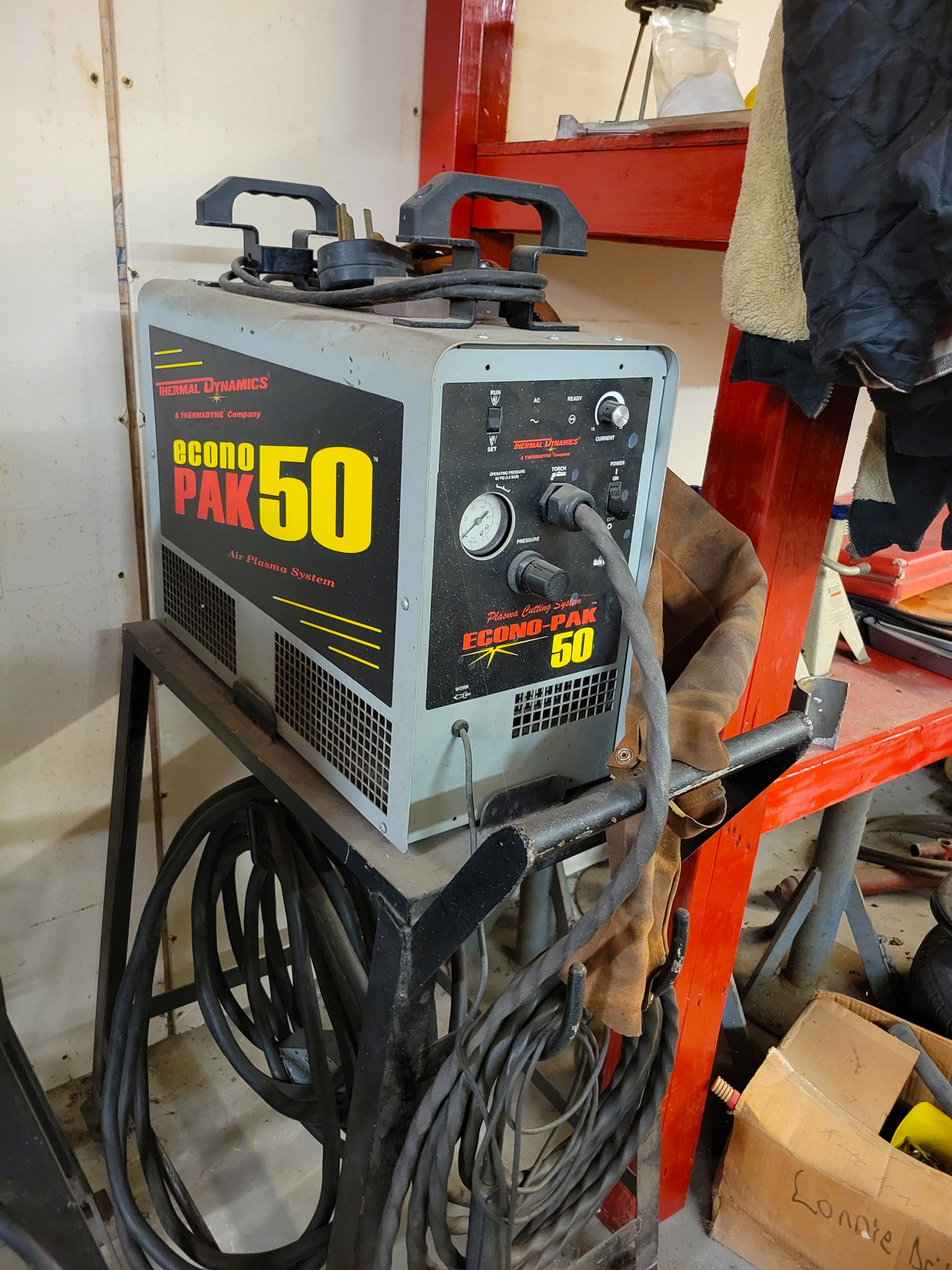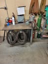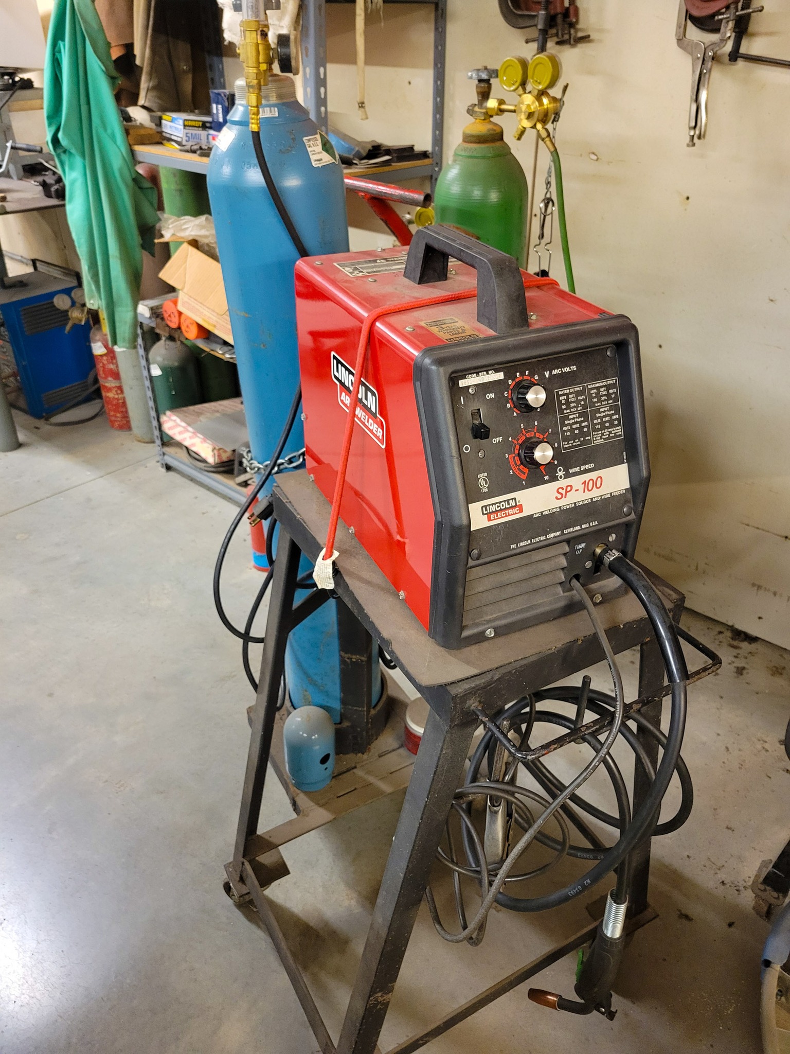 Welding: Lincoln SP-100 Mig welder w/ cart and gas bottles, gloves, rods, helmets, welding supply, TIG rod, Oxy and acetylene torch w/ cart, leathers, Econo-PAK plasma cutter, heavy welding table, oxy and acetylene torch bottles, acetylene torch, miller Thunderbolt AC / DC welder, oxy-acetylene gauges and hoses, grinding and buffing disks.