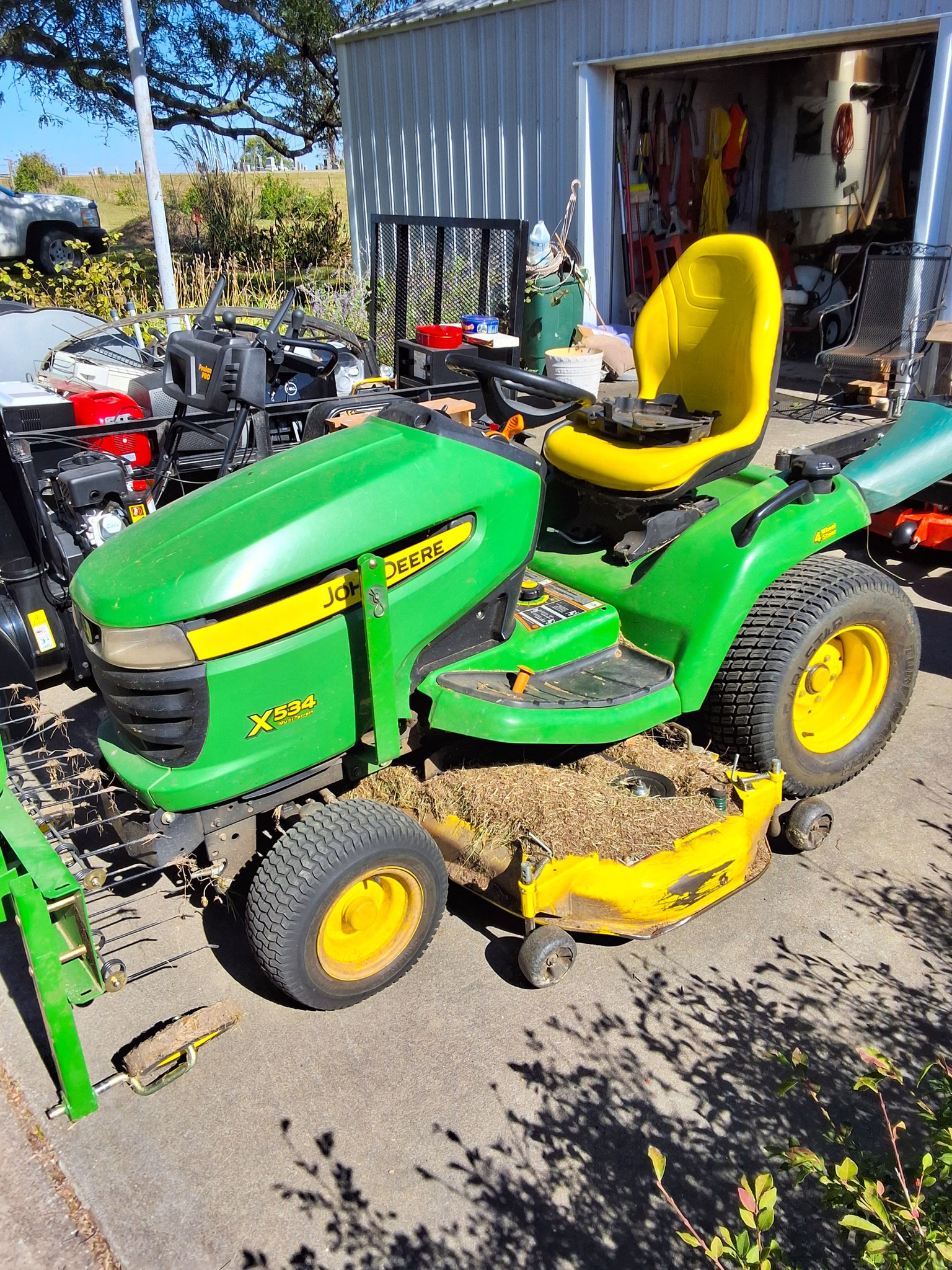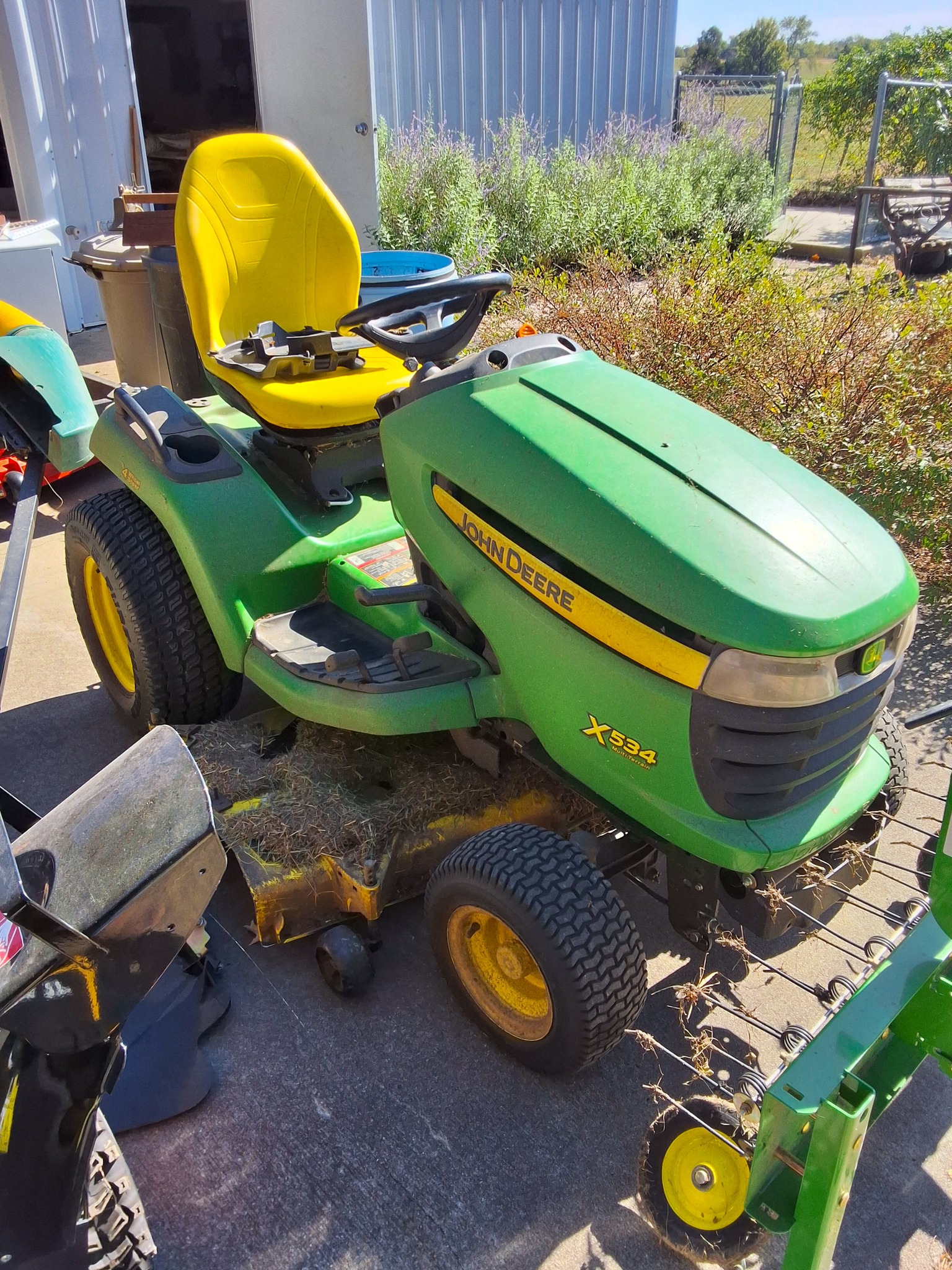 John Deere X534 multi-terrain lawnmower, new tires, 1341 hrs. Hydrostatic drive, hydraulic deck lift, Kawasaki engine, 4 wheel steer, 54”