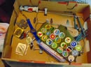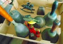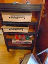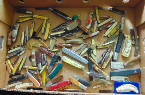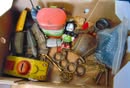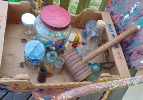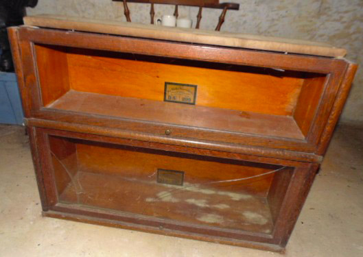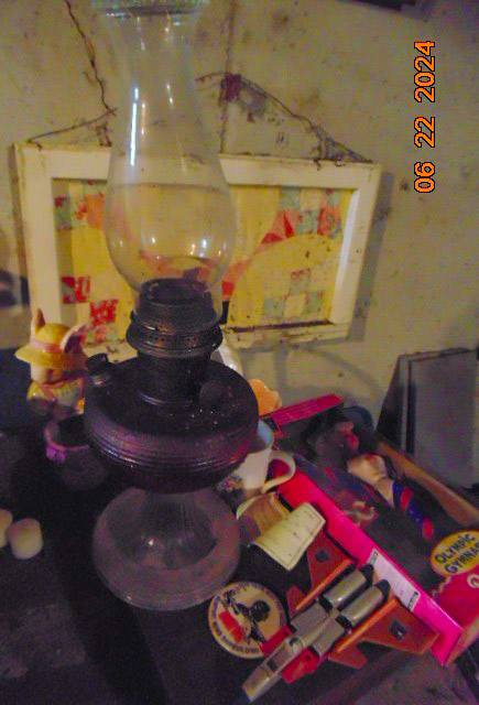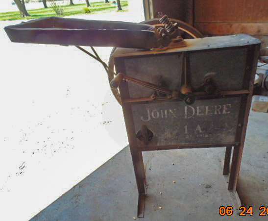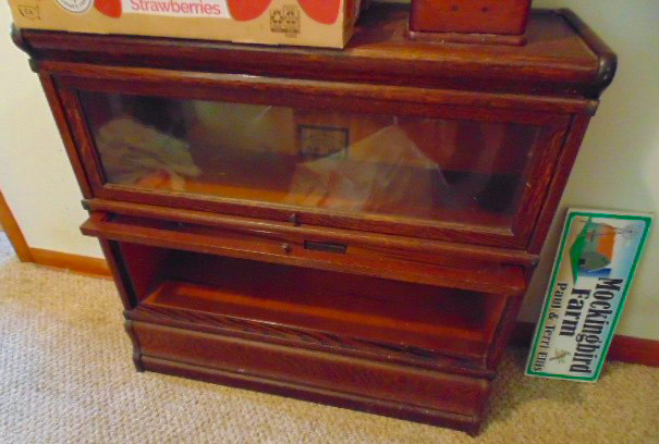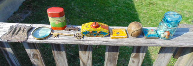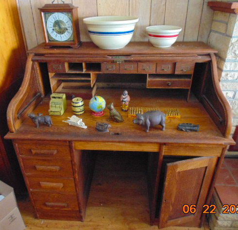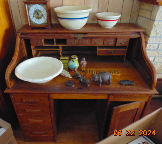 Collectibles: Lucky Joe Bank; cast iron dog bank; tank bank; child's flat iron; lg cheese box; 2 & 4 section lawyer's bookcases; leaded glass window; 1962 scrapbook; 1963 & 1968 Bulldog yearbooks; sm Baldwin City Hardware display case; sm Coca-Cola bottle in case; 2 Aladdin oil lamps; Puss & Boots creamer; wood handled mixers, green glassware; refrigerator water bottles; Longaberger baskets; Wagner 0-1059G cast skillet; porc. Chamber pot, 64 oz meas cup; alum tea kettle; knife block; cookie cutters; Oak roll top desk; #5 crock jug; lg meat grinder; glass milk jugs; Roseville, Ohio 8 qt bowl; 2 1 gal crock jugs & small crocks; cast iron cow & pig; many pocket knives; USA 1135 vase; brass bells; 5 gal glass bottle; hand stitch quilt; 1859 & up books; brass microscope in Oak case; Boy Scout items; chain purse; Raleigh & Piper Herdseick tins; very old, raised seam baseball- see pic; egg basket; nutcracker; hay knife; five shovel; push garden cultivator; Mid America wire milk basket; well pulley; hay fork trolley; metal pulleys; wood door w/ glass; marbles-some shooters; bottles; 30 gal cast iron kettle; lg scythe; crosscut saw; metal bushel tub; wash tub; whiskey barrel; walking sticks;
