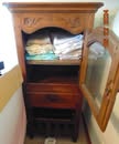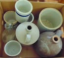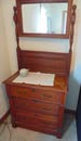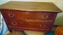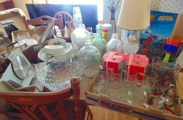 HOUSEHOLD: 2 sm chest freezers; Frigidaire & Hotpoint refrigerator; washer & dryer; Oak drop leaf coffee & end tables; cedar chest; dining table w/ 4 chairs; 50's kitchen table; Oak & other 2 drawer chests; 4 drawer chests; 2 recliners; 3 cushion sofa; sgl & dbl beds; wood side chairs; 50" & 70" tv's; 3 drawer chest w/ mirror-see pic; Oak rocker; folding chairs; small appliances; many pictures frames, knitting needles & knitted items; jelly, pint & quart canning jars; pots, pans & other kitchen ware; Red ring crock bowls; Oak bench; turkey fry pot; Pfaltzgraff items; Nesco food grinder; 16 lead crystal glasses & goblets; lg full sewing box;