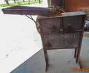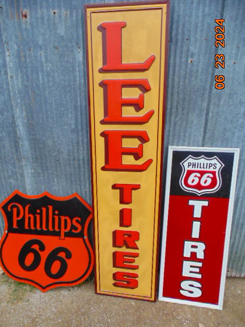 CONSIGNED: 2 sided Phillips 66 shield sign; Lee 7& Phillips 66 tire signs-see pics; sev Coleman lanterns & parts; flat & coal irons; #10 sprinkle can; old brass chandelier; 235 / 80R16 trailer tire, like new; 50 gal port fuel tank w/ pump; shaper; joiner; sm propane tanks; JD corn sheller; propane space heater; steel traps; lg oxygen bottle; Mantis tiller; Crosley hub cap; dial & digital calipers-NIB;