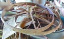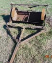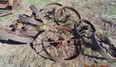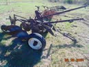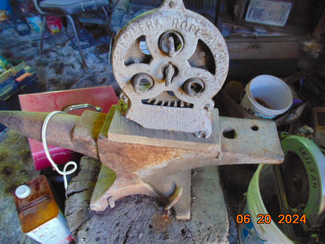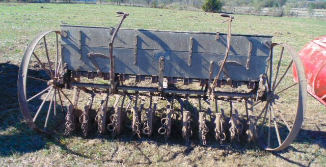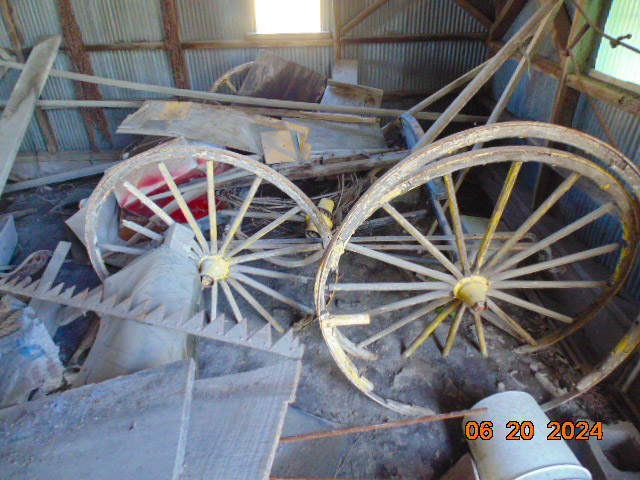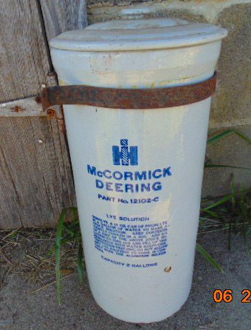 COLLECTIBLES: forge, anvil, post vise & drill; mach tool boxes; road signs; 10 gal milk cans; McCormick Deering lye crock- see pic; Van Brunt steel wheel, wood box, grain drill-nice; horse drawn sleigh; round & square wash tubs; tumble bug; Sears 1950's bike-nice; F-20 rear mech lift; 2 dinner bells; buggy frame- needs repair; sm wood stove; 10 iron wagon wheels; IH seats.