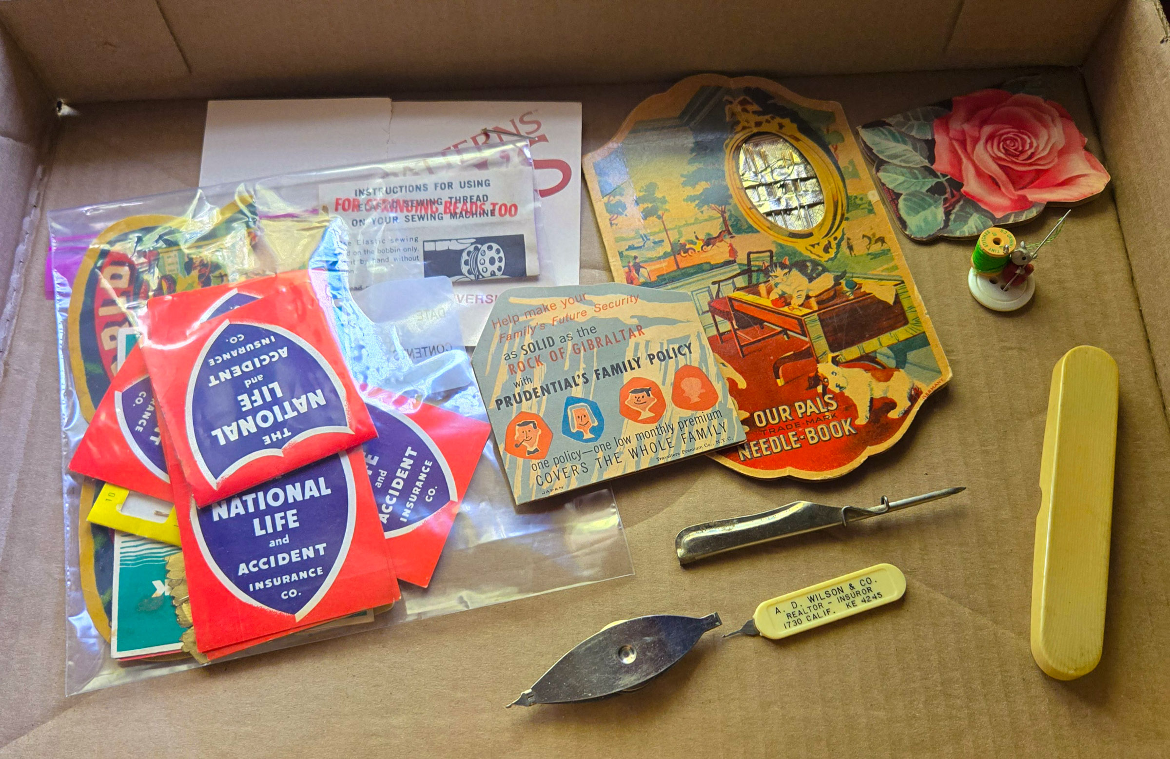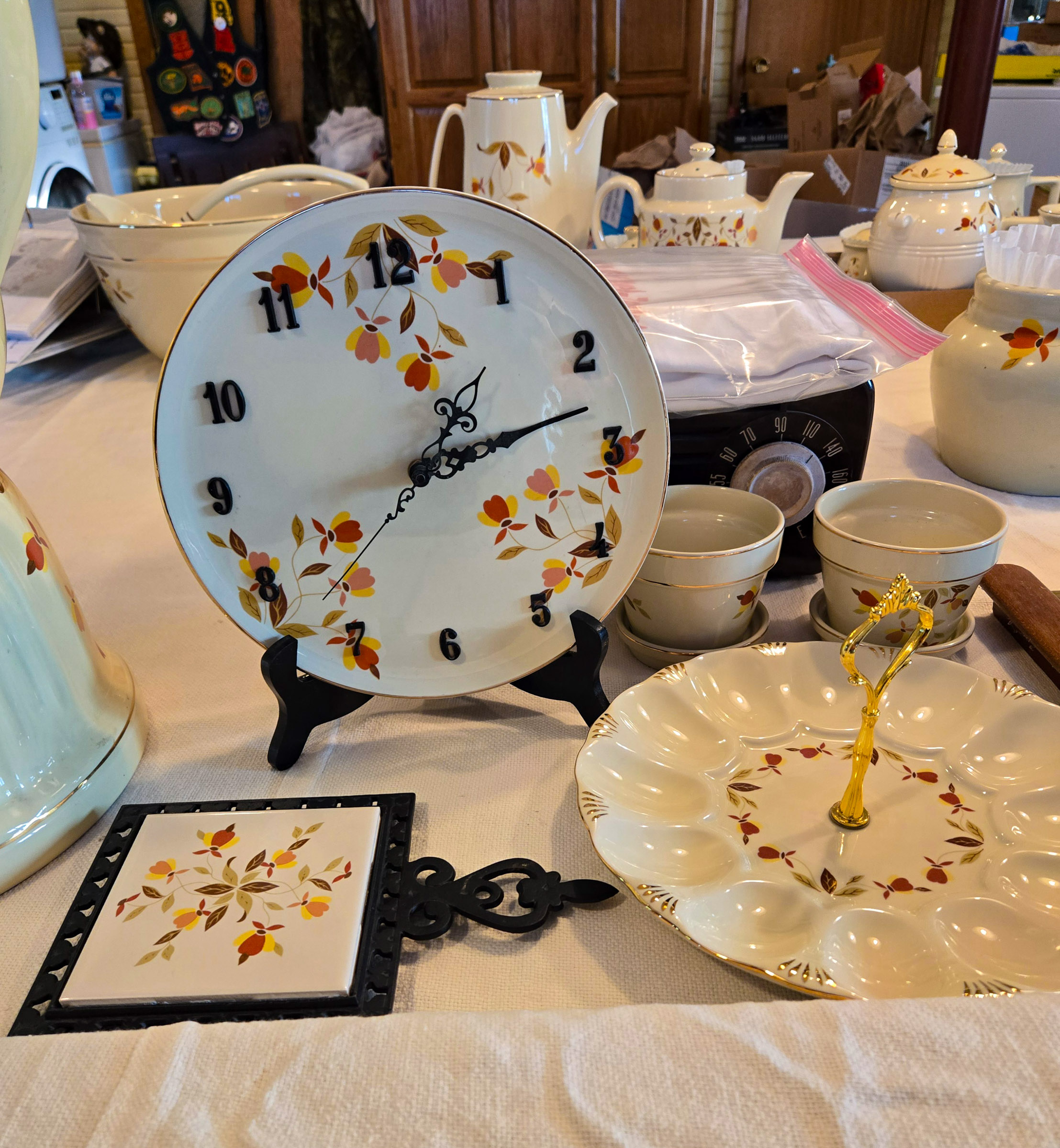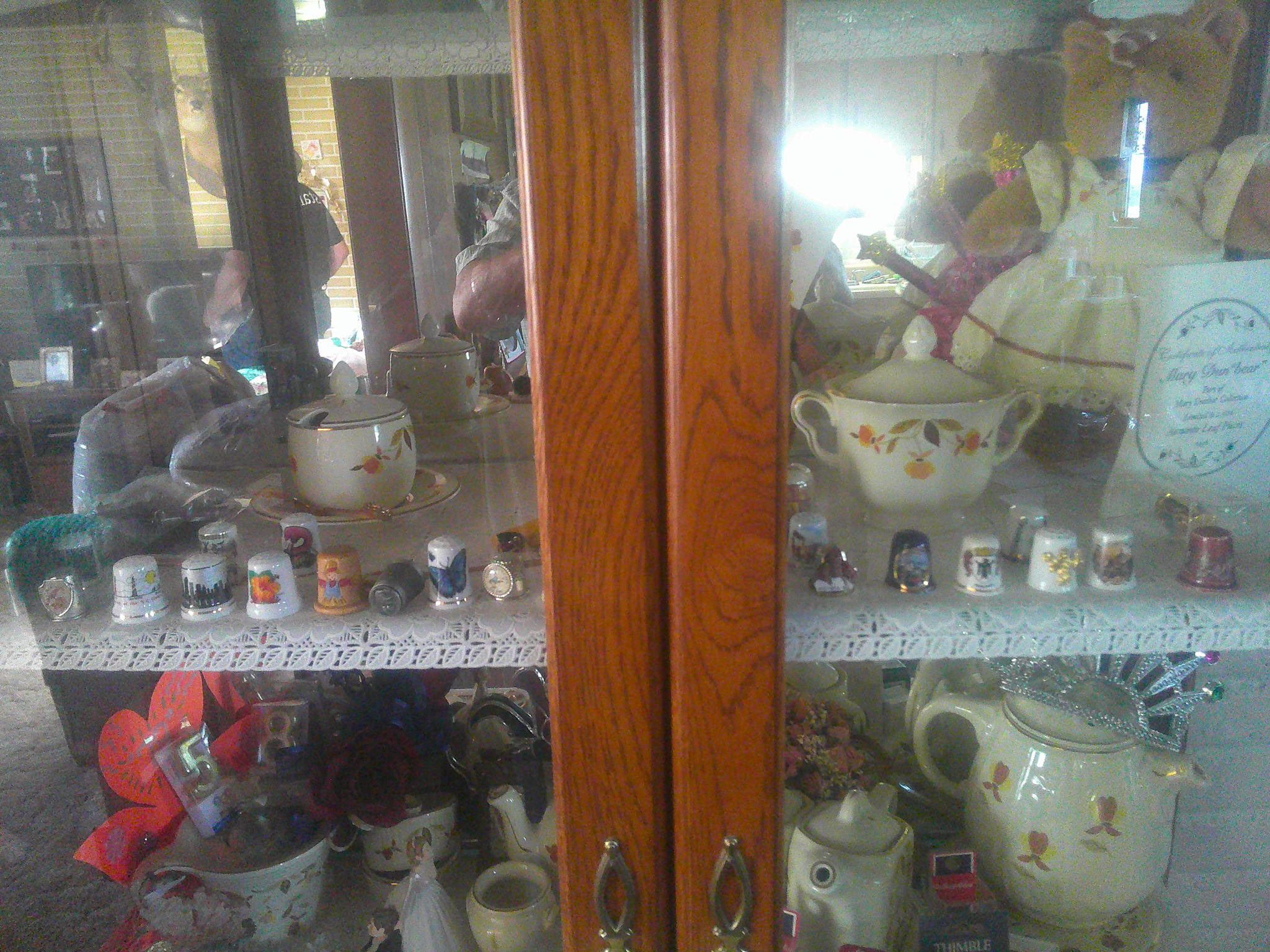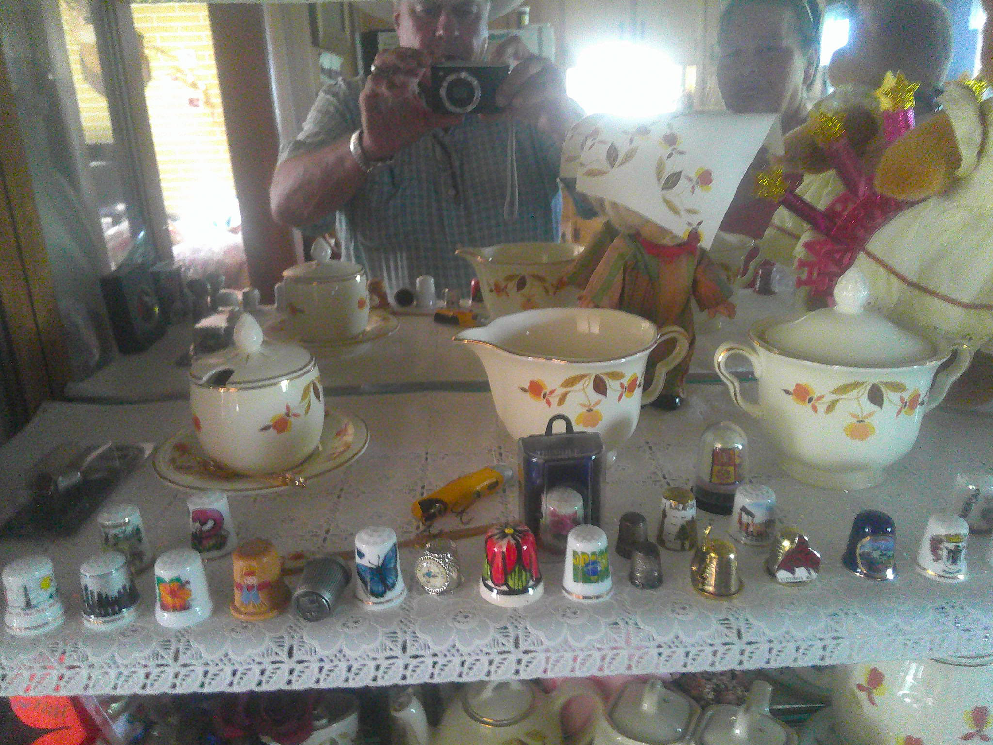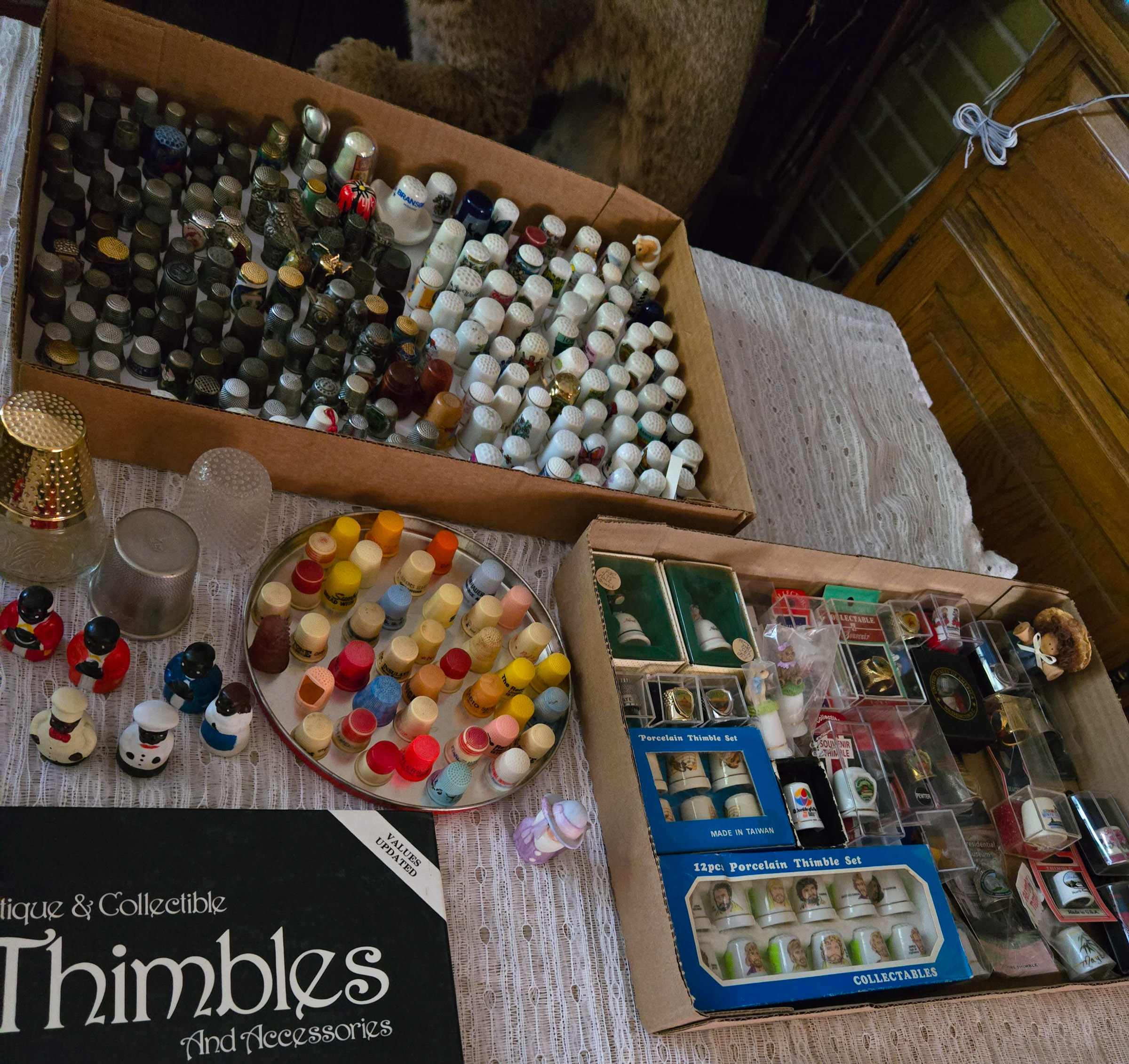 Thimble collection, Sewing kit collection and other collectables, Autumn leaf, Jewel tea collection many rare pieces sold by the jewel tea company, Household scales : Imperial family scales, American family scales, Vintage 1949 Jewel Radio corp. Model 935, Am clock radio, Hall China pieces, Tea pot, Refrigerator, Depression glass—green, pink, amber, Misc Vintage glassware & platters, Calendar plates (early 1900’s), Missouri tax tokens, Elgin national watch company token, Aladdin model B wick raiser knob, Naughty nellie pocket mirror, Knights of pythias watch fob, other lodge pins, decorum, Globe A1 flour badge, vintage sunbeam bread BB game, Lighters, Cameras and accessories, Duncan fife table and chairs, Wardrobe, Dressers, dresser with hutch, Twin bed with posture board, end tables with magazine racks, Entertainment center, Flex steel couch, Lift chair, Rocking chair, Decorative space heater, Antique & vintage lamps including oils, Pictures wall hangings and furnishings, Antique pie safe, 50 &60 popeye hand puppet set, old milk cans, 19&20 century cookbooks and encyclopedias, Treadle sewing machine with attachments, Sewing machines singer, brother and serger, fabric sewing supplies, old quilts and quilt tops, old jars and other glass, turquoise jewelry, vintage jewelry, native American items clock and watches, jolly musical monkey wind up toys in box, Kenmore washer and dryer, vintage toys, vintage clothing, silver and copper items, Griswold cast iron items, antique large brass iron scale, antique tools and oil cans, fishing gear, chest freezer, horse drawn equip.,