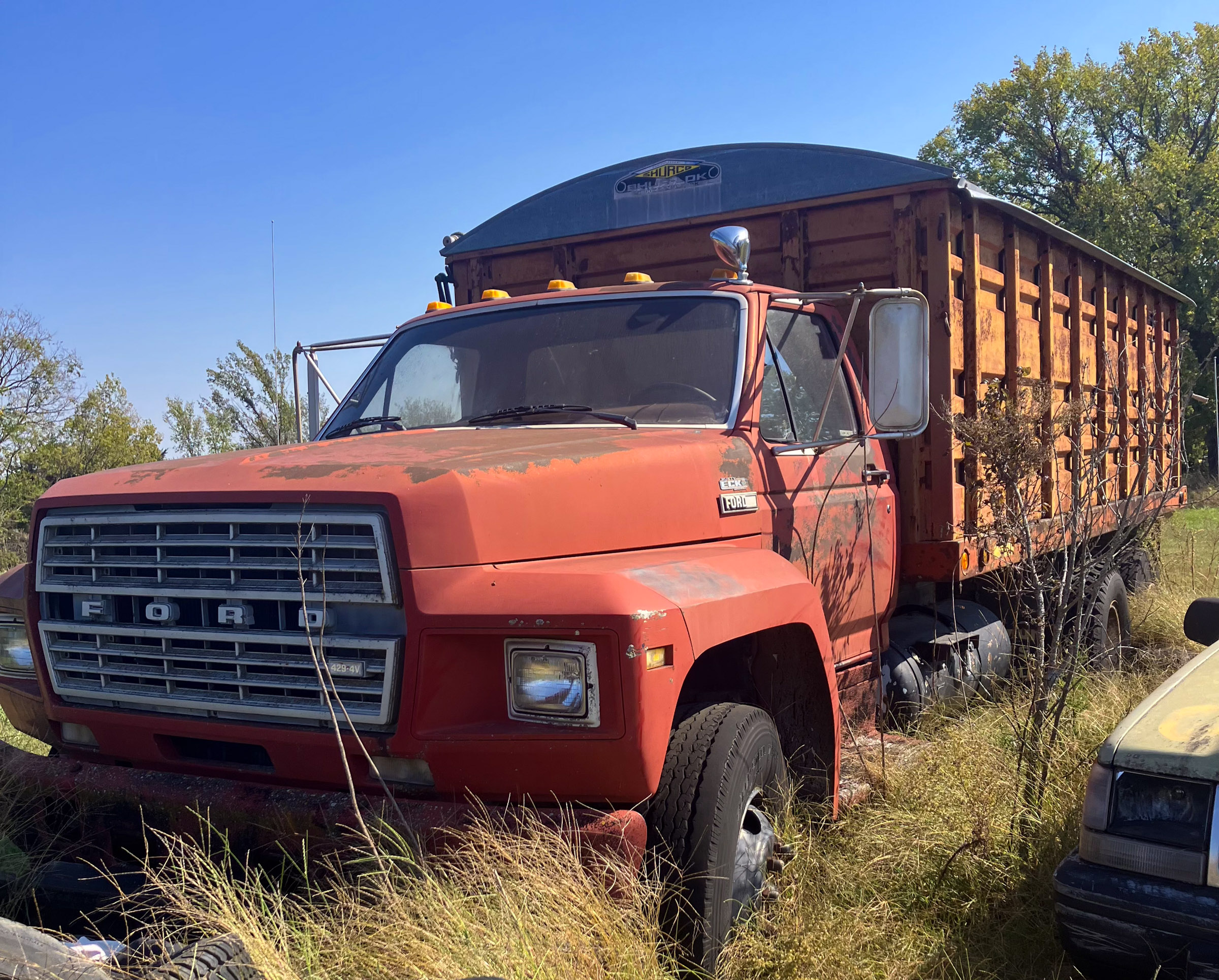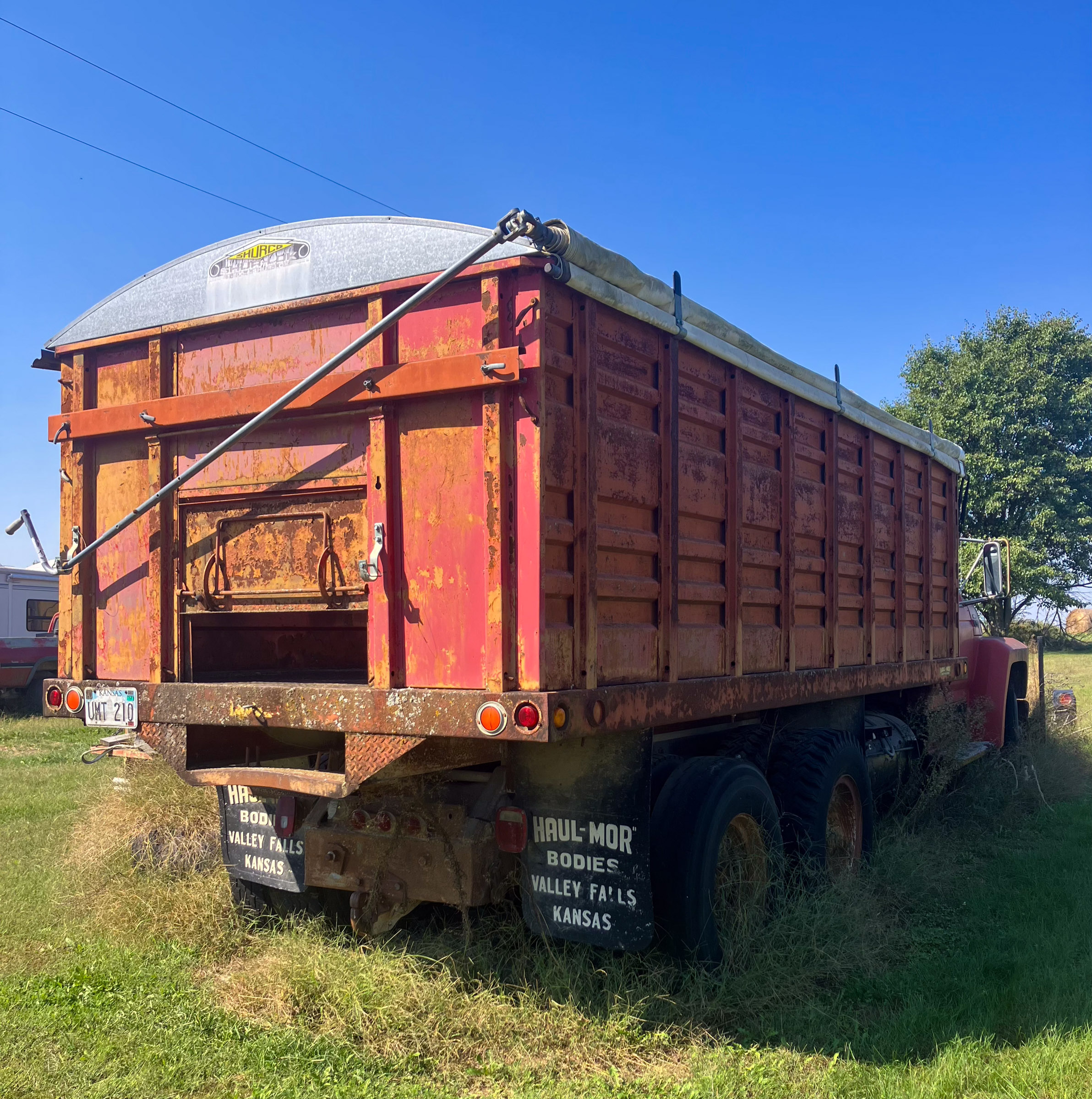 ‘83 Ford 429ci. LP fuel. 5+2 trans. with 4 spd browny aux. trans. 18’ bed and hoist w/roll tarp. 52” sides