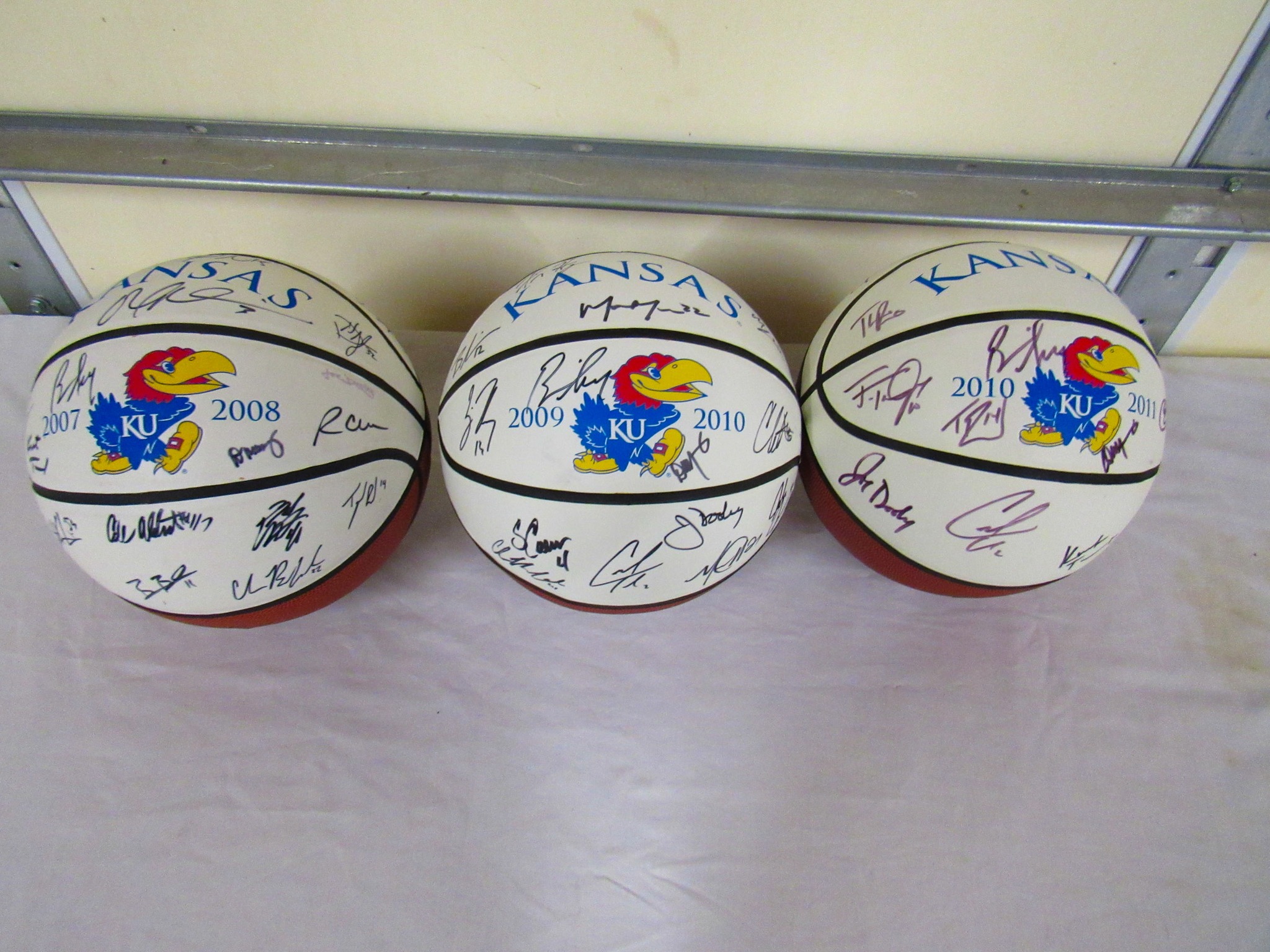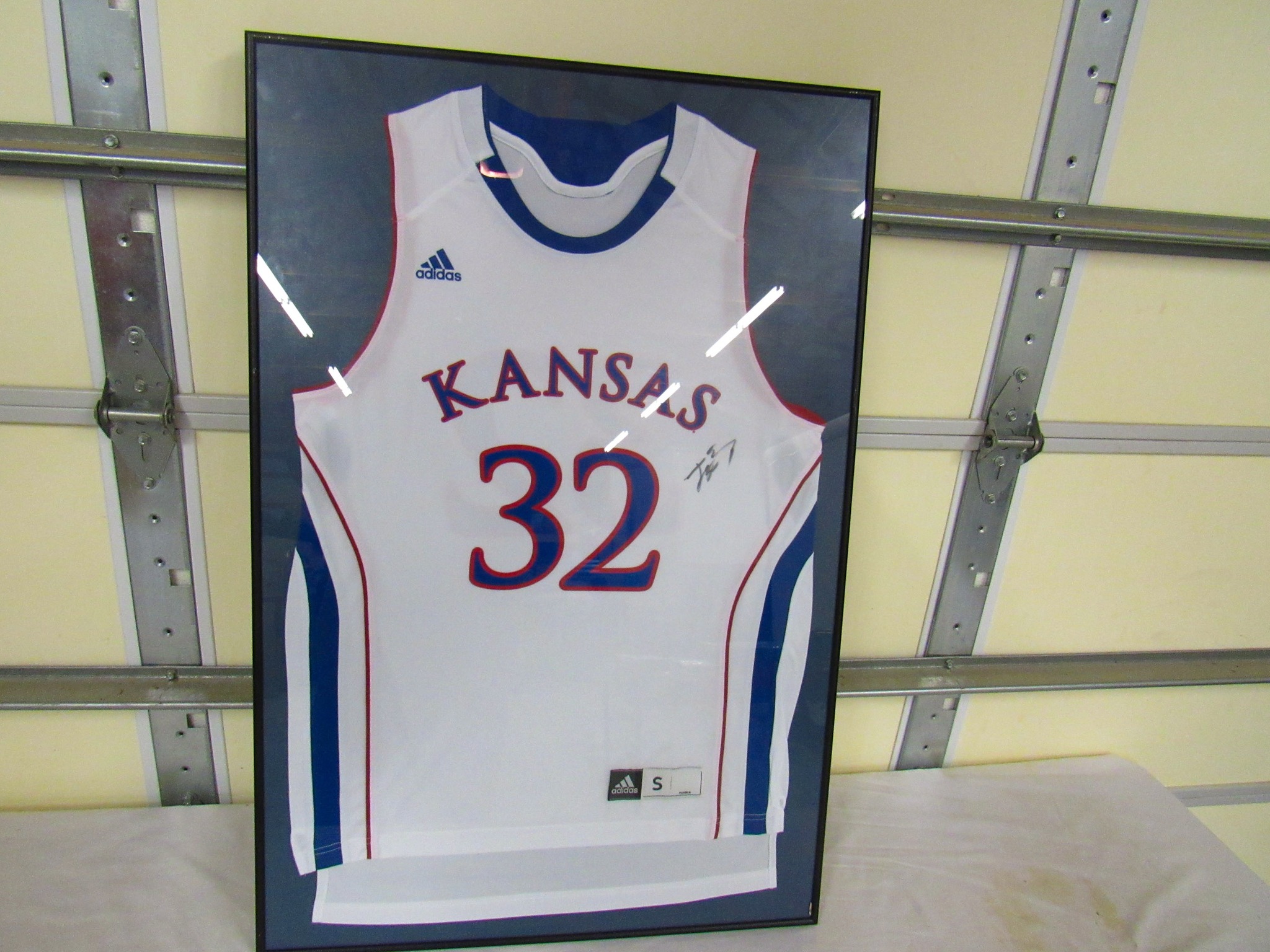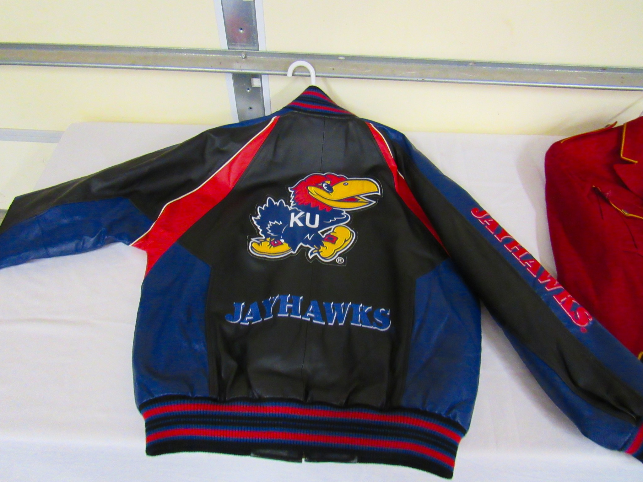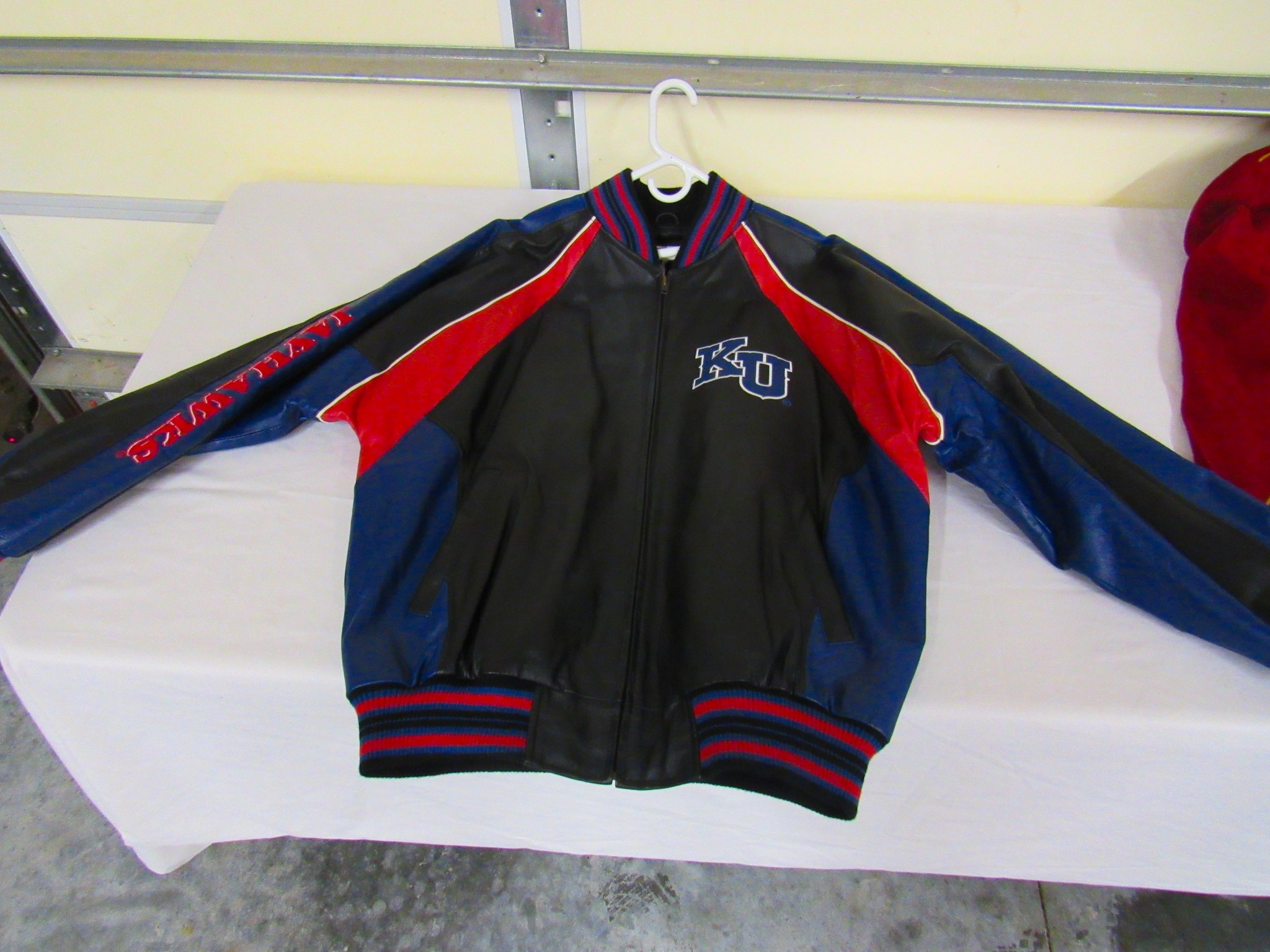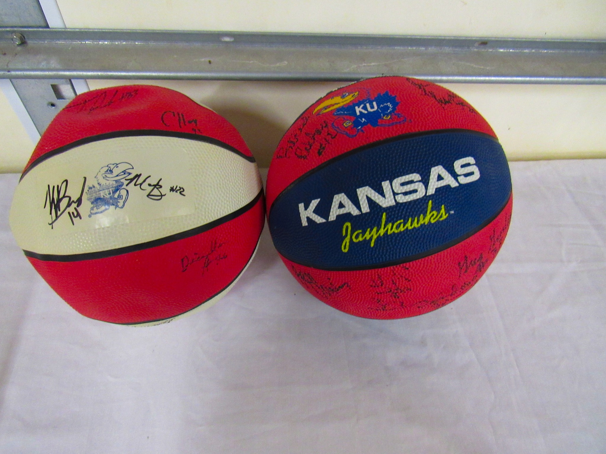 1960’s Leather KS Jayhawk LEATHER Jacket; Lawrence Dorsey-Liberty Post#14 Red Jacket w/ 1923 Style Jayhawk Emblem; 7 in. 1923 Style Jayhawk Paperweight Bookend; Three (3 in. 3 ½ in. 4 in.) Brass 1950’s Style Jayhawk Paperweights; 8 Signed Team KU Basketballs (2007-08, 2009-10, 2010-11, 1990-91,Etc.); Signed KU Jerseys (1990’s Jacque Vaughn #11,Morris Twin’s #21 & 22, #32 Darnell Jackson); 2008 NCAA Championship Team Signed Print; 1987-88 Jayhawk Team Signed Nike Cards (16 - Coach Brown & Players); 1989 Leesley Jayhawk Team Players Signed Cards; Jayhawk Cards: Chamberlain, Sayers, Riggins, Manning, Embiid, Braun 100’s of Others; Several Jayhawk Basketball Player Signed Prints; Chiefs: Mahomes / Kelce / Derrick Thomas; Royals: Brett / Witt / Jackson / ; Signed Team KC Comets Soccer Ball!