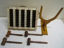 Crate Audio Traveler PA Sound System: Mic, CMX42 Audio PA, 2 CMX12FX Speakers w/ Stands, Cords, Rolling Crate Traveling Case; ION Tailgater Compact Speaker System w/ Stand; Colonel 500 Sound System & Stand w/ Missouri Auction School Hard Case; Gavel Collection; Vintage Wooden Cashier Number Box!