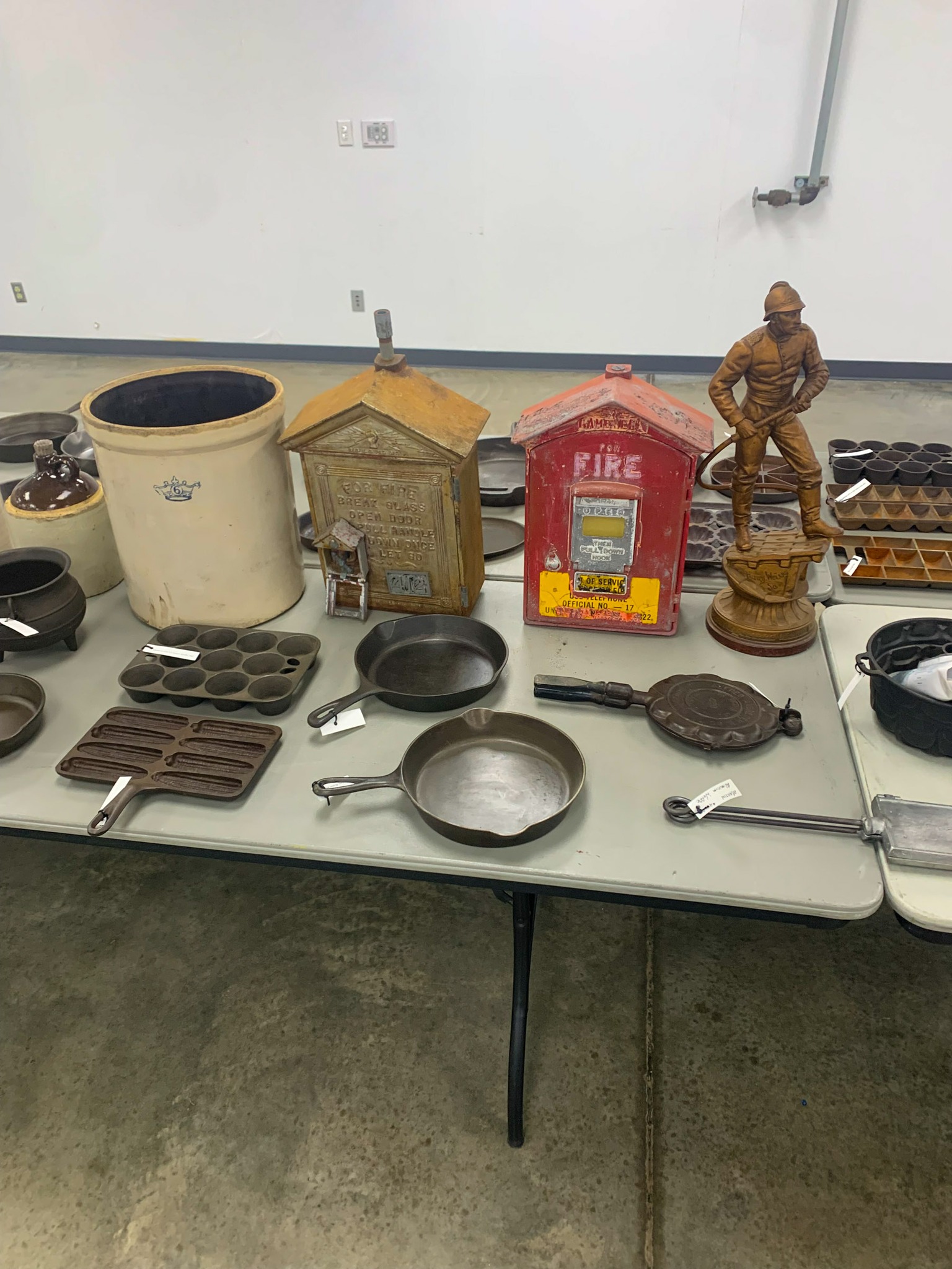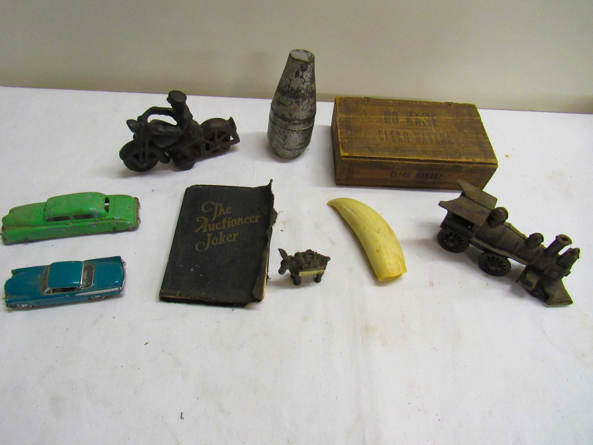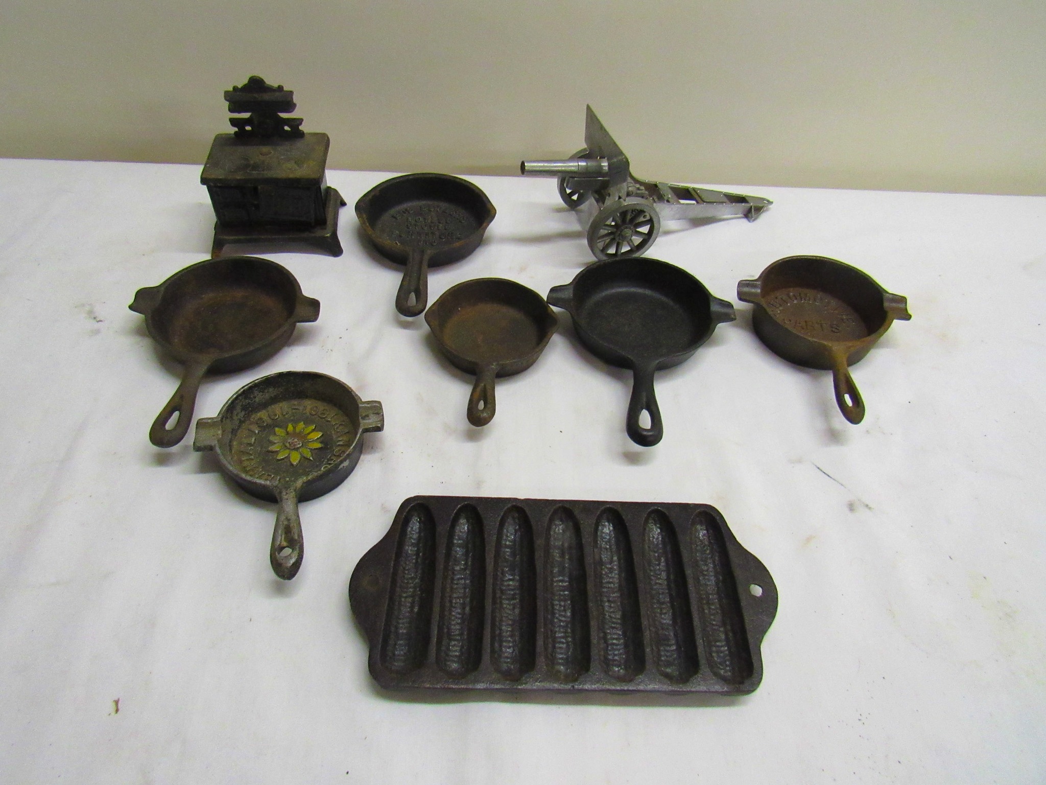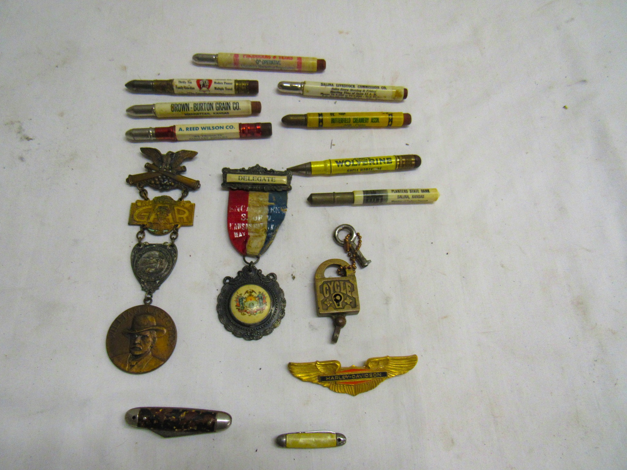 Vintage Weeden Horizontal Stationary Steam Engine; 2 Vintage Mini Stationary Engines; Maytag Oil Can; IH Cream Separator Oil Can; De Laval Metal Emblem; Union Kerosene Sad Iron Heater Stove; Brass Covered Wagon / Oxen Door Stop; Branding Irons; horse hames; #604 RR Lamp Flare; German WWII “Papier Geld” Red Cross Donation Metal Can; 1961 Key Rexall Drugs Law, KS Calendar; John L Emick Abstracts of Title Ethel High Owner Law, KS; Law, KS Red Souvenir Glass; 1600’s Moroccan or Algerian Miquelet Musket (Wall Hanger?); Scrimshaw 2 Knife Set w/ Display; Vintage Cast-Iron BOXER Dog Door Stops / Banks; Boston Terriers Vintage Chalk & Cast-Iron Banks; 50+ Vintage Cast-Iron Banks of All Sorts!; 50+ Cast-Iron Pieces Griswold / Wagner / Alfred Andresen / Benjamin & Medwin / Pocasset / Cresent / Ozark / Miami / Skillets / Dutch Oven / Muffin Pans / Griddles; Griswold #282 Mini Crispy Corn or Wheat Stick Pan (Rare!); Cast-Iron Wagner / Lodge / Etc. Ashtrays; 1893 KS Legislator War Picture (KS Capitol) Picture; “Appeal To The Great Spirit” Native Am. Picture; Leonard Peltier Native Am Chief Art Signed Framed Picture; Firefighter Memorabilia: Axes / Extinguisher Boxes / Brass Nozzles / Hydrant Wrenches / Helmets; Vintage Durant Fuel Counter; MP Vintage Coin Changer; 2 Hereford Bull Vintage Chalk Banks; 1903 Pat Economy Qt. Jar; colored Jars; WW II Compass; 1950’s Mossberg “Spot Shot” Spotting Scope; Miniature Replica Gun Collection; Sheriff Badges; Pocket Watches; Sterling & Costume Jewelry; Vehicle Metal Emblems; Junction City Memorabilia (1961 Republic Hard Back Book); Fighting Irish Pendleton Vintage Blanket; Cigar Molds / Boxes / Accessories; Zippo Lighters & Others!; Snap On Clock & Belt Buckles; belt buckles; Ande Rooney JD Porcelain Sign; MoorMan’s / Coke / RR Signs; tin signs; COORS Lighted Pool Table Light; Martin Senour Paints & Coke Lighted Clocks; Bud Light lighted sign; Harley Davidson Motorcycle Memorabilia: saddle bags, pants, coats, helmet, signs, etc.!; bullet pencils; Vintage Marbles; Toys: Spec Cast Allis-Chalmers Wheels of Times Highly Detailed Model D15 Tractor w/ Sprayer NIB, Precision Series Allis-Chalmers Model WD 45 NF NIB; Coll. Sp. Edition February 2001 Louisville Allis-Chalmers WC WF on Rubber NIB, Farmall H & F-20 Tractors NIB, 1948 Allis Chalmers “G” NIB, Agco ST45 Compact NIB, International Row Crop NIB, Cast-Iron AC Tractor, JD Airplanes NIB, Power Wheels Pedal Car, Tonka / Structo / Construction; Spec Cast Allis-Chalmers 1916 Studebaker Bank NIB; Allis-Chalmers 12 in. Lantern NIB; 2 Vintage 5 in 1 Pinball Games; Skelly / JD 4 Leg / COOP 5 gal. Cans; KS license plates; Motorcycle license plates; 50+ Knives: Falkner Wild West Bowie w/ case, Frost w/ sheaths, Military Bowie, RA 36 Military, Elk Ridge Quail Upland w/ Leather Sheath, Ducks Unlimited w/ wooden display & leather sheath, many other knives; Advertising Yard Sticks & Wooden Boxes; milk jars; salt / peppers; KS State plates; Nascar Dale Earnhardt #3 items; 160+ Flats of Advertising Pens over 15K!; Oil Lamps; Quilts; CAT Rolling Utility Seat w/ Creeper NIB; Lincoln Electric Course Backpack & Welding Supplies (New); hand tools.
