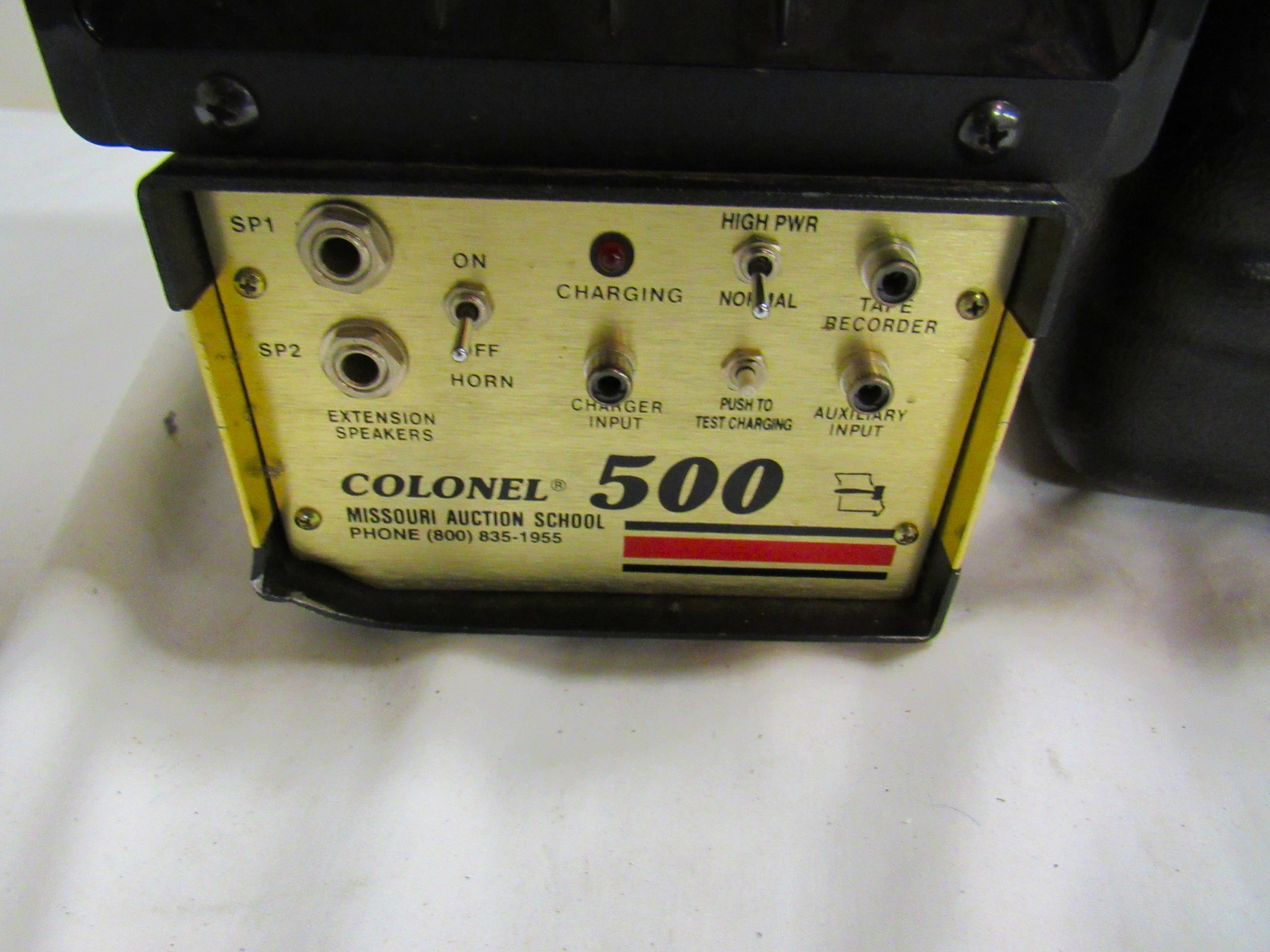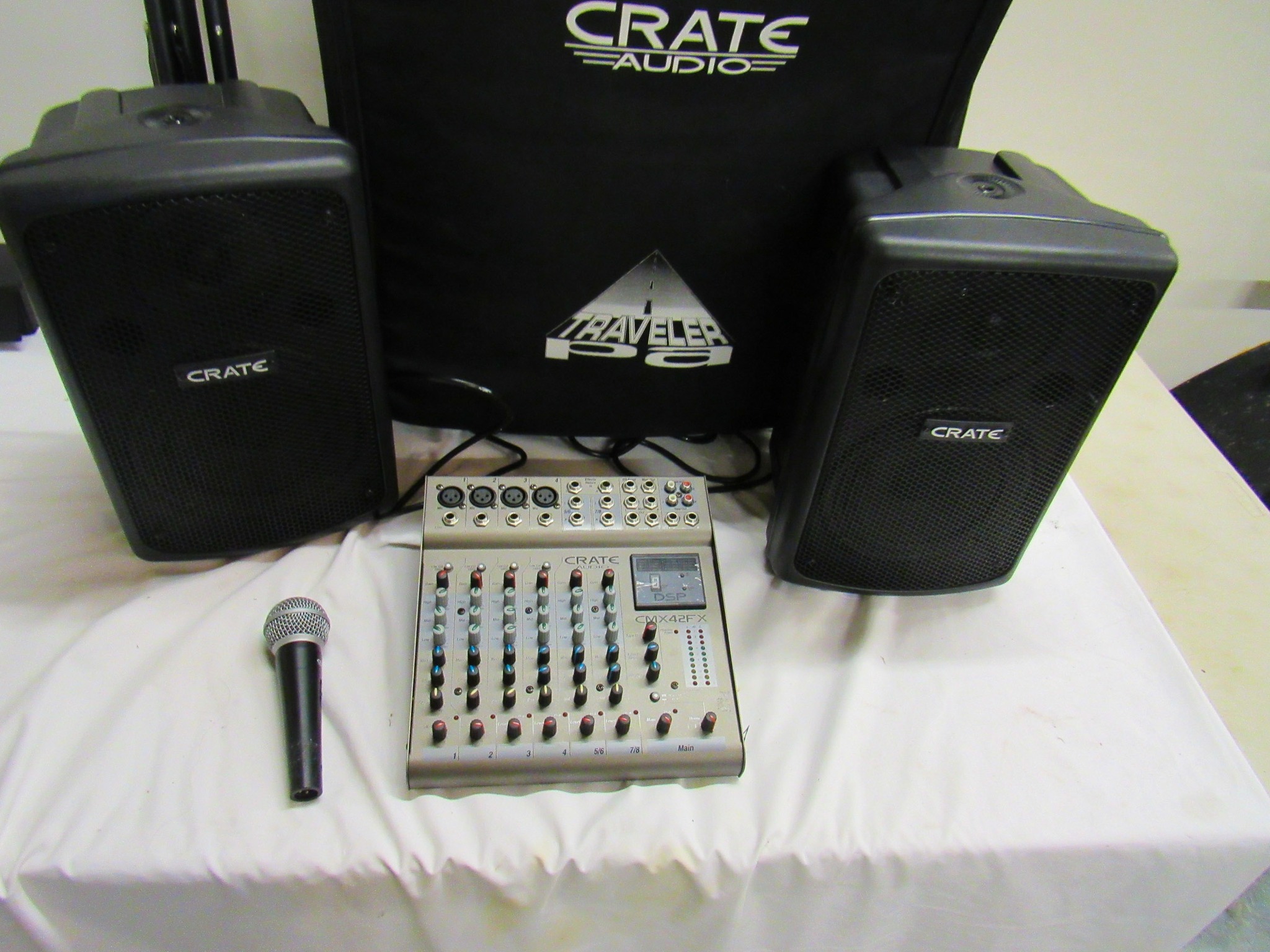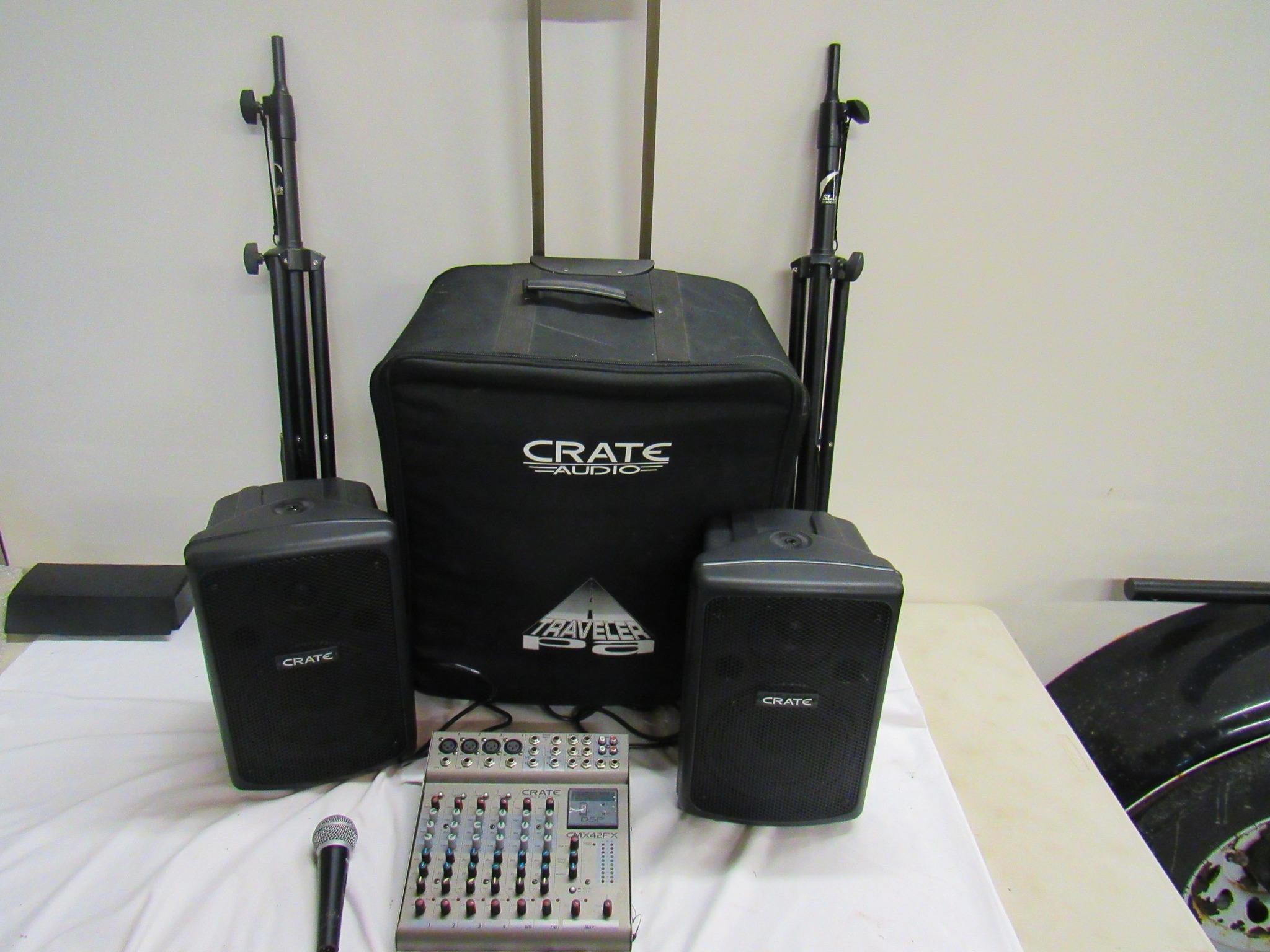 Crate Audio Traveler PA Sound System: Mic, CMX42 Audio PA, 2 CMX12FX Speakers w/ Stands, Cords, Rolling Crate Traveling Case; ION Tailgater Compact Speaker System w/ Stand; Colonel 500 Sound System & Stand w/ Missouri Auction School Hard Case; Gavel Collection; Vintage Wooden Cashier Number Box!