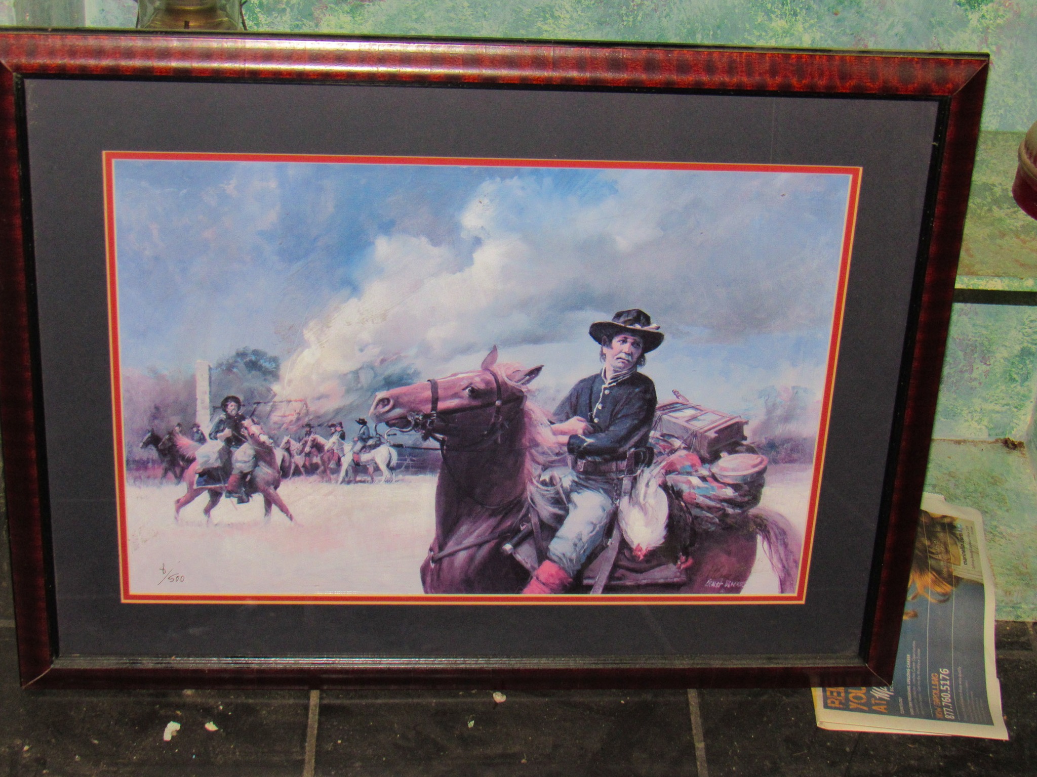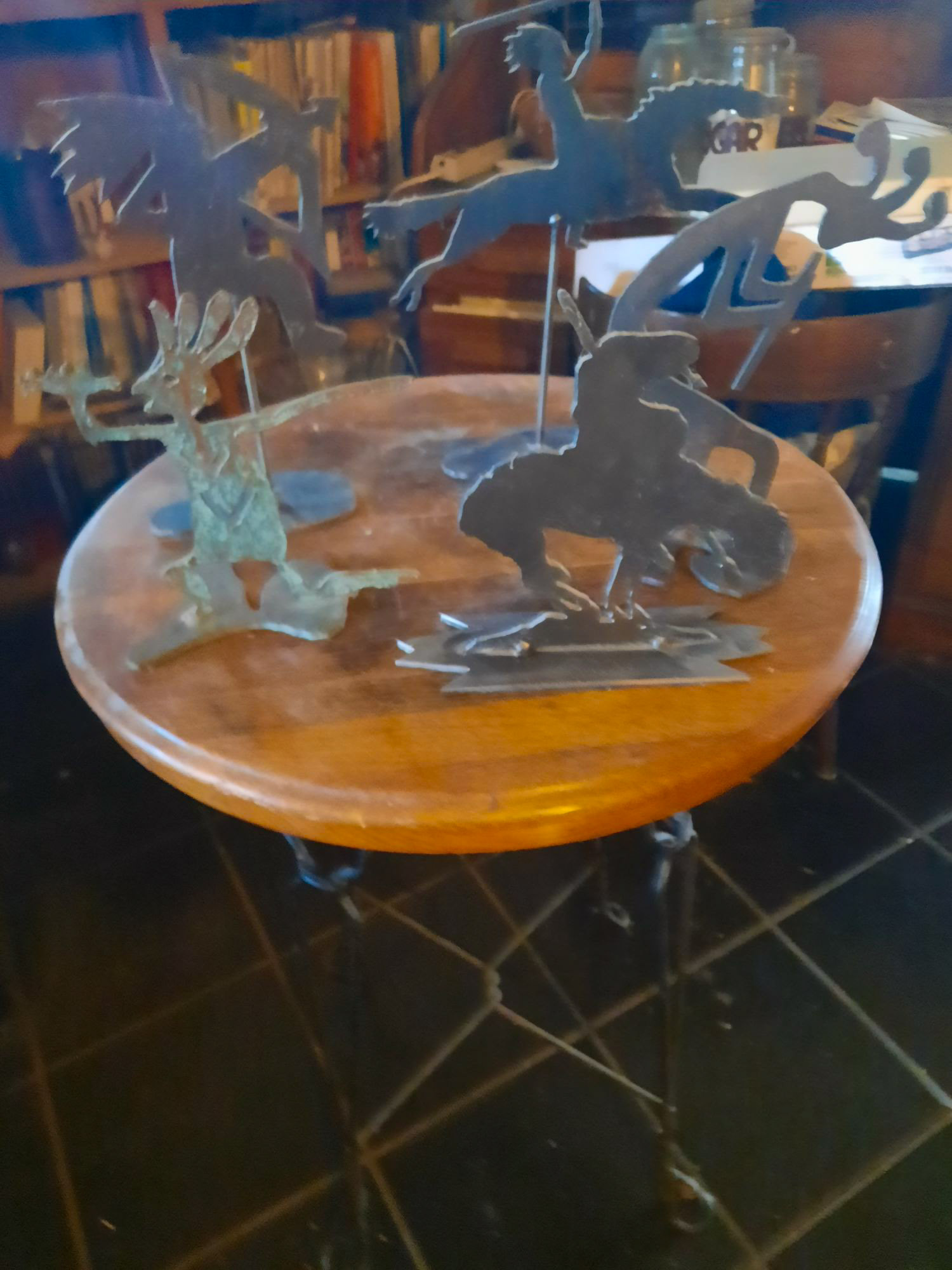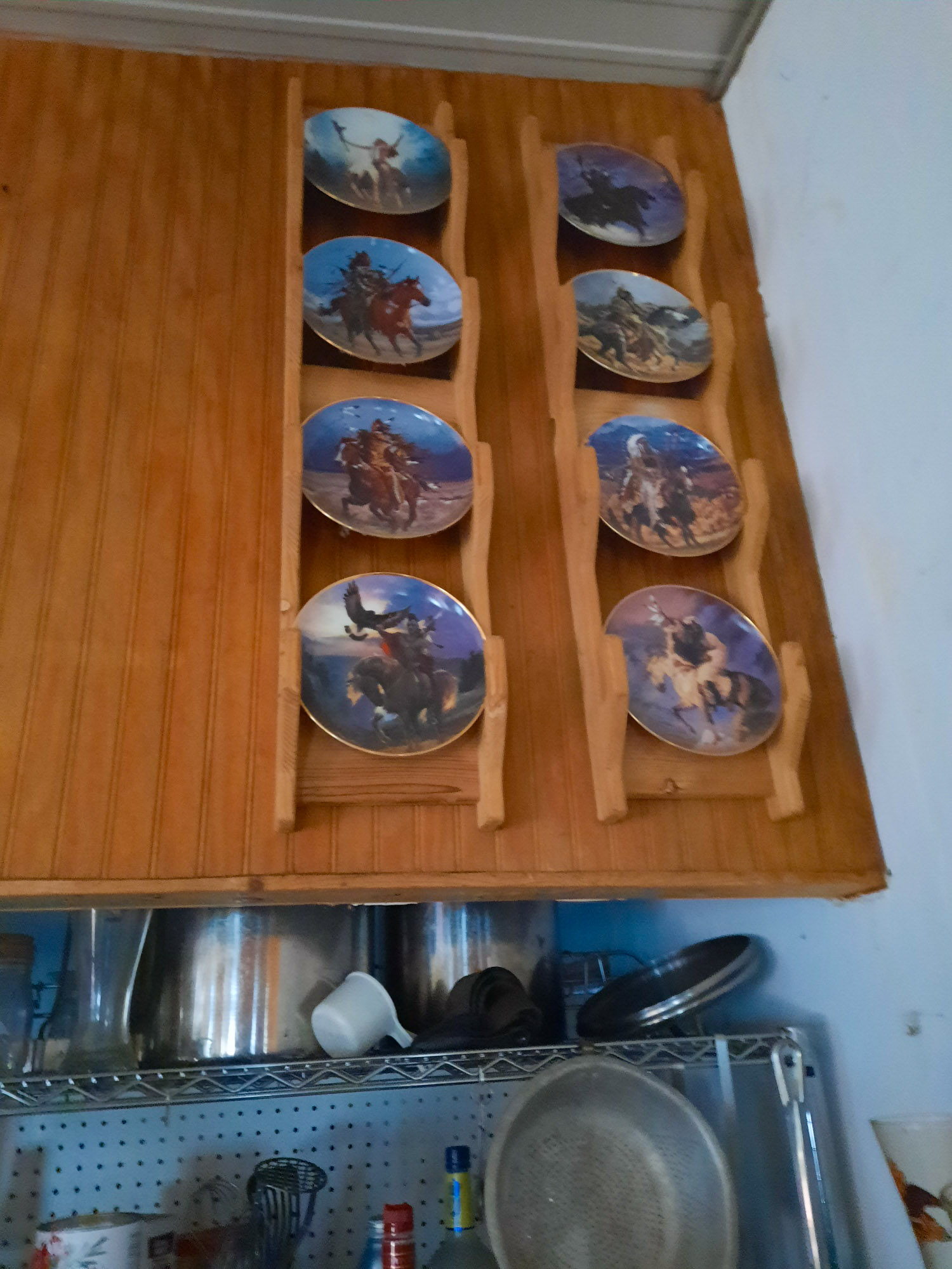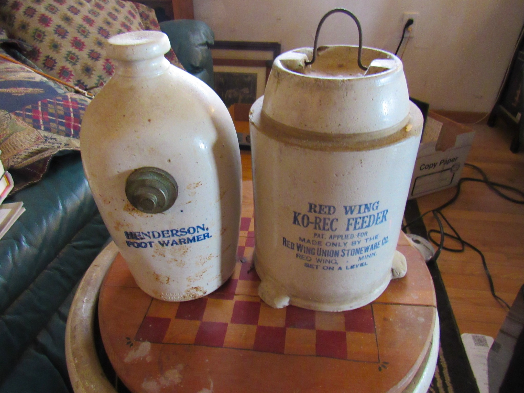 Vintage Cheyeene Native American War Shield; Sioux Pottery Pieces; Native Am. Plates; Wrought Iron Folk Art; Amish Hickory Bentwood Rocker; Quantrill Raid (Law) Framed Picture #8 / 500(Ernst Ulmer ?); Stained Glass Window; 2 Vintage Ringling Bros. and Barnum & Bailey Circus Framed Pictures; Vintage The Equitable Series Framed Picture (Signed Bob Gibson / Warren Spahn / etc.); Vintage AMOCO 3 x 4 Marina Boat Double Sided Metal Sign; 1970's Michelob Dry Beer Sign w/ Lady; Rainbo Bread tin sign; Coke Bottle thermometer sign; DO NOT ENTER metal sign; Copenhagen Chew Vintage Thermometer; Spring Wagon Set; Wooden Wagon Wheel; CROCKS: #15 Red Wing w/ 6 in. wing, 1890's Birch Leaf Union Red Wing, 1904 #3 Red Wing Union 4 in. wing, 2 1920's #5 Redwing 4 in wings Whiskey Jugs, 5 gallon Blue Ribbon, Bee Hive, #3 Birch Leaf Butter Churn, Red Wing Union Ko-Rec Feeder, Henderson Foot Warmer Crock, Fulper Germ-proof Filter crock; Aladdin Lamps: Pink / Lincoln Drape / Brass; Copper Fire Extinguisher; Table Top Toledo Hardware Scale; 1930's License Plates; 1970's Cathedral Style GE Radio; Wood Slab End Table(made by Gary); Vintage Patio Set; DEERING cast-iron seat / stool; implement metal seats; enamel ware; Bird pottery; Advertising Tins; 2008 KS Jayhawk National Champion Belt Bickle; Limited Ed. Charles M. Russell 4 Belt Buckle Set; "Old Home Days & Threshing Bee" Barnes KS 10 Belt Buckle Set mounted on KS Wooden Sign; KS State Fair & Flint Hills Rodeo Belt Buckles New in Wrappers; marble top table; deer sheds; wash boards; cast-iron stands; primitives tools; Comfort Glow wall heater; Pit Boss Smoker; Master Built BBQ Grill; Numerous items too many to mention!
