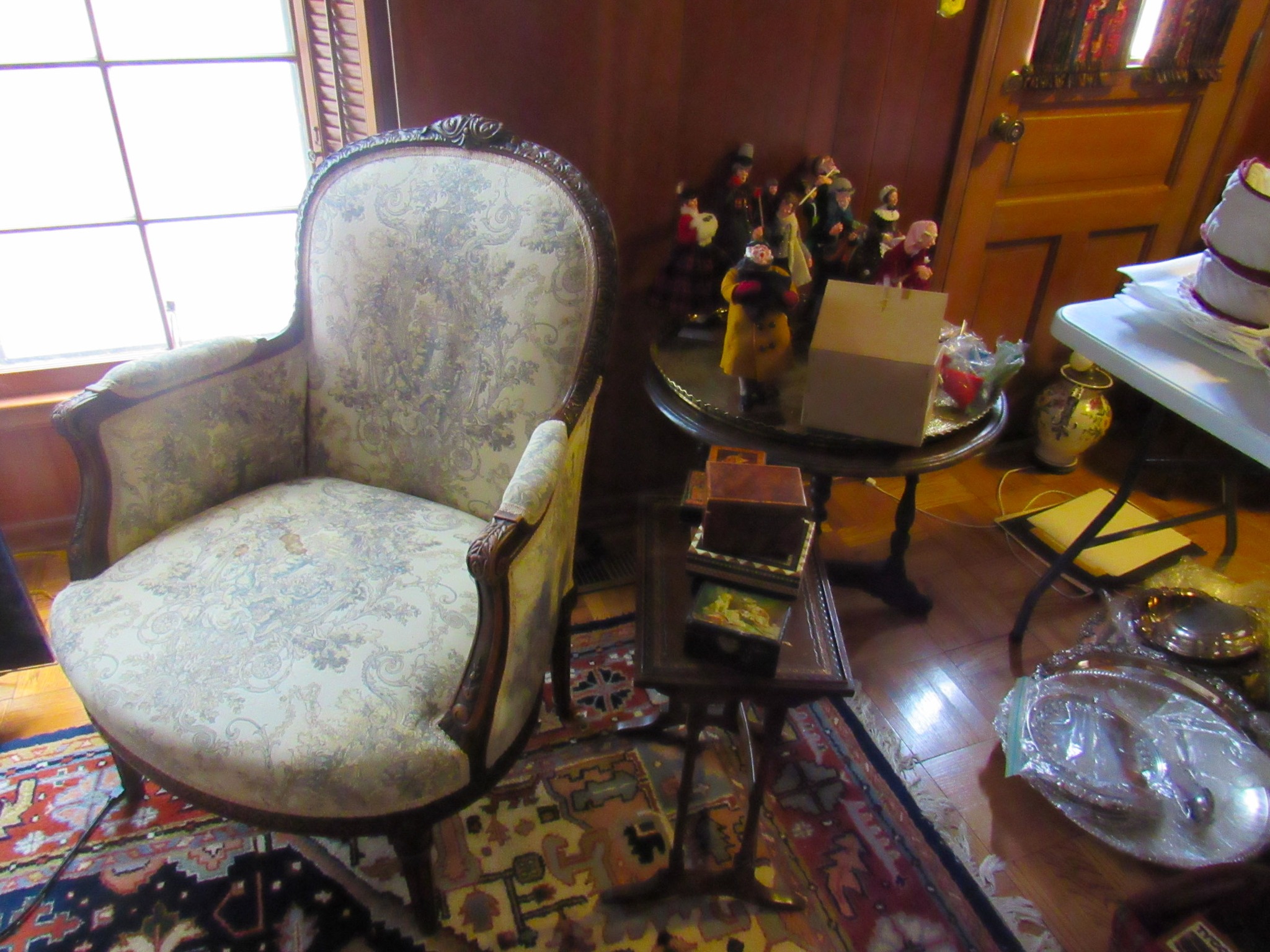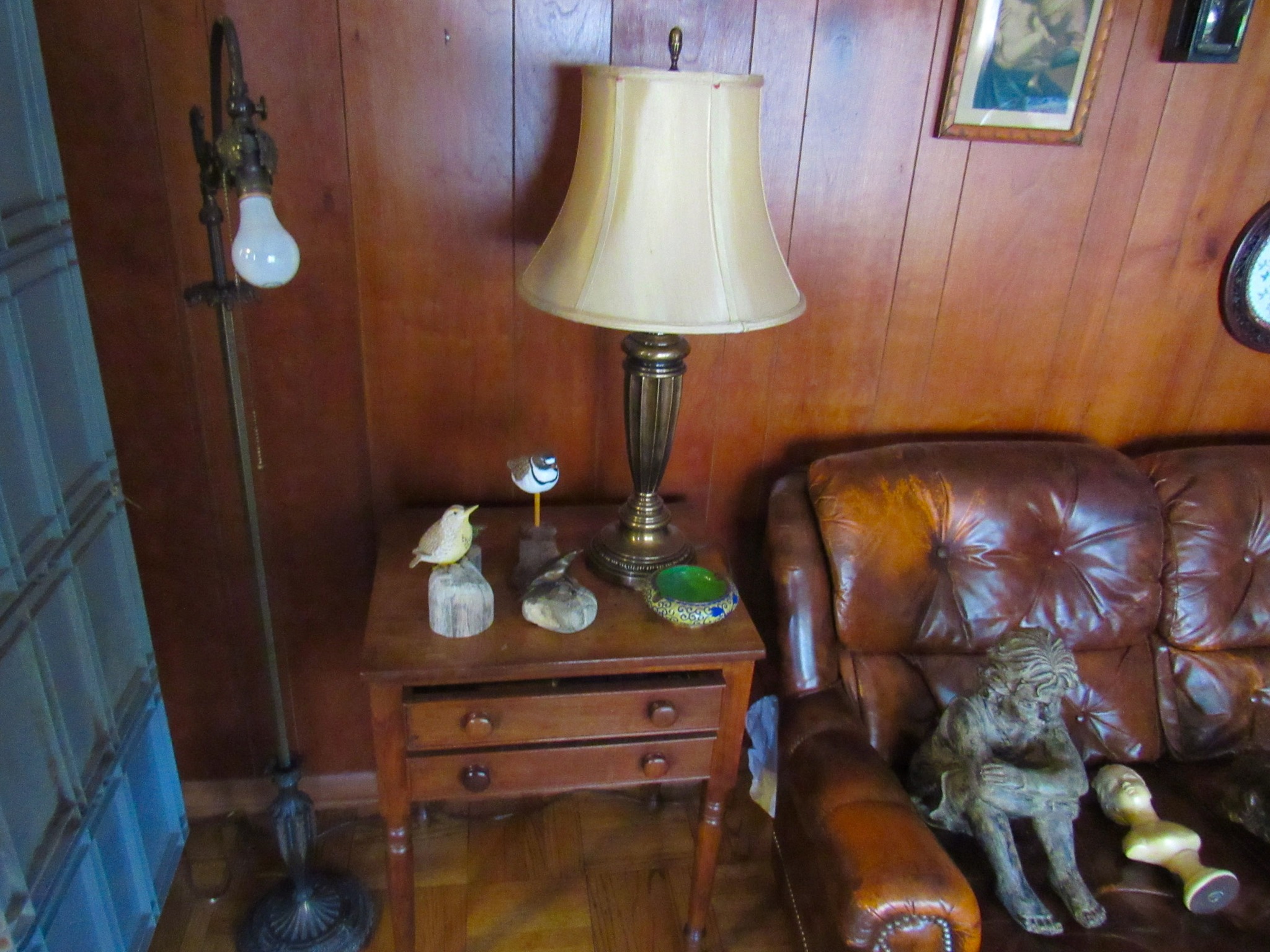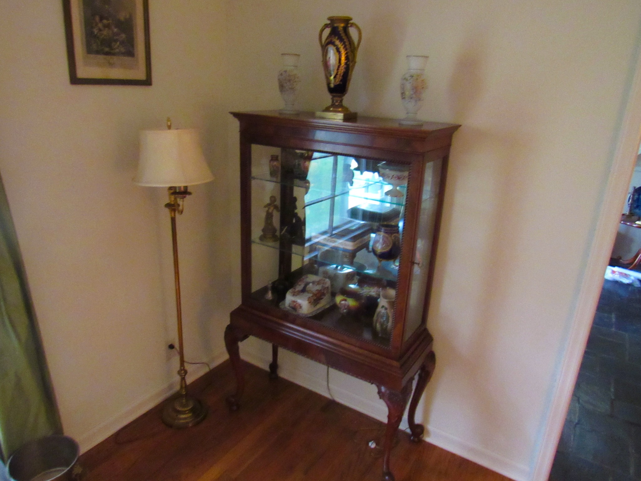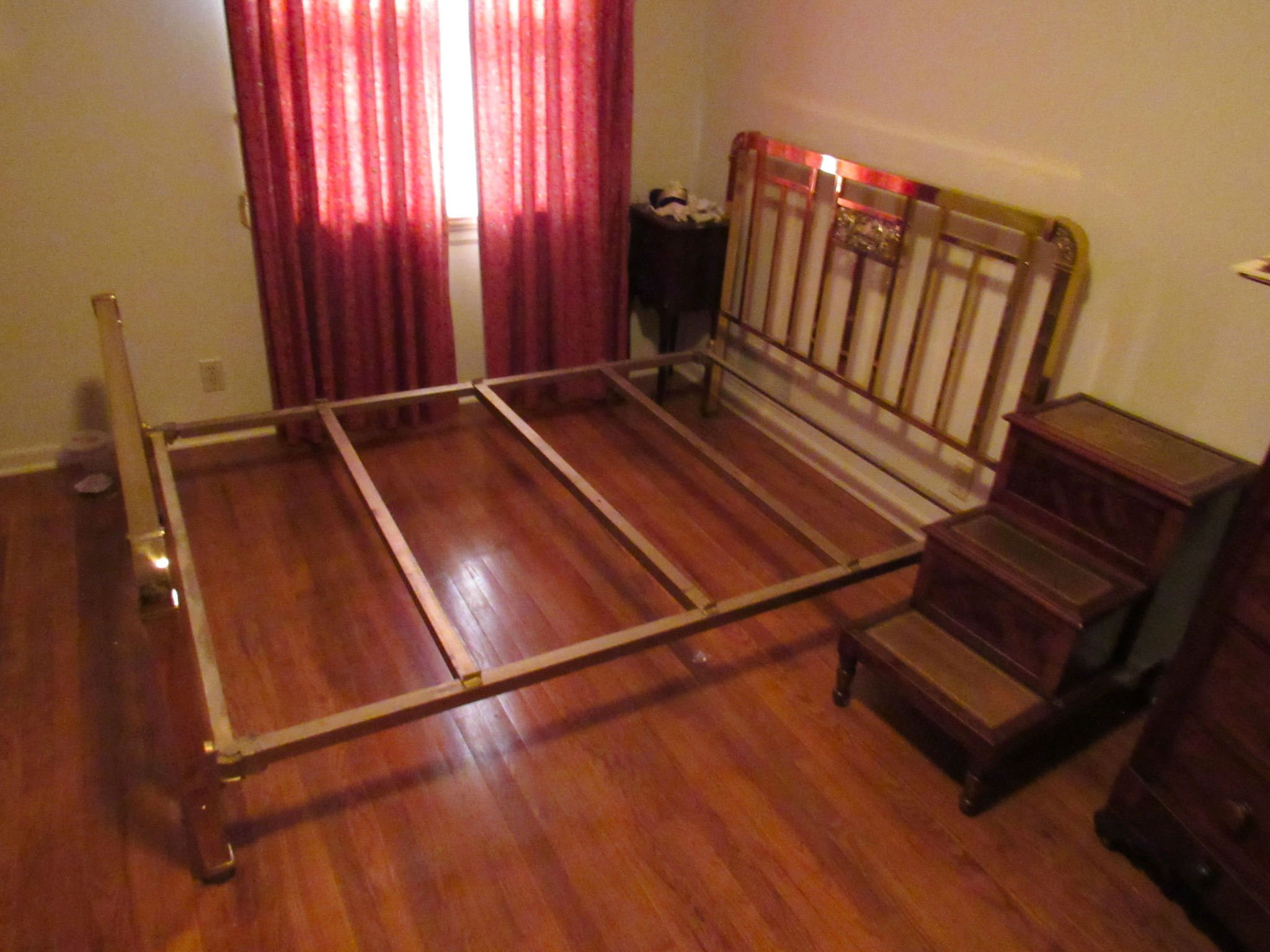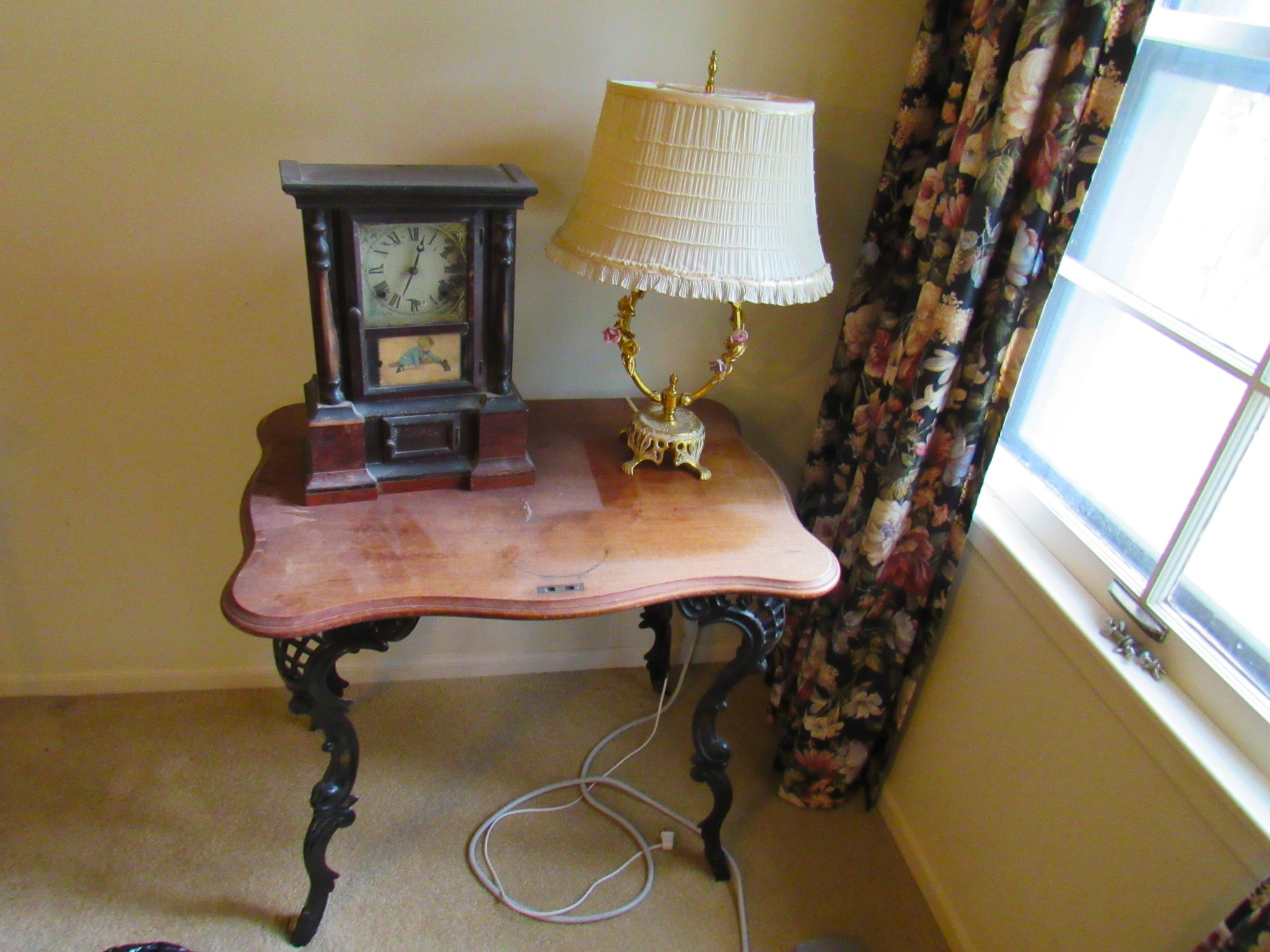Victorian Matching Orante China Curio Cabinets; Victorian Marble Top Sideboard Buffet Cabinet; Solid Brass Bed; Unusual Victorian Style Corner Cabinet; Wedgewood Coffee Table; Victorian Marble Top Dresser & Mirror; Full Length Dressing Mirror; Entry Chair; Marble In-Laid End Table; Matching Needle Point Chairs; Sewing Rockers; Make-Up Table; Cane Rocker; Smoking Table; Walnut Bed; 2 Cedar Chests; 7 ft. Vintage German Grandfather Clock; Ingraham Wall Clock; Atkins Regulator Clock; Seth Thomas & German Mantle Clocks; Iranian Wool Area Rug; Area Rugs; Oriental Wall Tapestry; Vintage Lamps & Shades; 1883 Cornelia Schouten Canvas Frame Art Picture; O Franta Framed Art Picture; Pastry Eaters Bartolome Murillo framed picture; Vintage Framed Pictures; Wrought Iron Patio Set Table / Chairs / Loveseat / Tea Cart / Lounger / Side Tables; Stained Glass