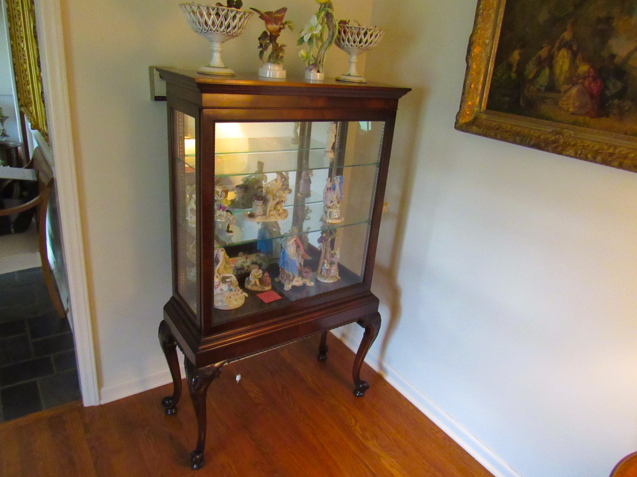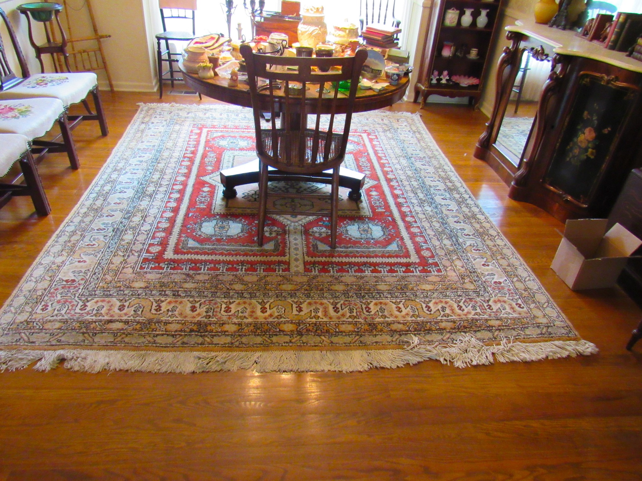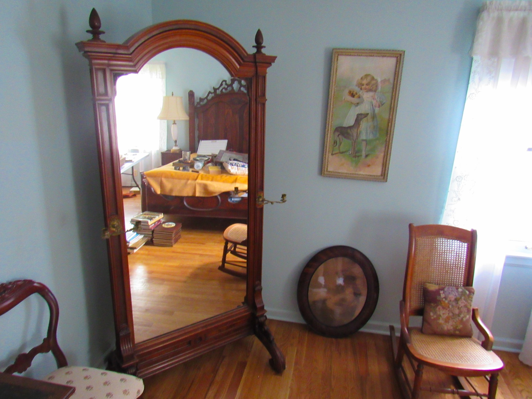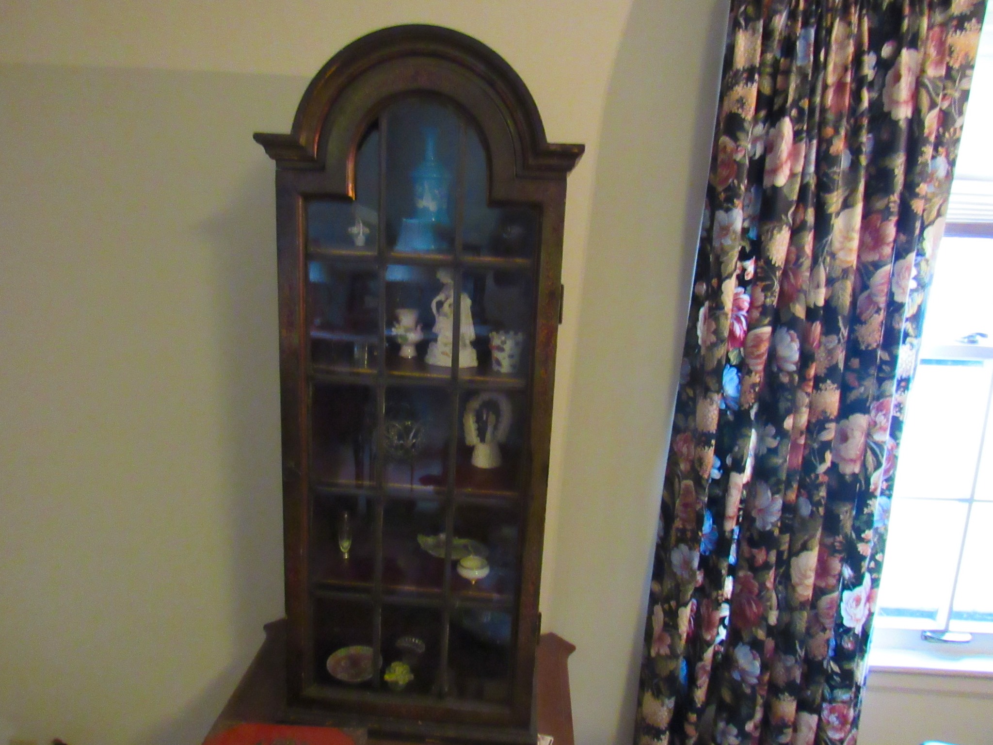Victorian Matching Orante China Curio Cabinets; Victorian Marble Top Sideboard Buffet Cabinet; Solid Brass Bed; Unusual Victorian Style Corner Cabinet; Wedgewood Coffee Table; Victorian Marble Top Dresser & Mirror; Full Length Dressing Mirror; Entry Chair; Marble In-Laid End Table; Matching Needle Point Chairs; Sewing Rockers; Make-Up Table; Cane Rocker; Smoking Table; Walnut Bed; 2 Cedar Chests; 7 ft. Vintage German Grandfather Clock; Ingraham Wall Clock; Atkins Regulator Clock; Seth Thomas & German Mantle Clocks; Iranian Wool Area Rug; Area Rugs; Oriental Wall Tapestry; Vintage Lamps & Shades; 1883 Cornelia Schouten Canvas Frame Art Picture; O Franta Framed Art Picture; Pastry Eaters Bartolome Murillo framed picture; Vintage Framed Pictures; Wrought Iron Patio Set Table / Chairs / Loveseat / Tea Cart / Lounger / Side Tables; Stained Glass