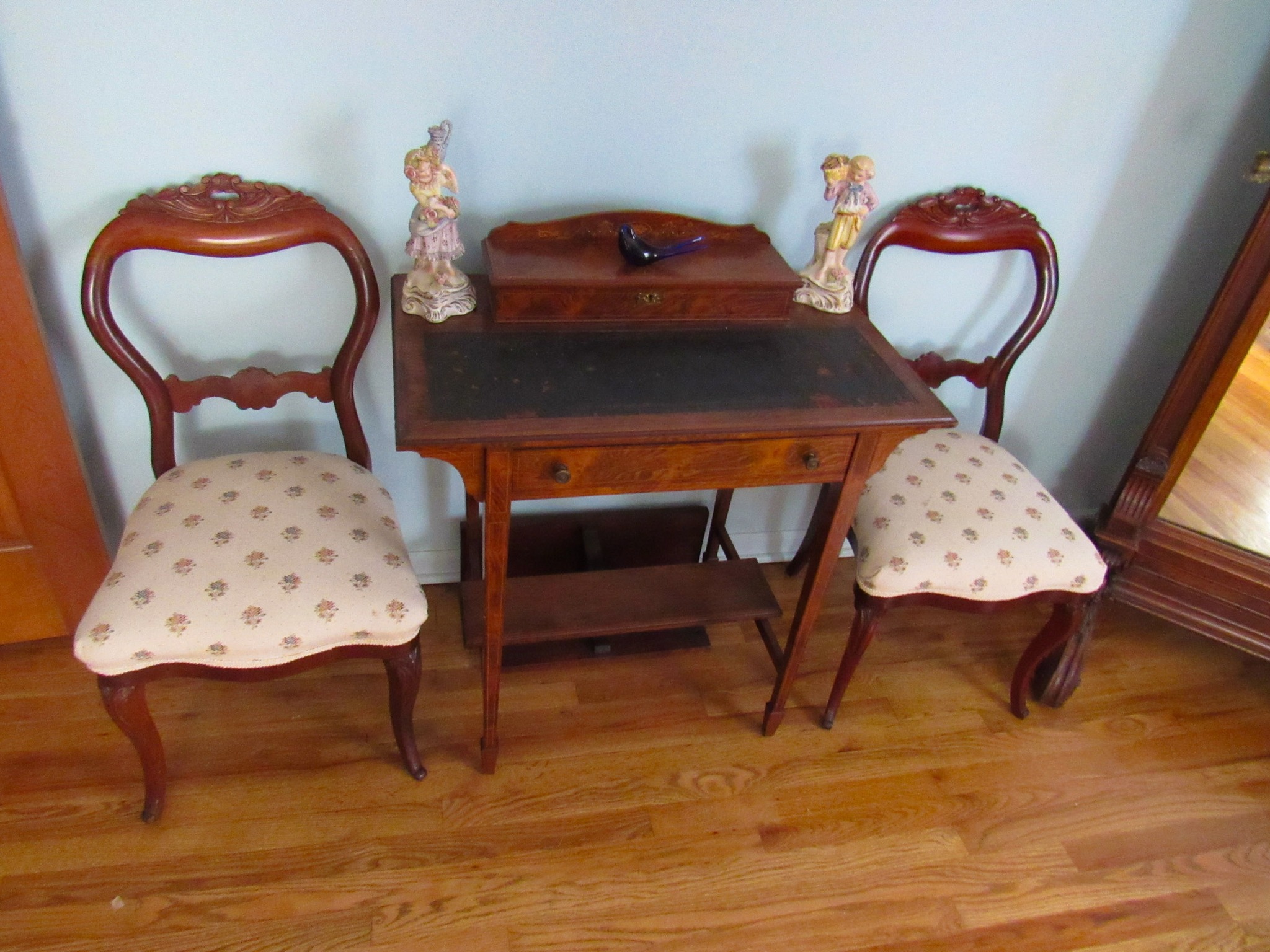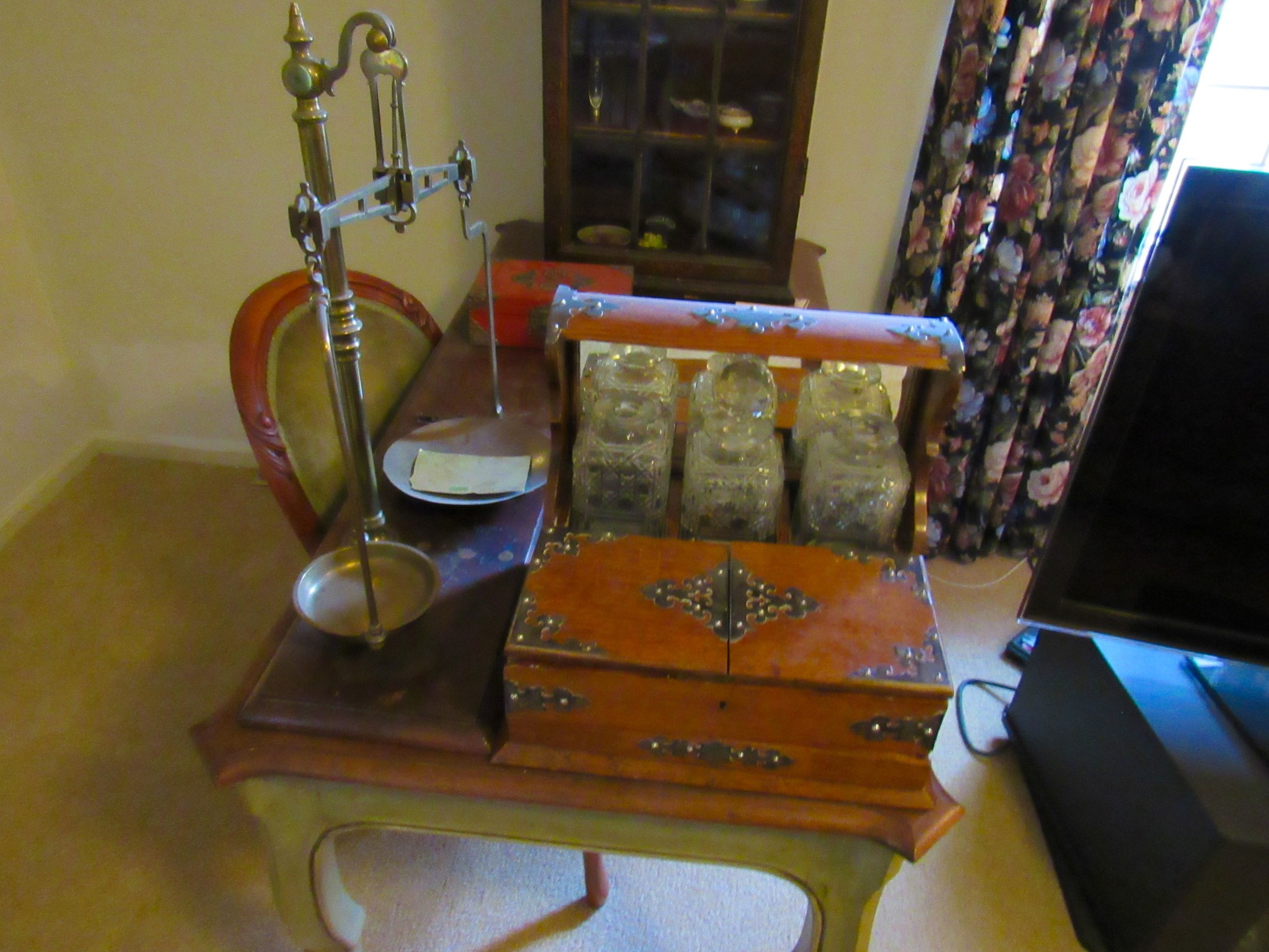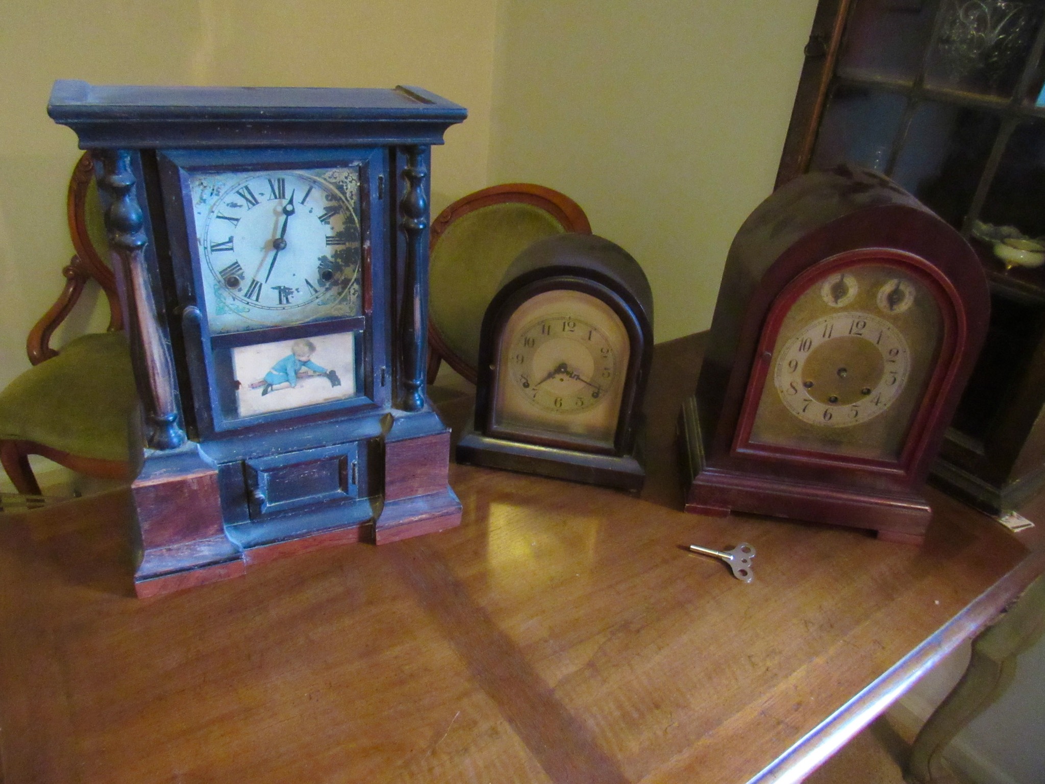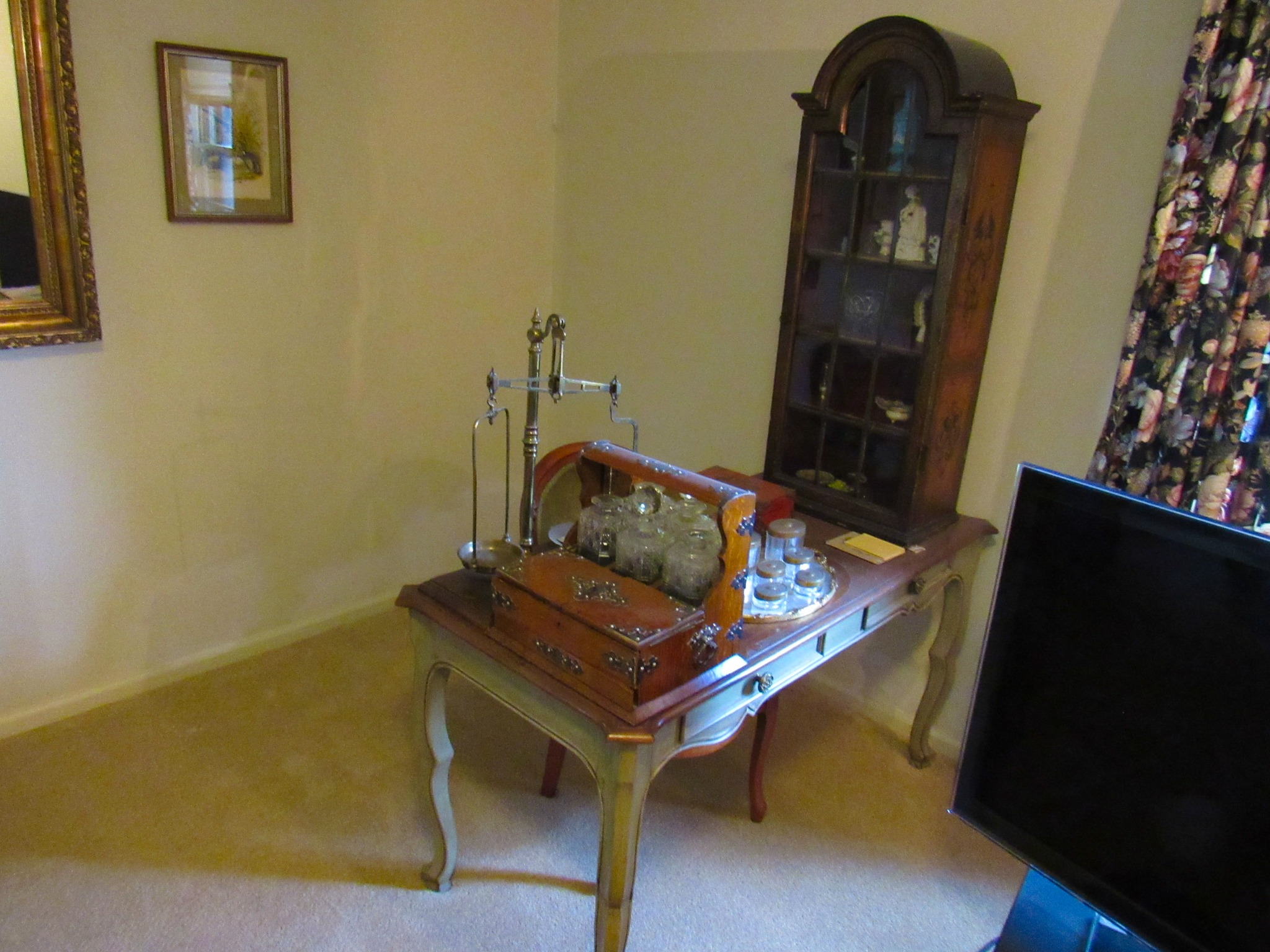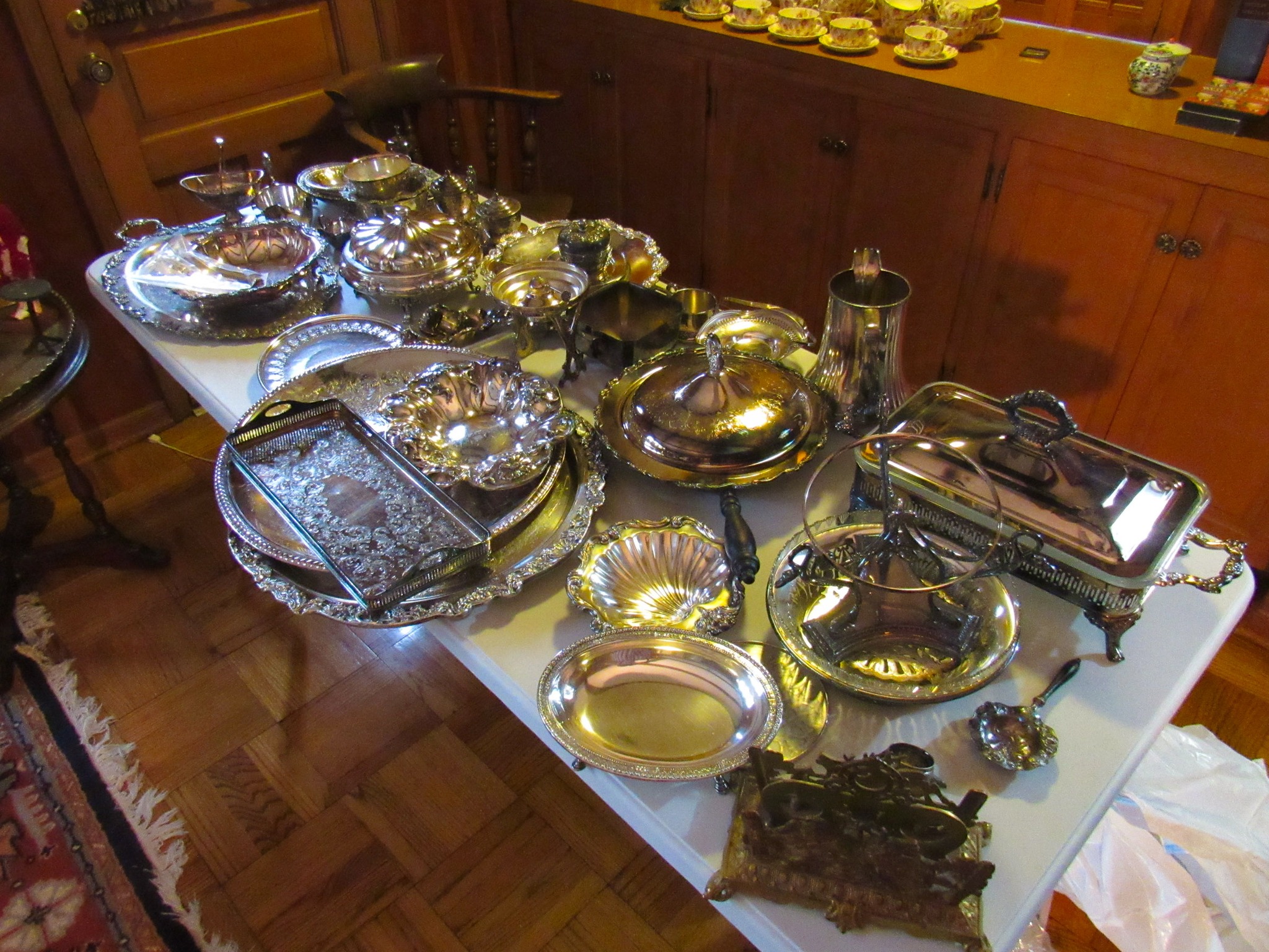Victorian Matching Orante China Curio Cabinets; Victorian Marble Top Sideboard Buffet Cabinet; Solid Brass Bed; Unusual Victorian Style Corner Cabinet; Wedgewood Coffee Table; Victorian Marble Top Dresser & Mirror; Full Length Dressing Mirror; Entry Chair; Marble In-Laid End Table; Matching Needle Point Chairs; Sewing Rockers; Make-Up Table; Cane Rocker; Smoking Table; Walnut Bed; 2 Cedar Chests; 7 ft. Vintage German Grandfather Clock; Ingraham Wall Clock; Atkins Regulator Clock; Seth Thomas & German Mantle Clocks; Iranian Wool Area Rug; Area Rugs; Oriental Wall Tapestry; Vintage Lamps & Shades; 1883 Cornelia Schouten Canvas Frame Art Picture; O Franta Framed Art Picture; Pastry Eaters Bartolome Murillo framed picture; Vintage Framed Pictures; Wrought Iron Patio Set Table / Chairs / Loveseat / Tea Cart / Lounger / Side Tables; Stained Glass
