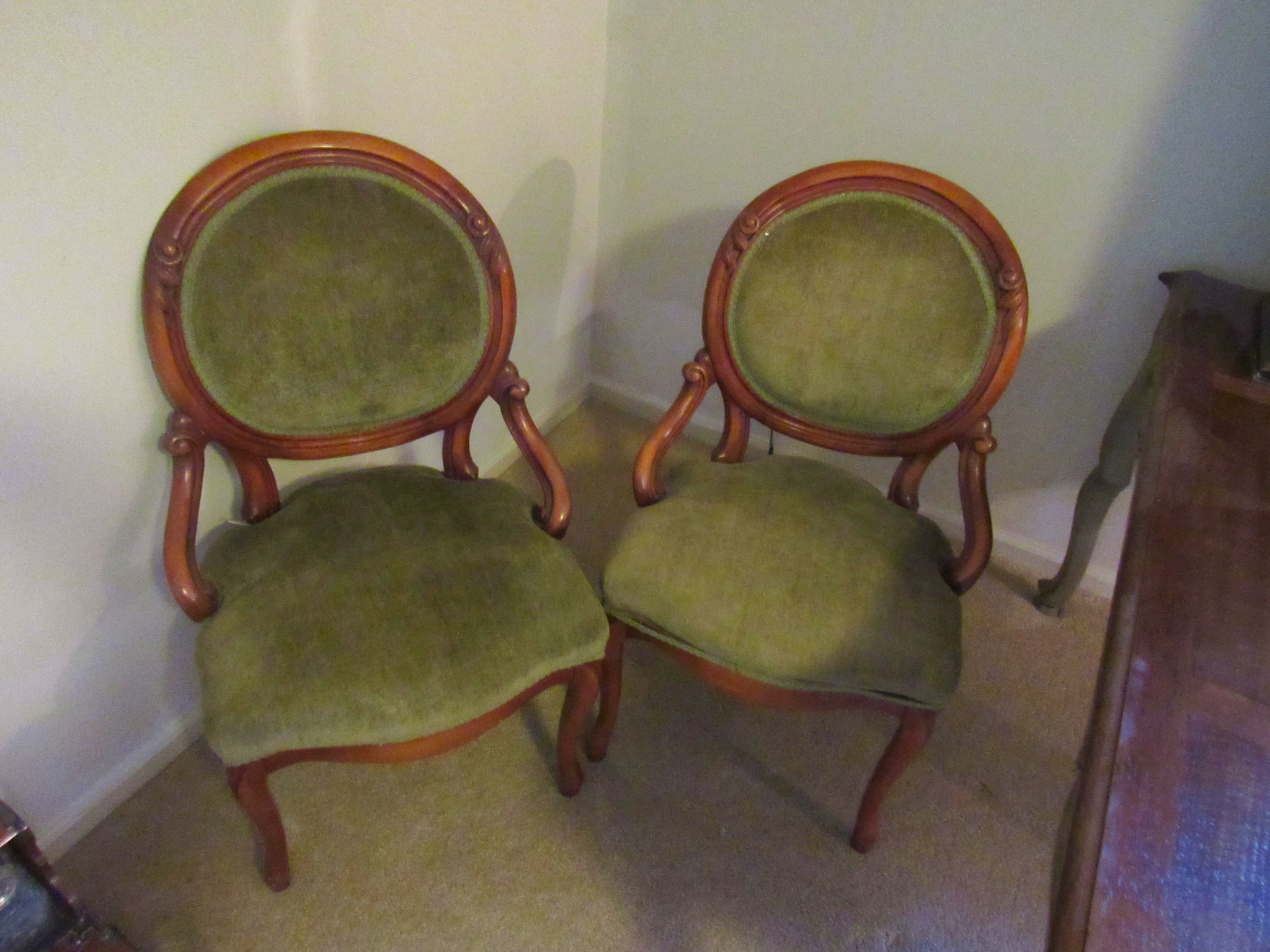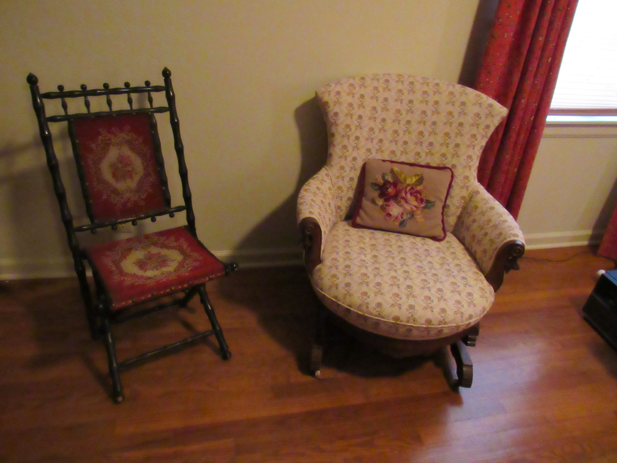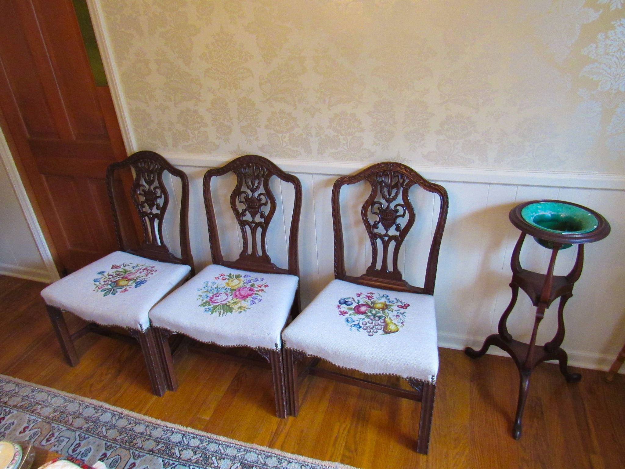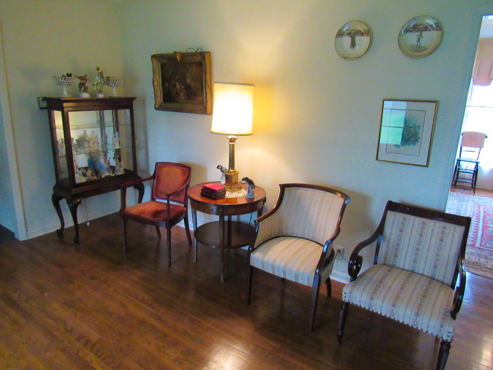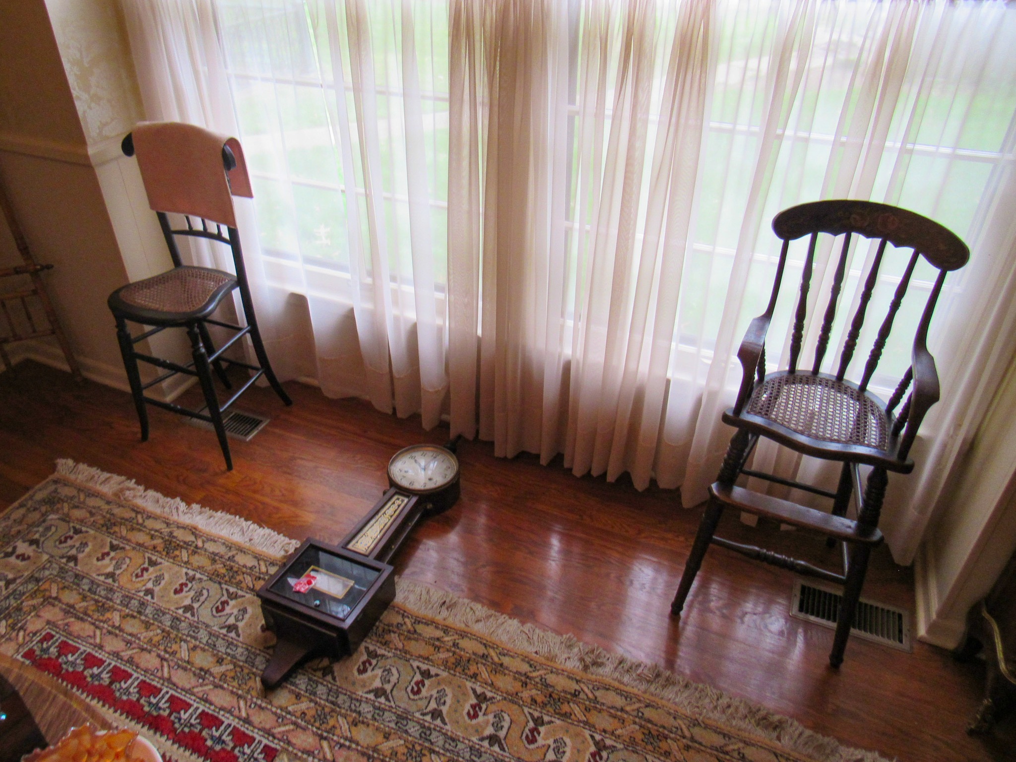 Victorian Matching Orante China Curio Cabinets; Victorian Marble Top Sideboard Buffet Cabinet; Solid Brass Bed; Unusual Victorian Style Corner Cabinet; Wedgewood Coffee Table; Victorian Marble Top Dresser & Mirror; Full Length Dressing Mirror; Entry Chair; Marble In-Laid End Table; Matching Needle Point Chairs; Sewing Rockers; Make-Up Table; Cane Rocker; Smoking Table; Walnut Bed; 2 Cedar Chests; 7 ft. Vintage German Grandfather Clock; Ingraham Wall Clock; Atkins Regulator Clock; Seth Thomas & German Mantle Clocks; Iranian Wool Area Rug; Area Rugs; Oriental Wall Tapestry; Vintage Lamps & Shades; 1883 Cornelia Schouten Canvas Frame Art Picture; O Franta Framed Art Picture; Pastry Eaters Bartolome Murillo framed picture; Vintage Framed Pictures; Wrought Iron Patio Set Table / Chairs / Loveseat / Tea Cart / Lounger / Side Tables; Stained Glass