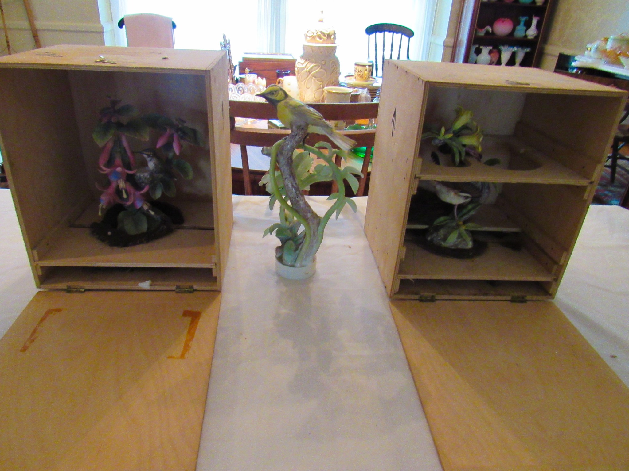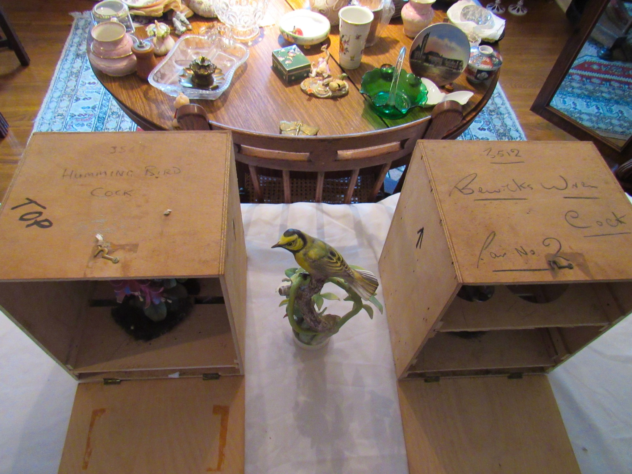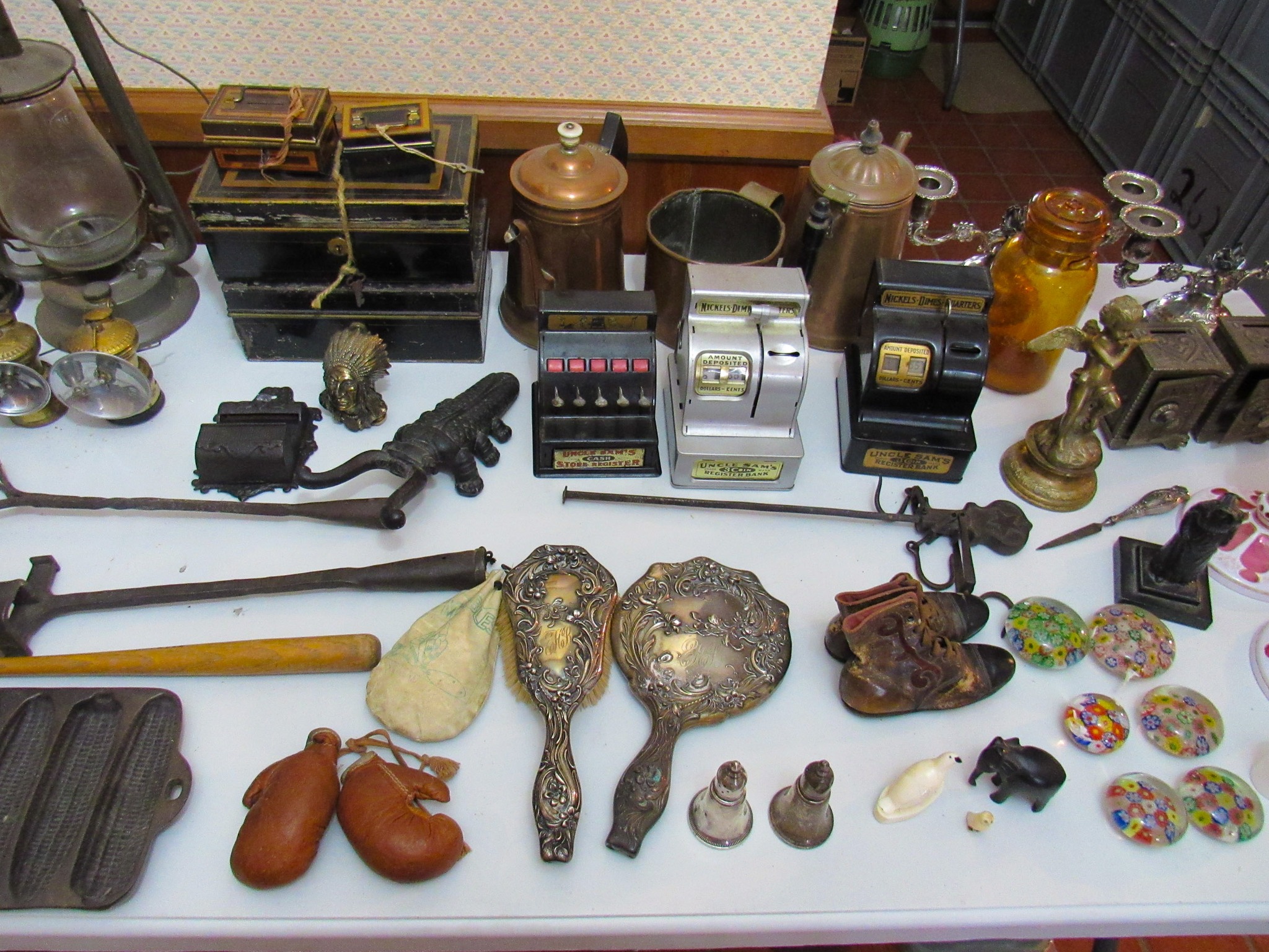 2 Vintage 12 in. Brass Cannons w/ Cast-Iron Carts; Structo Artcraft Metal Desk Top Loom; Dresser Set; Oak Dresser Box Liquor Set; Rayo Oil Lamp; 1920’s 3 ½ in. Salesman Sample D&M Draper & Maynard Lucky Dog Logo Leather Ball Glove; 1920’s Miniature Leather Boxing Gloves; “Safety” Amber Qt. Jar; 1930’s Sinclair Oil Building Paperweight Desk Plaque; Sinclair “Power X” Tin Gas Pump Bank; 2 in. Diameter German Swirl Vintage Marbles; Swirl Vintage Marbles; Marble Vintage Bags; The Flambeau Room Plaza Club Law. KS. Zippo Lighters; Zippo Inlaid Lighter; Firebird Oil Lighters; Paperweights; Uncle Sam Cash Registar Coin Banks; Army / State Safe Cast-Iron Banks; Brass Jelly Kettle Buckets; Coffee Mill; Indian Chief Desk Weight; The Pioneer Women Cast-Iron Statue; Cast-Iron Postal Scales & Others; Cast-Iron Letter Stamp; Griswold #2 Large Logo 703 Erie Pa. Cast-Iron Skillet(Rare!); Cast-Iron Skillets / Krusty Korn Muffin Pan & Griddle; Cast-Iron Pots w/ handles; Wellsville KS Bank Bag; tin types; branding irons; Tobacco Scales; Dietz #0 Tubular Lantern; carbine lanterns; Mini Brass Bugles; Tyco Train; Whiskey Crocks; Butter Crock; Pottery; Wooden Duck Decoys (1979 The Sporting Life & Stoney Point”); Hudson Bay Wool Blanket w/ Box; Pendleton Blanket; Hand Made Quilts; Sewing Buttons; Elephant Bookends; Shriners Abdallah Fez Hat; Simpich Christmas Caroler Character Dolls; 20 + Vintage Dorothy Doughty Royal Worcester Birds w/ Original Wooden Shipping Boxes: Humming Bird Cock 3549 Hen 3548, Wren Cock 3512 Hen 3513, Yellowheaded Blackbird Cock 3464 Hen 3465, Elf Owl & Saguaro 3617, Hooded Warbler Hen 3591, Mountain Bluebird Cock 3665 Hen 3666, Audubon Warbler Cock 3669 Hen 3670, Myrtle Warbler Cock 3503 Hen 3504, Vermillion Fly Catcher Cock 3657 Hen 3658, Bluebird Cock 3135 Hen 3136, Canyon Wrens Cock 3639 Hen 3640, Orange Blossom Set (No Boxes); 24 place Setting Spode Rosebud Chintz set w/ Serving Pieces!; Royal Crown Derby Tea Set; Wedgewood “Wildbriar” England Place Setting; Fenton Brides Basket w/ Metal Stand; Fenton Vases & Baskets; 100’s of Pieces of Glassware: Germany / Austria / Bavaria / Belleek / Carnival / France / Royal Doulton / Depression / Waterford / & Much More!; Large Assortment Silver Plated Platters / Bowls / Utensils / Etc.!; Miniature Sets; Ink Well Set w/ Wooden Box; Head Busts & Statues; glass ornament balls; 1903 Hamlet Book & Vintage Books; Life Leather Western Book Set; Native Am. & Firearms Books