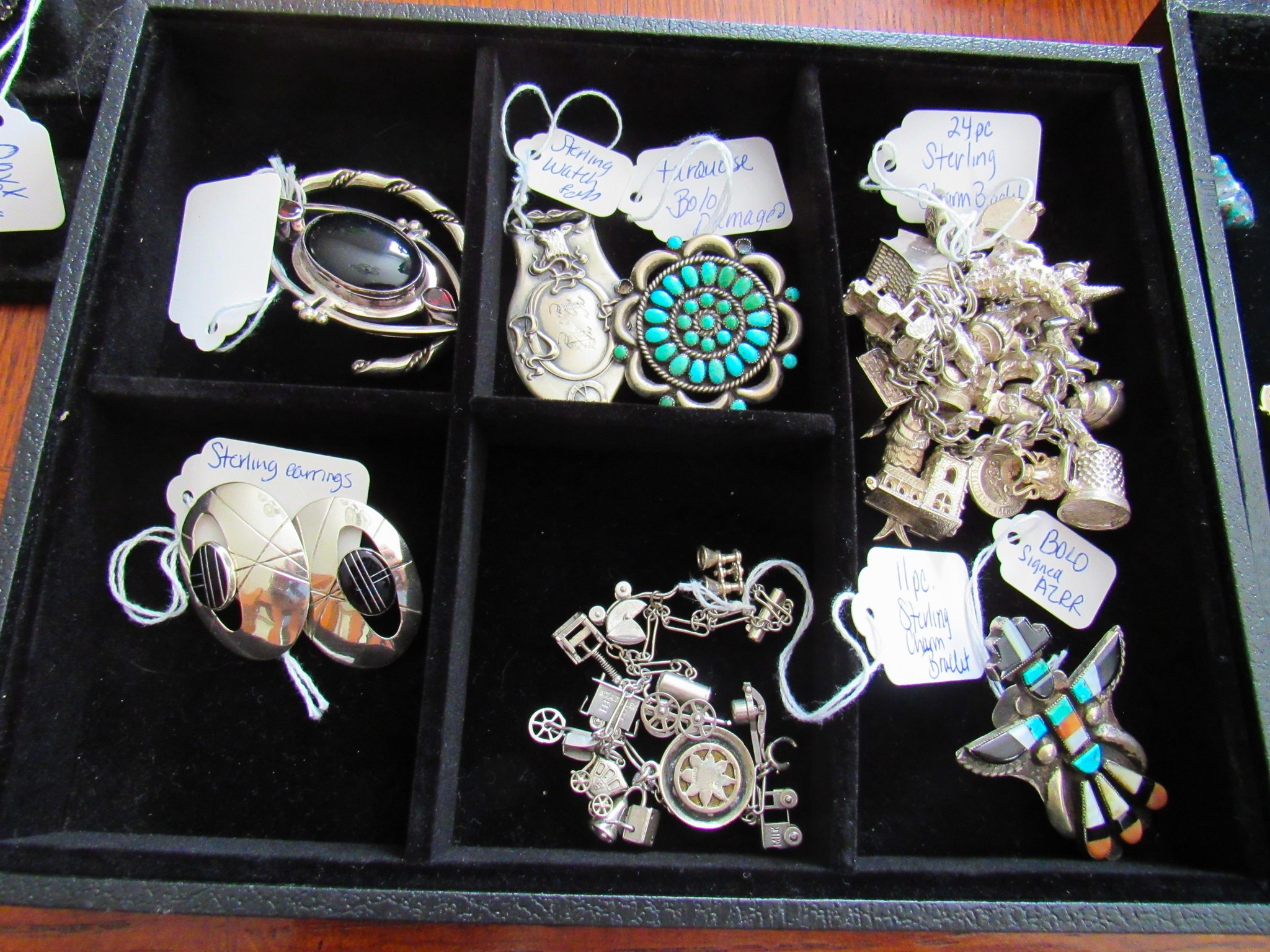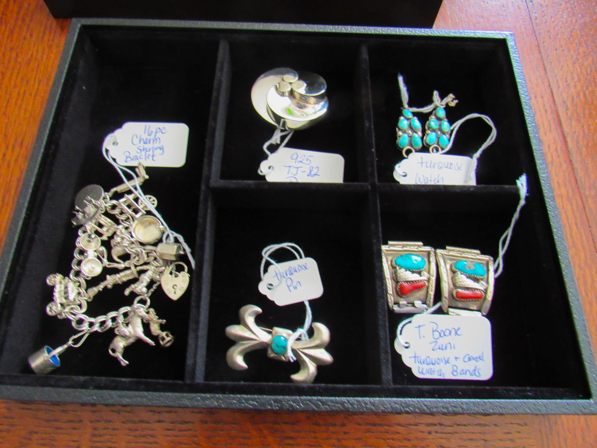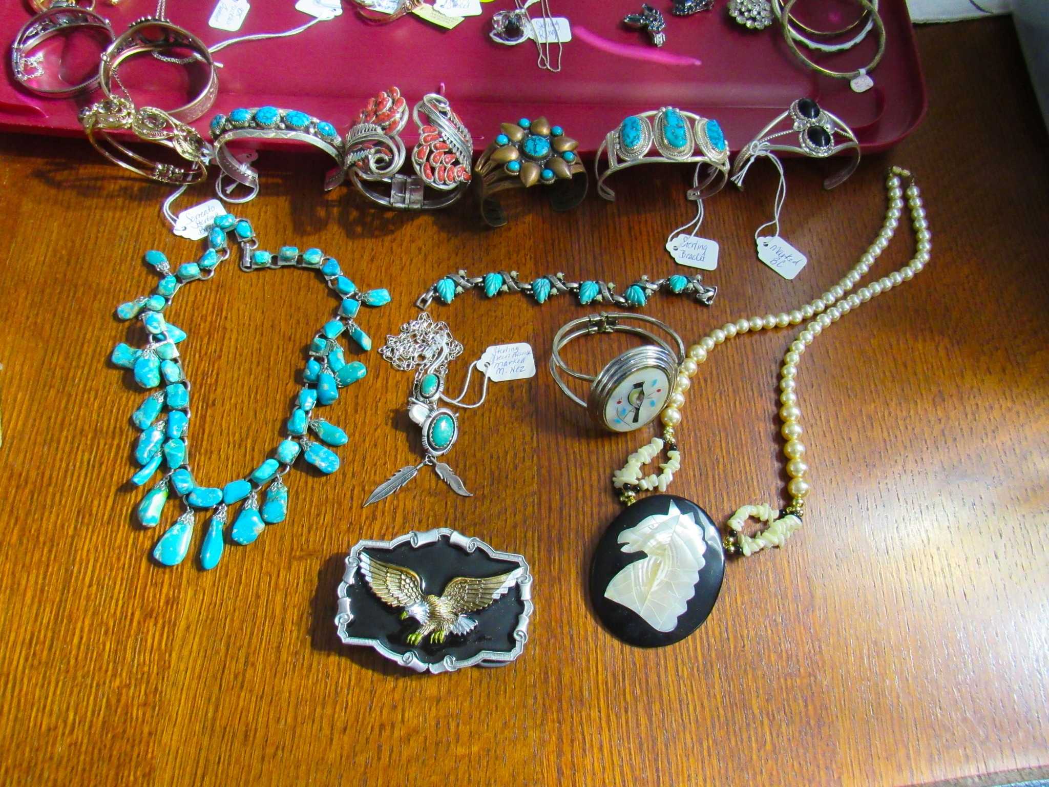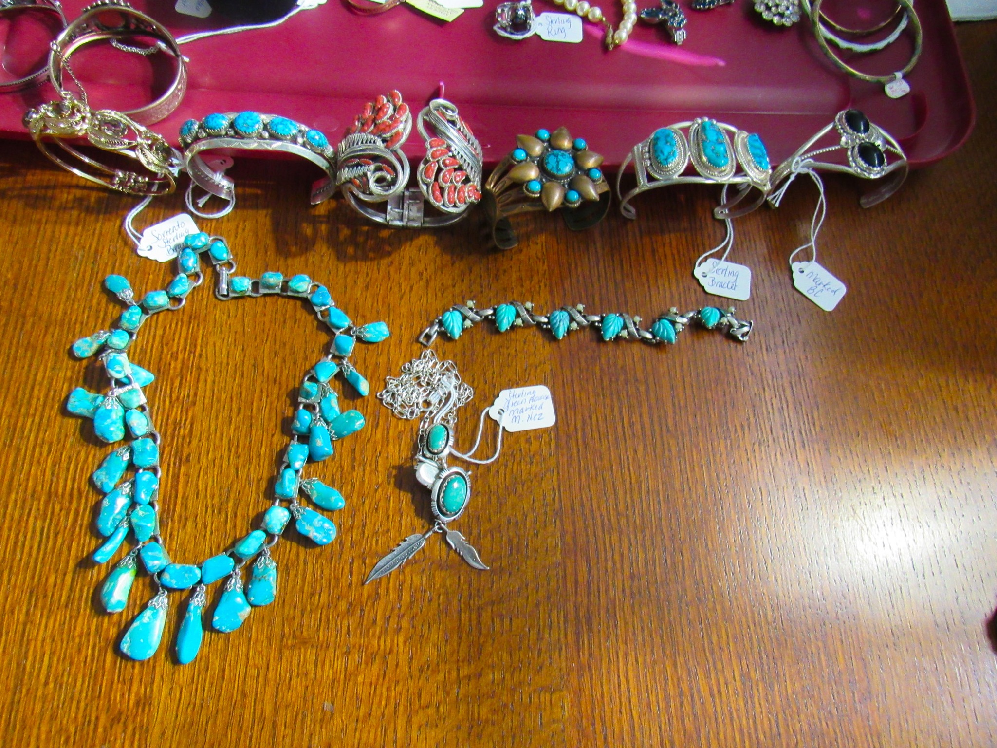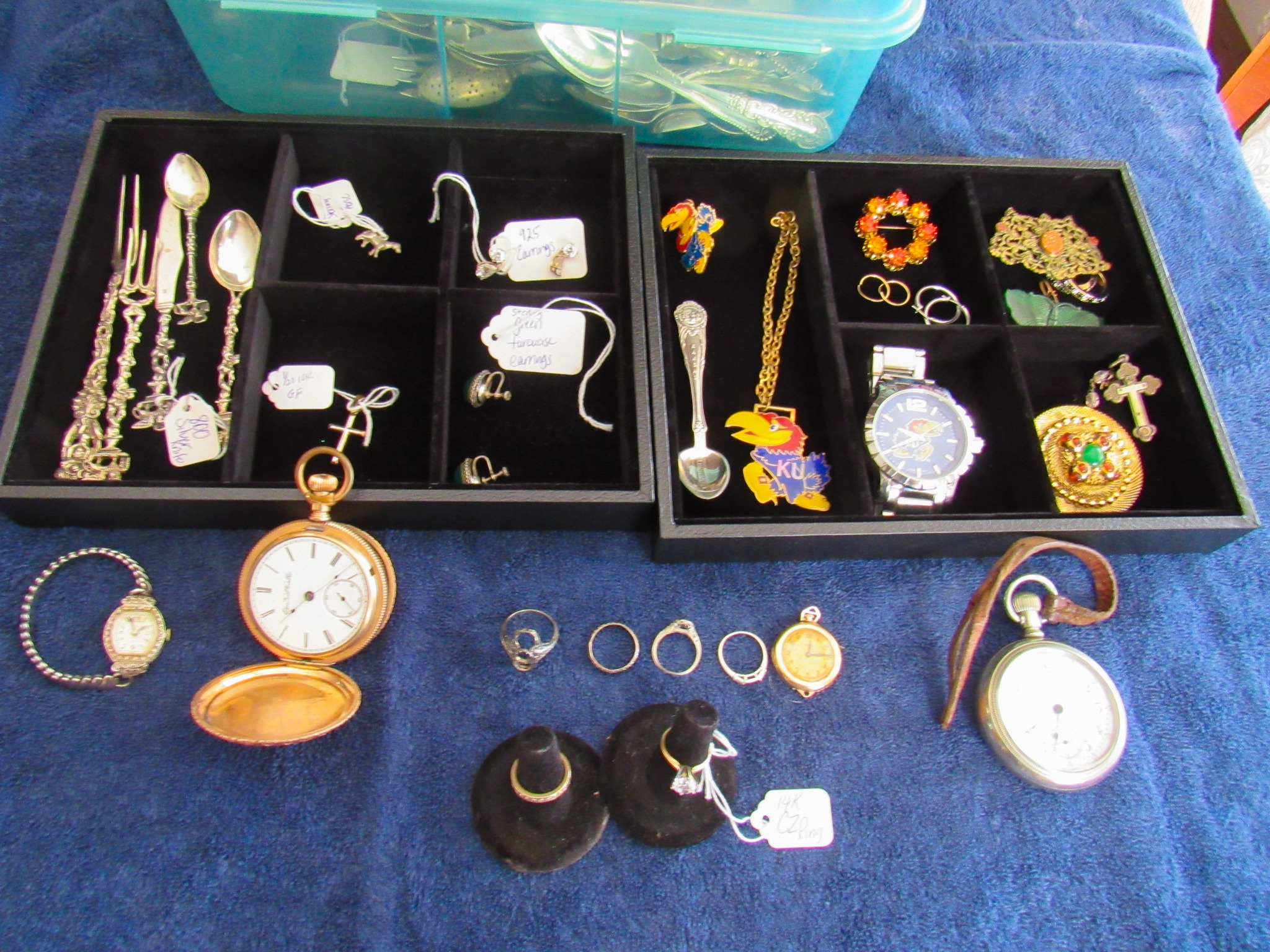 100 + Sterling Silver Pieces: Candle Holders / Dresser Set / Utensils / Perfume Bottle / Child’s Cup / Etc.!; 100 + Pieces of Turquoise: Including Cuffs / Watch Bands / Rings / Pendants / Etc.; 300 + Pieces of Sterling / Gold / Vintage Jewelry: 14K CZ Ring / 14K CZ Wedding Band / Sterling Charm Bracelets (11 / 16 / 24 Pieces) / Sterling Rings, Bracelets, Earrings, Sterling Signed Carson B Cuff Watch, Etc. / Carved Coral Bird Pendent / Platinum Scrap Rings; Jayhawk Jewelry Pieces; Turquoise & Coral Watch Bands; Elgin & Waltham Pocket Watches; Watches; Many Vintage Jewelry Pieces!