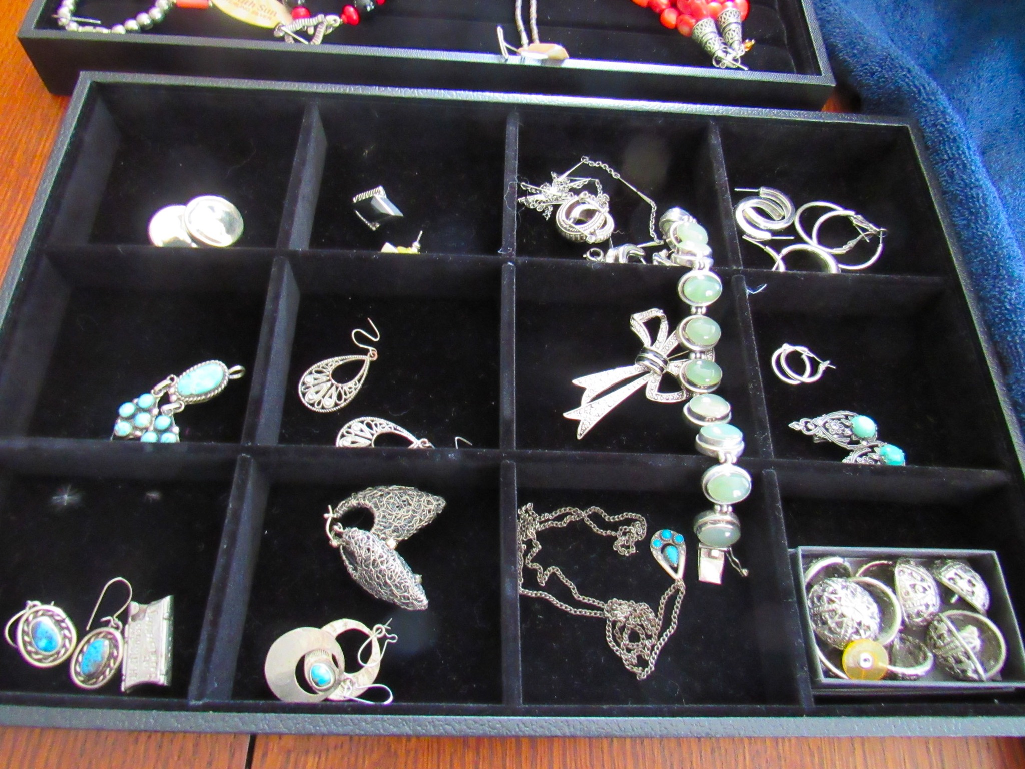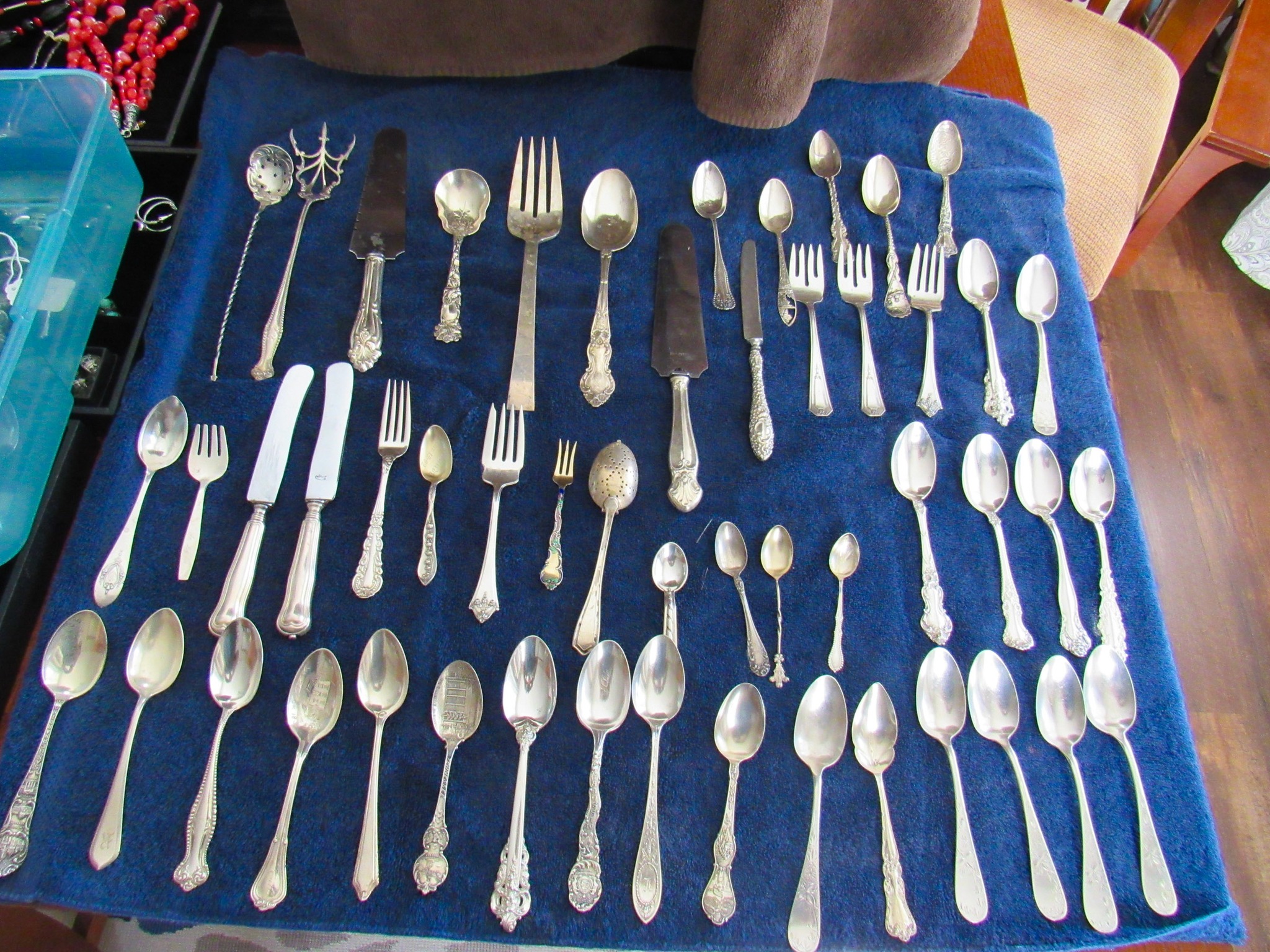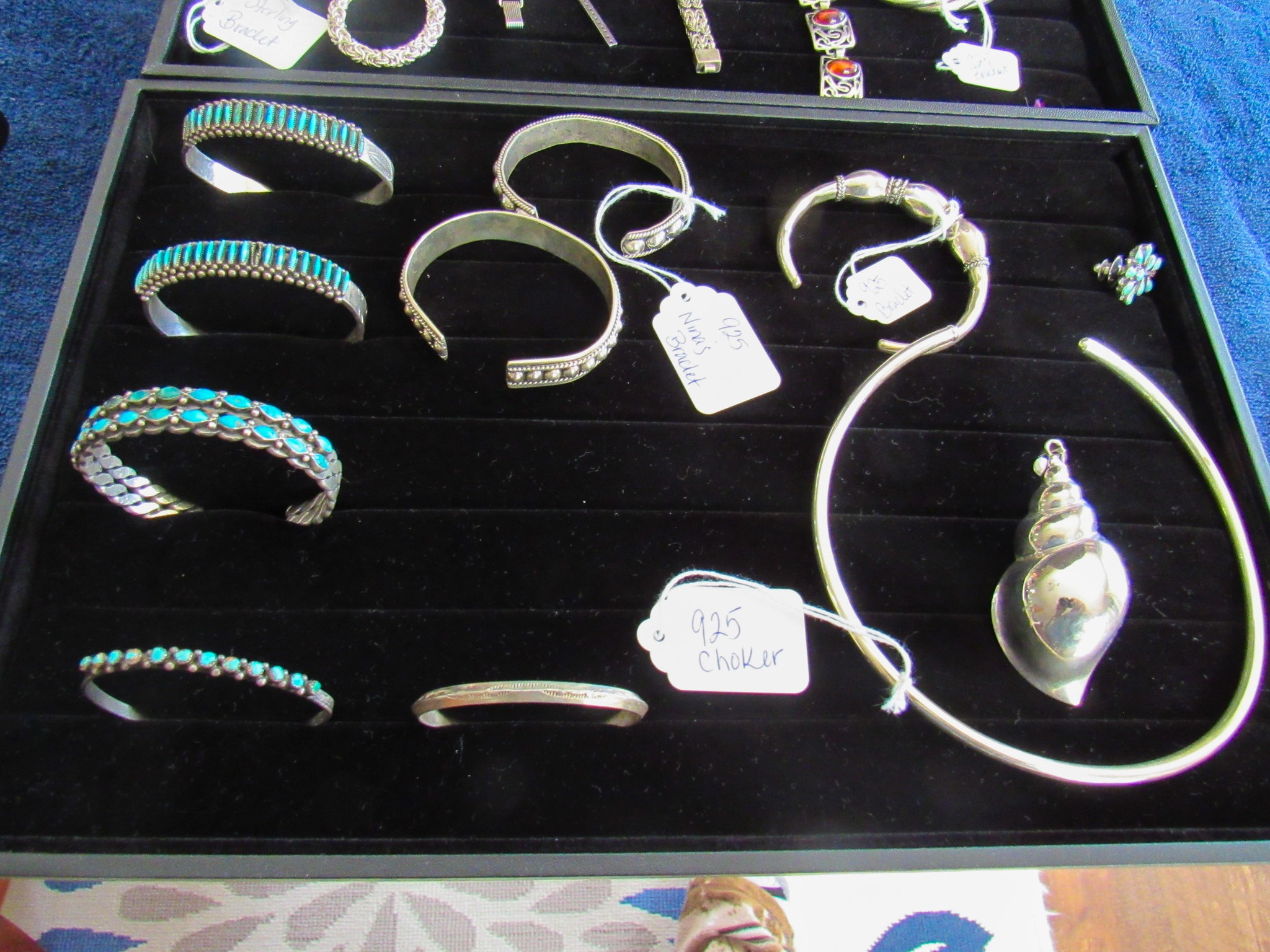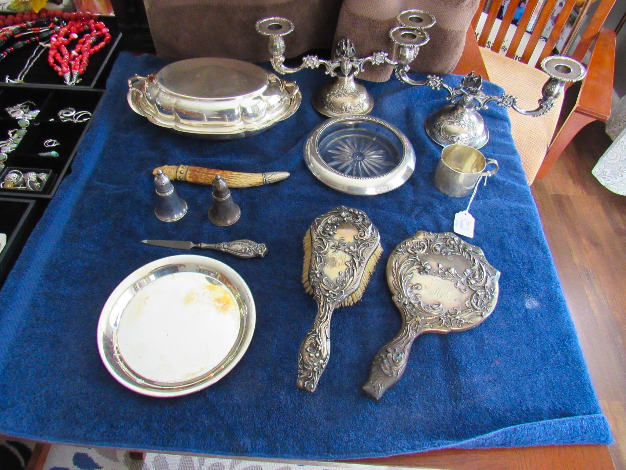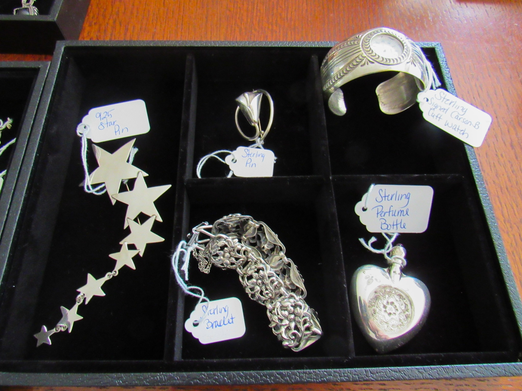 100 + Sterling Silver Pieces: Candle Holders / Dresser Set / Utensils / Perfume Bottle / Child’s Cup / Etc.!; 100 + Pieces of Turquoise: Including Cuffs / Watch Bands / Rings / Pendants / Etc.; 300 + Pieces of Sterling / Gold / Vintage Jewelry: 14K CZ Ring / 14K CZ Wedding Band / Sterling Charm Bracelets (11 / 16 / 24 Pieces) / Sterling Rings, Bracelets, Earrings, Sterling Signed Carson B Cuff Watch, Etc. / Carved Coral Bird Pendent / Platinum Scrap Rings; Jayhawk Jewelry Pieces; Turquoise & Coral Watch Bands; Elgin & Waltham Pocket Watches; Watches; Many Vintage Jewelry Pieces!