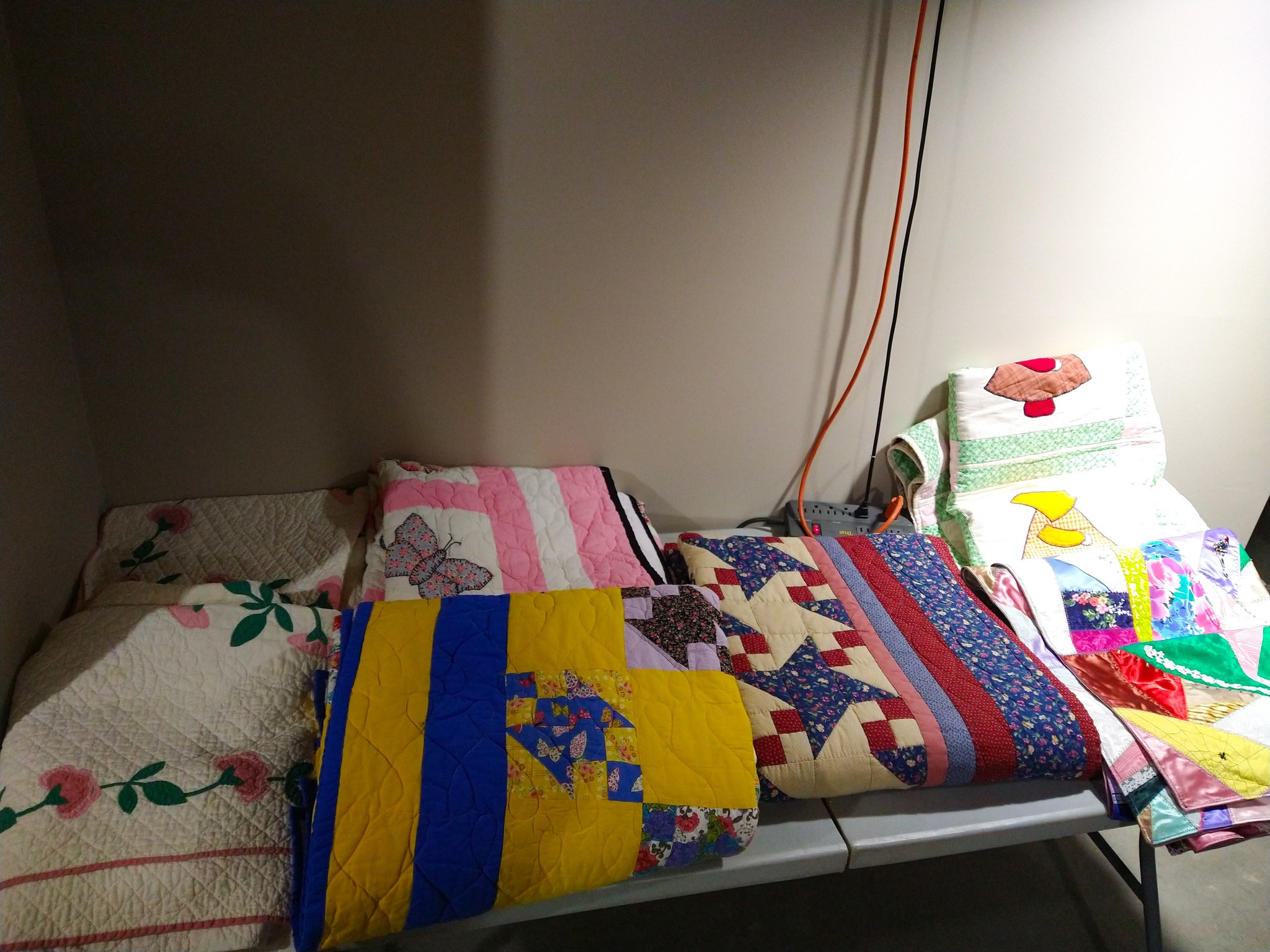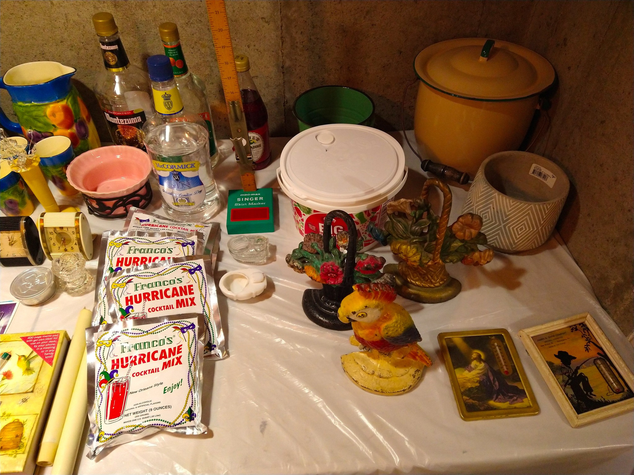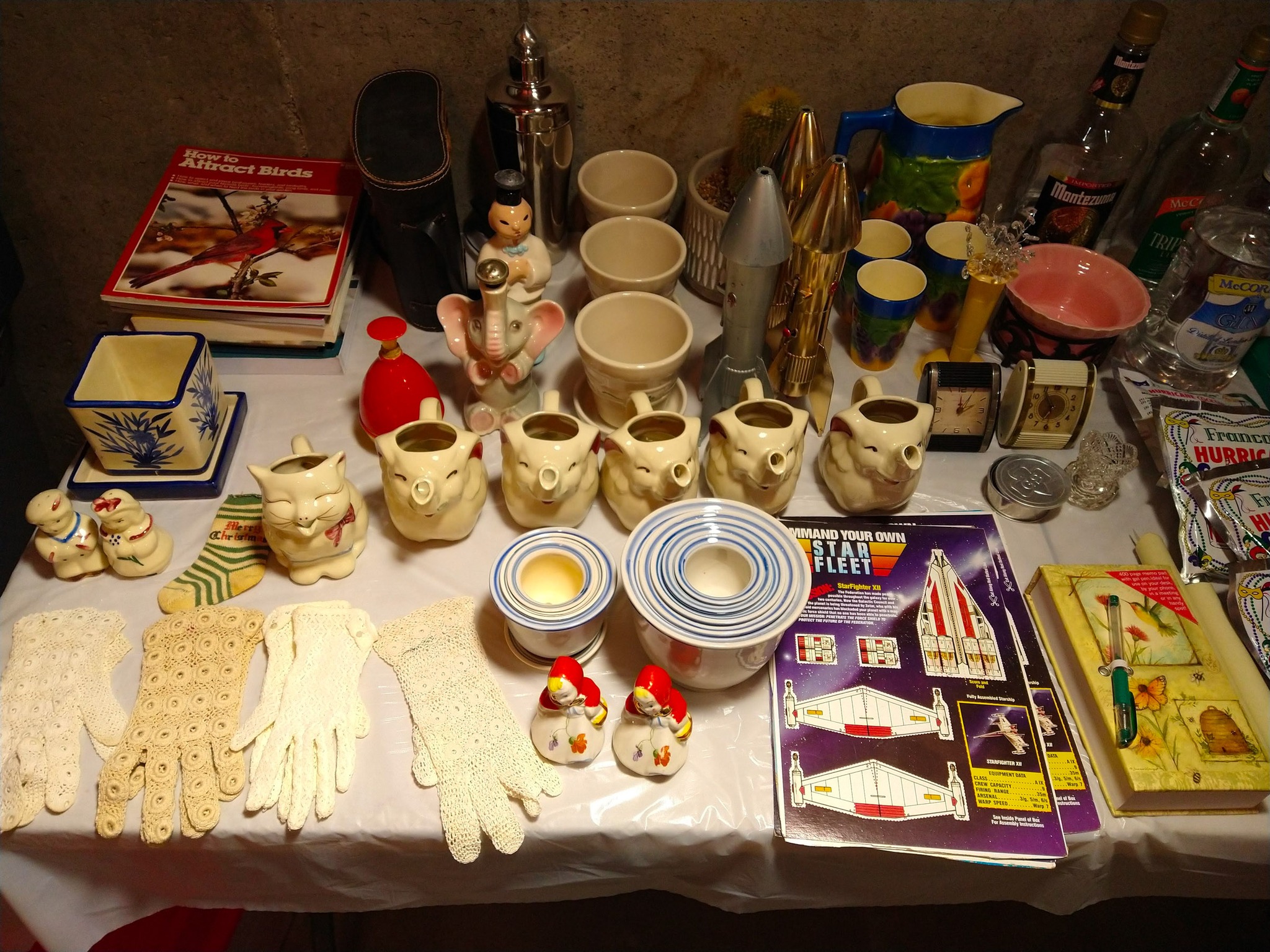 COLLECTIBLES: ROSEVILLE 8 IN COOKIE JAR – ROSEVILLE # 358, 12” BASKET – ROSEVILLE POTTERY WALL POCKET – HALLMARK LITTLE GALLERY PEWTER FIGURES – GLASS MARBLES – OLD POCKET KNIVES – SWISS ARMY WRIST WATCH – IRON # 418 CAMEL BOOKENDS – SETS SAILING SHIP IRON BOOKENDS – METAL MERCURY ROCKET BANKS – METAL WORLD GLOBE COIN BANK – METAL SAFERON, MASS ENGL. IRON – S&P TOASTER SET – CHEF S&P SET – FLAT IRON – SAD IRONS w/ HANDLES – HUMMEL 36 / 0 HOY CHILD FONT – HUMMEL 1959 GUARDIAN PRAYING ANGEL – HUMMEL #446 ANGEL DUET – HUMMEL #142 PRAYING ANGEL – HUMMEL #207 HEAVENLY ANGEL – HUMMEL 22 / 0 ANGEL CHILD, ALL ABOVE ARE FOUTS – MCCOY 8 IN CROCK BOWL – MEAKIN IRONSTONE CREAMER – LARGE IRON SHIP DOOR STOP – 2 QUILTS w/ FLOWERS – BUTTERFLY QUILT – PATCH WORK QUILT – SQUARES & STARS QUILT – SUN BONNET BABIES QUILT – LARGE SILK THROW – QUILT TOP – SHAWNEE SAILOR BOY & BO PEEP S&P – HULL LITTLE RED RIDING HOOD S&P – SHAWNEE PUSS’N’BOOTS CREAMER – SHAWNEE ELEPHANT CREAM PITCHER – ELEPHANT SPRINKLER – CHINESE LAUNDRY MAN SPRINKLER – 7 ½ IN ART DECO URBOCH BLOWN FRUIT PITCHER & 3 TUMBLERS – GRANITE CHAMBER POT w/ BALE – IRON FLOWER DOOR STOPS – IRON PARROT DOOR STOP – ADV THERMOMETER w/ PICTURES – LONGABERGER 1994 JINGLE BELL BASKET – LONGABERGER 1994 BASKET – ICE TONGS – GALVANIZED SPRINKLERS – FANCY DOLL CARRIAGE – GLASS BASKET w/ ART FLOWERS – HALLS 3 PC BOWL SET – PINK DEPRESSION SAUCERS – SHAWNEE MILK CAN S&P – MCCOY COOKIE TUB – FIESTA PLATTER, BOWL, MIXING BOWLS – HALLS BALL PITCHER – HALLS BOWLS – HALLS COVERED CASSEROLE – POTTERY CHAMBER POT – BURMA SHAVE JAR w/ LID – SHAWNEE CREAM PITCHER & S&P – LEVENGER REPLOGGE ART DECO 1930’S, 1990 WORLD GLOBE – FANCY HANDMADE AFGHANS – LARGE HAND SEWN, LACE BED SPREADS – SUN BONNET BABY LAP QUILT – MANY FANCY LACE DOILIES – LARGE OFFERING HAND SEWN LINENS – ADV YARD STICKS – SET DAYS OF THE WEEK TOWELS, HAND EMBROIDERY – LINEN TABLE CLOTHS – CISTERN PUMP –