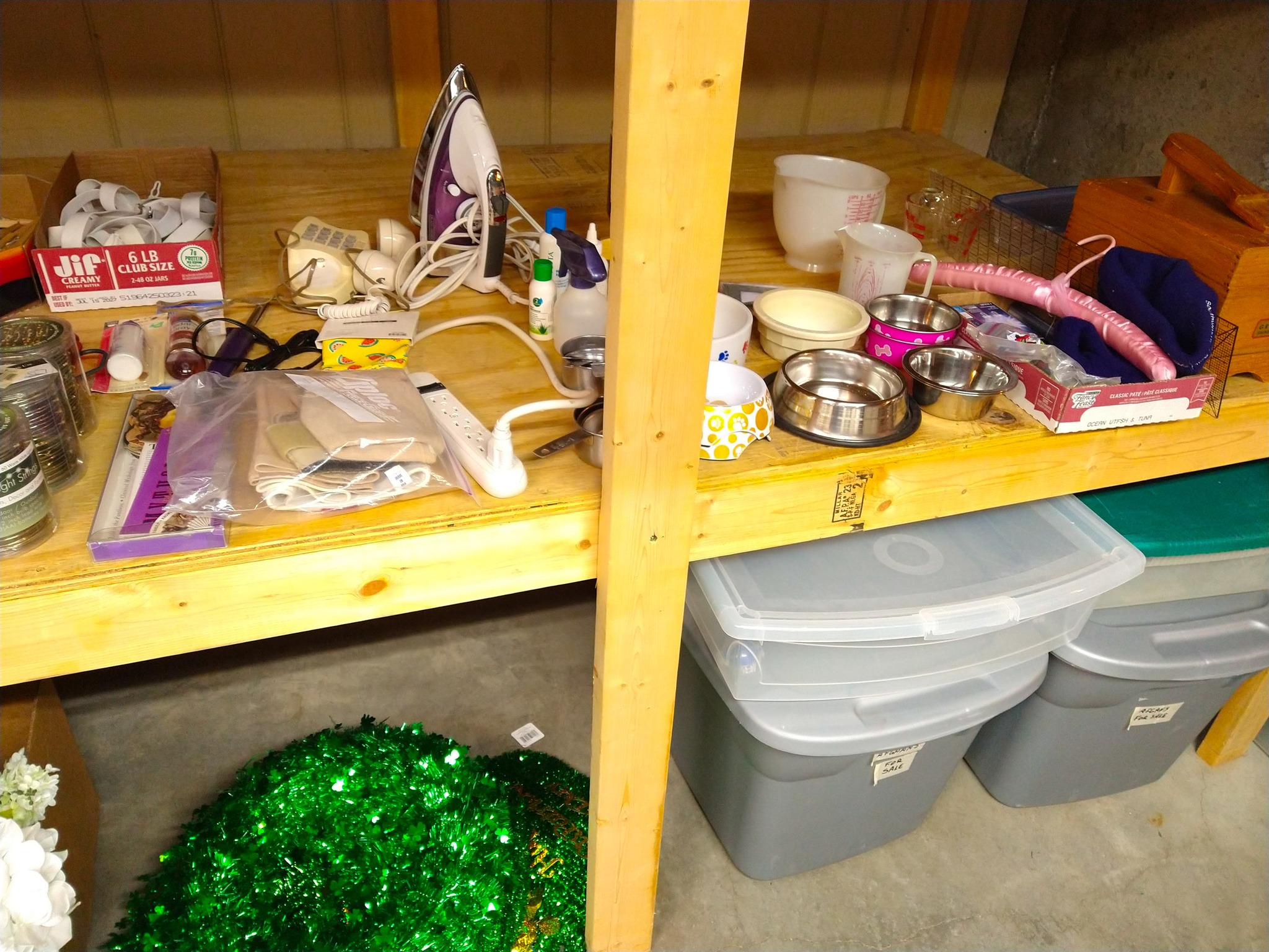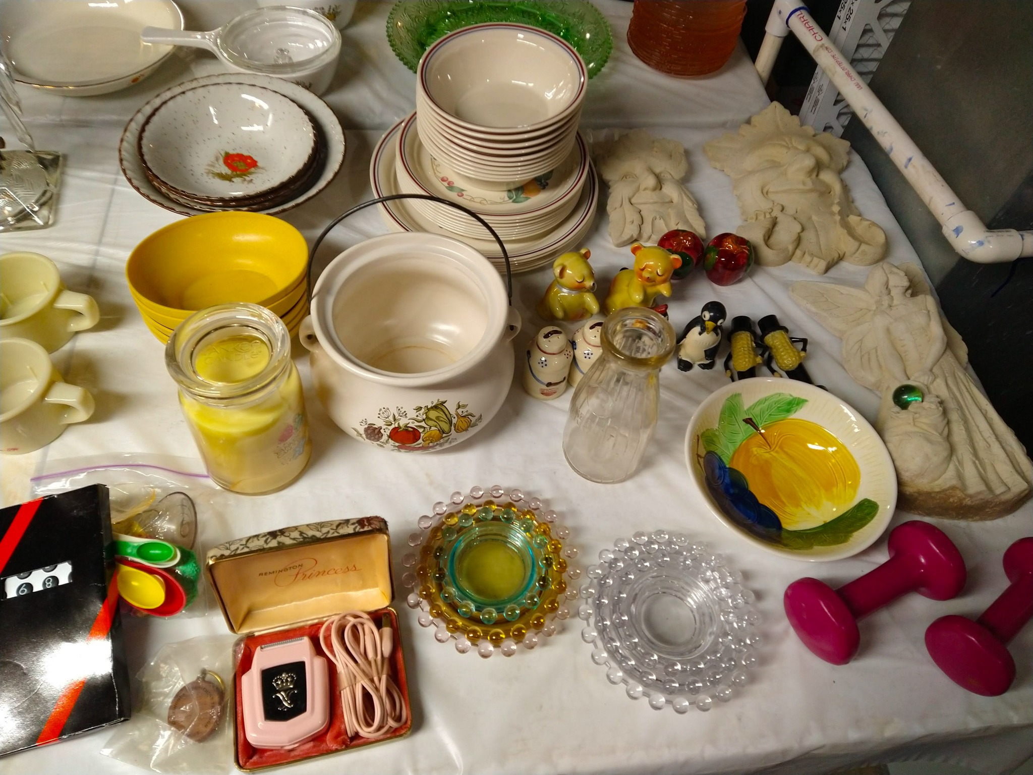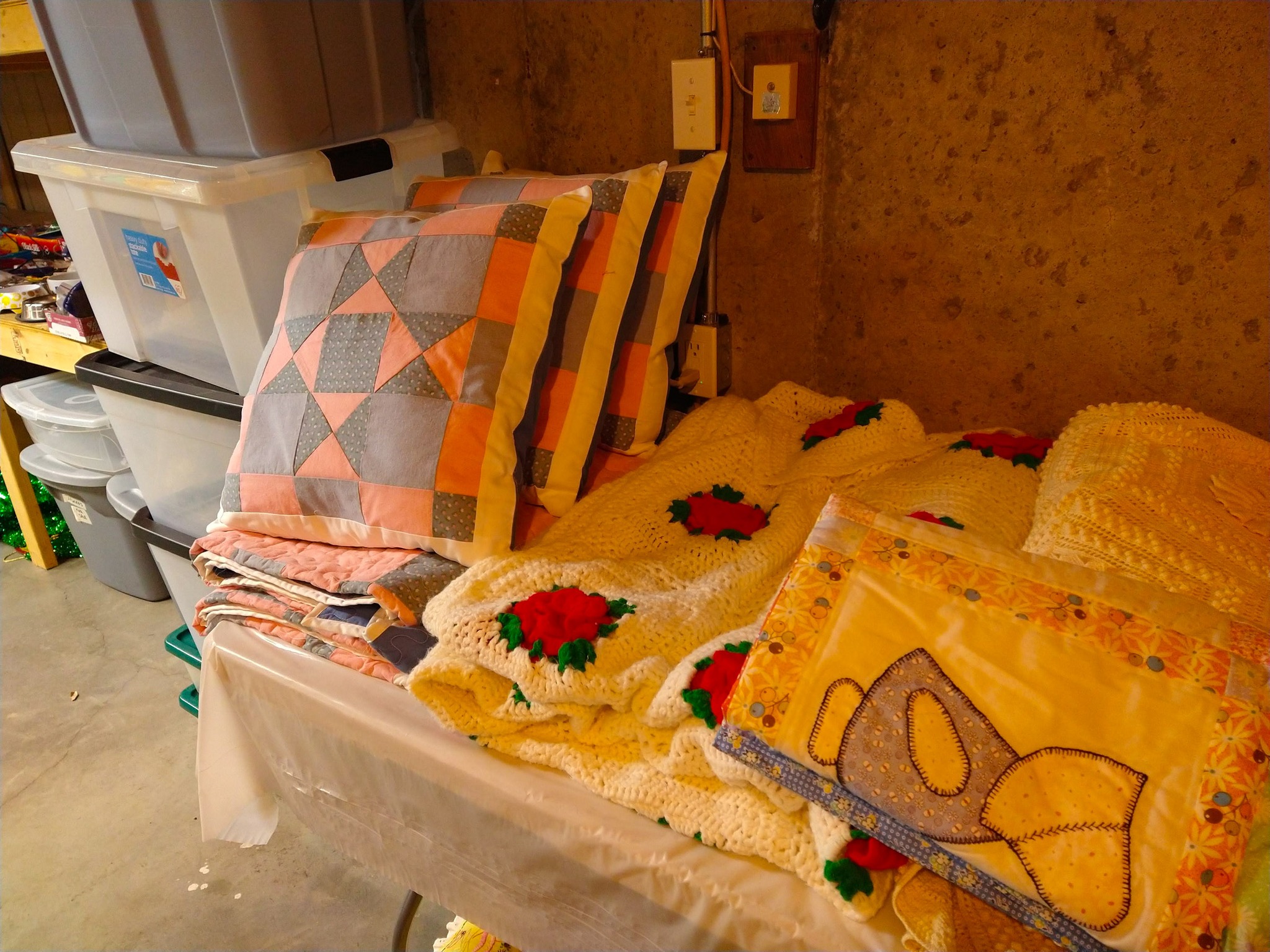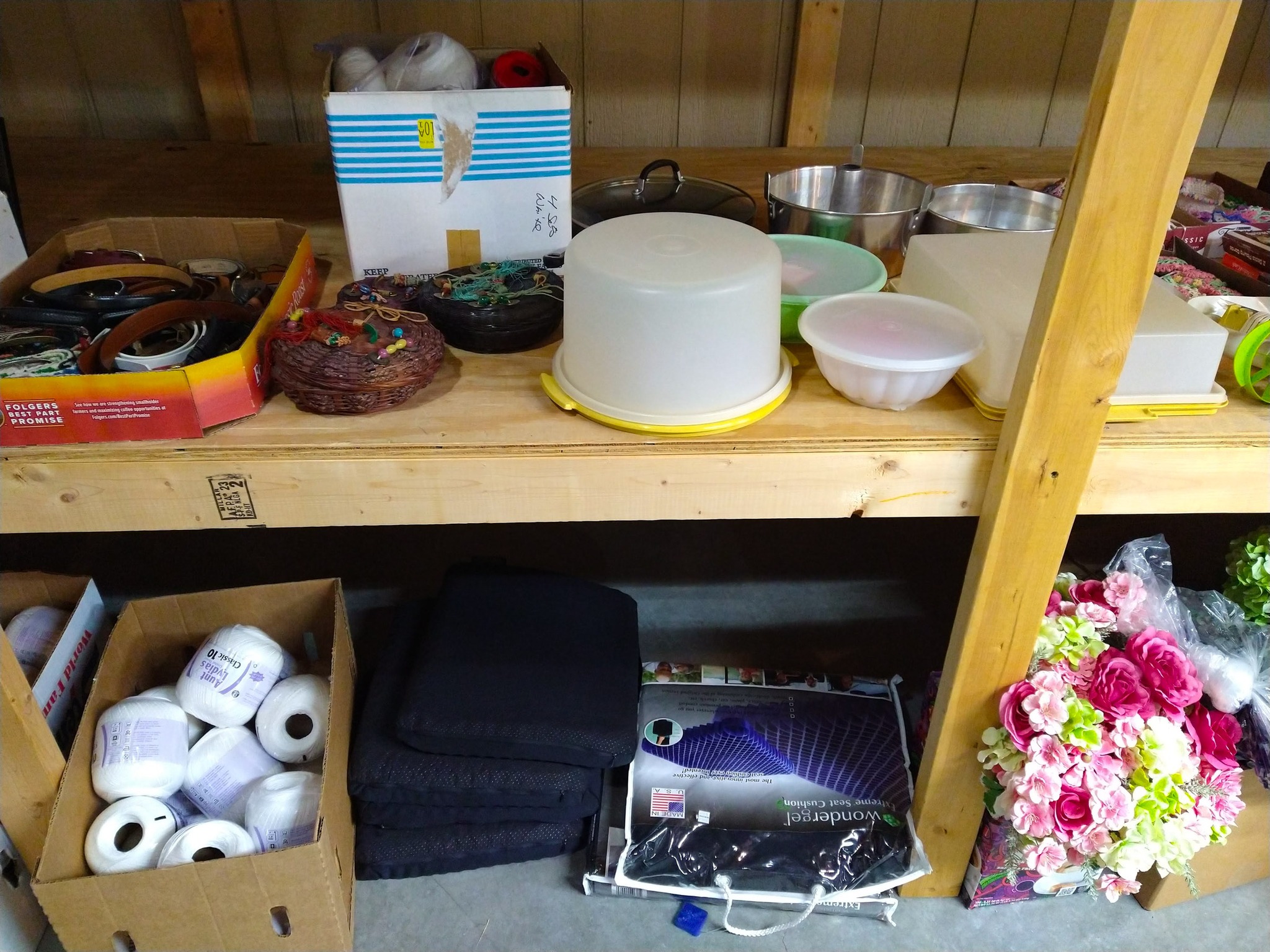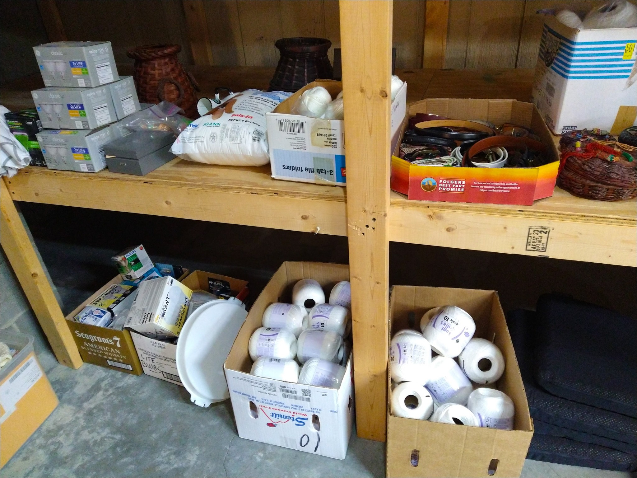HOUSEHOLD: LARGE OFFERING COSTUME JEWELRY – BATH TOWELS – HAND TOWELS – WASH CLOTHS – LARGE SET ONEIDA STAINLESS FLATWARE – TEA KETTLE – TOOTH PICK HOLDER – AREA RUGS – COOK BOOKS – THROW PILLOWS – LINEN PLACE MATS – LINEN APRONS – KITCHEN TOWELS – SET 6 STAINLESS PANS w/ LIDS – BAKING PANS – COOKIE SHEETS – LARGE & SMALL STAINLESS COLLANDERS – PATTERN GLASS BOWL w/ FLOWERS – FIRE KING CASSEROLE w/ LID – CORNING CASSEROLE BOWLS w/ LIDS – PYREX WARE – JUICE JAR – LONGABERGER PIE PLATES – CROCK BOWL – HALLS J. TEA PIE PLATE – CORNING SAUCE PANS – EGG PLATES – PYREX BOWL w/ LID – 6 SHELF DECORATOR STORAGE SHELF UNITS – CROCHET BOOKS – WORK BASKET BOOKS – SEWING BOOKS – CORELLE DISHES – APPLE, BEAR & PENGUIN S&P SETS – GLASS COASTERS – 5 PIECE DRESSER SET – CROCK POT – ART DECO TRAYS – SEWING & CRAFT ITEMS – NEW YARN – CROCHET THREAD – GEL CUSHIONS – PYREX MEASURE PITCHER – B&D IRON – SPOOLS THREAD – EMBROIDERY THREAD, PATTERNS & HOOKS – TUPPERWARE – CALPHON SKILLET w/ LID – SEWING BASKETS – LAMP SHADES – LARGE OFFERING NEW 33 IN X 38 IN FLOUR SACK TOWELS – THROW PILLOWS & QUILT SET – ROWENTA GARMENT STEAMER – PORCELAIN FUNNEL – SEVERAL JARS ASST BUTTONS – IRONING BOARD – LADIES DRESS GLOVES –