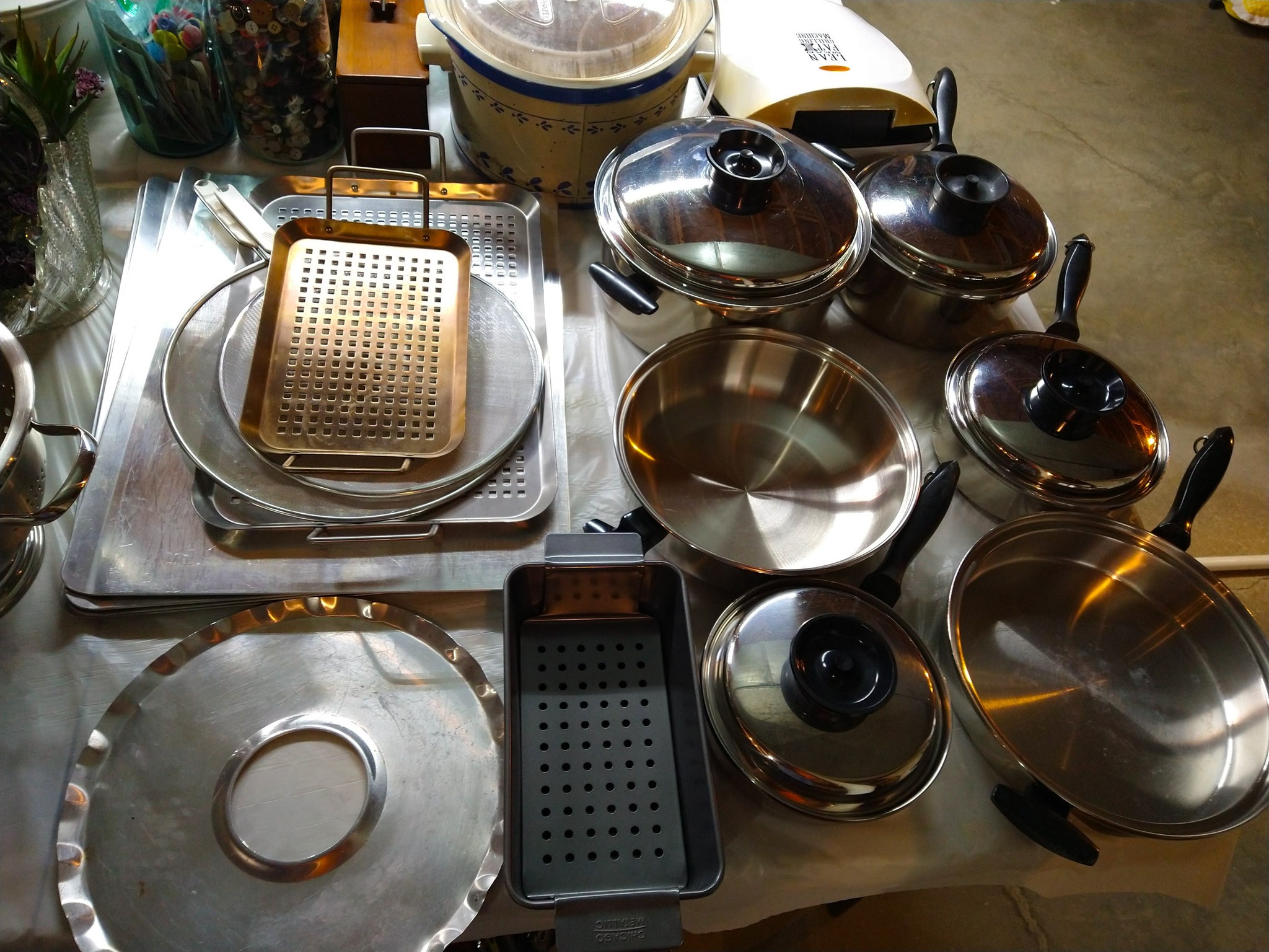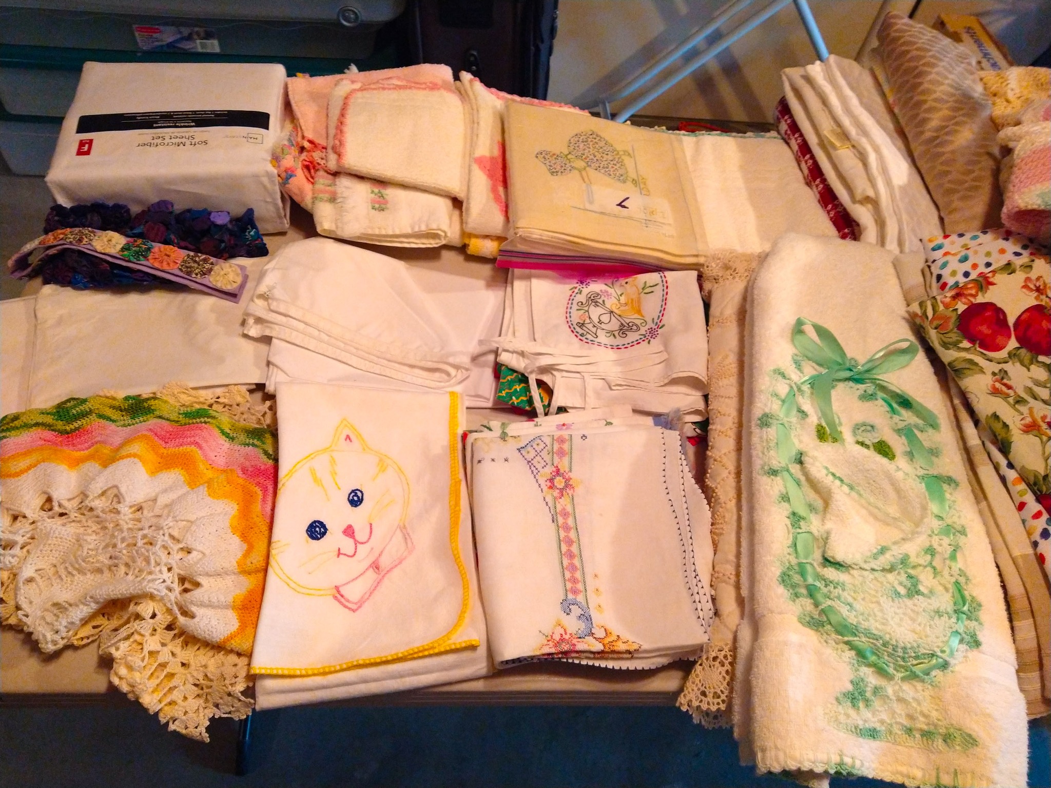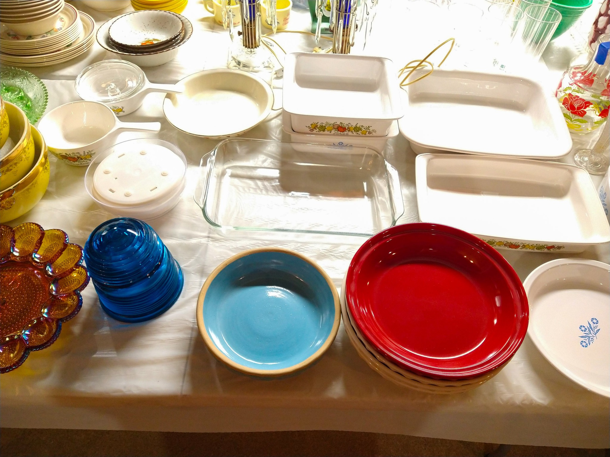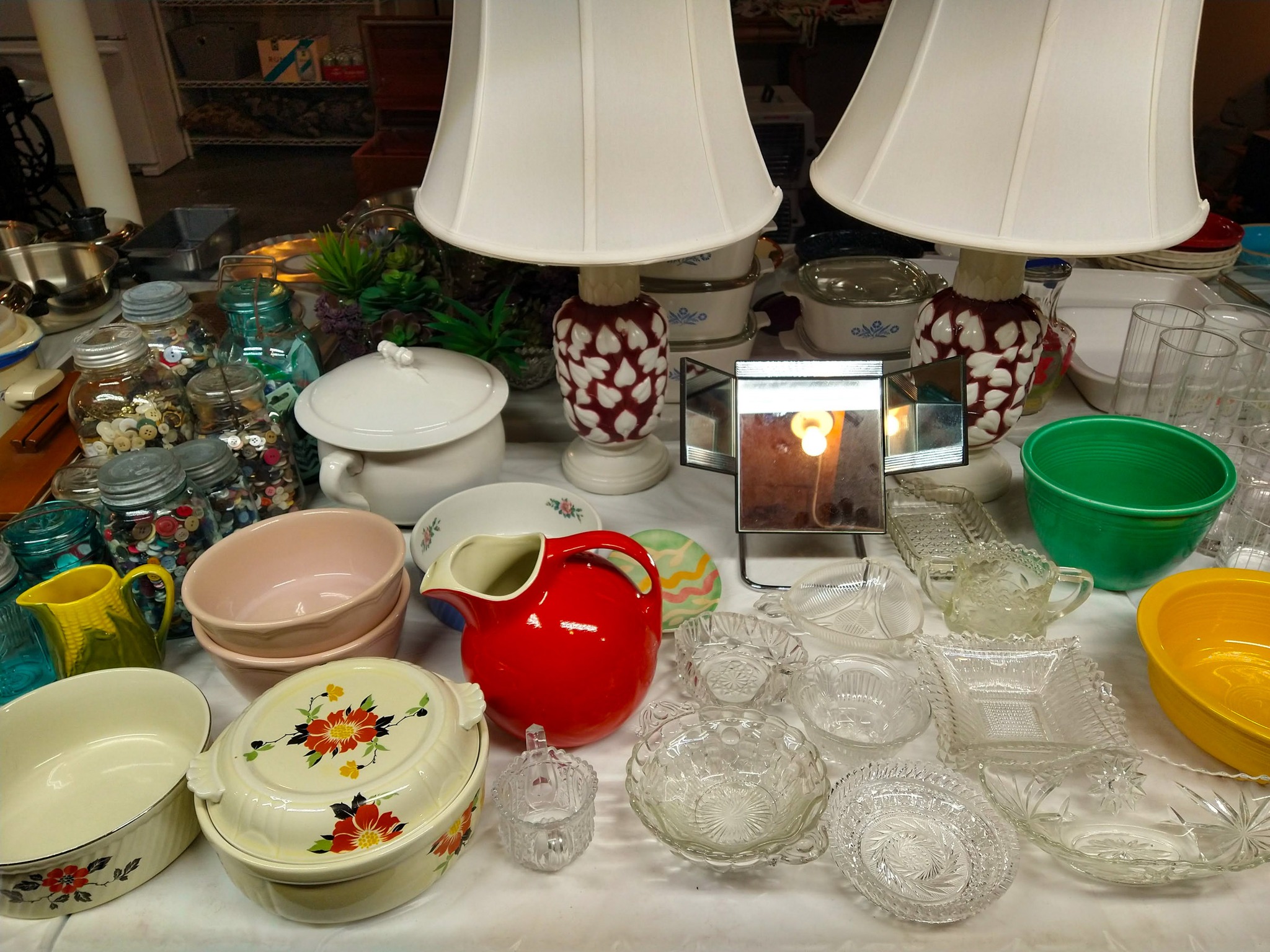 HOUSEHOLD: LARGE OFFERING COSTUME JEWELRY – BATH TOWELS – HAND TOWELS – WASH CLOTHS – LARGE SET ONEIDA STAINLESS FLATWARE – TEA KETTLE – TOOTH PICK HOLDER – AREA RUGS – COOK BOOKS – THROW PILLOWS – LINEN PLACE MATS – LINEN APRONS – KITCHEN TOWELS – SET 6 STAINLESS PANS w/ LIDS – BAKING PANS – COOKIE SHEETS – LARGE & SMALL STAINLESS COLLANDERS – PATTERN GLASS BOWL w/ FLOWERS – FIRE KING CASSEROLE w/ LID – CORNING CASSEROLE BOWLS w/ LIDS – PYREX WARE – JUICE JAR – LONGABERGER PIE PLATES – CROCK BOWL – HALLS J. TEA PIE PLATE – CORNING SAUCE PANS – EGG PLATES – PYREX BOWL w/ LID – 6 SHELF DECORATOR STORAGE SHELF UNITS – CROCHET BOOKS – WORK BASKET BOOKS – SEWING BOOKS – CORELLE DISHES – APPLE, BEAR & PENGUIN S&P SETS – GLASS COASTERS – 5 PIECE DRESSER SET – CROCK POT – ART DECO TRAYS – SEWING & CRAFT ITEMS – NEW YARN – CROCHET THREAD – GEL CUSHIONS – PYREX MEASURE PITCHER – B&D IRON – SPOOLS THREAD – EMBROIDERY THREAD, PATTERNS & HOOKS – TUPPERWARE – CALPHON SKILLET w/ LID – SEWING BASKETS – LAMP SHADES – LARGE OFFERING NEW 33 IN X 38 IN FLOUR SACK TOWELS – THROW PILLOWS & QUILT SET – ROWENTA GARMENT STEAMER – PORCELAIN FUNNEL – SEVERAL JARS ASST BUTTONS – IRONING BOARD – LADIES DRESS GLOVES –