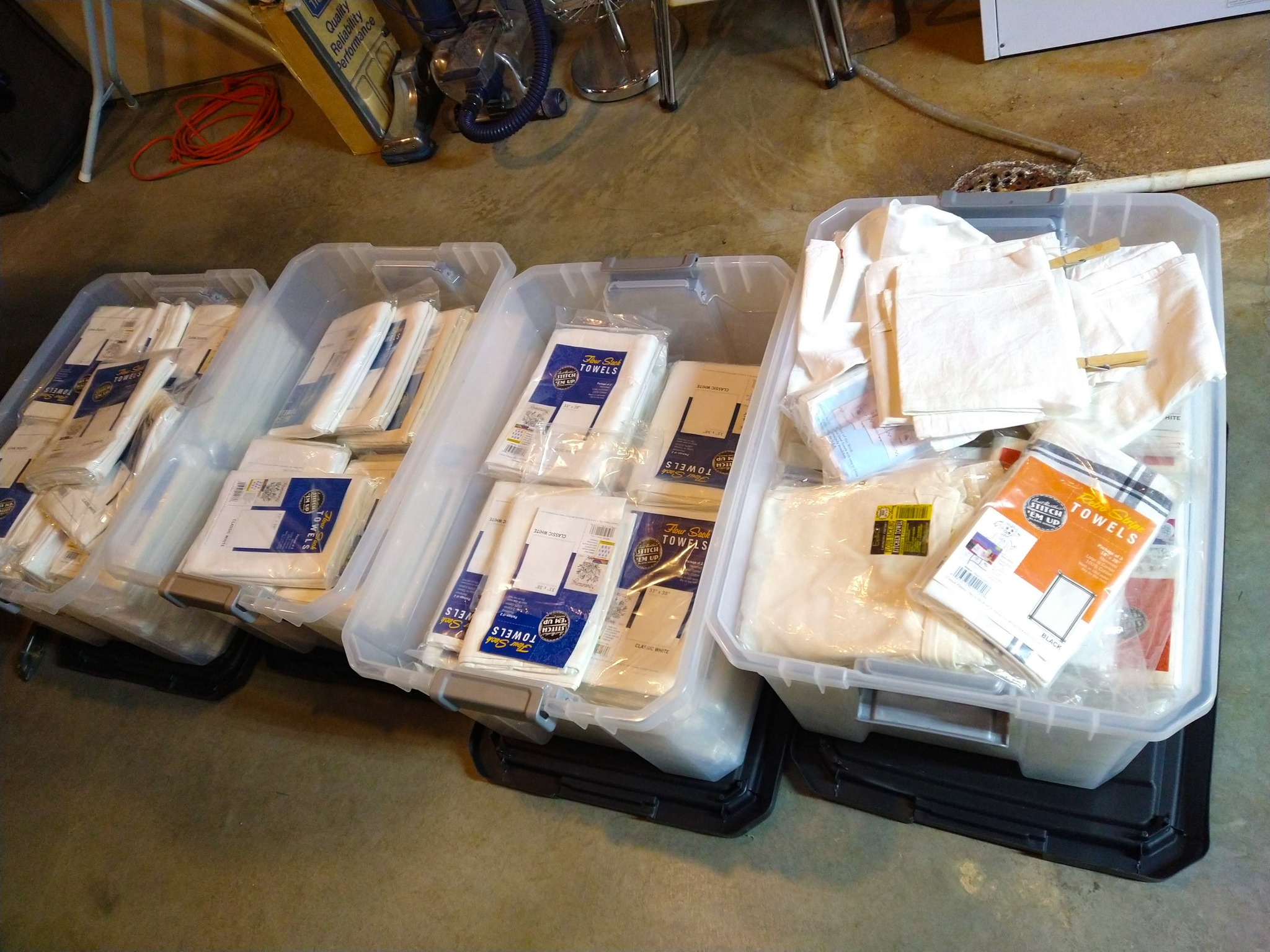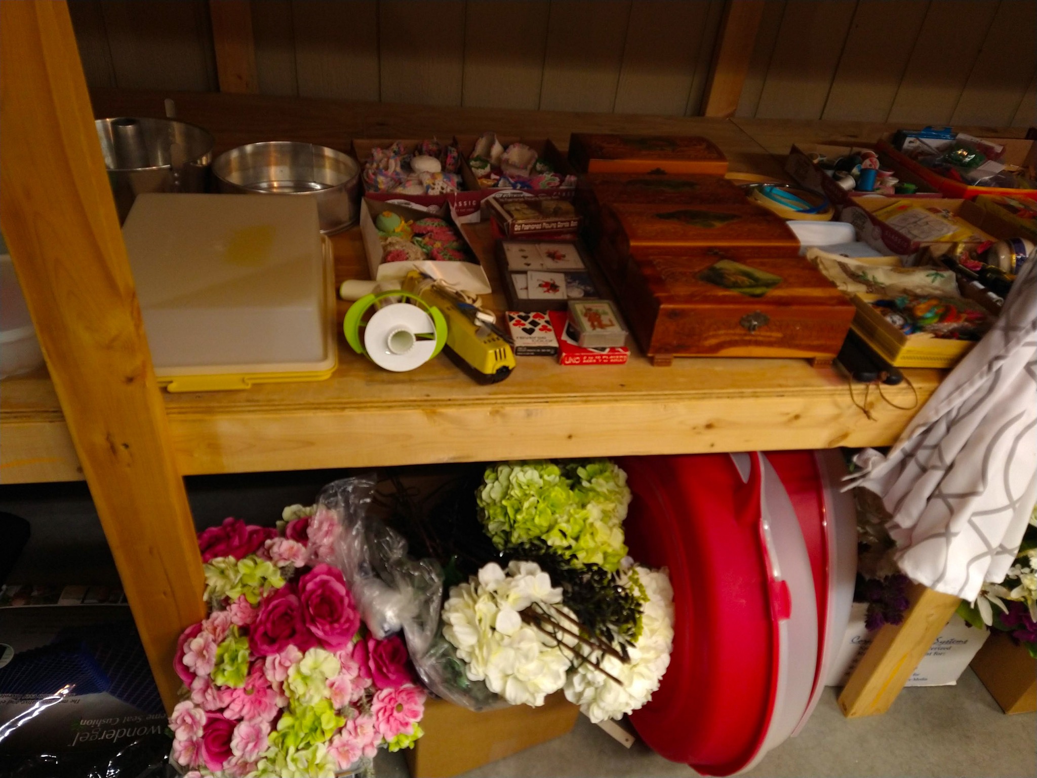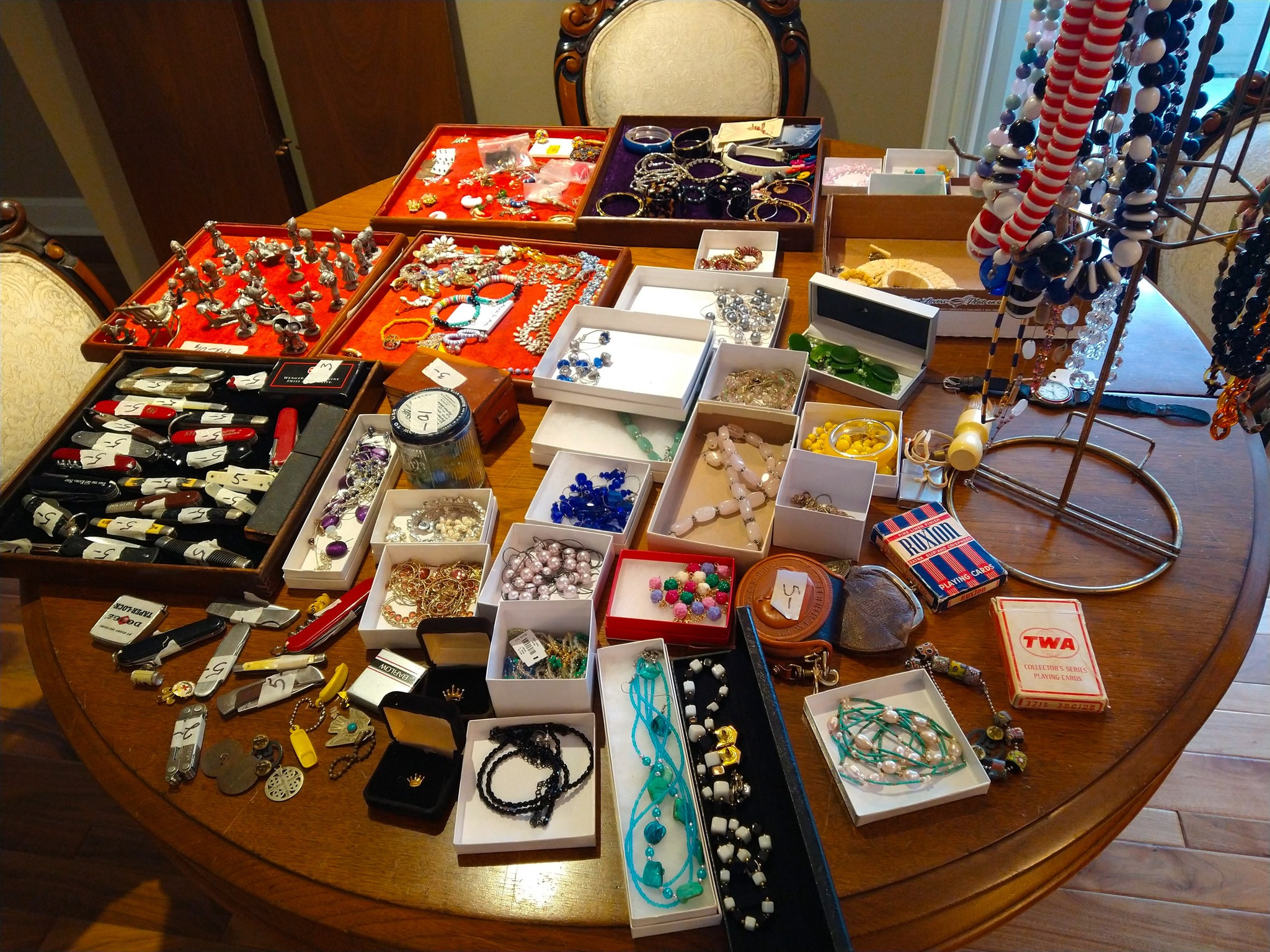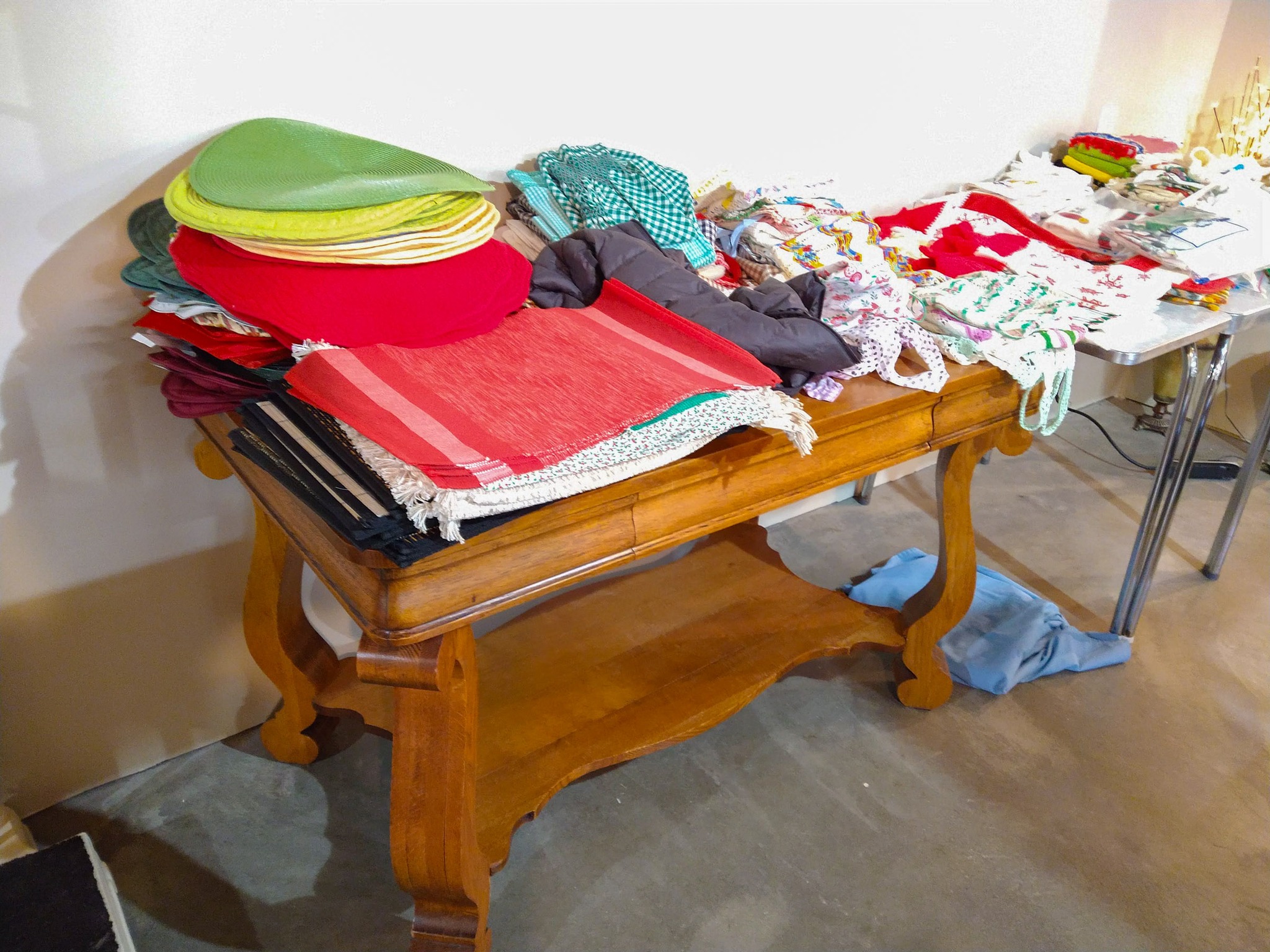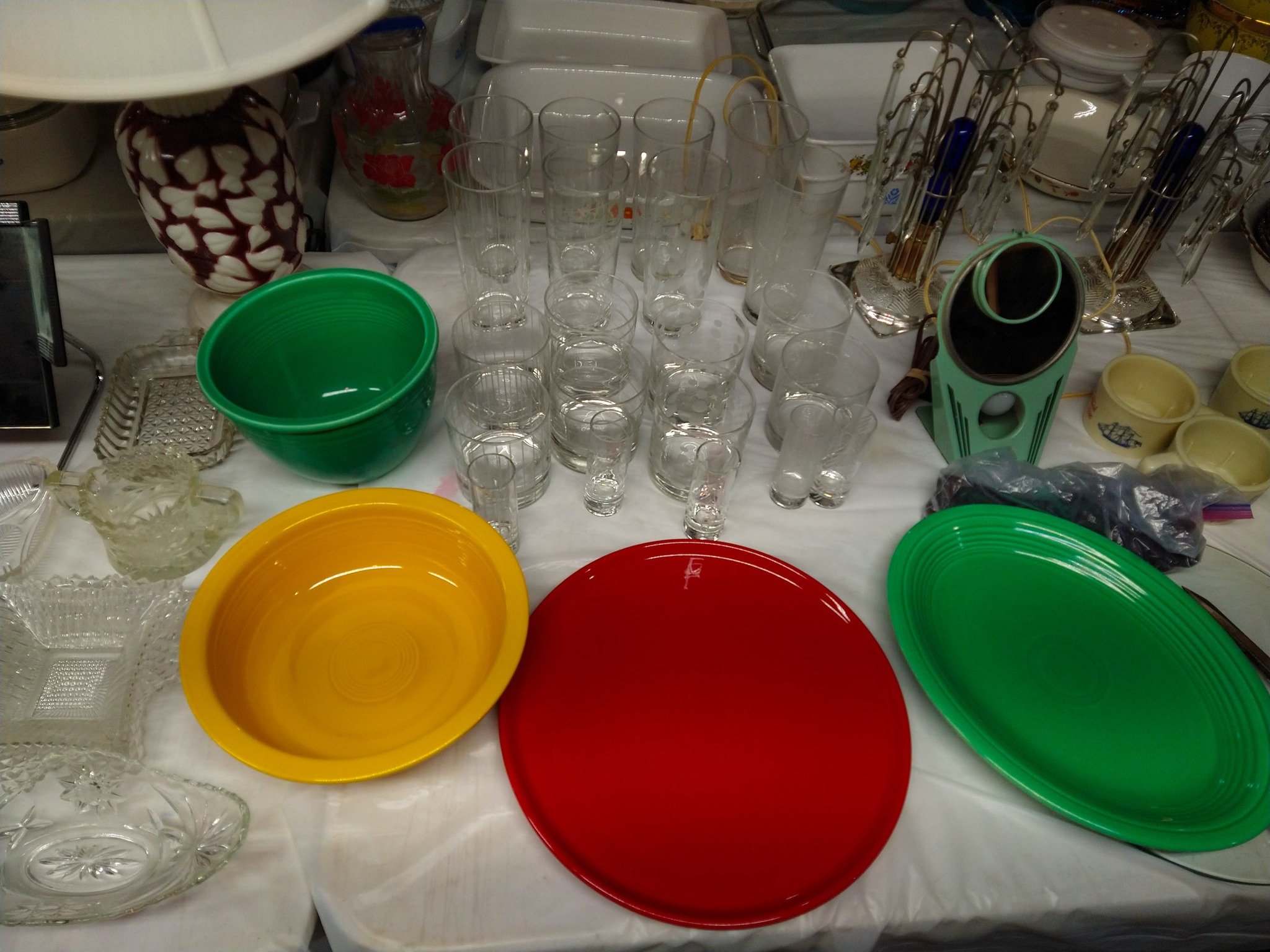 HOUSEHOLD: LARGE OFFERING COSTUME JEWELRY – BATH TOWELS – HAND TOWELS – WASH CLOTHS – LARGE SET ONEIDA STAINLESS FLATWARE – TEA KETTLE – TOOTH PICK HOLDER – AREA RUGS – COOK BOOKS – THROW PILLOWS – LINEN PLACE MATS – LINEN APRONS – KITCHEN TOWELS – SET 6 STAINLESS PANS w/ LIDS – BAKING PANS – COOKIE SHEETS – LARGE & SMALL STAINLESS COLLANDERS – PATTERN GLASS BOWL w/ FLOWERS – FIRE KING CASSEROLE w/ LID – CORNING CASSEROLE BOWLS w/ LIDS – PYREX WARE – JUICE JAR – LONGABERGER PIE PLATES – CROCK BOWL – HALLS J. TEA PIE PLATE – CORNING SAUCE PANS – EGG PLATES – PYREX BOWL w/ LID – 6 SHELF DECORATOR STORAGE SHELF UNITS – CROCHET BOOKS – WORK BASKET BOOKS – SEWING BOOKS – CORELLE DISHES – APPLE, BEAR & PENGUIN S&P SETS – GLASS COASTERS – 5 PIECE DRESSER SET – CROCK POT – ART DECO TRAYS – SEWING & CRAFT ITEMS – NEW YARN – CROCHET THREAD – GEL CUSHIONS – PYREX MEASURE PITCHER – B&D IRON – SPOOLS THREAD – EMBROIDERY THREAD, PATTERNS & HOOKS – TUPPERWARE – CALPHON SKILLET w/ LID – SEWING BASKETS – LAMP SHADES – LARGE OFFERING NEW 33 IN X 38 IN FLOUR SACK TOWELS – THROW PILLOWS & QUILT SET – ROWENTA GARMENT STEAMER – PORCELAIN FUNNEL – SEVERAL JARS ASST BUTTONS – IRONING BOARD – LADIES DRESS GLOVES –