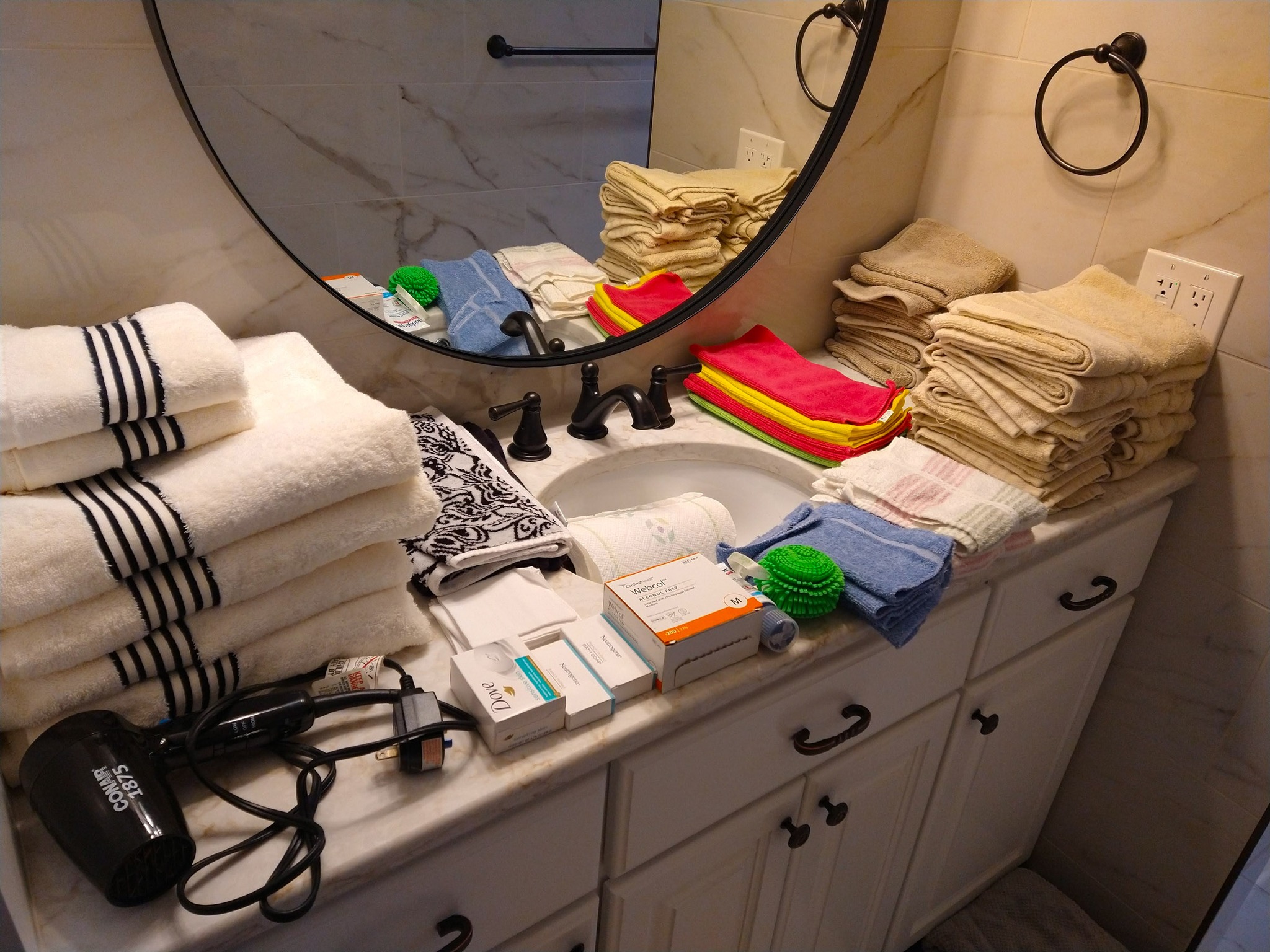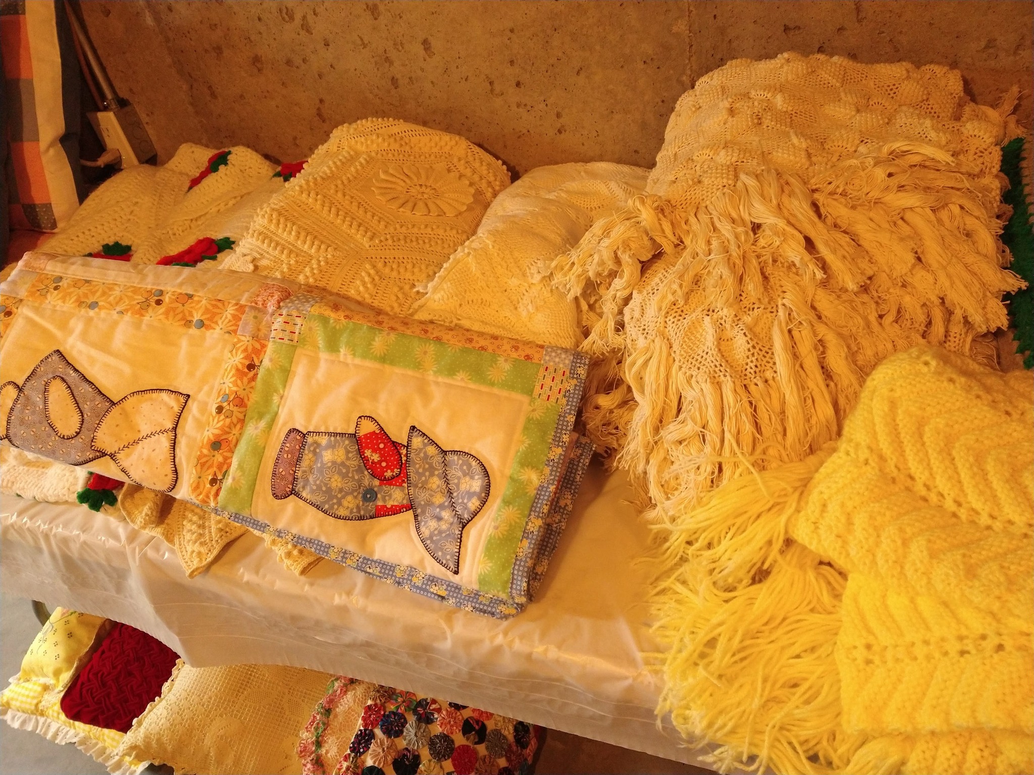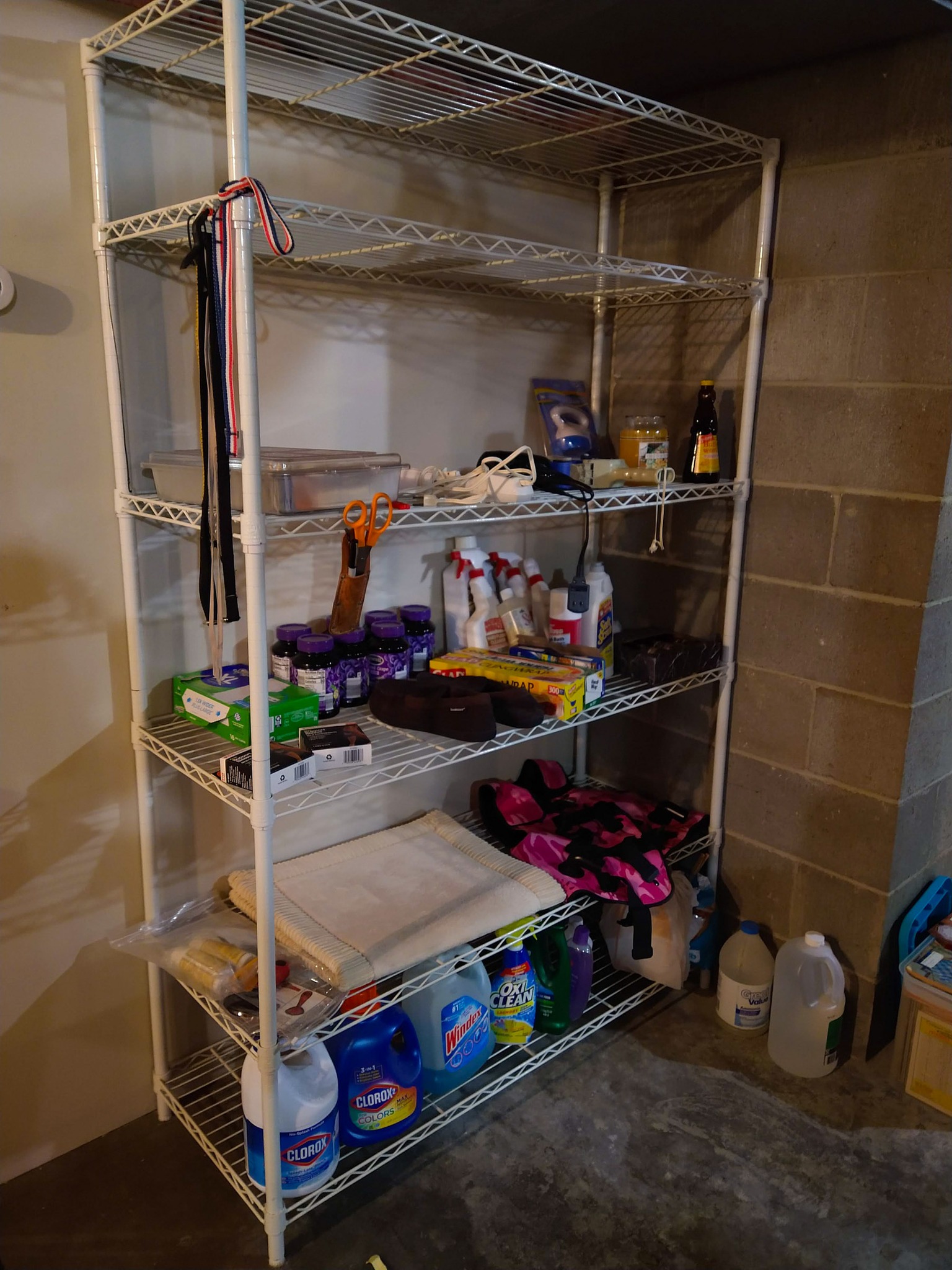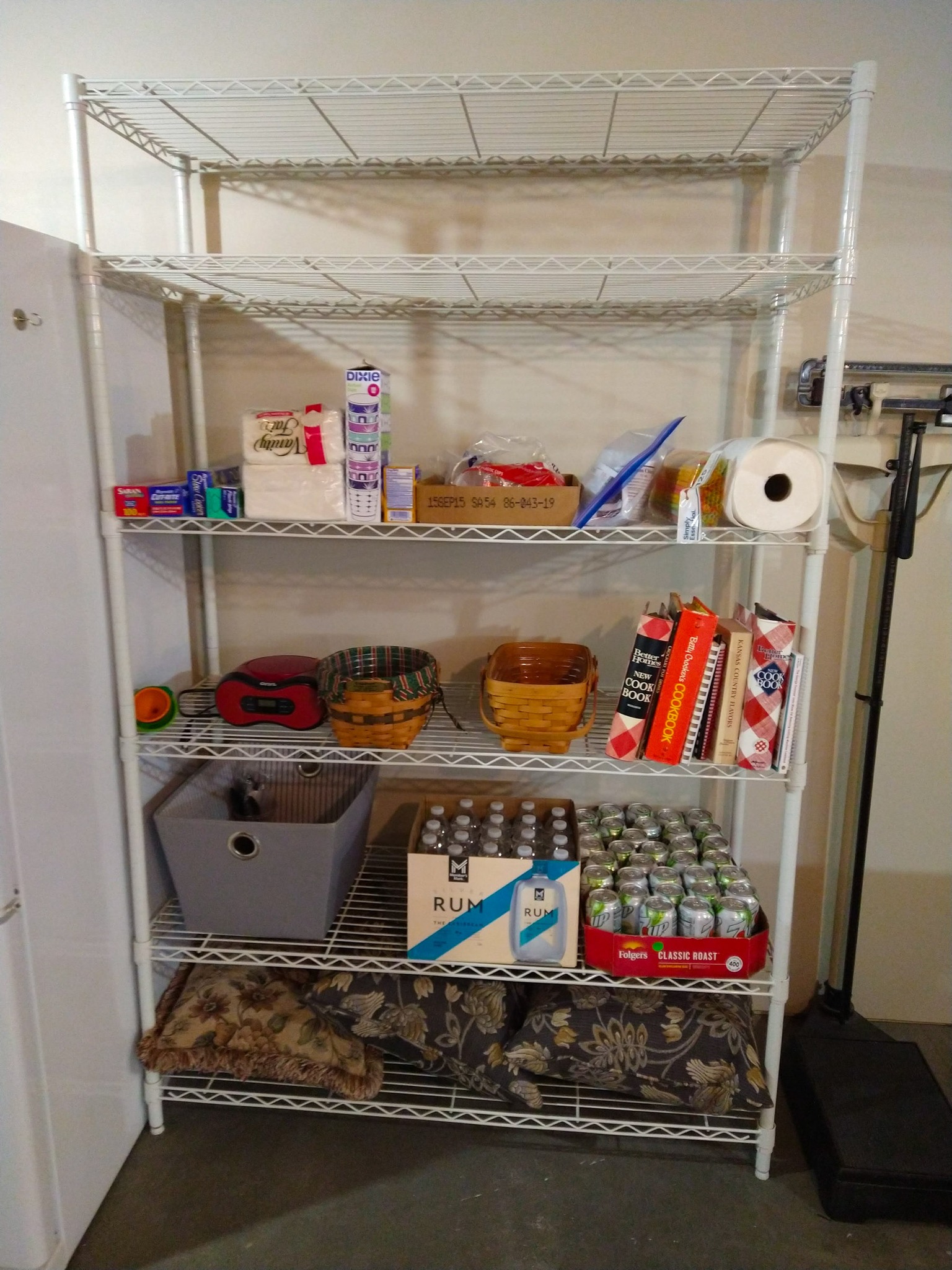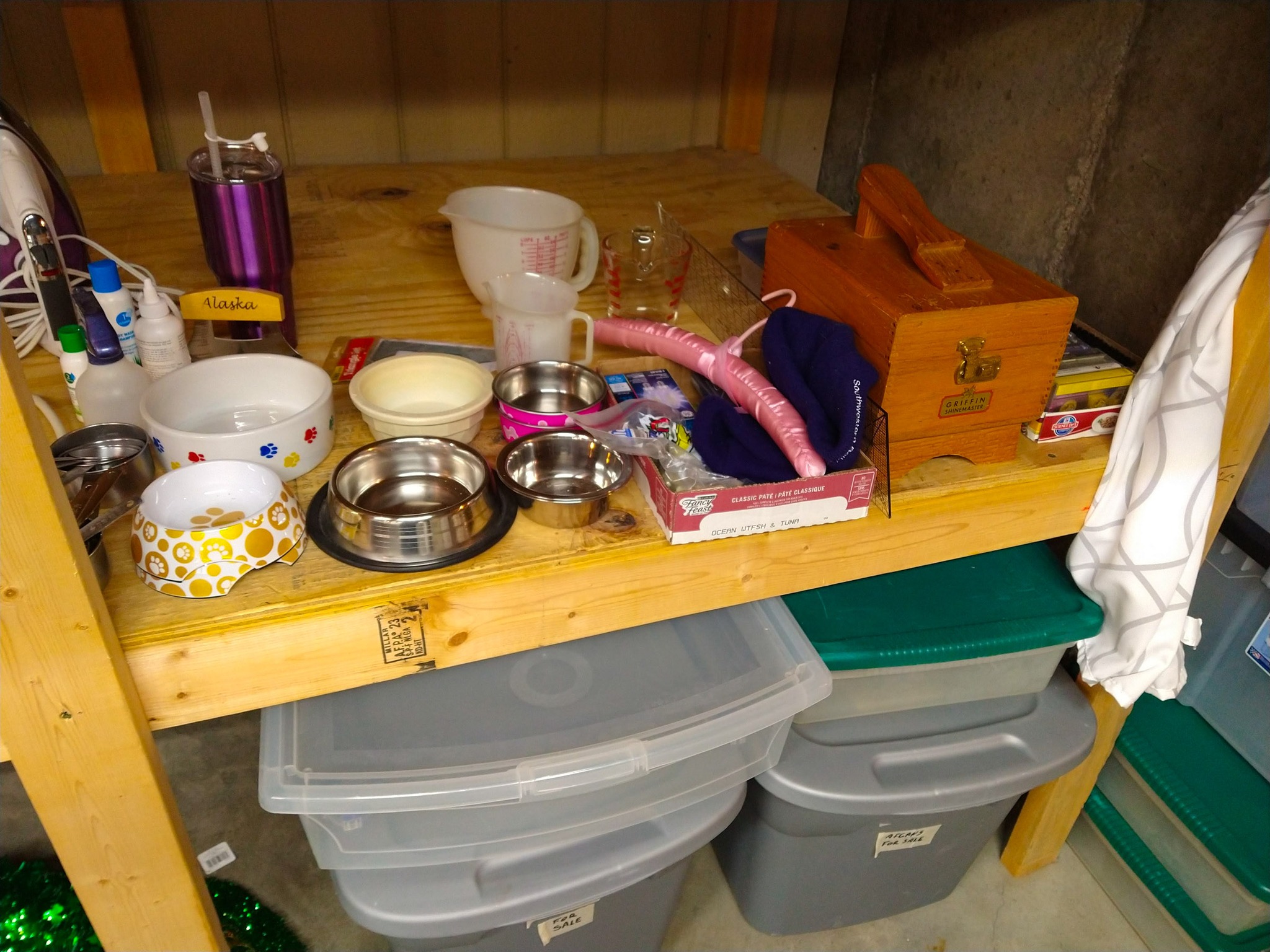 HOUSEHOLD: LARGE OFFERING COSTUME JEWELRY – BATH TOWELS – HAND TOWELS – WASH CLOTHS – LARGE SET ONEIDA STAINLESS FLATWARE – TEA KETTLE – TOOTH PICK HOLDER – AREA RUGS – COOK BOOKS – THROW PILLOWS – LINEN PLACE MATS – LINEN APRONS – KITCHEN TOWELS – SET 6 STAINLESS PANS w/ LIDS – BAKING PANS – COOKIE SHEETS – LARGE & SMALL STAINLESS COLLANDERS – PATTERN GLASS BOWL w/ FLOWERS – FIRE KING CASSEROLE w/ LID – CORNING CASSEROLE BOWLS w/ LIDS – PYREX WARE – JUICE JAR – LONGABERGER PIE PLATES – CROCK BOWL – HALLS J. TEA PIE PLATE – CORNING SAUCE PANS – EGG PLATES – PYREX BOWL w/ LID – 6 SHELF DECORATOR STORAGE SHELF UNITS – CROCHET BOOKS – WORK BASKET BOOKS – SEWING BOOKS – CORELLE DISHES – APPLE, BEAR & PENGUIN S&P SETS – GLASS COASTERS – 5 PIECE DRESSER SET – CROCK POT – ART DECO TRAYS – SEWING & CRAFT ITEMS – NEW YARN – CROCHET THREAD – GEL CUSHIONS – PYREX MEASURE PITCHER – B&D IRON – SPOOLS THREAD – EMBROIDERY THREAD, PATTERNS & HOOKS – TUPPERWARE – CALPHON SKILLET w/ LID – SEWING BASKETS – LAMP SHADES – LARGE OFFERING NEW 33 IN X 38 IN FLOUR SACK TOWELS – THROW PILLOWS & QUILT SET – ROWENTA GARMENT STEAMER – PORCELAIN FUNNEL – SEVERAL JARS ASST BUTTONS – IRONING BOARD – LADIES DRESS GLOVES –