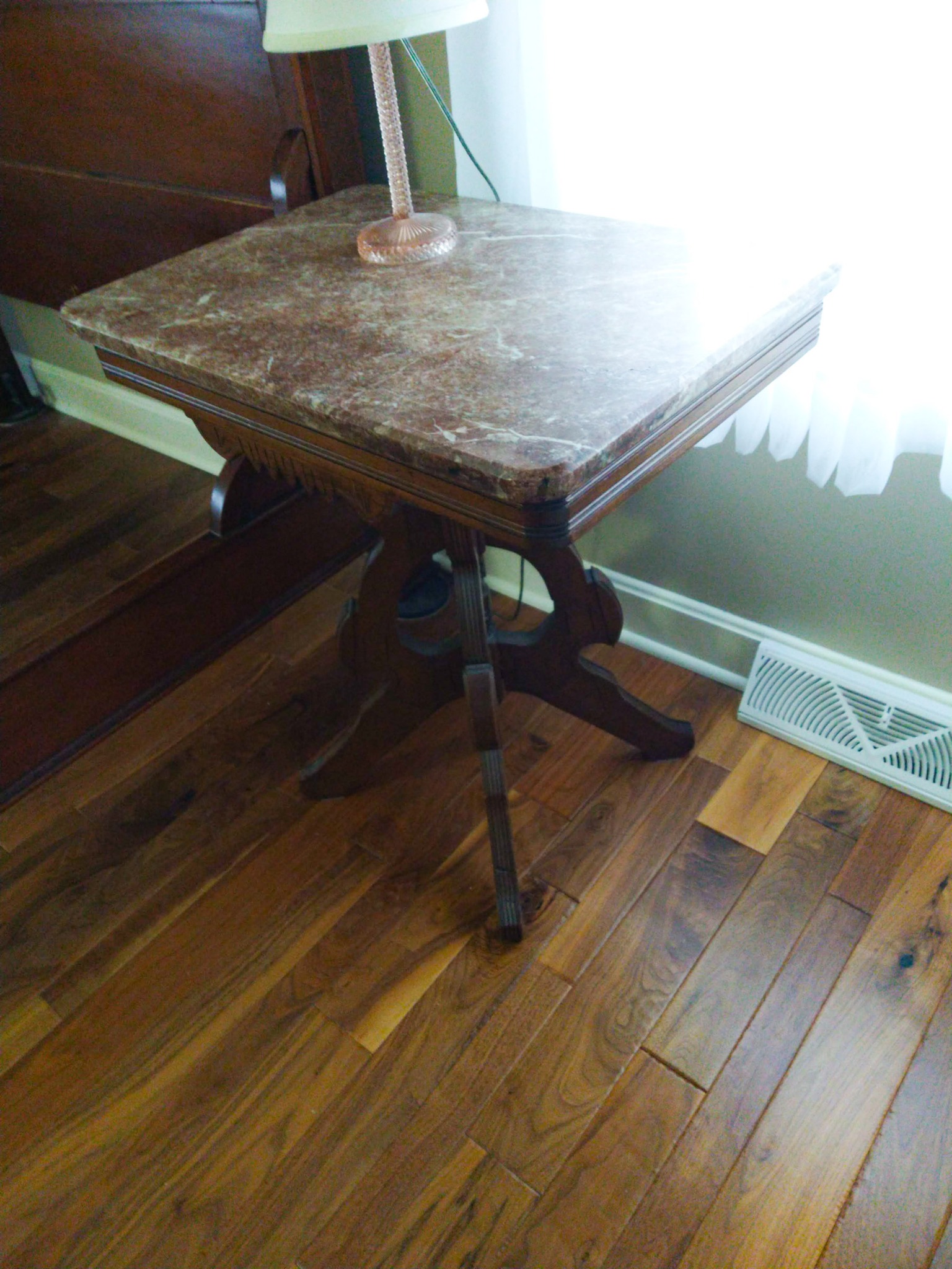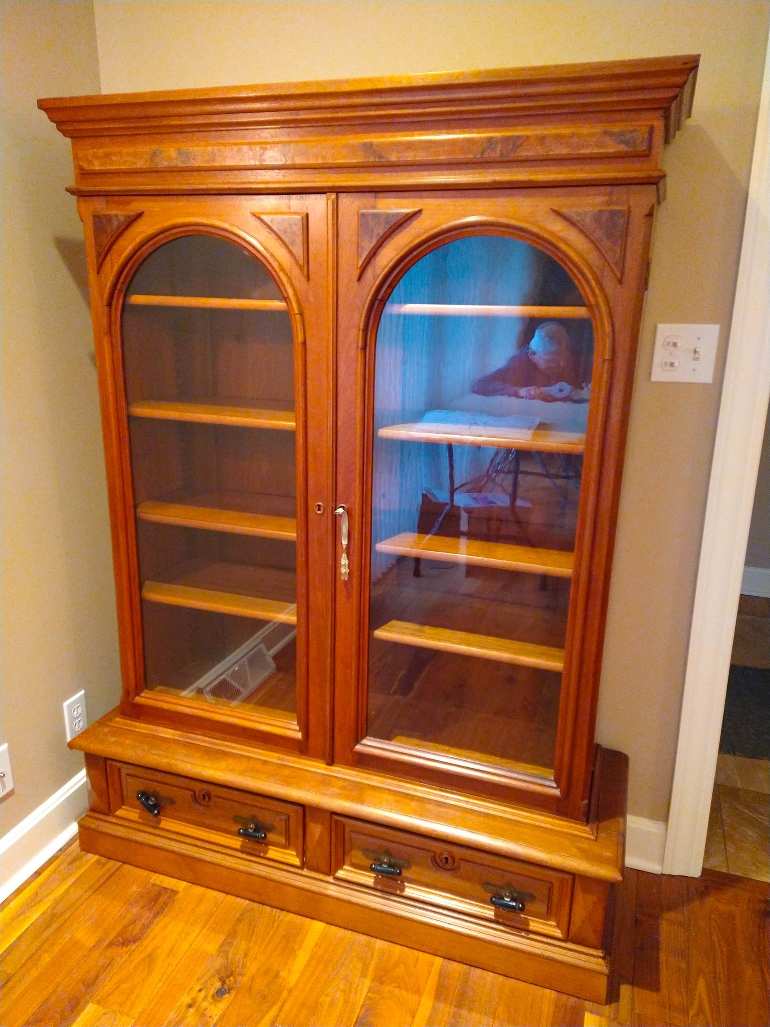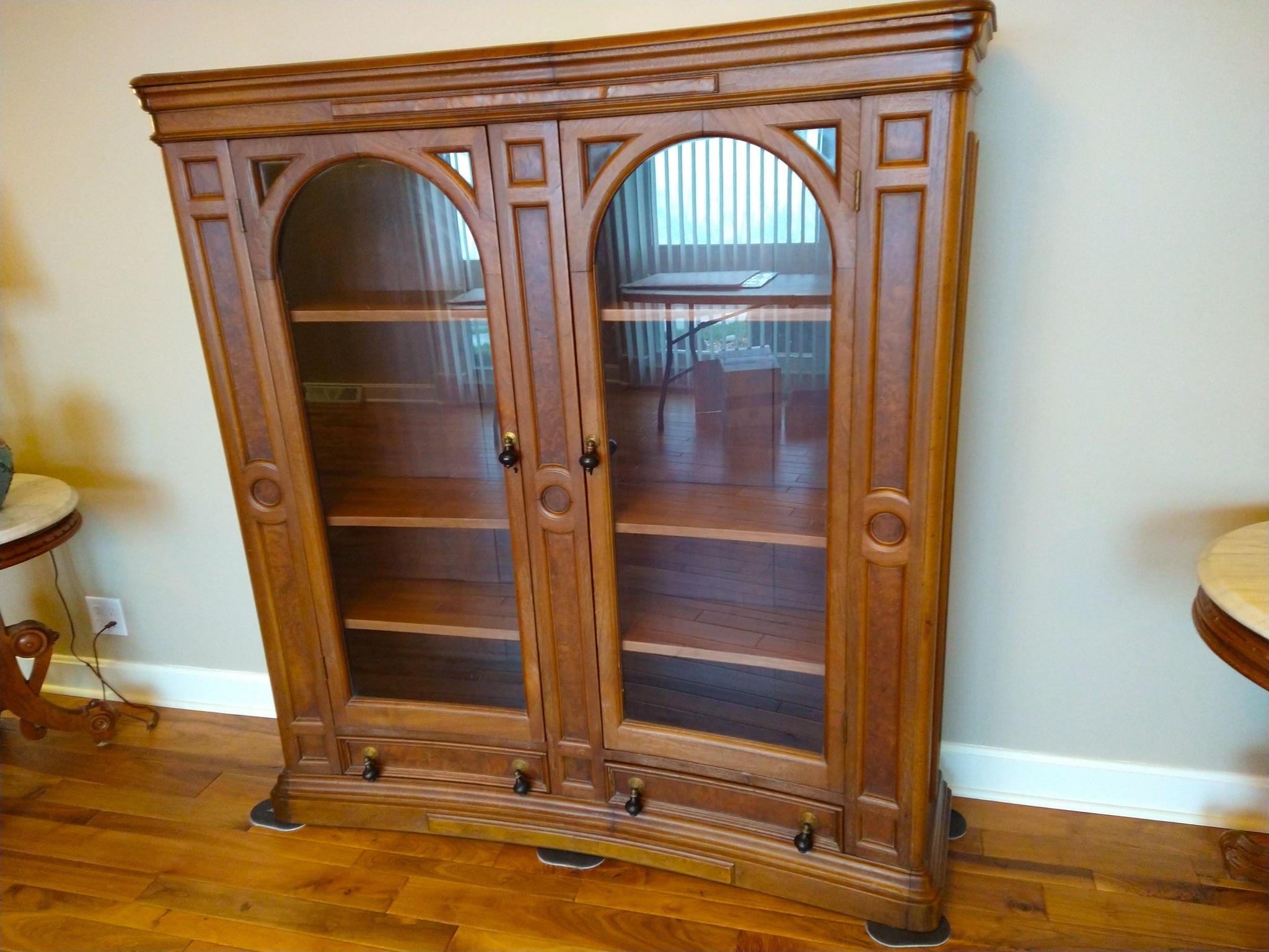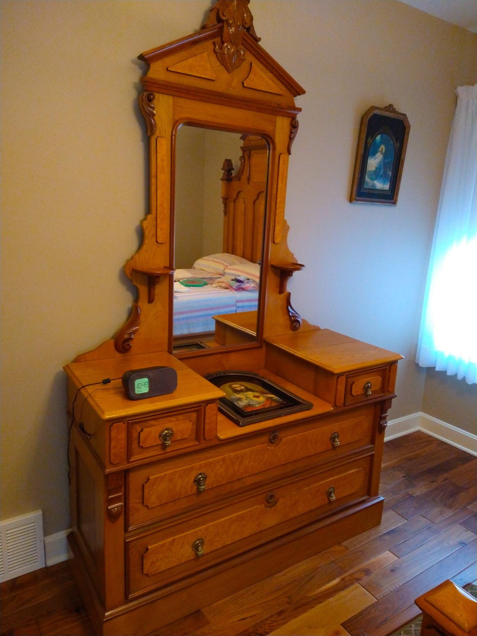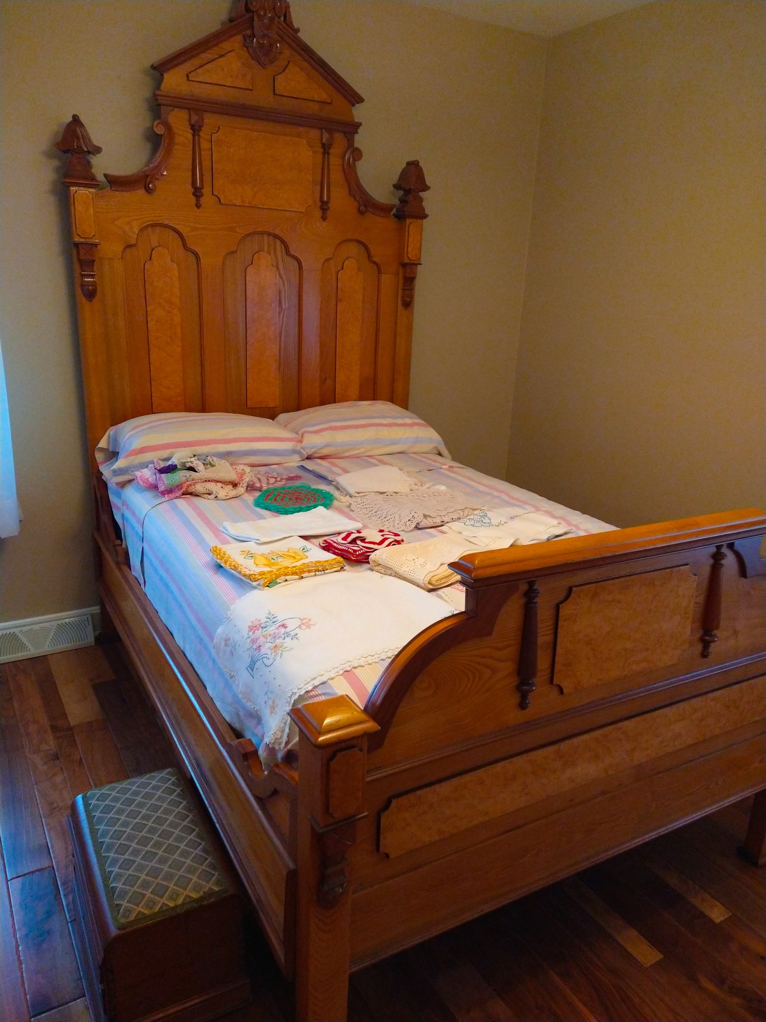 SUPERIOR QUALITY FURNITURE: FRENCH PROVINCIAL DINING TABLE w/ SPLIT PEDESTAL & PAW BASE, 4 LEAVES, w/ 4 ORNATE CHAIRS – 6 ORNATE BASE, MARBLE TOP LAMP TABLES – SEVERAL JESUS PICTURES w/ FRAMES – 1 LARGE ART DECO CARVED WOOD BOOKCASES w/ GLASS DOORS & LOWER DRAWERS – 2 BOOKCASE w/ ARCHED GLASS DOORS & LOWER DRAWERS – ORNATE FRENCH PROVINCIAL BED w/ HIGH ARCHED HEAD – NICE WALNUT MARBLE TOP WASH STAND – WOOD QUILT RACKS – ORNATE FRENCH PROVINCIAL MARBLE TOP DRESSER w/ LAMP STANDS – ORNATE OAK VICTORIAN BED w/ FANCY HIGH HEADBOARD w/ BX SPGS & MATT – ORNATE OAK VICTORIAN VANITY DRESSER, LAMP STANDS & ACORN PULLS – COVERED TOP STEP STOOL – EAST LAKE PAD SEAT BALLOON BACK SIDE CHAIR – EASTLAKE GENTLEMANS PARLOR ARM CHAIR – OAK SIDE CHAIR – FANCY LIBRARY TABLE w/ DRAWER – CLEAN LANE CEDAR CHEST w/ TRAY – WILCOX & GIBBS IRON TREADLE BASE w/ GLASS TOP – IRON DOMESTIC TREDDLE BASE w/ METAL TOP – 4 DRESSER TOP CHESTS – COSCO STEP STOOL – METAL BASE UTILITY TABLE ON ROLLERS - BARN PAINTING w/ FANCY OAK FRAME – NICE 30X60 OAK ROLL TOP DESK – 3 DRAWER SEWING CABINET – CANE WEAVE LAUNDRY BASKET – FANCY SET METAL PATIO CHAIRS – DROP LEAF STAINLESS BASE PORCELAIN TOP TABLE