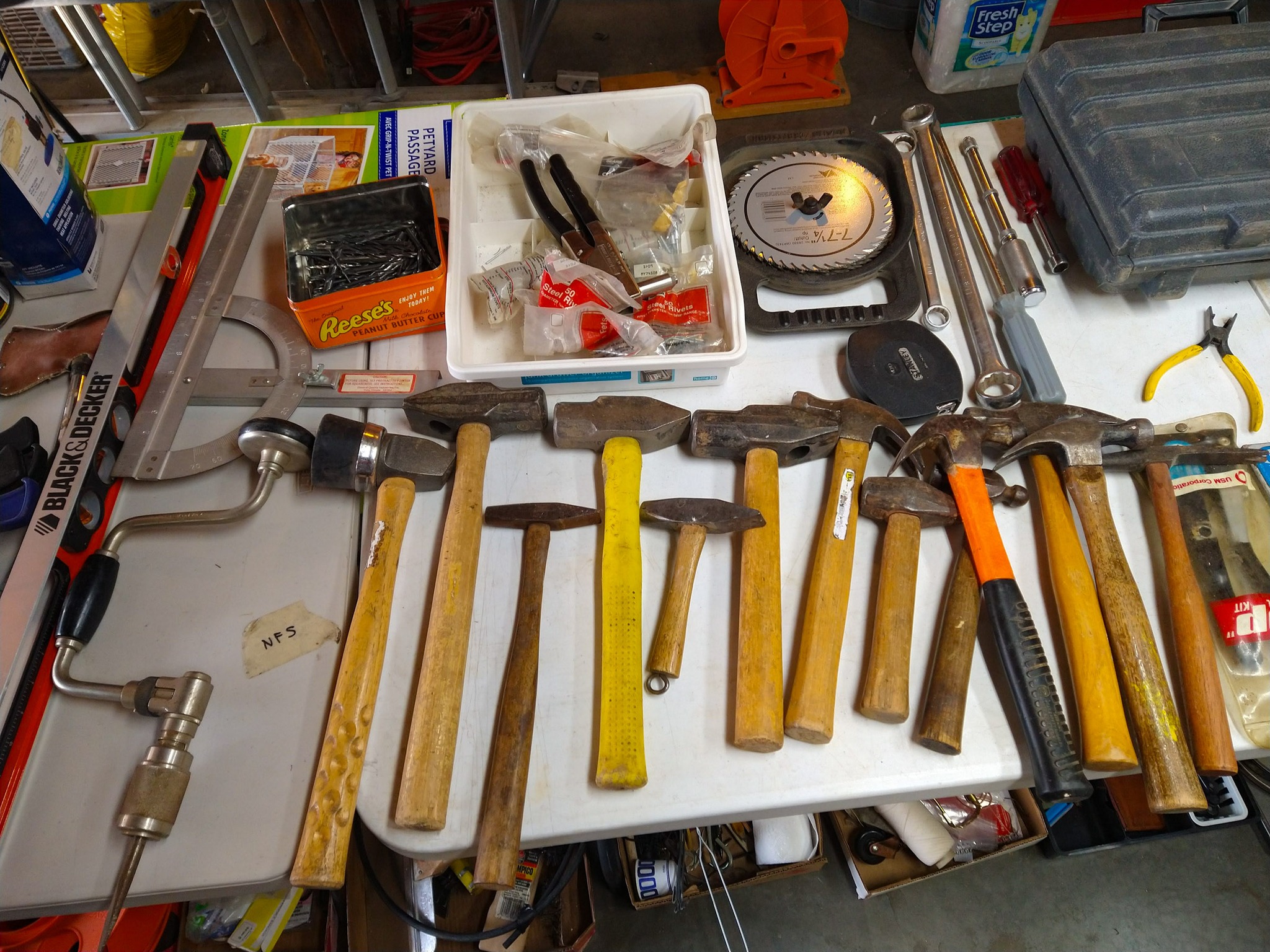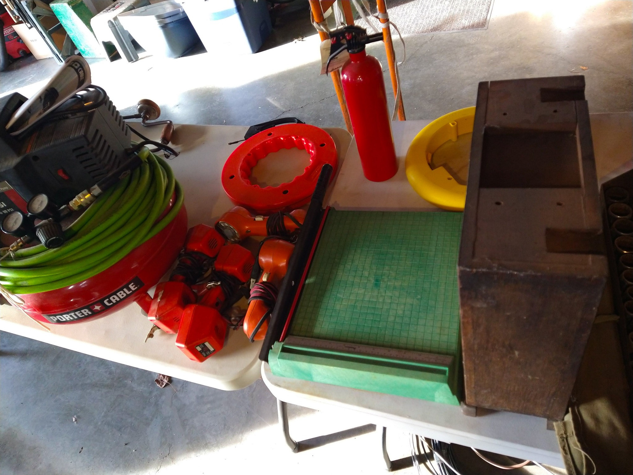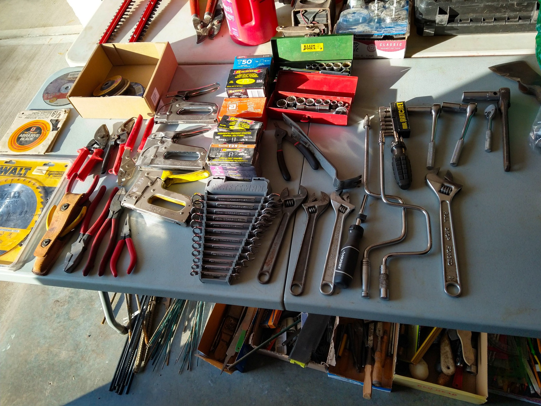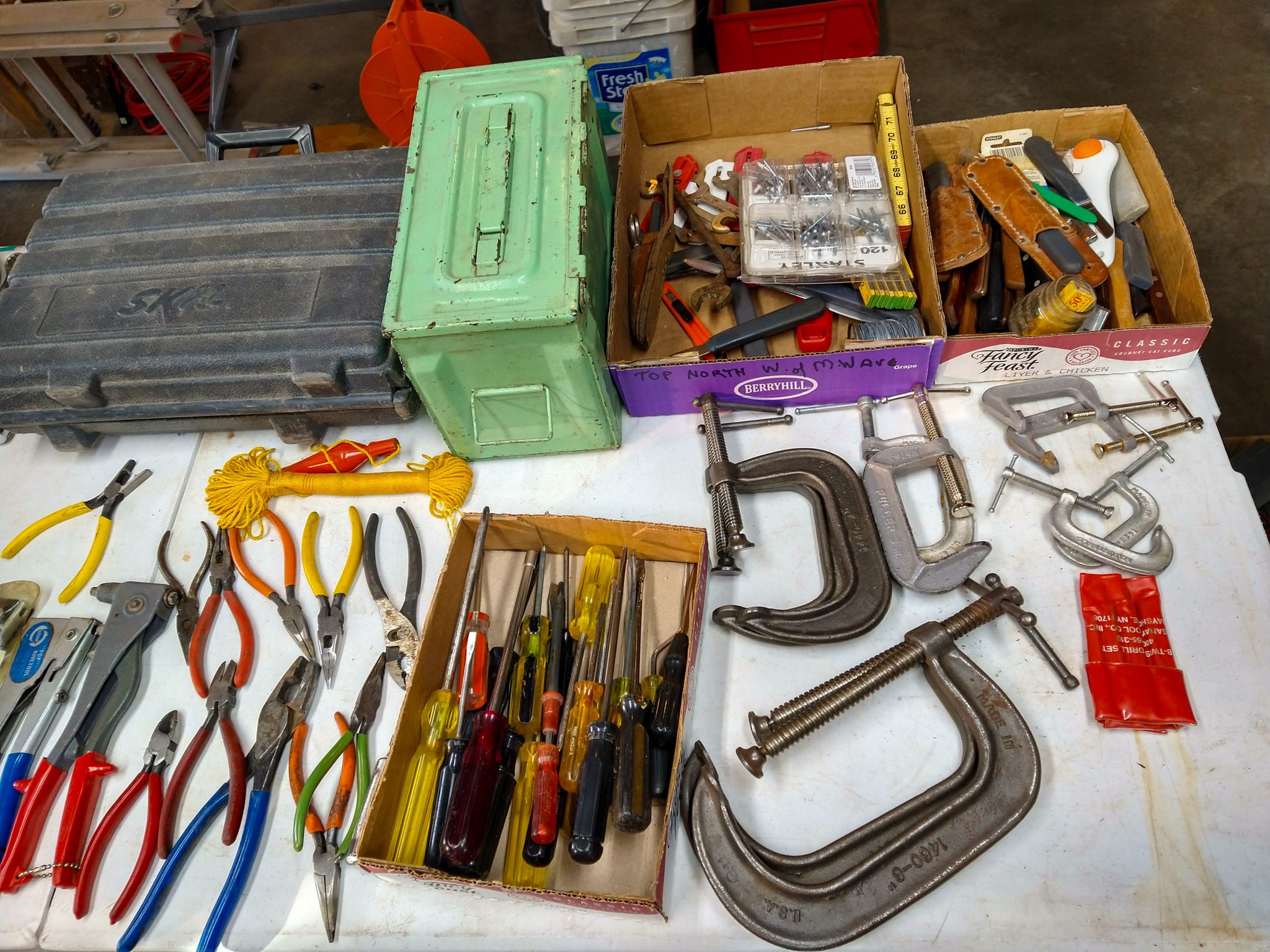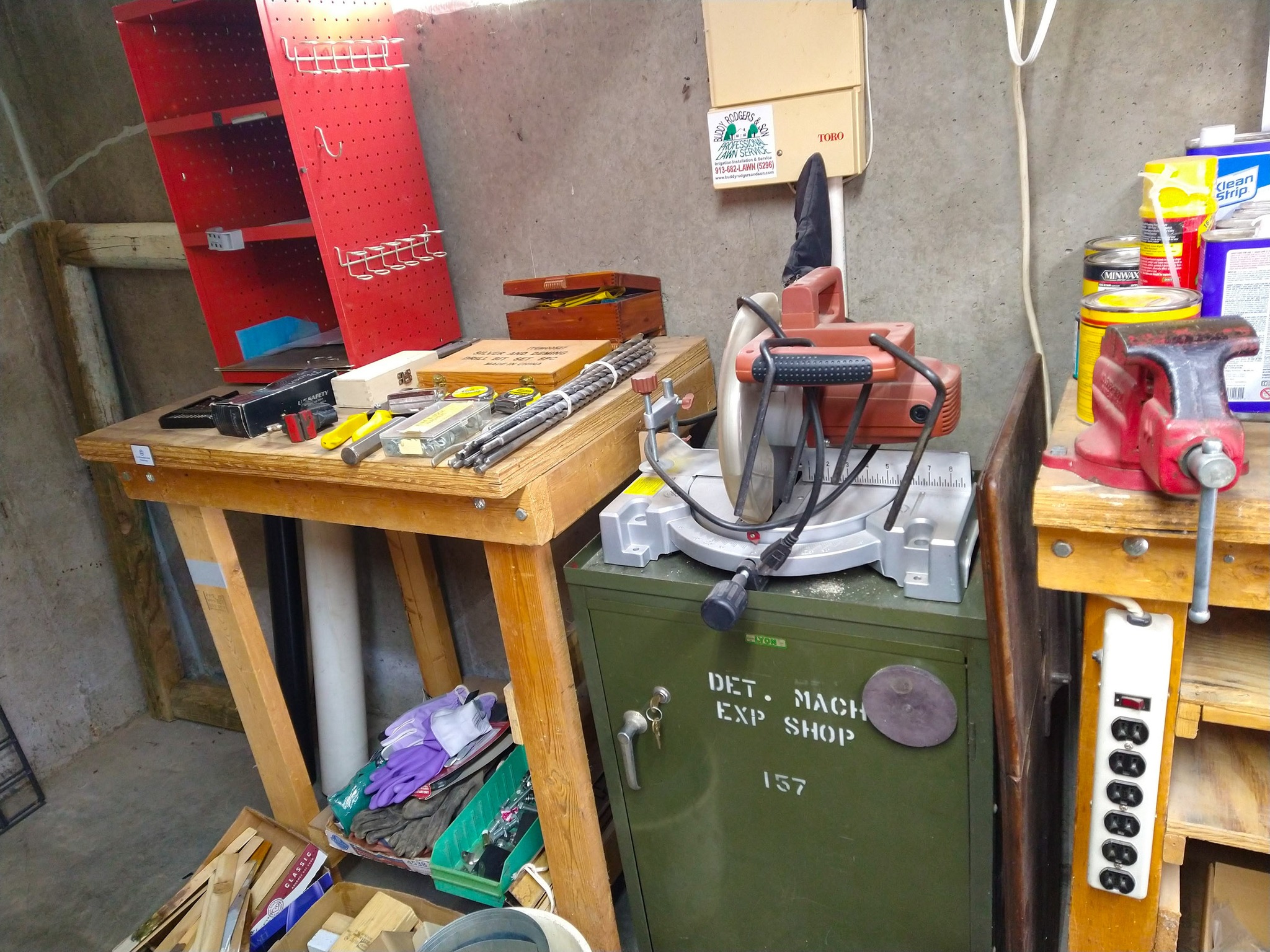 HAND & POWER TOOLS: SET FOLDING SAW HORSES – OUTSIDE CALIPERS – EXT CORD ON ROLLER – SCOTTS PUSH SPREADER – SCOTTS HAND SPREADER – DREMEL MOTO,LATHE # 700 – ½ IN SOCKET SET 3 / 8 TO 1 1 / 8, EXT & TOTE – NAIL BARS – JAMESON 1 / 8 IN X 100 FT FIBERGLASS FISH TAPE – STREAM LINE FISH TAPE – CLEAN PORTER CABLE AIR COMP, 150 PSI & HOSE – 2 WHEEL DOLLY – DREMEL 3000 TOOL SET – DREMEL 370-5 TOOL SET – ANGLE DRILL – SEARS 4 ½ IN ANGLE GRINDER – SKIL # 593 BELT SANDER – RYOBI ½ IN HAMMER DRILL – MAKITA ½ IN DRILL – RIGID 3 / 8 IN DRILL – DEWALT 4 ½ IN ANGLE GRINDER – CLEAN STIHL SH86C GAS BLOWER,VAC – 2 EA HVY DUTY 5 TIER METAL SHELVES – NEW MOLE TRAP – SCHUMACHER 10 AMP BATTERY CHARGER – JUMPER CABLES – CRAFTSMAN 16 GAL SHOP VAC – WORK MATE TABLES – RUBBER MAID TOOL BOX & STEP STOOL – HVY DUTY METAL SHELVING w/ 10 SHELVES, 9 FT WIDE – 4 DOLLY WHEELS – ORGANIZERS w/ CONTENTS – ASST SIZE & LENGTH PISTOL GRIP CLAMPS – GRAFTSMAN 6 IN, ½ HP BENCH GRINDER – TOOL POUCHES – 16 FT ALUM EXT LADDER – SLIDING TELEPHONE LADDERS – PRESSURE SPAYERS – STIHL BG56C GAS BLOWER – ASST SIZE C CLAMPS – SCREWDRIVERS – ASST PLIERS – CLAW, BALL, TACK & SHOP HAMMERS – SKIL ½ IN HAMMER DRILL – PLUMB BOB – NEW 7 ¼ IN CUT OFF & RIP BLADES & HOLDER – BOX END WRENCHES – SEARS RIVETER & RIVETS – MANY HI SPEED DRILL BITS – STANLEY PRESS DRILL – B&D LEVELS – HATCHET – BAR CLAMPS, ASST SIZES – PIPE WRENCH – STANLEY PLANE – JAMESON FIBER GLASS PRUNER & POLES – SWIVEL TOOL HOLDER – LONG SHANK DRILL BITS – 8 PC HI SP BIT SET ½ TO 15 / 16 – NEW XACTO KNIFE SET – SHOP BUILT WORK BENCH – SM CLAMP ON VISE – 10 IN COMPOUND MITRE SAW w/ LASER – CRAFTSMAN 3 IN BENCH VISE – CENTRAL FORGE 8 IN ANVIL – WOOD SPANNER BITS – MITRE SAW – STANLEY HAND SAW – CRAFTSMAN ROLL AWAY 5 DRAWER BALL BEARING BASE TOOL CABINET w/ 5 DRAWER BALL BEARING TOP CABINET w/ KEYS – 4 TIER HVY DUTY METAL SHELF – DEWALT 7 ¼ IN CIRCULAR SAW – SKIL 6 ½ IN CIRC. SAW – DEWALT ORBITAL JIG SAW – B & D 3 / 8 & ½ IN DRILLS – PRUNERS – HOMELITE ELECT 17 IN HEDGE TRIMMERS – ELECT SOLDER IRON – CEN TECH MULTI METER – ASST FILES – ASST 3 / 8 & ½ IN SOCKETS & EXT – 3 / 8 IN DRIVE DEEP SOCKETS – 4 MM TO 12 MM ¼ IN DRIVE SOCKETS – 3 / 16 TO 7 / 16, ¼ IN DRIVE SOCKETS – 9MM TO 5 MM COMB WRENCHES – NEW DEWALT 10 IN 40 TOOTH CARBIDE MITRE SAW BLADE – STAPLE GUNS & BOXES STAPLES – NICE CRAFTSMAN 7MM TO 18 MM COMBO WRENCH SET – THORSEN 3 / 8 IN DR SOCKET SET 3 / 8 TO 7 / 8 w/ RATCHET & EXT – 10 & 12 IN ADJ WRENCHES – MR RATCHET SET – ALLEN WRENCHES – WOOD CHISELS – HOE – 5 TINE FORK – 4 TINE CULT – LONG HANDLE SHOVELS – SPADE – RAKE – SHORT HANDLE SHOVELS – AXE – SNOW SHOVELS – JAMESON TREE SAW PRUNER – DIRT TAMPER – WRECKING BARS – POST HOLE JOBBERS - & MORE