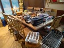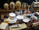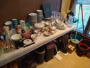 HOUSEHOLD: KEURIG COFFEE MAKER – KITCHEN AID PERSONAL COFFEE MAKER – NU WAVE 2 INDUCTION COOK TOP – NEW ESSENZA WAX WARMER – COOKS STAINLESS PAN w/ LID – CROCK POT – STAINLESS STOCK POT – NEW COVERED CASSEROLE – BLUE JEAN CHEF SET – CASSEROLE DISHES w/ LIDS – NEW ELECT SKILLET – REVERE STOCK POT – PRESSURE COOKER – CORNING CASSEROLES w/ LIDS – NEW SODA STREAM MACHINE & FLAVORS – GLASS ASH TRAYS – VERY LARGE OFFERING HOLIDAY DECORATIONS & WREATHS – 8 PL SET EKCO DISHES – BAROMETER – SNACK TRAYS – LARGE HAVILAND TRAY w/ 2 SERVING BOWLS – NATIVITY SET – NEW 47 PIECE STONEWARE HOLIDAY DISH SET – NEW SANTA COOKIE JAR – SIZE 10 WEDDING DRESS – SET 8 NEW CHAIR PADS – NEW TEA KETTLE – NEW BISCUIT JAR – REED & BARTON BELLS – CHILDRENS BOOKS – FIRE PROOF LOCK BOX w/ KEY – PEDESTAL CAKE PLATE – BALL TEA PITCHER – ALUM ROASTERS – CANNING JARS – HB ELECT FONDUE POT – MILK GLASS – NEW WEAREVER ELECT WOK – VERY LARGE OFFERING WOMENS CLOTHES, JACKETS, COATS, SHOES, MANY NEW w/ ORIG TAGS – MANY VASES w/ ART FLOWERS – SEWING BOX – LARGE OFFERING PURSES – BATH & HAND TOWELS – LINEN TABLE CLOTHS, RUNNERS, PLACEMATS & DOILIES – BED SHEETS – NEW QUEEN FLANNEL SHEET SET – NEW JAYHAWKS THROW – NEW TABLE CLOTHS & RUNNERS – NEW FULL & QUEEN SHEETS – NEW CURTAIN PANELS – NEW PILLOW CASES – NEW TOWEL SETS – NEW DOWN BLANKET – NEW QUEEN QUILT SET – AREA RUGS – LADIES SCARVES – FIGURINES – 2 CLOTHES RACKS ON ROLLERS – NEW DOWN COMFORTER – BED & THROW PILLOWS – AFGHANS – BLANKETS – FOLDING STEP STOOL – NEW PIZZELE & COOKIE MAKER – LARGE METAL WALL PLATE – HAGAR VASE w/ ART FLOWERS – 12 PL SET NOBLE EXE PLATES – SEA SHELLS – 3 ALABASTER BALLET DANCERS – SAND MAN FIGURES – TODD ENG TITAN PAN SET w/ LIDS – VISION WARE PAN SET w/ LIDS – COPPER CHEF PAN SET w/ LIDS – SUNBEAM DEEP FRYER – WEST BEND SLOW COOKER – REVERE PANS & LIDS – CORNING CASSEROLES w/ LIDS – FIRE KING BOWL SET – VISION WARE SOUP BOWLS – PYREX BOWLS w/ LIDS – CRYSTAL STEMWARE – MUGS, DRINK & TEA GLASSES – WHITE COFFEE MAKER – CUISINART SKILLET w/ LID – CROCK COOKIE JAR – BAKING PANS – SUNBEAM OSKAR – SUNBEAM MIXMASTER w/ BOWLS & BOOK – OSTER BLENDER – GE PORT MIXER – GLASS CASS PANS – CUTTING BOARDS – BUTCHER KNIVES – 8 PL SET NORITAKE, THULE CHINA w/ SERVERS – KITCHEN UTENSILS – GLASS REFRIGATOR DISH w/ LID – CORELLE DISHES – STRAWBERRY COOKIE JAR – NOBLE EXCELLENCE GRAPE PATTERN, CANNISTER SET, PITCHER & OTHER PCS – 8 PL SET ONEIDA FLATWARE – HANGING PLATE HOLDER w/ PLATES – O CEDAR MOP & BUCKET – B& D ROYAL PAPER SHREDDER – TODD PRESSURE COOKER – CUT CRYSTAL STEMWARE – SET LENOX FLUTES – NICE 12 PL SET NORITAKE #5520 CHINA w/ SERVERS – NICE CUT GLASS CRYSTAL PITCHER – SILVER PLATE SERVERS – ORIENTAL BOOK ENDS – NEW B&D HANDY MIXER – NEW BLOOD PRESSURE MONITOR – LACQURD TRAYS – EGG PLATES – GLASS DECANTERS – CORN TRAYS – SET LG AMBER PLATES – HAMILTON QUARTZ CLOCK – LENOX HARVEST ANGEL FIGURE – PARTIAL SET REED & BARTON SP FLATWARE w/ CHEST – ROGERS BROS 8 PL SET S.P. FLATWARE w/ CHEST – COMMUNITY 8 PL SET S.P. FLATWARE w/ CHEST – LARGE PLANT VASE w/ FOOTED STAND – WILLOW TREE COMFORT FIGURE - SNOW GLOBE - & MUCH MORE