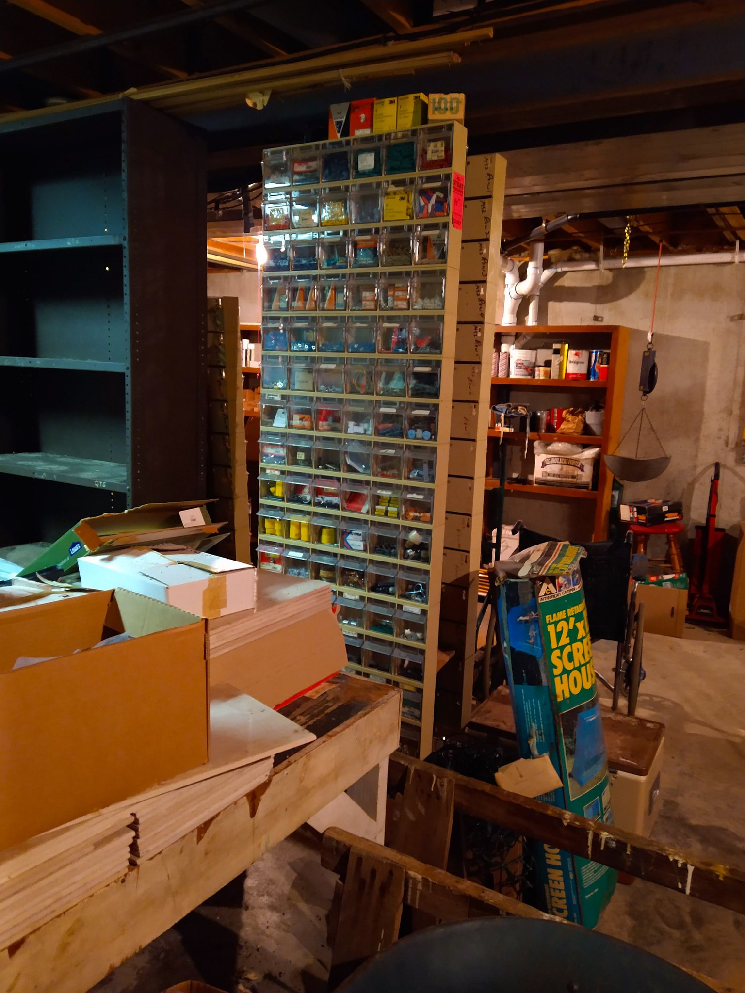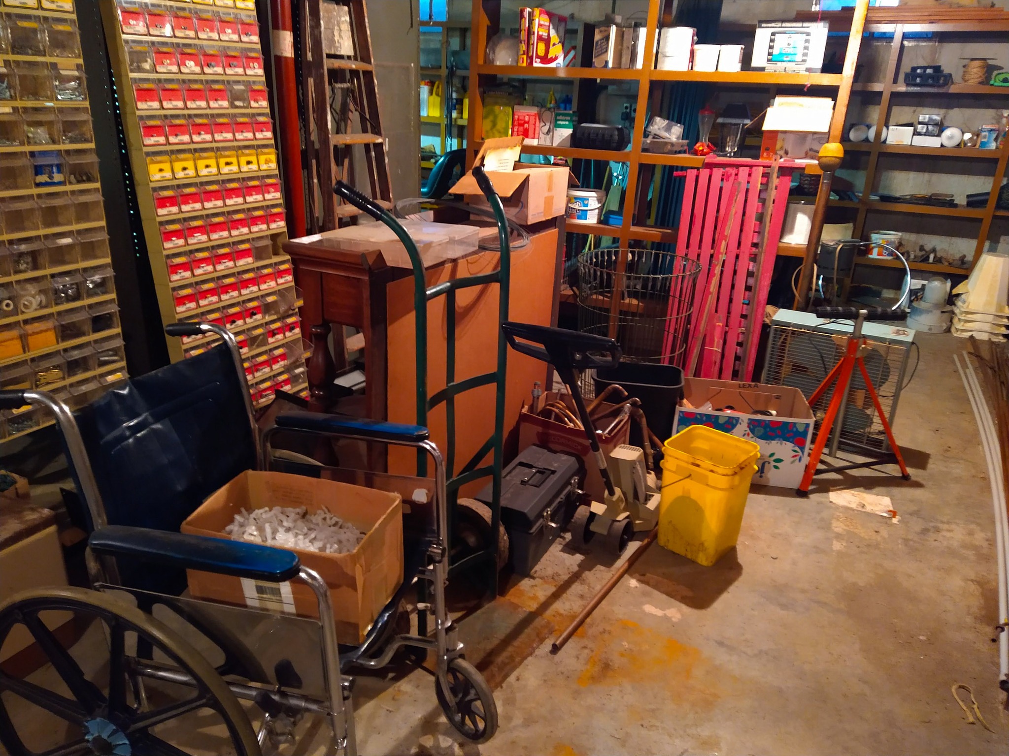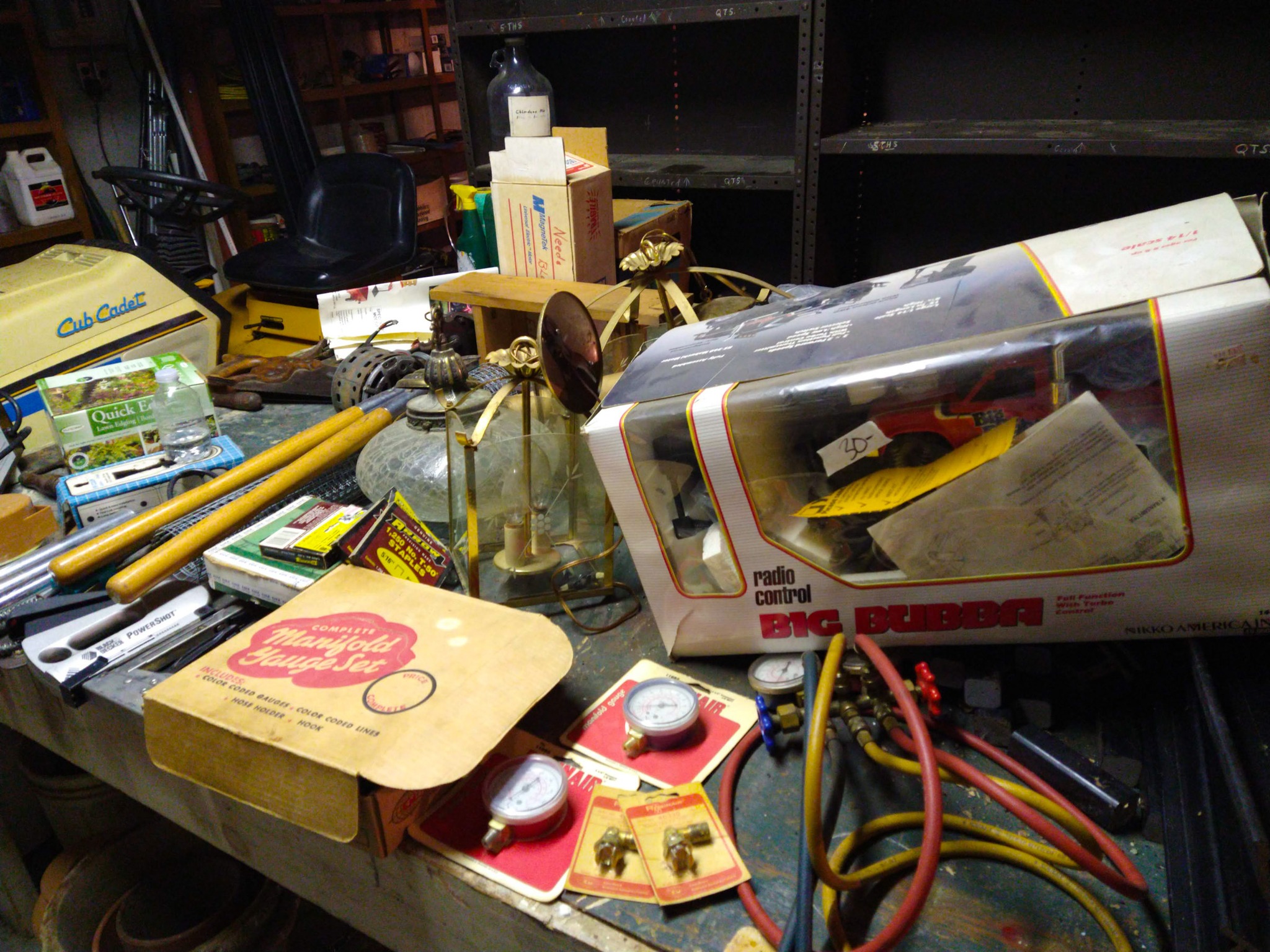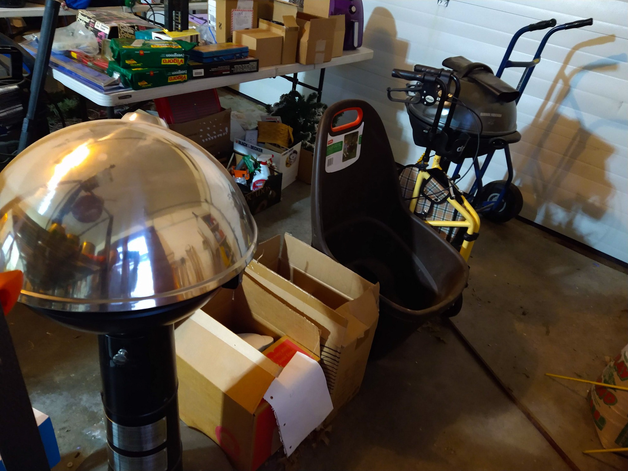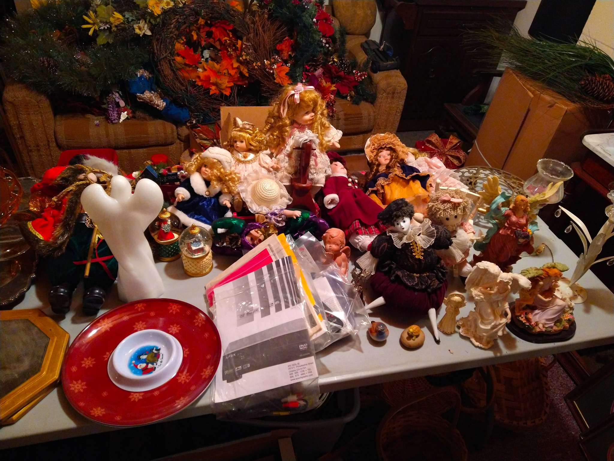 MISCELLANEOUS: ARTIFICIAL TREES – HANGING LEAD GL PIECE 3 FT X 20 IN – YARD STICKS – CASS TAPES – COLEMAN LANTERN – MANY BOOKS – DVD'S – BIRD CAGE – CD'S – ELECT STAPLER – FIT NATION FOLDING EXERCISE BIKE – FANCY METAL FIRE PLACE FRONT – NEW 3 WAY STADIUM CUSHIONS – CASS HOLDERS – MILLER DRAFT CLOCK – ARTIFICIAL XMAS TREES – 2 NEW BATTERY DADDY CASES – 3 HANDICAP ROLLER WALKERS – NEW MAGIC WAND PORT SCANNER – METAL MOP BUCKET & WRINGER – COSCO STOOL – LIKE NEW TERRASTAR TREADMILL – TAIL WIND EXERCISE BIKE – NEW ADJ FRAME FOLDING CHAIR w/ CARRY BAG – NEW V TECH SMART SPELLER – LEGO'S – 4 DR METAL LEGAL FILE – BI FOLD LEAD GLASS PC – NEW PANASONIC ANSWERING MACHINE – NEW 9 IN LAMINATOR – NEW BINOCULARS – BRASS FIGURES & CANDLE HOLDERS – NEW SOLIDEX CAMCORDER WIRELESS MICROPHONE SYSTEM – WOOD CARD TABLE – PACKING BLANKETS – LUGGAGE – SEVERAL METAL SHELVES – LIGHTED XMAS ANGEL – NEW HAND CRANK SOLAR RADIO – NEW ANIMATED & ILLUMINATED XMAS CAROLER – NEW ANIMATED SCARE CROW – NEW 15 IN SANTA – NEW HOLIDAY PROJECTOR – SLED – WILSON BALL GLOVE – PUZZLES & BOARD GAMES – COLEMAN 2 GAL ICE JUG – WOOD LOUISVILLE SLUGGER BATS – SET HANDY MAN ENCYC – NEW ELECT DART BOARD – NEW PEERLESS TOLIET – 36 IN TRAMPOLINE – JC PENNEY 5 SP GIRLS BIKE – 12 FT X 12 FT SCREEN HOUSE – LARGE OFFERING NEW HARDWARE – LARGE ROLL 2 STRAND COVERED COPPER WIRE – MICRONTA #3001 METAL DETECTOR – NEW NAILS, BOLTS, BRASS FITTINGS – BOXES WRAPPED COPPER WIRE – 3 ROLL 600 VOLT COATED COPPER WIRE – NEW MAIL BOX – NEW CERAMIC TILE – ELECT WALL BOXES – HVY DUTY 6 & 7 TIER METAL SHELVES – SEVERAL HEAVY COPPER 12 FT TUBING – LOTS OF SCRAP COPPER – SUMP PUMP – GALV PIPE FITTINGS – WIRE BARREL – TOOL BOX w/ ELECT SWITCHES – 3 SETS PARTS OR HARDWARE ORGANIZERS, 90 UNITS EACH – BAGS WATER SOFTNER PELLETS – 20 IN X 48 IN 1 IN THICK MARBLE – NEW PET KENNEL 24L X 19 INW X19H – MANY UNLISTED ITEMS