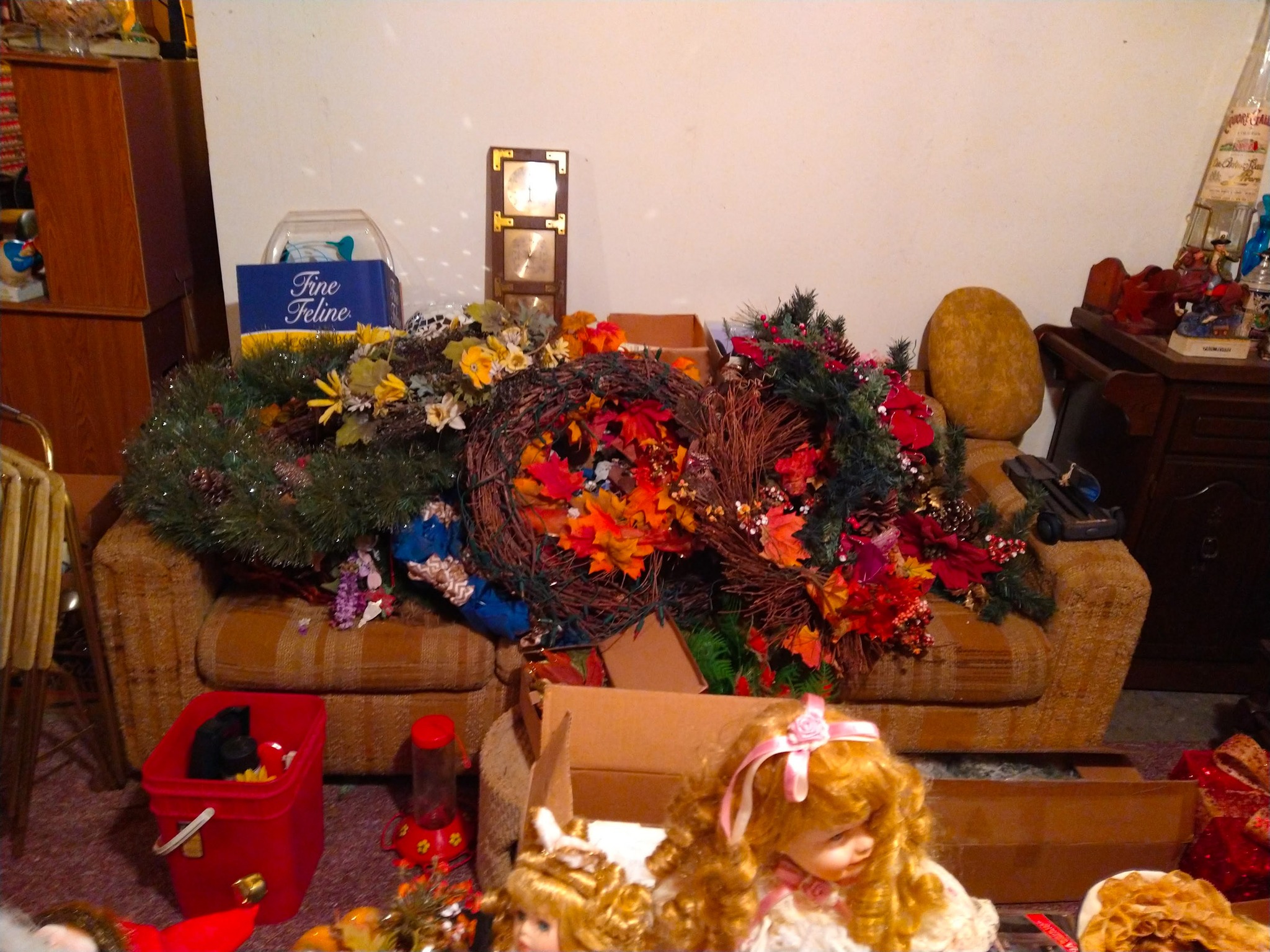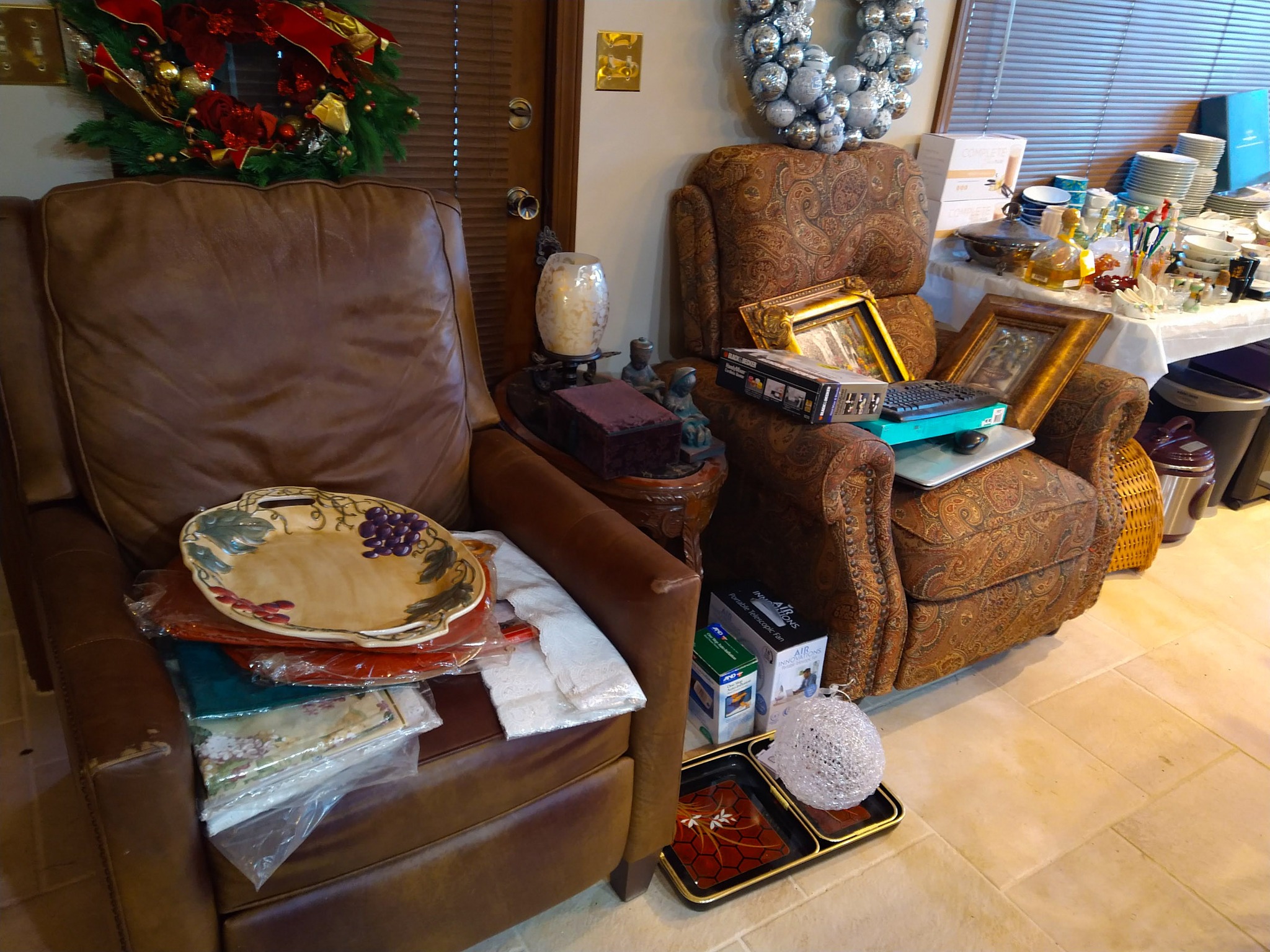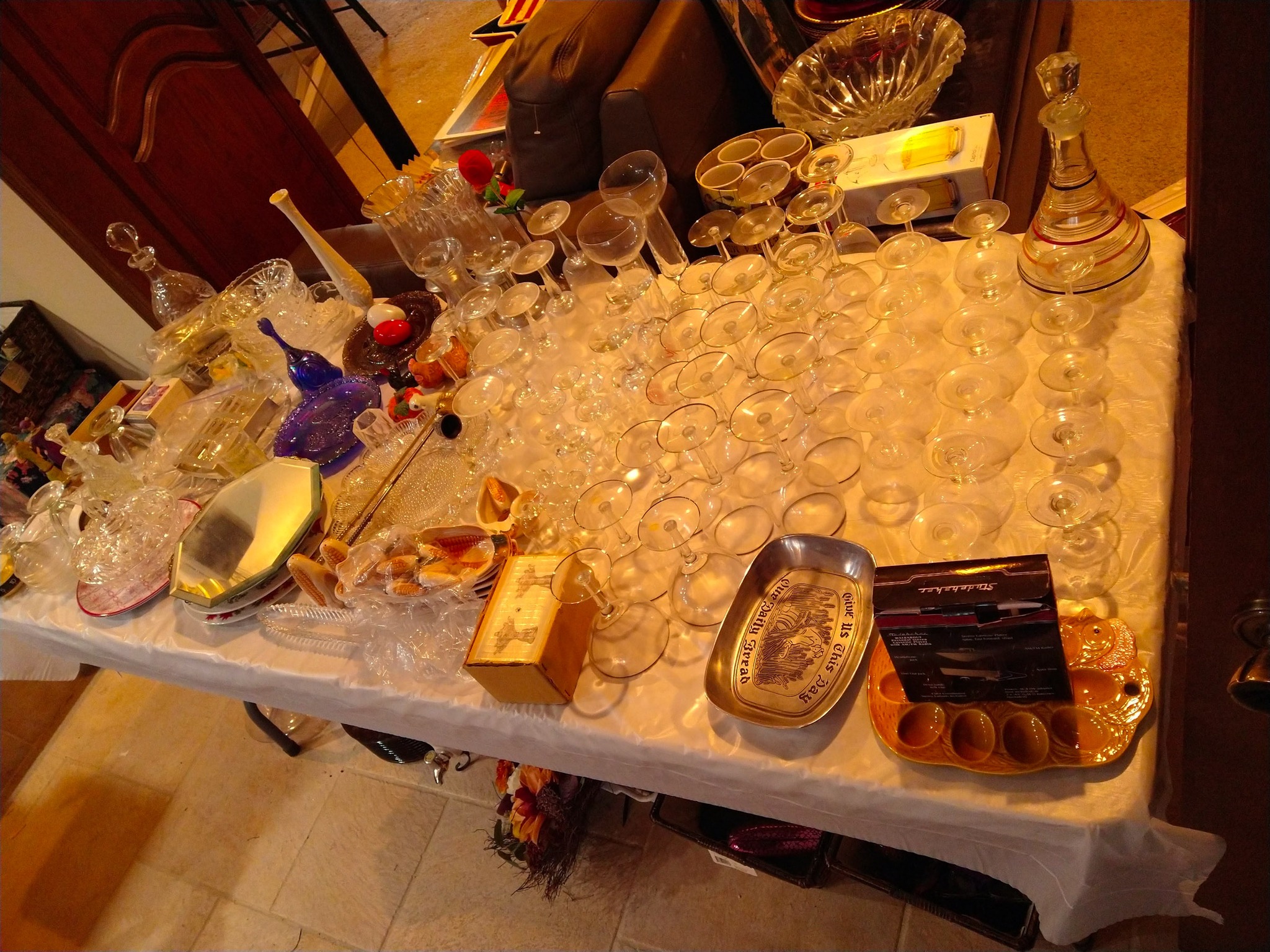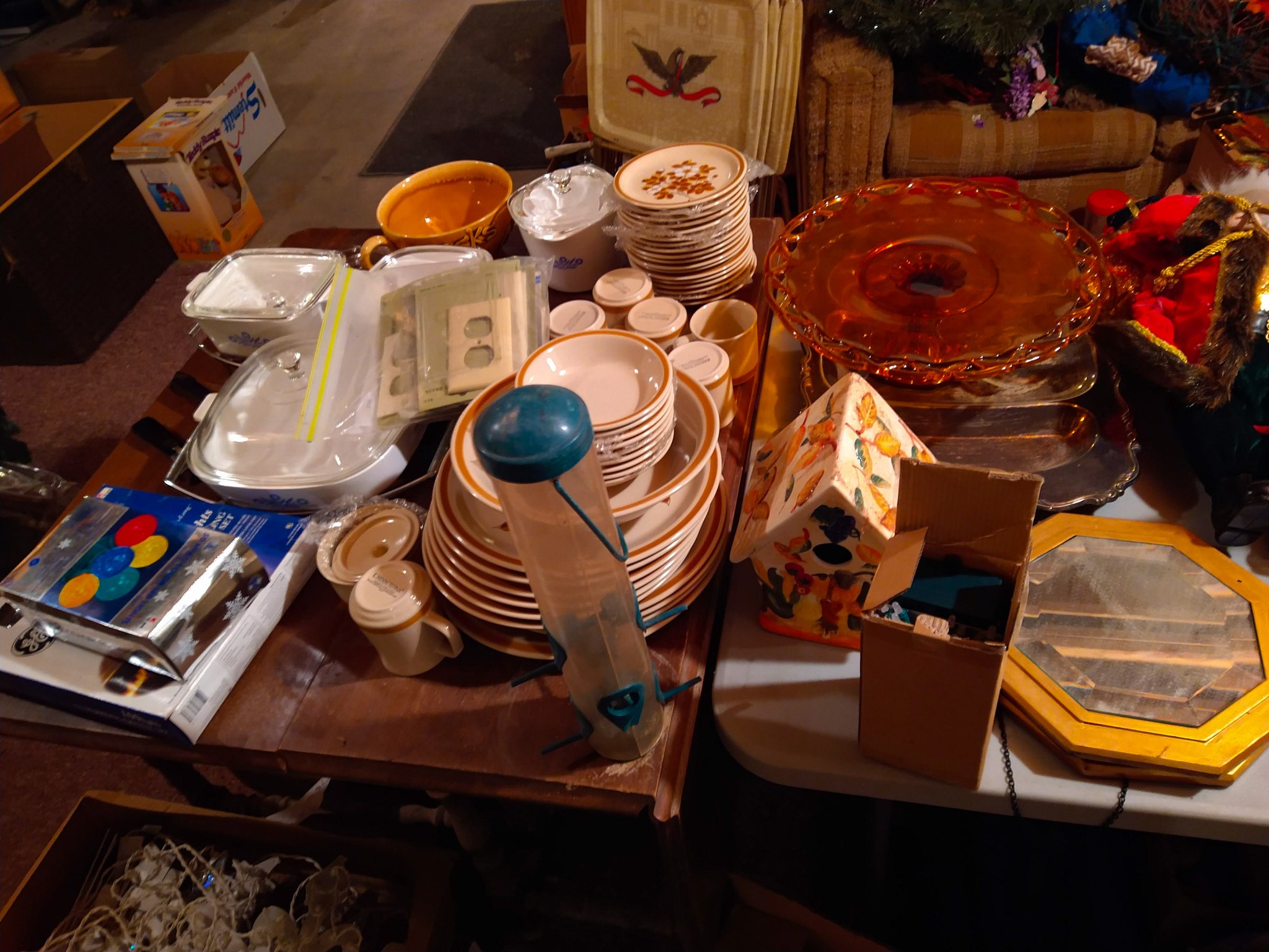 HOUSEHOLD: KEURIG COFFEE MAKER – KITCHEN AID PERSONAL COFFEE MAKER – NU WAVE 2 INDUCTION COOK TOP – NEW ESSENZA WAX WARMER – COOKS STAINLESS PAN w/ LID – CROCK POT – STAINLESS STOCK POT – NEW COVERED CASSEROLE – BLUE JEAN CHEF SET – CASSEROLE DISHES w/ LIDS – NEW ELECT SKILLET – REVERE STOCK POT – PRESSURE COOKER – CORNING CASSEROLES w/ LIDS – NEW SODA STREAM MACHINE & FLAVORS – GLASS ASH TRAYS – VERY LARGE OFFERING HOLIDAY DECORATIONS & WREATHS – 8 PL SET EKCO DISHES – BAROMETER – SNACK TRAYS – LARGE HAVILAND TRAY w/ 2 SERVING BOWLS – NATIVITY SET – NEW 47 PIECE STONEWARE HOLIDAY DISH SET – NEW SANTA COOKIE JAR – SIZE 10 WEDDING DRESS – SET 8 NEW CHAIR PADS – NEW TEA KETTLE – NEW BISCUIT JAR – REED & BARTON BELLS – CHILDRENS BOOKS – FIRE PROOF LOCK BOX w/ KEY – PEDESTAL CAKE PLATE – BALL TEA PITCHER – ALUM ROASTERS – CANNING JARS – HB ELECT FONDUE POT – MILK GLASS – NEW WEAREVER ELECT WOK – VERY LARGE OFFERING WOMENS CLOTHES, JACKETS, COATS, SHOES, MANY NEW w/ ORIG TAGS – MANY VASES w/ ART FLOWERS – SEWING BOX – LARGE OFFERING PURSES – BATH & HAND TOWELS – LINEN TABLE CLOTHS, RUNNERS, PLACEMATS & DOILIES – BED SHEETS – NEW QUEEN FLANNEL SHEET SET – NEW JAYHAWKS THROW – NEW TABLE CLOTHS & RUNNERS – NEW FULL & QUEEN SHEETS – NEW CURTAIN PANELS – NEW PILLOW CASES – NEW TOWEL SETS – NEW DOWN BLANKET – NEW QUEEN QUILT SET – AREA RUGS – LADIES SCARVES – FIGURINES – 2 CLOTHES RACKS ON ROLLERS – NEW DOWN COMFORTER – BED & THROW PILLOWS – AFGHANS – BLANKETS – FOLDING STEP STOOL – NEW PIZZELE & COOKIE MAKER – LARGE METAL WALL PLATE – HAGAR VASE w/ ART FLOWERS – 12 PL SET NOBLE EXE PLATES – SEA SHELLS – 3 ALABASTER BALLET DANCERS – SAND MAN FIGURES – TODD ENG TITAN PAN SET w/ LIDS – VISION WARE PAN SET w/ LIDS – COPPER CHEF PAN SET w/ LIDS – SUNBEAM DEEP FRYER – WEST BEND SLOW COOKER – REVERE PANS & LIDS – CORNING CASSEROLES w/ LIDS – FIRE KING BOWL SET – VISION WARE SOUP BOWLS – PYREX BOWLS w/ LIDS – CRYSTAL STEMWARE – MUGS, DRINK & TEA GLASSES – WHITE COFFEE MAKER – CUISINART SKILLET w/ LID – CROCK COOKIE JAR – BAKING PANS – SUNBEAM OSKAR – SUNBEAM MIXMASTER w/ BOWLS & BOOK – OSTER BLENDER – GE PORT MIXER – GLASS CASS PANS – CUTTING BOARDS – BUTCHER KNIVES – 8 PL SET NORITAKE, THULE CHINA w/ SERVERS – KITCHEN UTENSILS – GLASS REFRIGATOR DISH w/ LID – CORELLE DISHES – STRAWBERRY COOKIE JAR – NOBLE EXCELLENCE GRAPE PATTERN, CANNISTER SET, PITCHER & OTHER PCS – 8 PL SET ONEIDA FLATWARE – HANGING PLATE HOLDER w/ PLATES – O CEDAR MOP & BUCKET – B& D ROYAL PAPER SHREDDER – TODD PRESSURE COOKER – CUT CRYSTAL STEMWARE – SET LENOX FLUTES – NICE 12 PL SET NORITAKE #5520 CHINA w/ SERVERS – NICE CUT GLASS CRYSTAL PITCHER – SILVER PLATE SERVERS – ORIENTAL BOOK ENDS – NEW B&D HANDY MIXER – NEW BLOOD PRESSURE MONITOR – LACQURD TRAYS – EGG PLATES – GLASS DECANTERS – CORN TRAYS – SET LG AMBER PLATES – HAMILTON QUARTZ CLOCK – LENOX HARVEST ANGEL FIGURE – PARTIAL SET REED & BARTON SP FLATWARE w/ CHEST – ROGERS BROS 8 PL SET S.P. FLATWARE w/ CHEST – COMMUNITY 8 PL SET S.P. FLATWARE w/ CHEST – LARGE PLANT VASE w/ FOOTED STAND – WILLOW TREE COMFORT FIGURE - SNOW GLOBE - & MUCH MORE