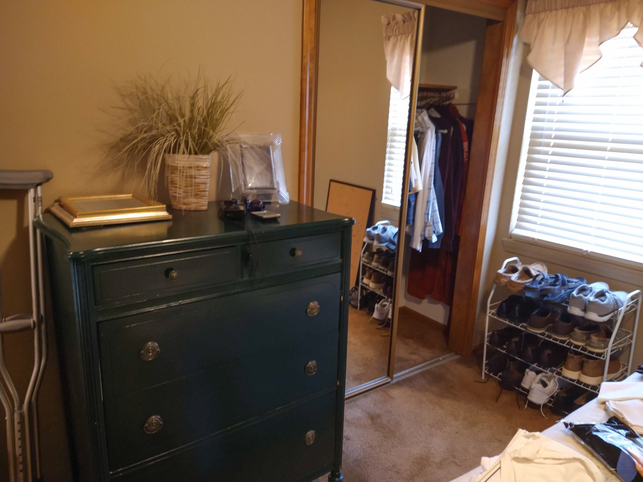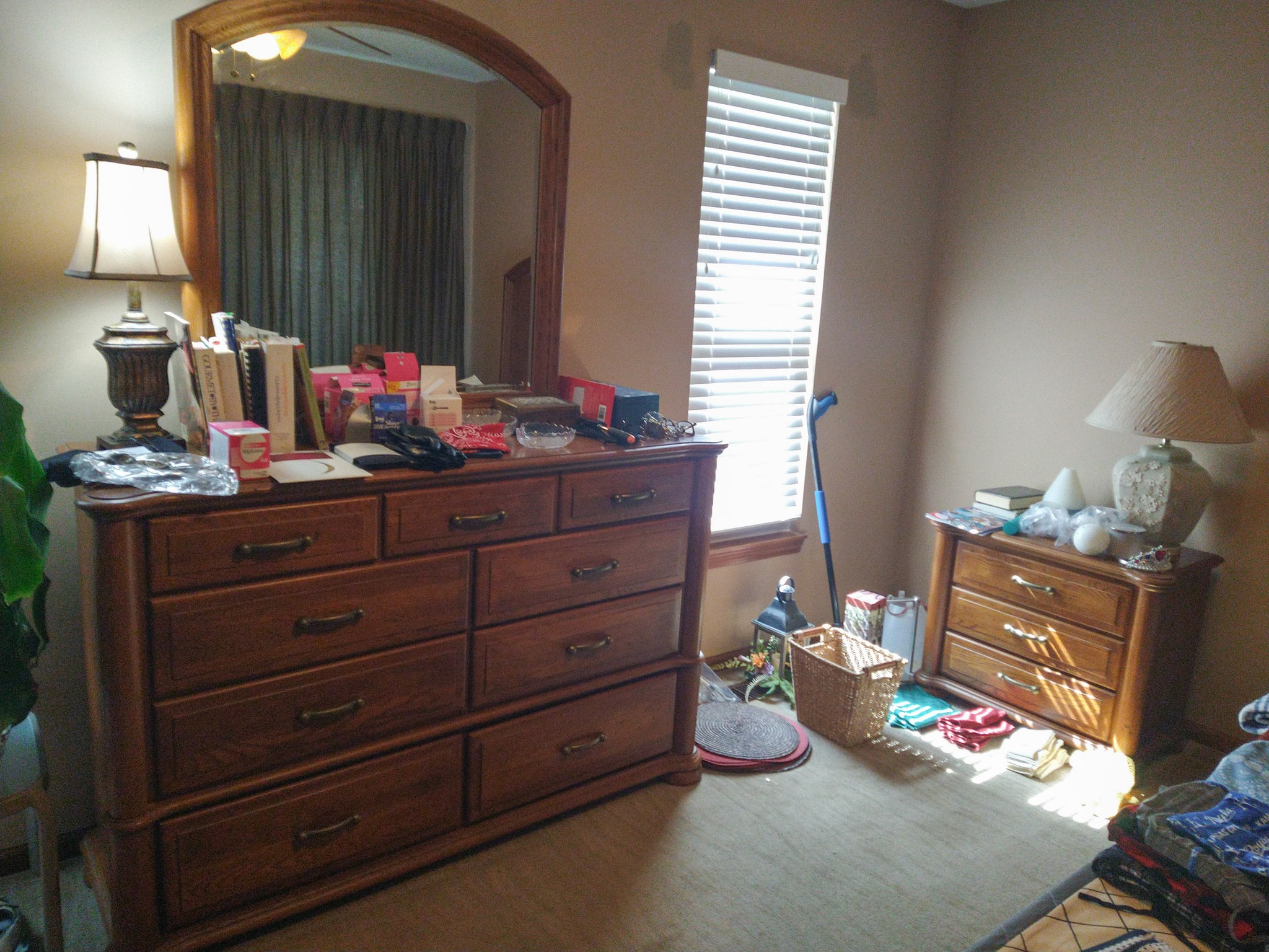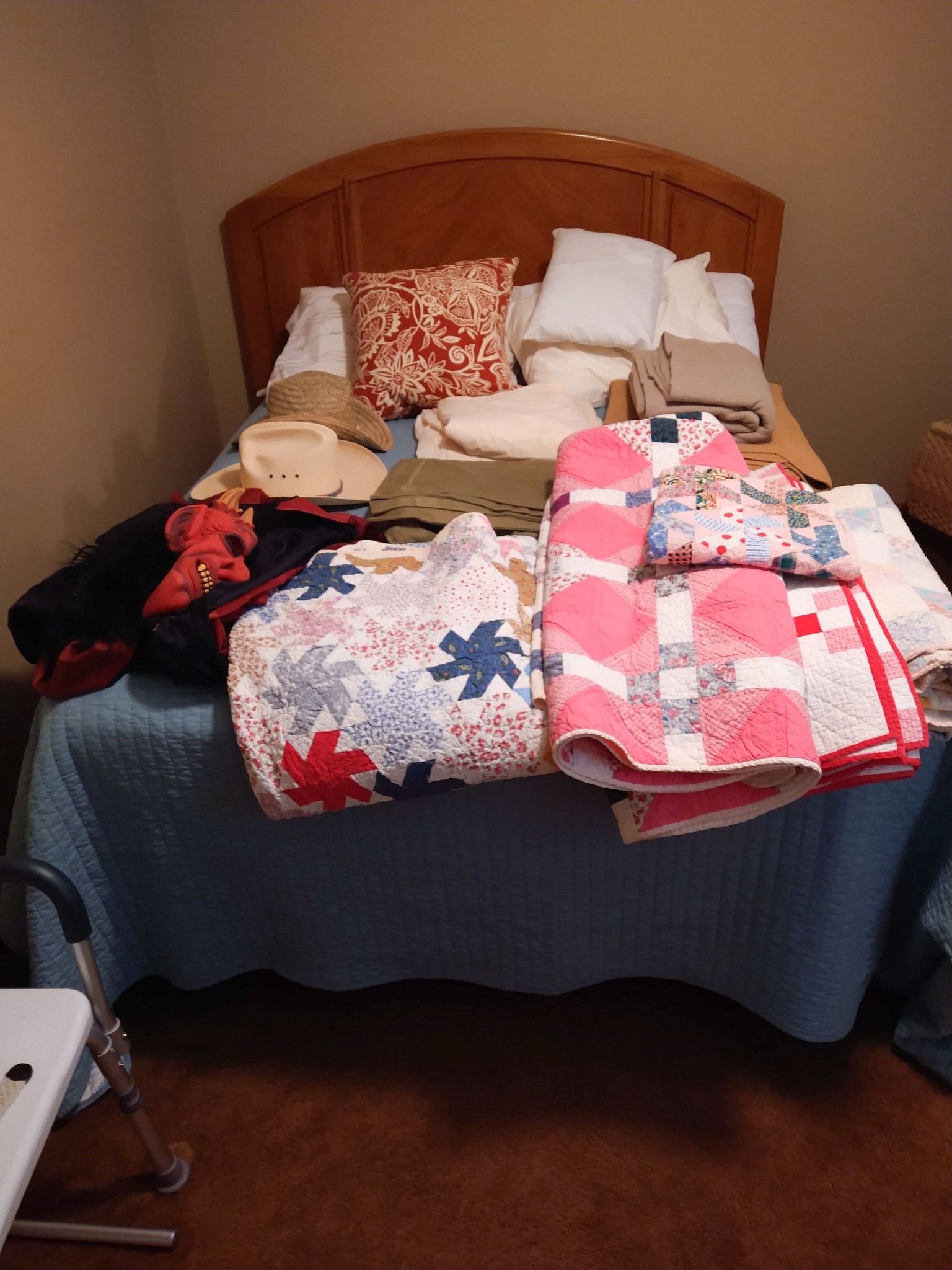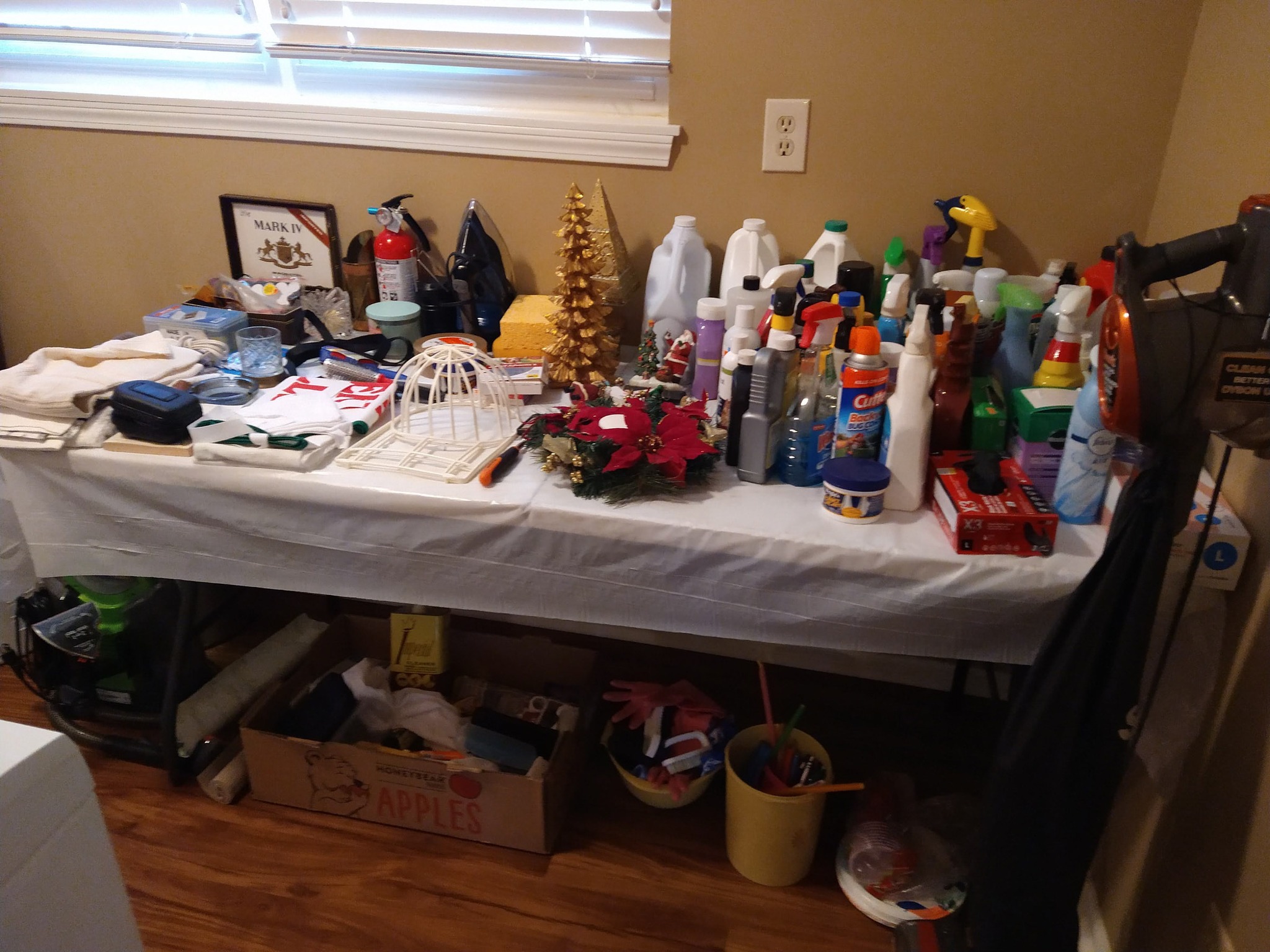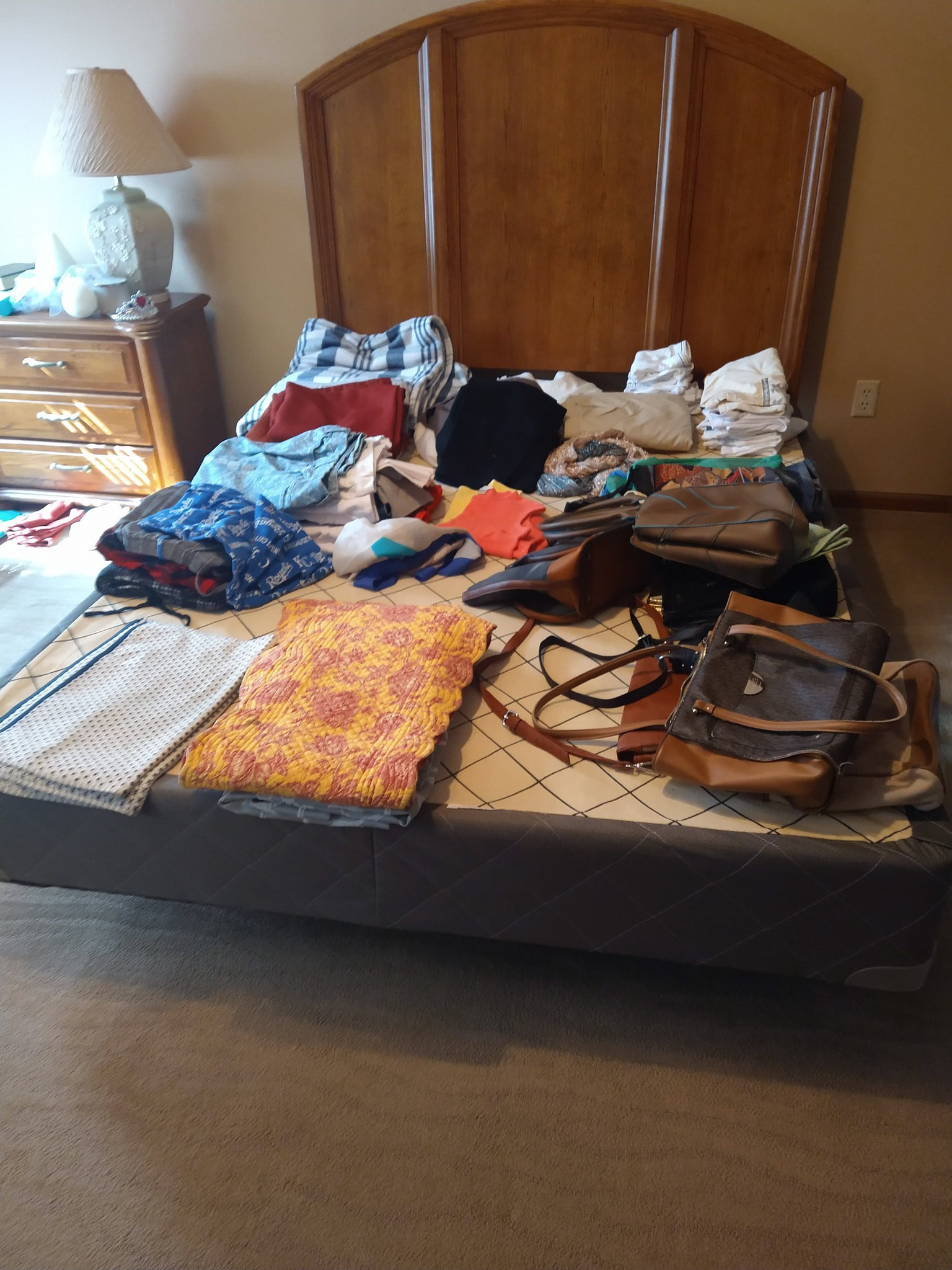 HOUSEHOLD: POTTED PLANTS – LADIES PURSES, CLOTHES & SHOES – BLANKETS – BED SHEETS – PLACEMATS – COOKBOOKS – VASES – BED & THROW PILLOWS – BUTTONS – BATH & HAND TOWELS – WASH CLOTHS – SHOE RACK – ADJ HEIGHT BATH TUB RAIL – BASKETS – ONEIDA BAKING PAN – KITCHEN AID MIXER & STAINLESS BOWL – ELECT KNIFE – TUPPERWARE – PATTERN GLASS BOWLS & DISHES – ELECT GRILL – HOLIDAY TRADITION PLATES – SERVING TRAYS – BEER GLASSES & MUGS – FLASK – CORK SREW – BAKING PANS – BUNT CAKE PAN – LOAF PANS – CORNING WARE – GLASS PIE PLATES – CORNING PIE PLATES – LECREUSET CASSEROLES – PYREX CASSEROLES – STAINLESS FLATWARE – MR COFFEE MAKER – HB HAND MIXER – DRINK GLASSES – KITCHEN UTENSILS – NINJA AIR FRYER – 8 PL SET ELLEN DEGENERES CHINA BY ROYAL DOULTON – B&D TOASTER – HB CAN OPENER – OSTER BLENDER – WARING PRO WAFFLE MAKER – PYREX MIXING BOWL SET – CIRCUION PAN SET & SKILLET – COVERED SKILLET & PAN – EGG POACHER – SQUARE RED COPPER PAN w/ LID – METAL ROLLING PIN – LODGE 12 IN CAST IRON SKILLET – PYREX CROCK POT – HB IRON – STEP TRASH CAN – CLOTHES HAMPER – WOOD IRON BOARD –