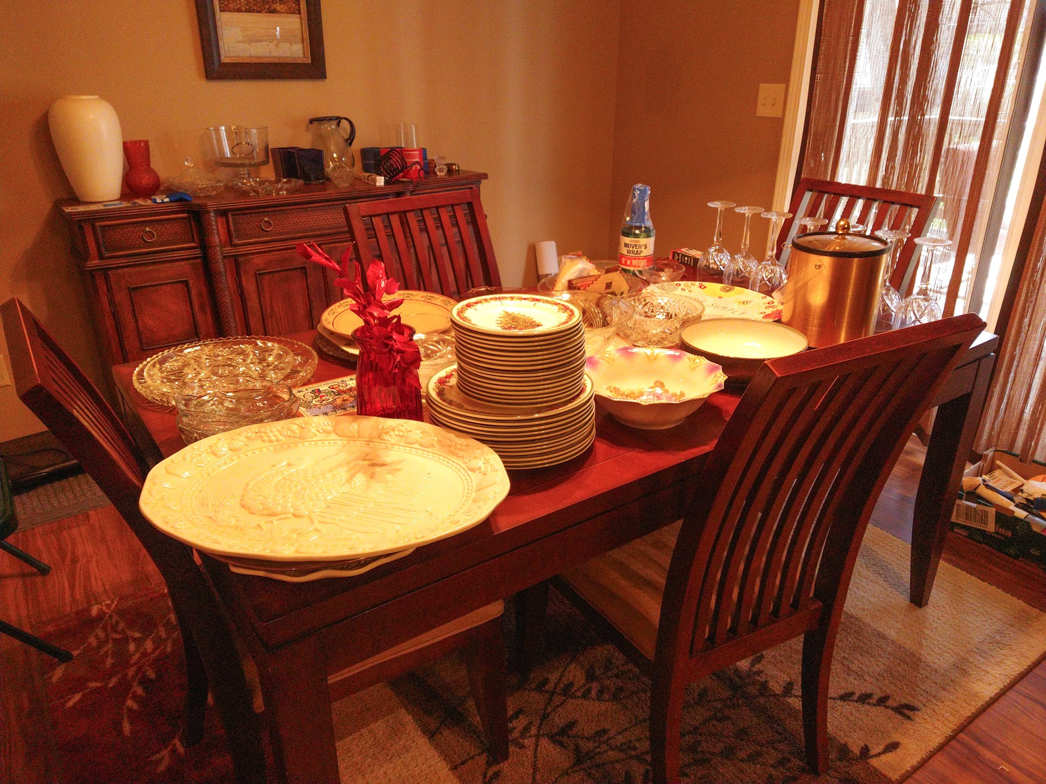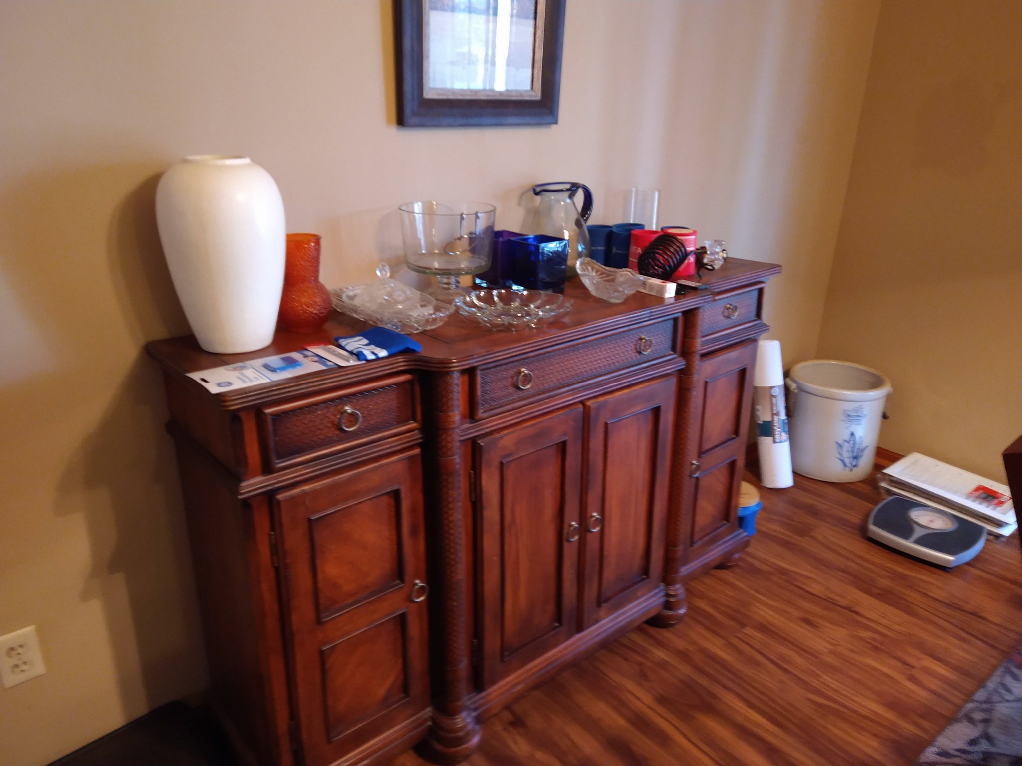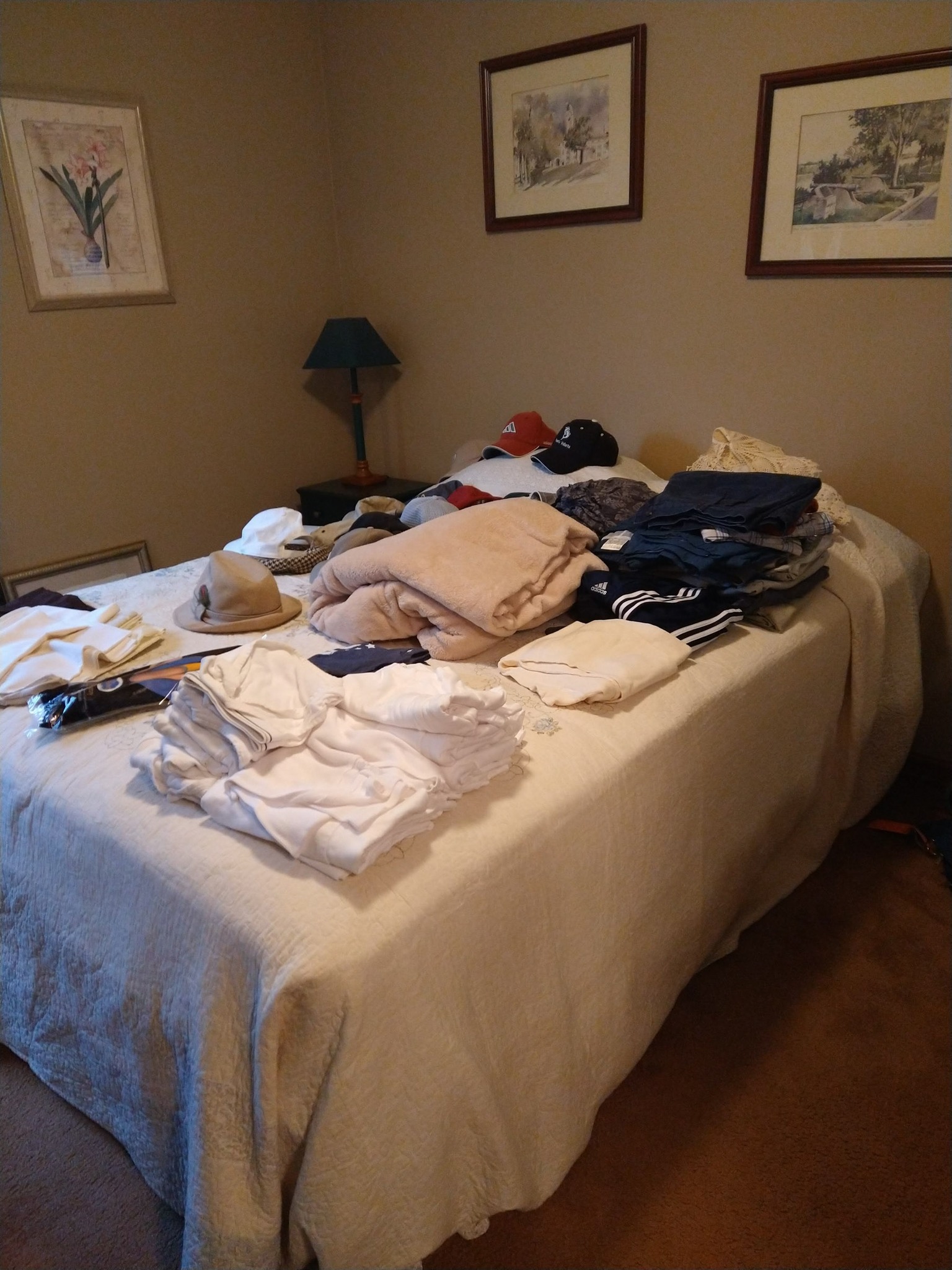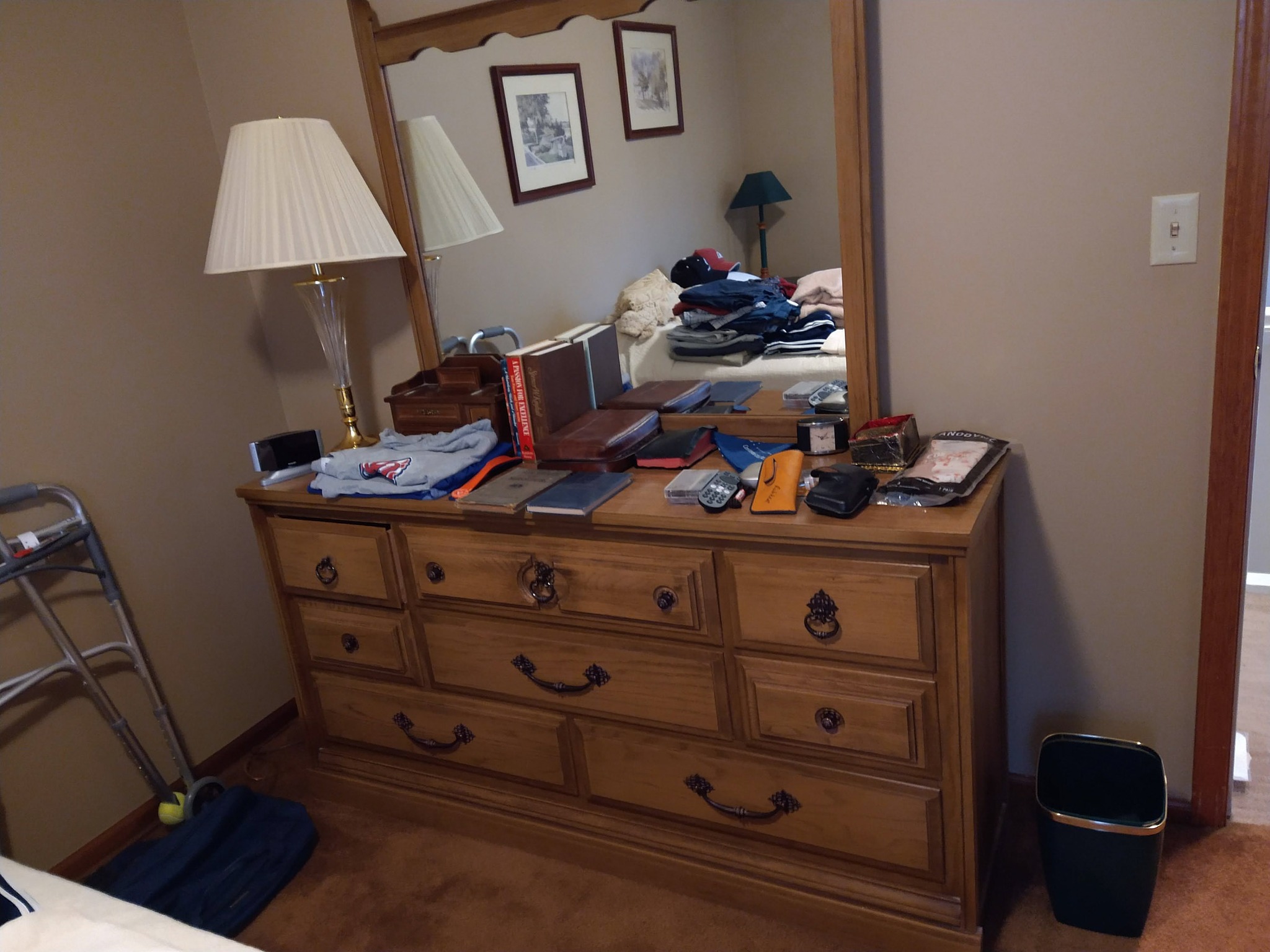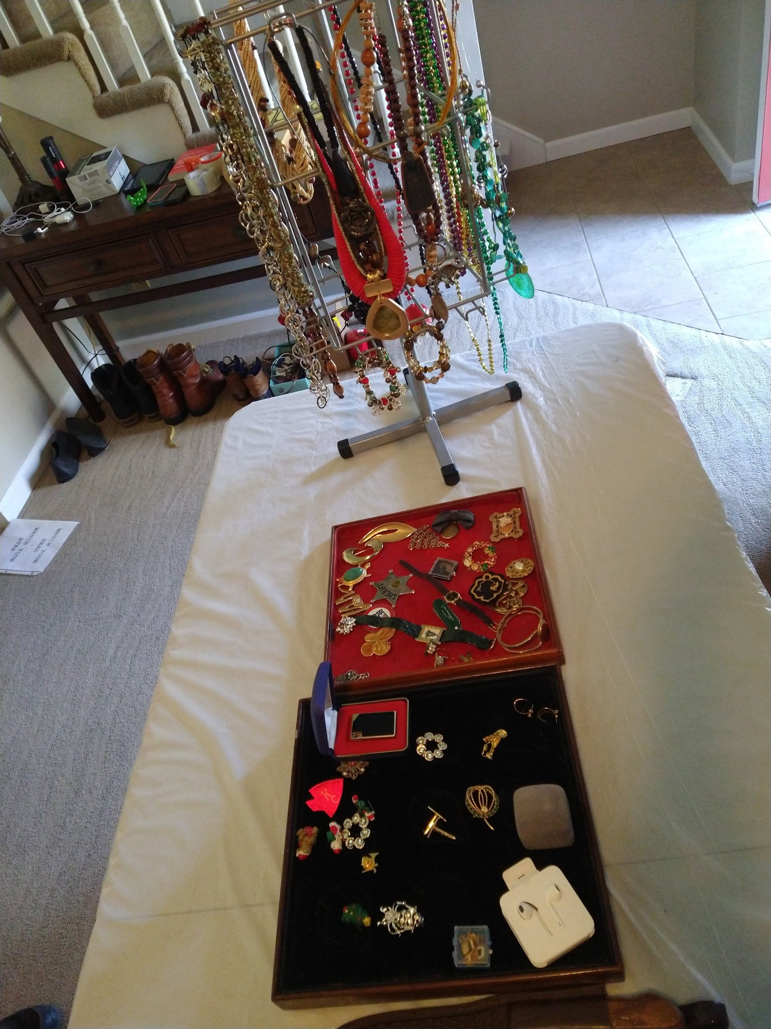 HOUSEHOLD: POTTED PLANTS – LADIES PURSES, CLOTHES & SHOES – BLANKETS – BED SHEETS – PLACEMATS – COOKBOOKS – VASES – BED & THROW PILLOWS – BUTTONS – BATH & HAND TOWELS – WASH CLOTHS – SHOE RACK – ADJ HEIGHT BATH TUB RAIL – BASKETS – ONEIDA BAKING PAN – KITCHEN AID MIXER & STAINLESS BOWL – ELECT KNIFE – TUPPERWARE – PATTERN GLASS BOWLS & DISHES – ELECT GRILL – HOLIDAY TRADITION PLATES – SERVING TRAYS – BEER GLASSES & MUGS – FLASK – CORK SREW – BAKING PANS – BUNT CAKE PAN – LOAF PANS – CORNING WARE – GLASS PIE PLATES – CORNING PIE PLATES – LECREUSET CASSEROLES – PYREX CASSEROLES – STAINLESS FLATWARE – MR COFFEE MAKER – HB HAND MIXER – DRINK GLASSES – KITCHEN UTENSILS – NINJA AIR FRYER – 8 PL SET ELLEN DEGENERES CHINA BY ROYAL DOULTON – B&D TOASTER – HB CAN OPENER – OSTER BLENDER – WARING PRO WAFFLE MAKER – PYREX MIXING BOWL SET – CIRCUION PAN SET & SKILLET – COVERED SKILLET & PAN – EGG POACHER – SQUARE RED COPPER PAN w/ LID – METAL ROLLING PIN – LODGE 12 IN CAST IRON SKILLET – PYREX CROCK POT – HB IRON – STEP TRASH CAN – CLOTHES HAMPER – WOOD IRON BOARD –