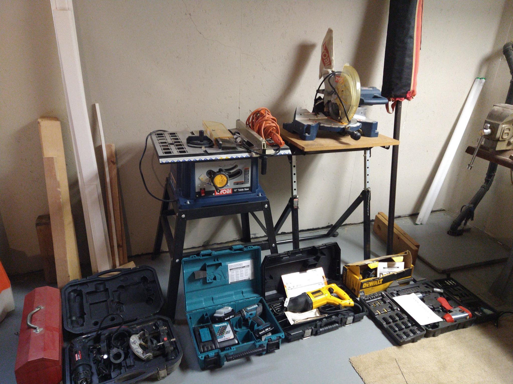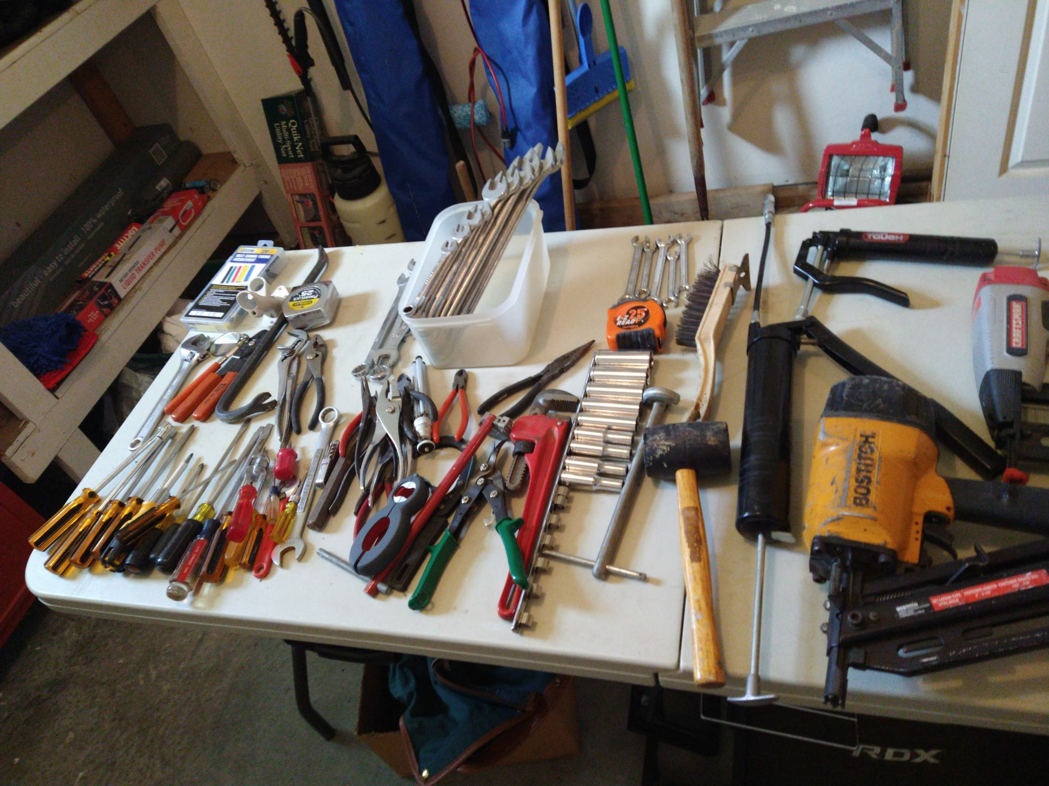 LARGE OFFERING QUALITY HAND & POWER TOOLS: SQUARES – LEVELS – HAMMERS – CROW BARS – HAND SAWS – FOLDING SAW HORSES – RAKES – EXT CORDS – HOES – SHOVELS – SNOW SHOVEL – 5 TINE FORK – SPLIT MAUL & WEDGE – SLEDGE HAMMER – RUBBER TIRE WHEEL BARROW – LITTLE GIANT FOLDING 20 FT EXT LADDER w/ PAINT WING SPAN – MAKITA PALM SANDER – B&D PORT JIG SAW – RIGID ORBIT SANDER w/ CASE – B&D 5 / 8 HP ROUTER – SKIL ½ IN DRILL – B&D ELECT STAPLER – RYOBI 4 VOLT DRILL w/ BATT & CHARGER – WAGNER 300 HEAT GUN – RYOBI 59 PIECE DRILL SET – NEW CHICAGO ELECT OSCILLATING POWER TOOL – 7 ¼ IN SKIL CIRC SAW – SET DEWALT BITS – HI SPEED DRILL BITS – TEST RITE HVY DUTY BENCH GRINDER #119 – HVY DUTY KT BENCH VISE – VISE GRIPS – COMBINATION WRENCHES – METAL FRAME 32 IN X 83 IN, 2 IN WOOD TOP WORK BENCH – B&D BELT SANDER – ROCKFORD ½ IN IMPACT, 3 / 8 RATCHET, AIR HAMMER & ATTACHMENTS w/ CASE – DEWALT ANGLE GRINDER w/ CASE – DEWALT RECIP SAW w/ CASE – MAKITA 18 VOLT DRILL w/ BATTERY & CHARGER - TROUBLE LIGHT – CLEAN RYOBI 10 IN TABLE SAW ON STAND – CRAFTSMAN ALL IN ONE CUTTING TOOL – TOOL BOX – SHOP LIGHT – BAR CLAMPS – ADJ ROLL BAR BASE – RIGID 5 GAL SHOP VAC – EASY REACH GORILLA STEP LADDER – CRAFTSMAN 2 DRAWER ROLLAWAY BASE TOOL CHEST – SHOP HAMMER – SHOP BROOM – 6 FT METAL STEP LADDER – MECH CHOICE SHOP LIGHT – CLEAN DYNAMARK 3, 20 IN GAS SNOW BLOWER - HOMELITE POWER WASHER, GAS, 2700 PSI – EVER START BATT CHARGER, STARTER – MVP 10 IN ELECT POLISHER – BOSTITCH AIR NAILER 2 TO 3 ½ IN – CRAFTSMAN AIR FINISH NAILER, 16 GA – GREASE GUN – PIPE WRENCH – SET COMB WRENCHES – ½ IN DR METRIC DEEP SOCKETS – ADJ WRENCHES – RYOBI 10 IN COMPOUND SAW ON ADJ TABLE –