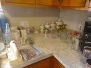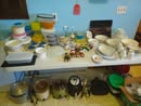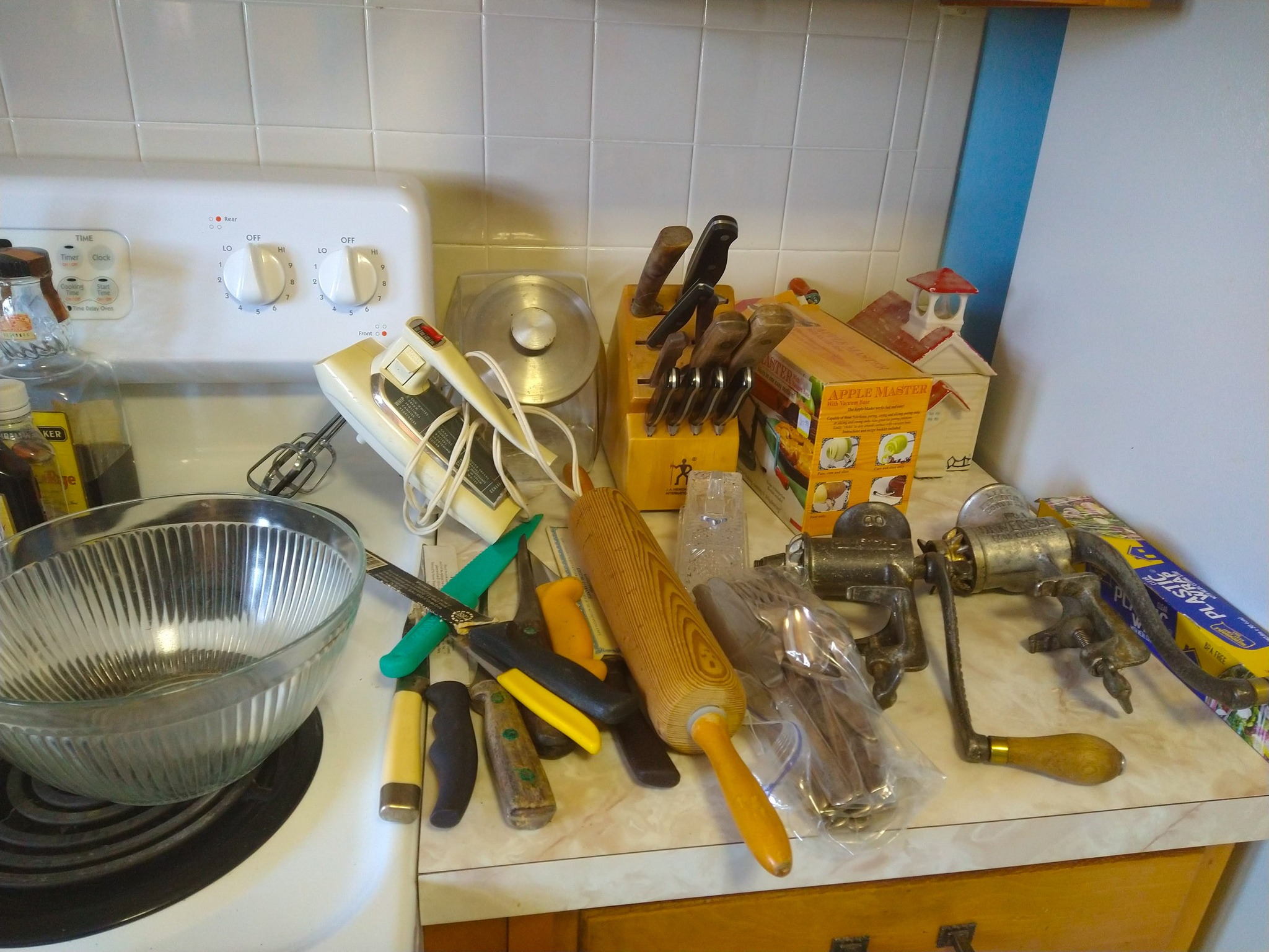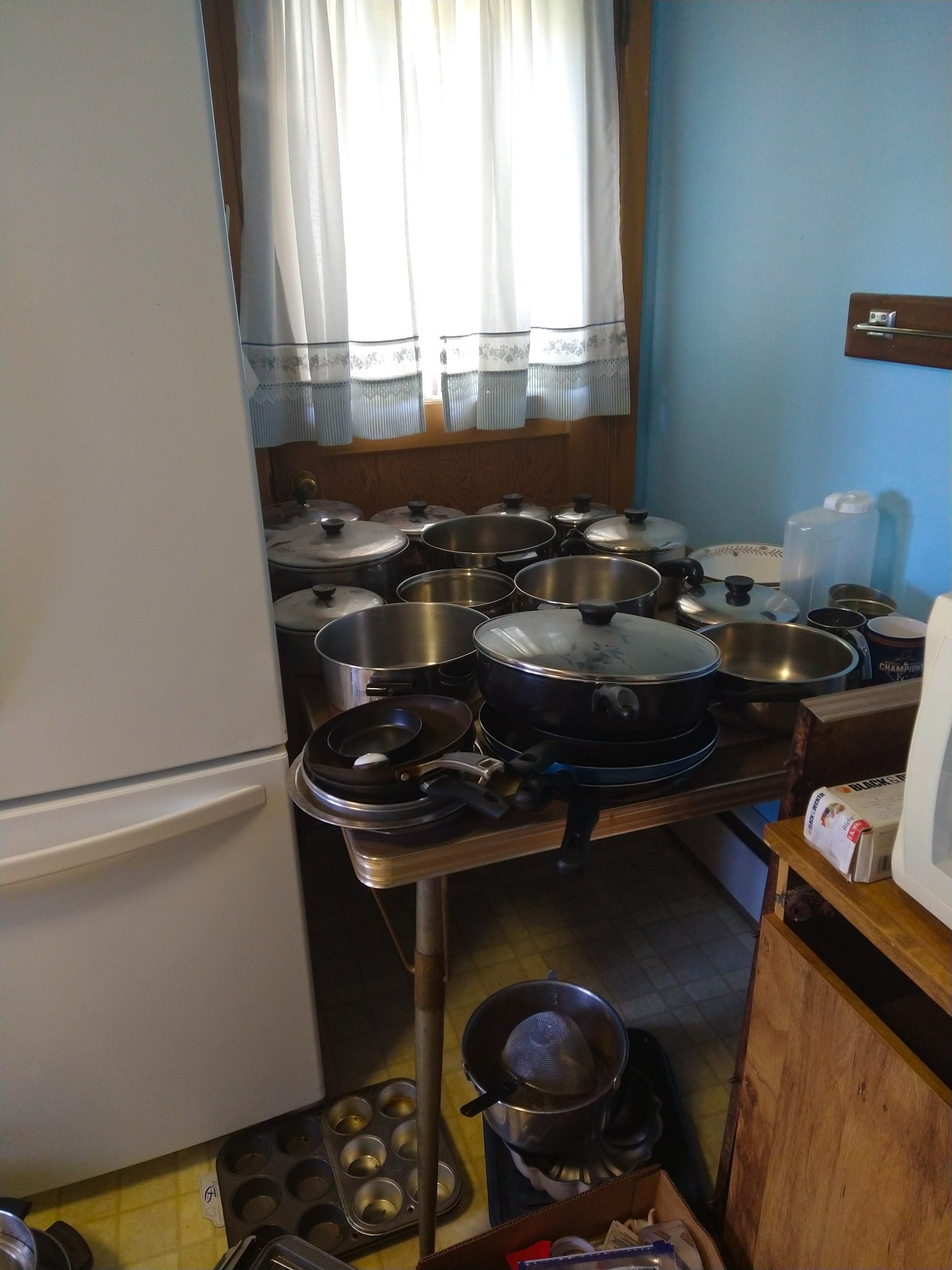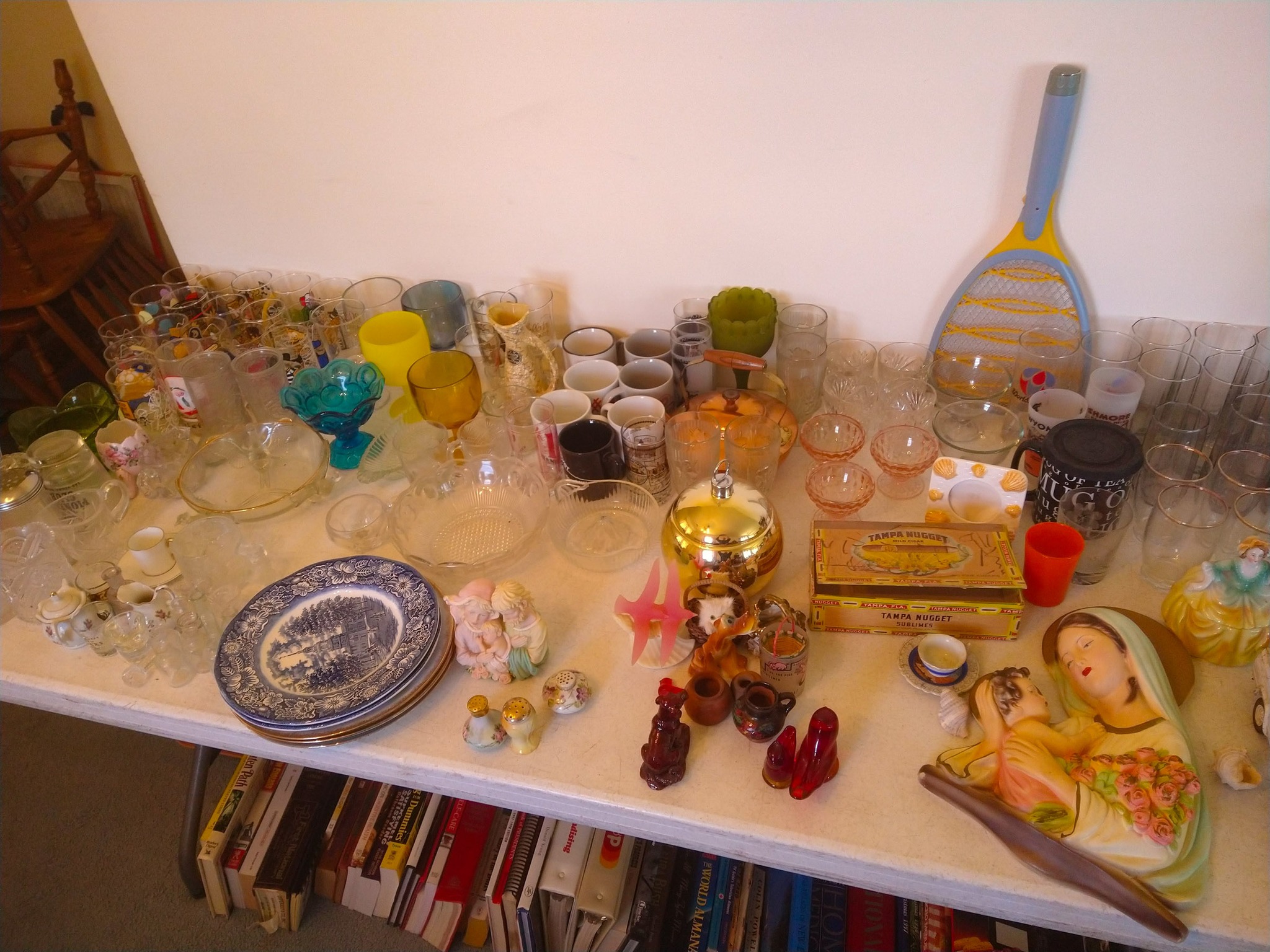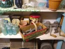 HOUSEHOLD: IRONING BOARD – BATH & HAND TOWELS - BED SHEETS – SHOWER STOOL – CURTAINS – HAND SEWN LINENS – CLOTH APRONS – TABLE CLOTHS – BLANKETS – COMFORTER – ELECT BLANKET – ELECT MALT MIXER – PYREX PIE PLATES – CHERRY PITTER – AREA RUGS – LARGE KETTLES – CROCK POTS – CORNING BOWLS w/ GLASS LIDS – RIVAL STEAMER – CASSEROLE DISHES – TUPPERWARE – PYREX REFRIGERATOR DISHES w/ LIDS – CORELLE DISHES – TOASTER – OSTER BLENDER – FOOD PROCESSOR – STAINLESS POTS & PANS – SKILLETS – BAKING PANS – PRESTO PRESSURE COOKER - #1 & #00 FOOD GRINDERS – APPLE PEELER – FLATWARE – COOKIE JAR – GE HAND MIXER – WOOD ROLLING PIN – B&D COFFEE MAKER – OWL COOKIE JAR – 4 PIECE CANNISTER SET – KITCHEN UTENSILS – WAFFLE IRON – LARGE SERVING BOWLS – LIBERTY BLUE PLATES – HAND JUICER – PINK SHERBERTS – TEA GLASSES – COOK BOOKS – LARGE PATTERN GLASS BOWLS – MINIATURE FIGURINES – GLASS PAPER WEIGHTS – FOOD SAVER VACUM SEALER & ROLLS – STANLEY THERMOS – LARGE COLD PACKER CANNER – METAL CROSS & JESUS PLAQUE w/ INRIAT TOP – PINK FLOWER FROG – LOUNGE CUSHIONS – ROASTERS – PINT & QUART JARS – MIRRO 22 QT PRESSURE COOKER – OLD TEA JAR – WOOD HANDLE BUTCHER KNIVES – GREEN URANIUM GLASS JUICER – HANDICAP POTTY – SAFETY BOOSTER SEAT – CHRISTMAS LIGHTS & DECORATIONS – TAYLOR FLOOR SCALE – 1990 & 93 ART GL CARDINAL OF LOVE BIRDS –