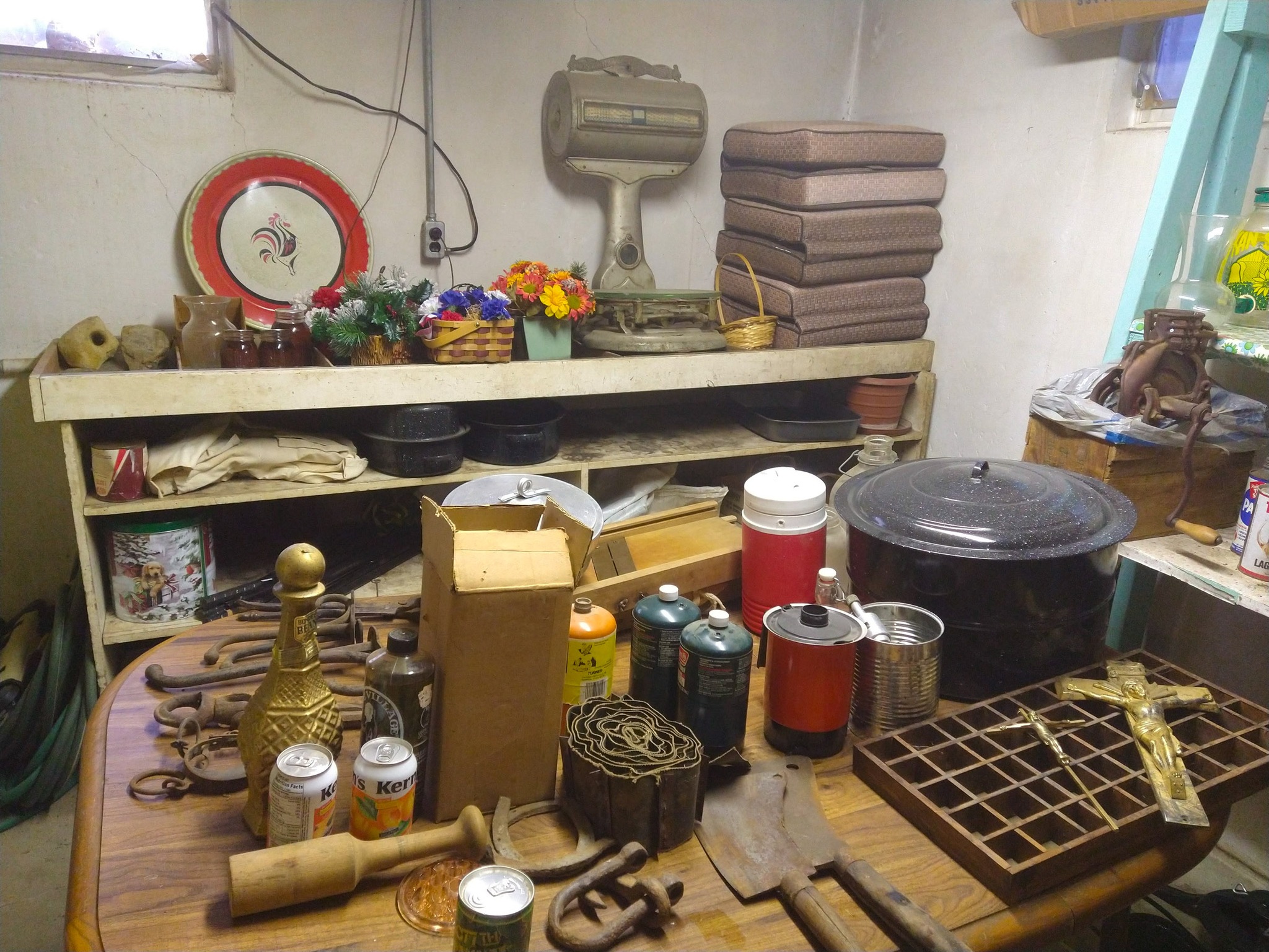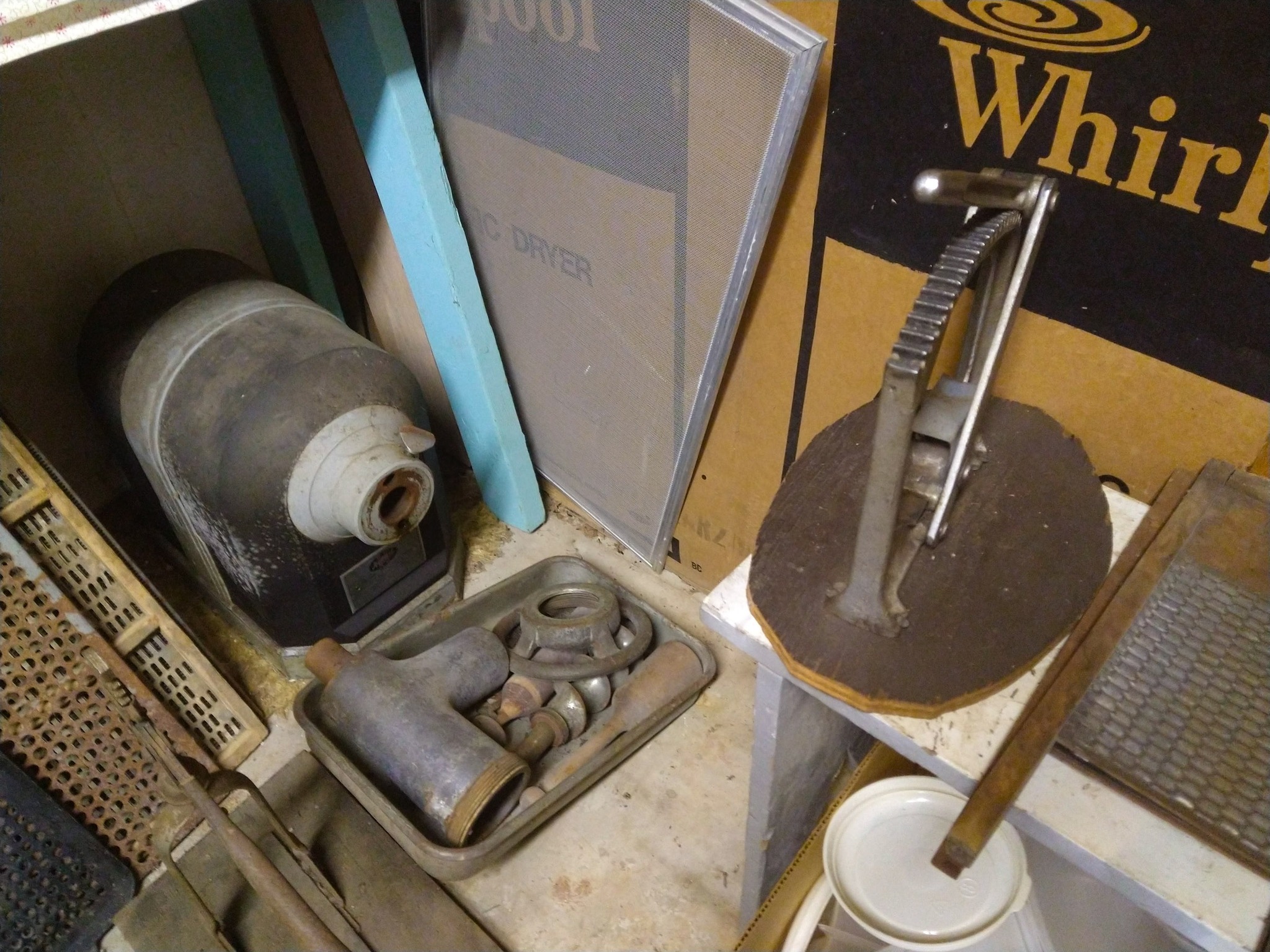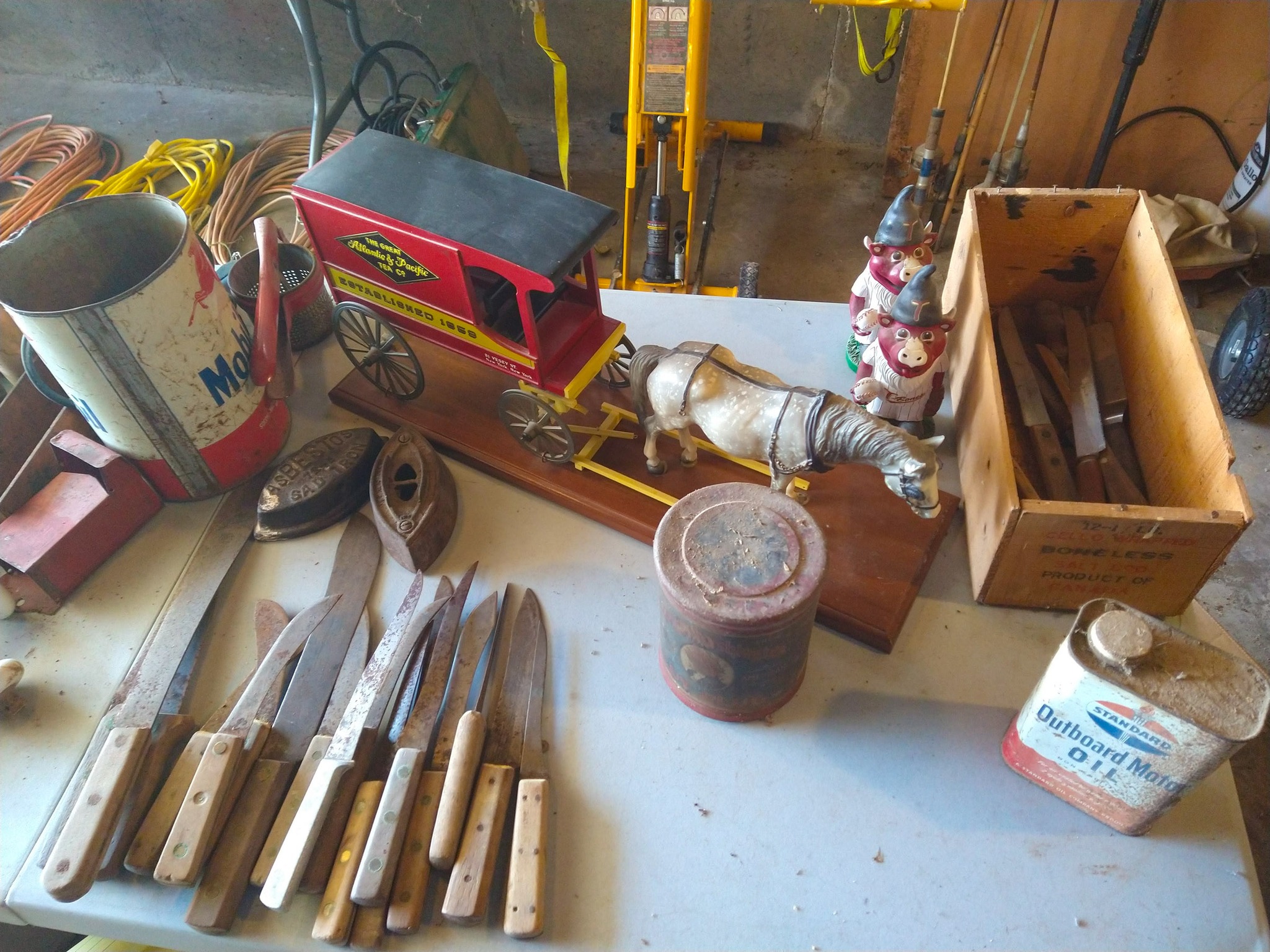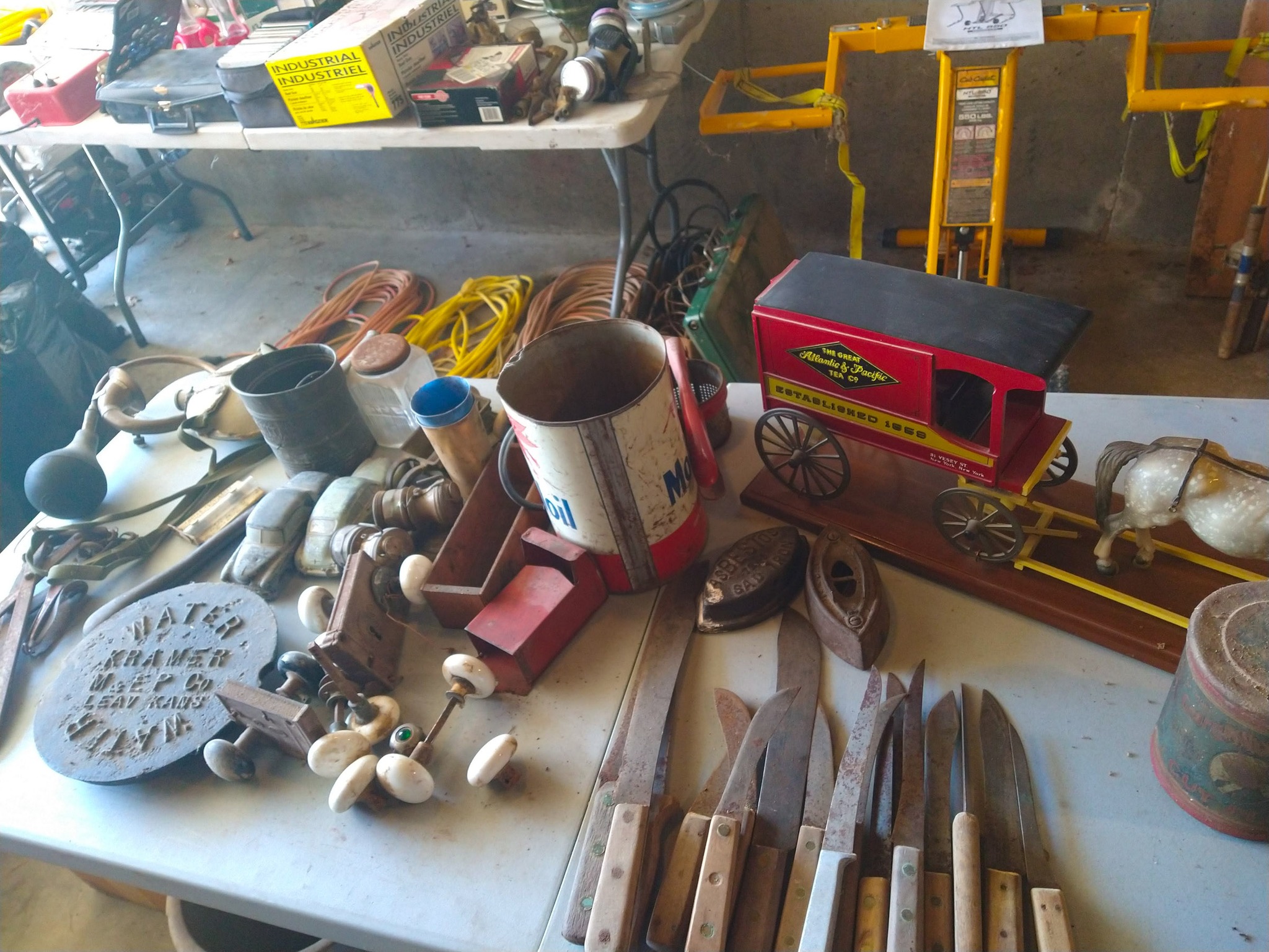 ANTIQUES & COLLECTIBLES: LITTLE SWEEPER HUMMEL – CORK REMOVER w/ STERLING & HORN HANDLE – HOPALONG CASSIDY KNIFE – UNCLE SAM TIN CASH REGISTOR BANK – MANUFACTURES BANK SUIT CASE BANK – VERY OLD PHOTO ALBUM – LARGE SET NORITAKE CHINA. MADE IN OCCUPIED JAPAN w/ FANCY SERVING DISHES – BOWL w/ FLYING PHEASANTS – MCDONALDS 1977 ACTION SERIES CARTOON GLASSES – TIN BOKER COFFEE BANK – COSSACK COPPER CUP – WASHBOARDS – O.E.POTTER NUT CRACKER – BOTTLE CAPPER – OIL LAMP – MANY OLD & UNUSUAL BEER TINS – ADV BOTTLE T.D. SAMUEL WHOLESALE LIQUOR DEALER,LV,KS – PEPTO MANCAN BOTTLE – AMBER MARY GOLDMAN BOTTLE – CALIFORNIA FIG SYRUP CO BOTTLE – INK BOTTLE – METAL CROSS OF JESUS {INRI} – OLD HANGING FIRE EXT BALL – HAND CRANK CORN SHELLER – CABBAGE CUTTERS – GLASS MILK JUGS – IRON COAT HANGERS – 6 GAL CROCK – ½ & BUSHEL BASKETS – WOOD 7 UP BOTTLE CARRIER – OLD BRASS ACME FIRE EXT – MONTE CHRISTO ADV BOTTLE – ADV BOTTLE BECHER CO, LV,KS – TWIN SPRINGS BOTTLE CO, KC,MO – EAGLE WEATHER VANE – HAND CRANK LARD PRESS – 5 GAL CROCK – 6 GAL BLUE BAND CROCK – US SUPPLY TIN SIGN – REDWING 6 GAL CROCK w/ HANDLES – ICE TONGS – AIR HORN – SHUCKING PEGS – SANITARY SIFTER – FOSTER FEED STORE RAINGUAGE – LEATHER BLACK JACK – CARBIDE LIGHTS – SEVERAL PORCELAIN DOOR KNOBS – WOOD CHEESE BOX – ADV MATCH HOLDER – 1 GAL MOBIL OIL CAN – 1930'S VINTAGE CARBIDE MINERS LAMP – STANDARD OIL TIN – CUTPLUG TIN – HAND CRANK TABLE TOP GRINDER – PARKING METER – 1 MAN WOOD SAW – ANTLERS & SKULLS – SEVERAL MOBIL GAS GANS – OLD PEDAL GRINDSTONE – WOOD BARRELS – OLD HAND CRANK CIDER PRESS – SEVERAL OLD IRON WHEELS – HAND CRANK CORN SHELLER – HANDCRANK GRIST MILL – GUNNY SACKS – 5 & 10 GAL MILK CANS – GALVANIZED TUBS – 2 MAN WOOD SAW – HUDSON WELL PUMP – SINGLE TREE'S – COW BELLS – OLD WOOD CARRIAGE TONGUE – WOOD CARPENTERS BOX – HOWE PLATFORM SCALE – AMMO BOX –