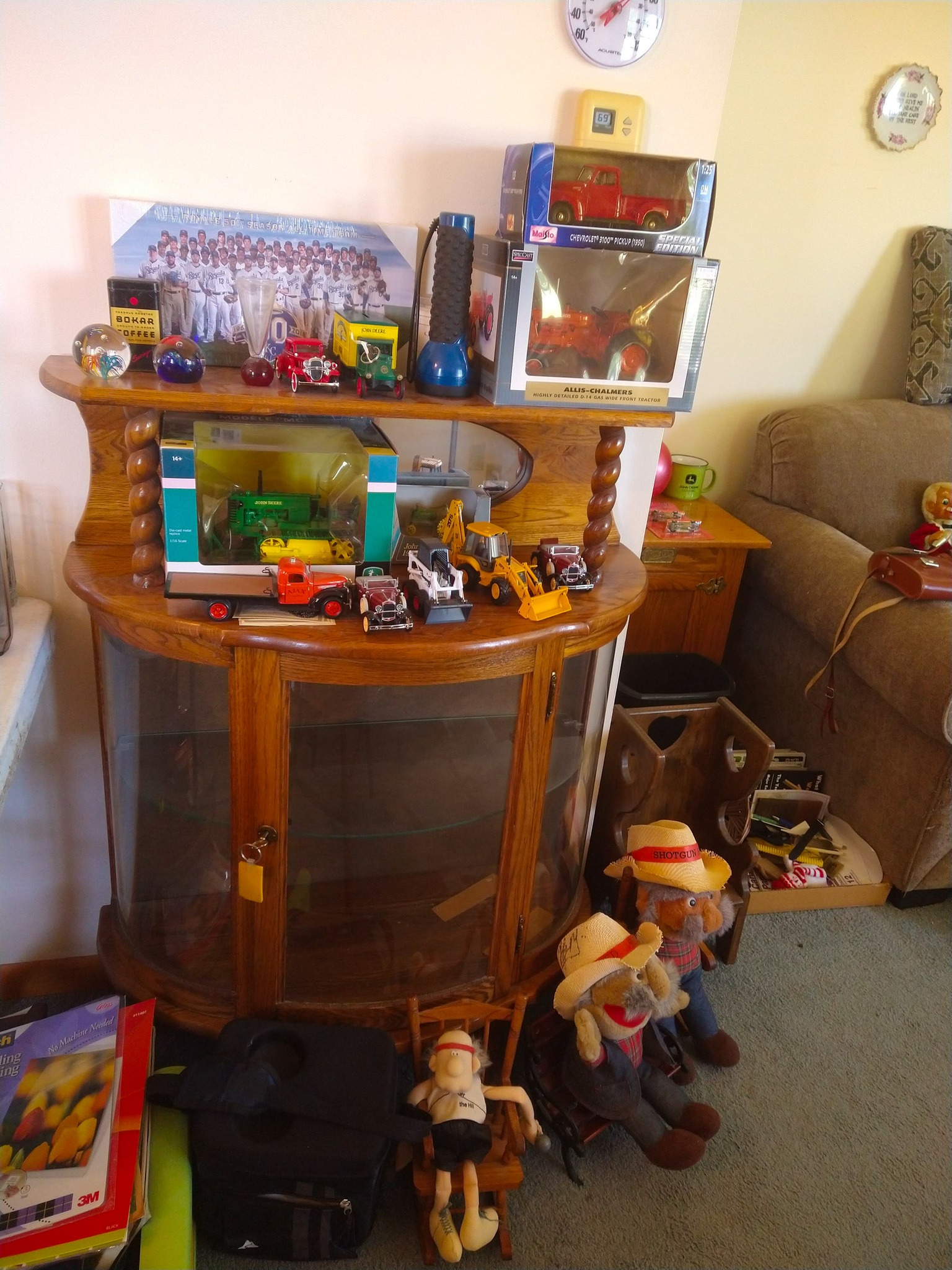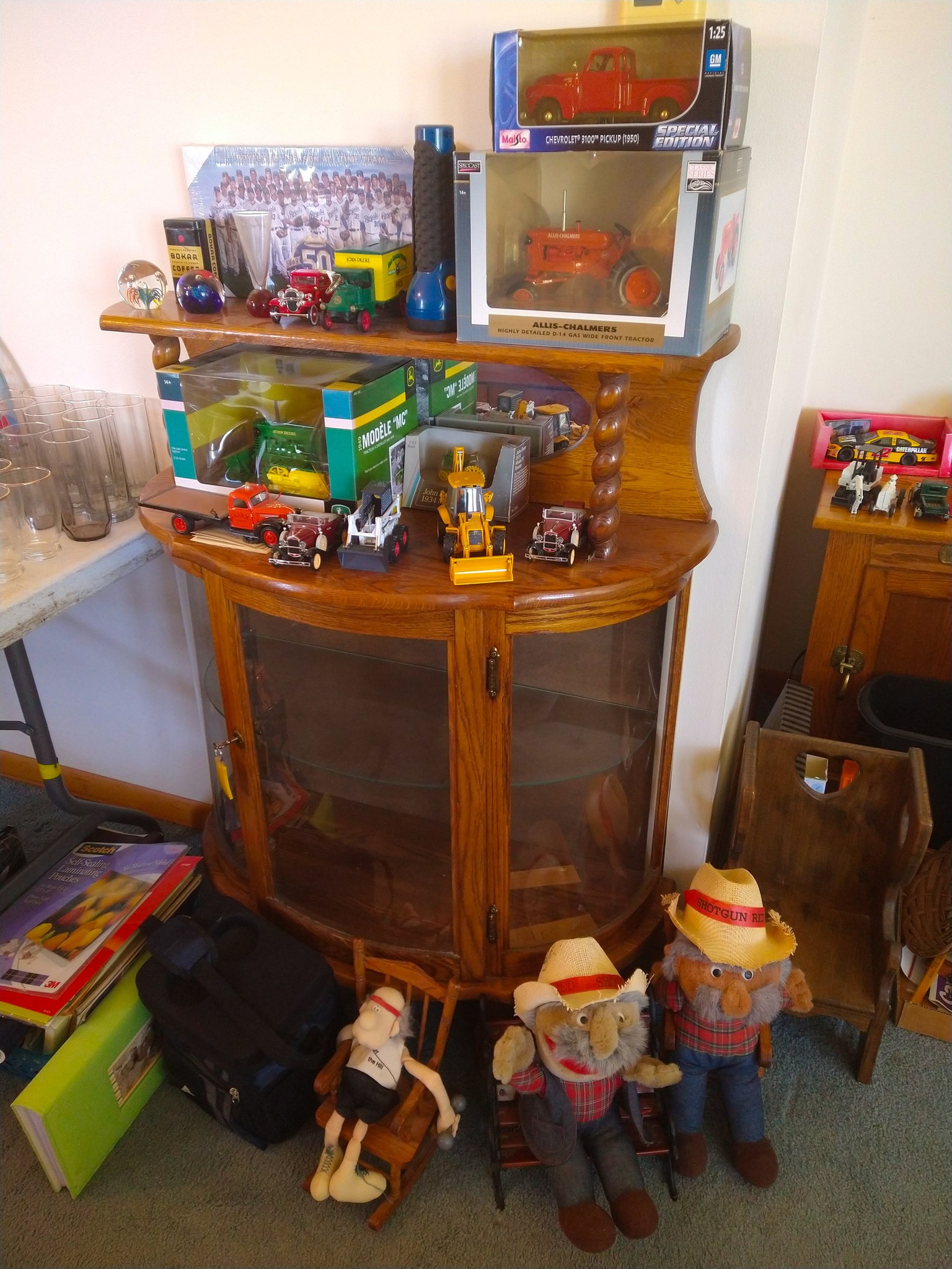 MODELS & MORE: ROCKIN ROUND SANTA, IN BOX – TONKA METAL JEEP TOW TRUCK – FORD EXPEDITION REMOTE CONTROL 1 / 16 SCALE RADIO CONTROL TRUCK – 1950 CHEVROLET PICKUP IN BOX – ALLIS CHALMERS D-14, GAS,WIDE FRONT END IN BOX – DEERE IMP CO TRUCK #103 BANK – R.F.D. CHIEF CAR – 1949 MC CROWLER TRACTOR w/ BOX – JD 1934 MODEL A TRACTOR w/ BOX – MODEL RODDSTER w/ RUMBLE SEAT – 2175 JCB LOADER, BACK HOE TRACTOR – BOBCAT LOADER – FLAT BED TRUCK – IRON TRACTOR – FORD MODEL A 1931 TRUCK – BOBCAT EXCAVATOR – WARD BURTON 2002 DODGE RACE CAR w/ BOX – 69 DODGE CHARGER, GENERAL LEE SPECIAL EDITION 1 OF 2000 – AUTOGRAPHED SHOT GUN RED DOLL – BATTERY BARTENDER – OLD CHEVROLET CAR MODELS – THE GREAT ATLANTIC & PACIFIC TEA CO WAGON & HORSE – T BONES FIGURES – SPIRIT OF ST LOUIS PHONE BOOTH w/ PHONE –