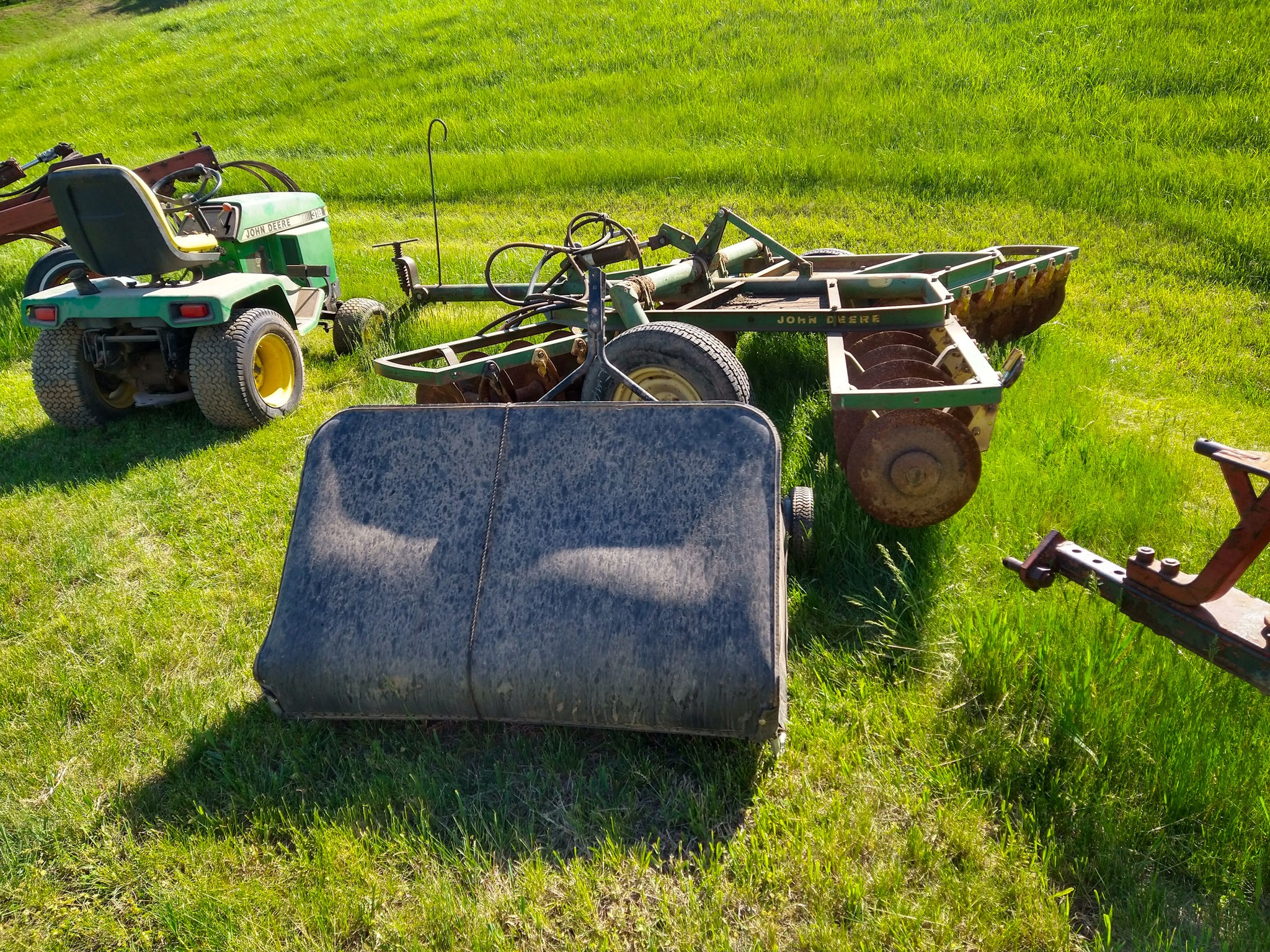 YARD & GARDEN: NICE TROY BUILT REAR TINE TILLER, B&S 5.5 HP ENG – JOHN DEERE #318 RIDING MOWER w/ 40 IN MOWER DECK – HAND CRAFTED BIRD HOUSE & OTHERS – FOLDING YARD CHAIRS – EARTH WAY PRECISION GARDEN SEEDER – BUYEES ATV SPREADER – HAND CRANK SEEDERS – AGRI FAB 2 WHEEL PULL SEEDER, SPREADER – PRESSURE SPRAYERS – SCOTTS HAND CRANK SEEDER – CHARCOAL CARRIER – POST AUGER – SMALL PUSH TILLER – FIMCO 2 WHEEL, 12 VOLT, PULL SPRAYER – METAL FRAME YARD SWING – AGRI FAB 4 FT YARD SWEEPER – SET POST JOBBERS –