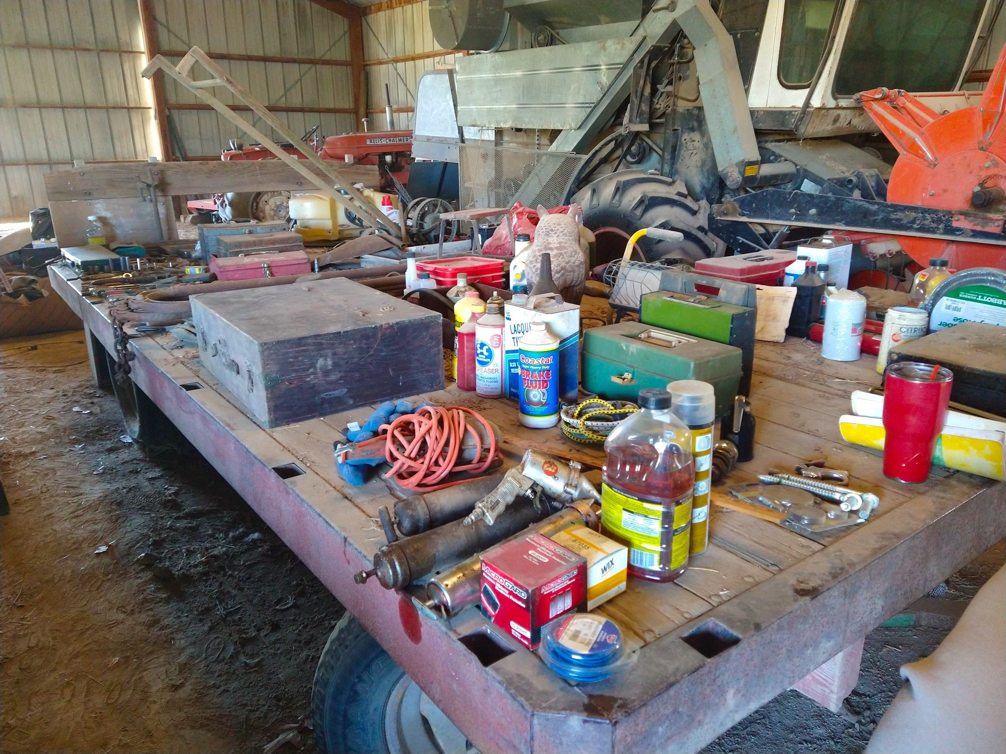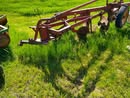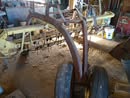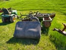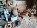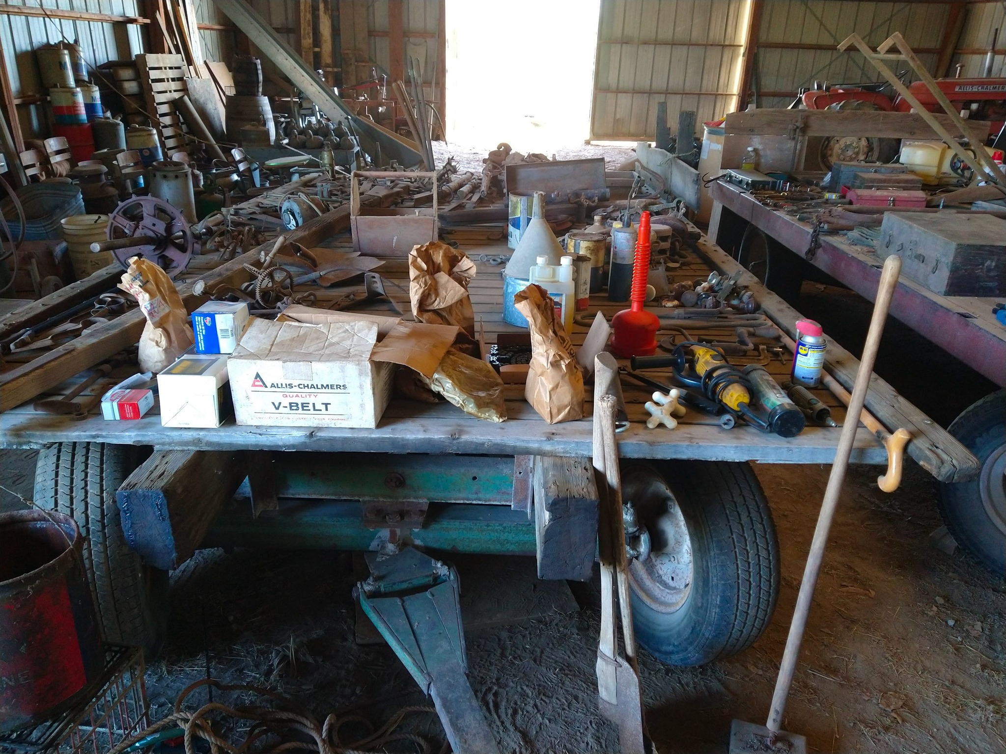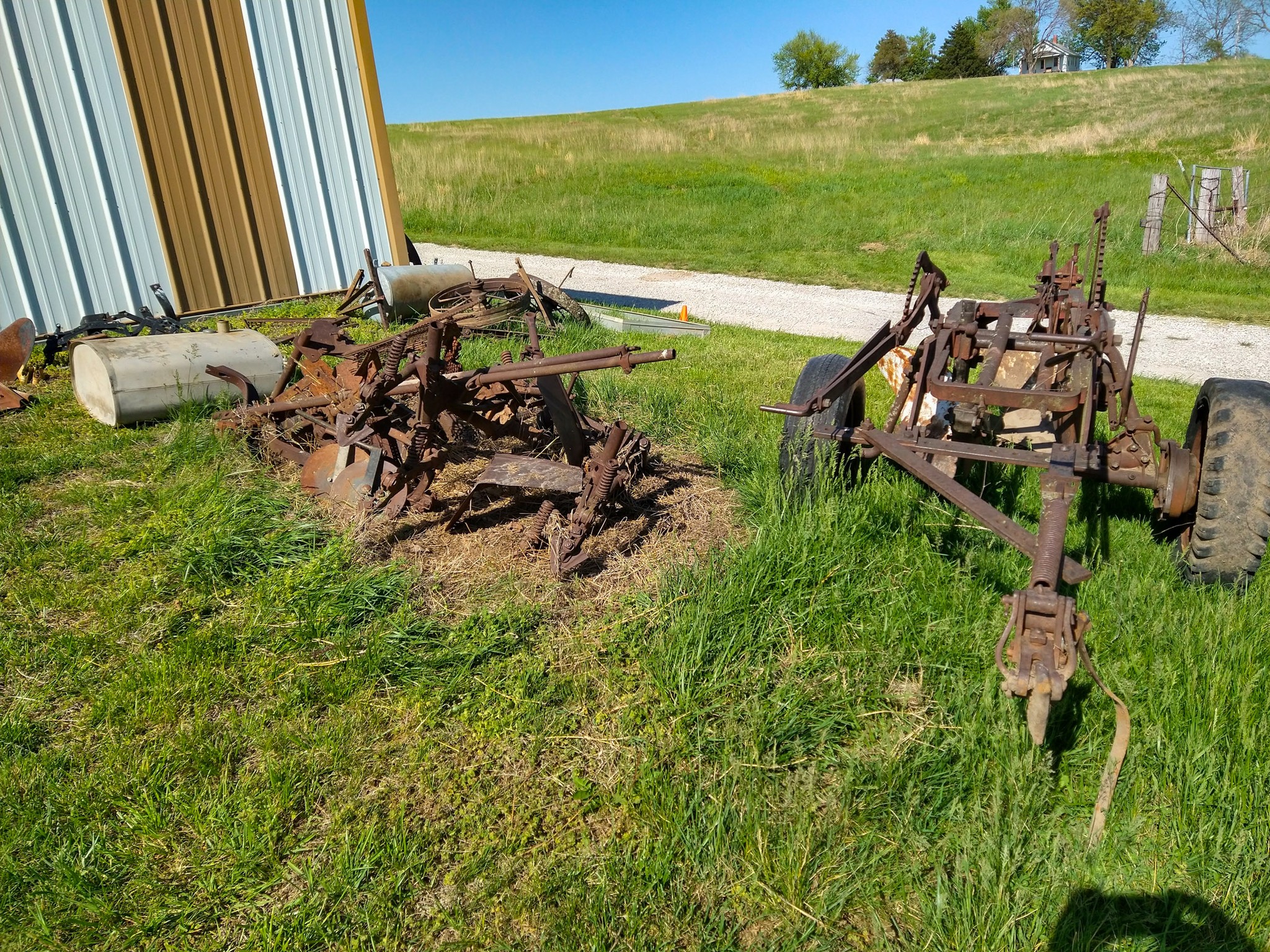 OLD MACHINERY & JUNK IRON: 2 BOTTOM PULL PLOW – CULTIVATOR PARTS – STEEL WHEEL GRAIN DRILL – 2 WHEEL FLAT BED TRAILER – 2 WHEEL PICKUP BED TRAILER – 26 IN SAW BLADE – COW STANCHIONS – OLD GAS ENGINE – MANY PIECES OF JUNK IRON –