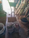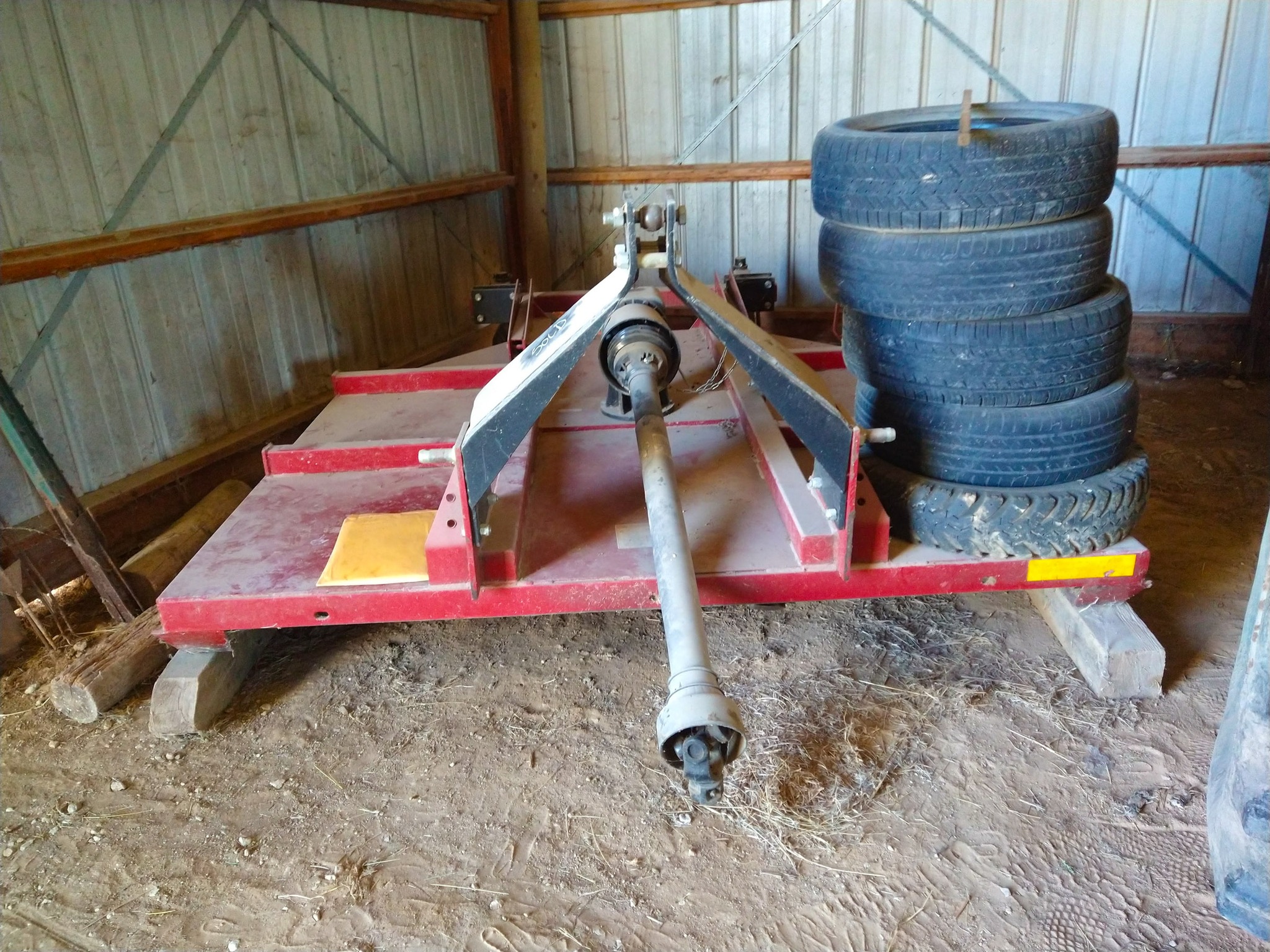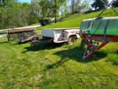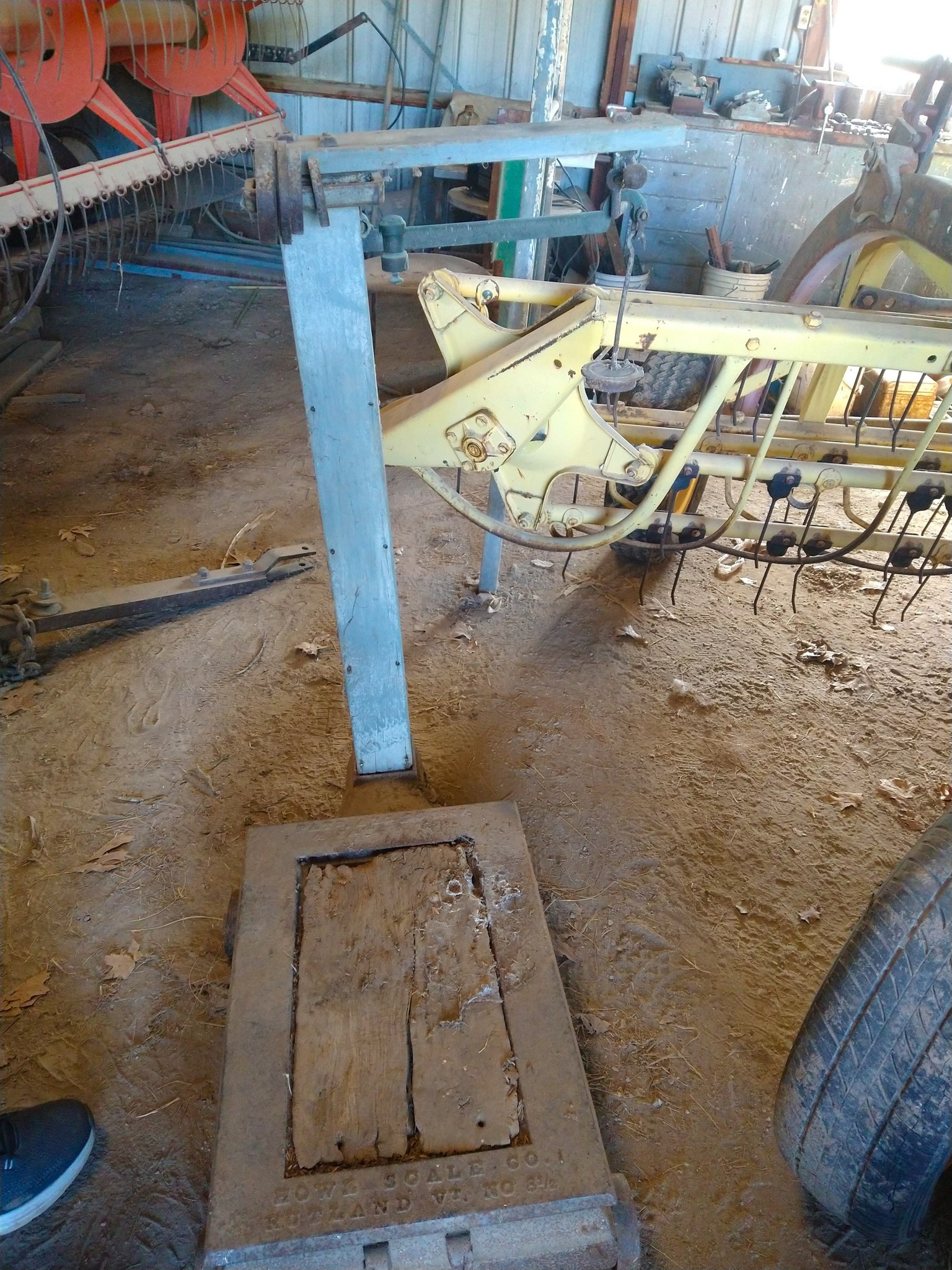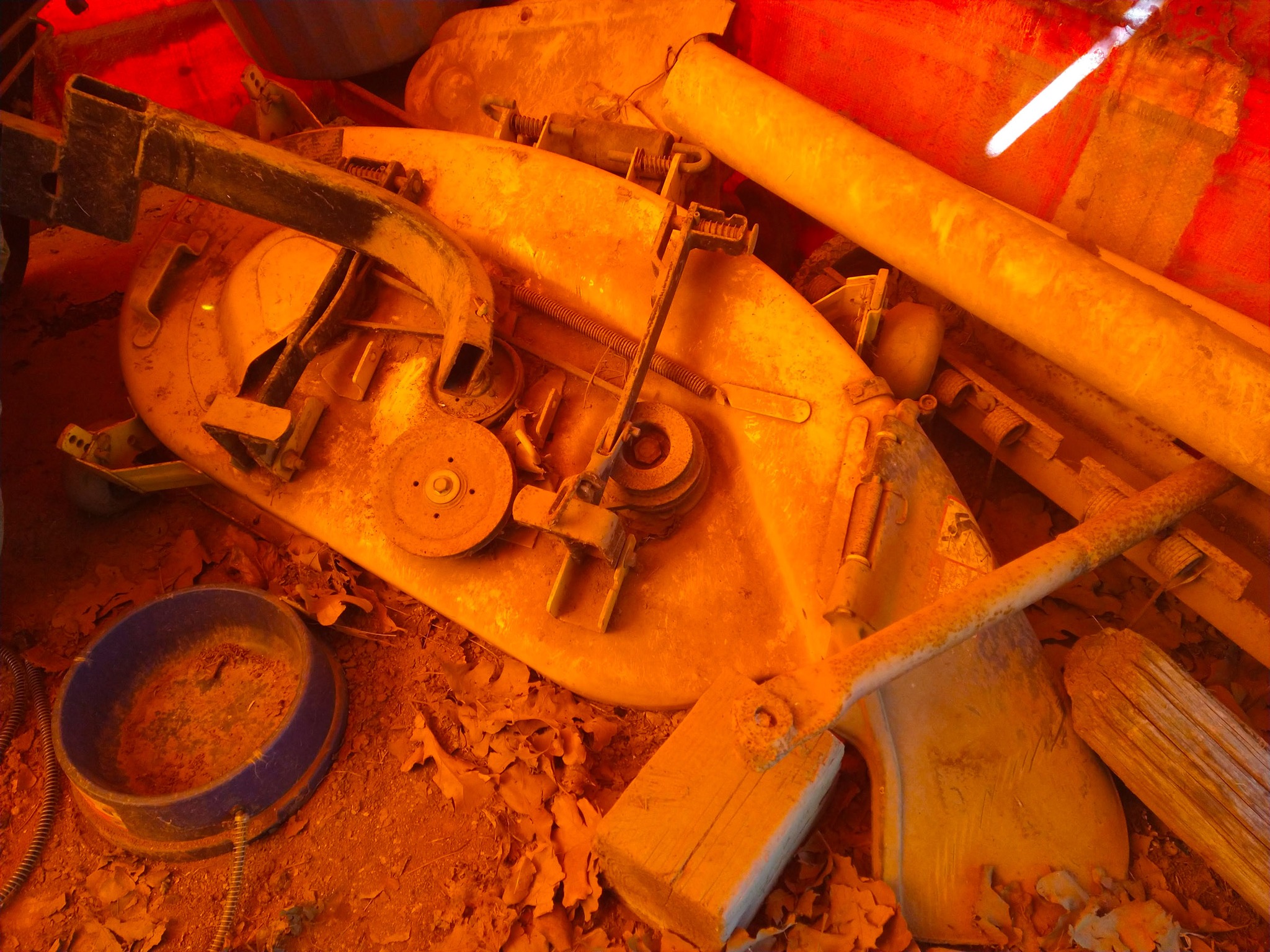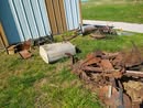 OLD MACHINERY & JUNK IRON: 2 BOTTOM PULL PLOW – CULTIVATOR PARTS – STEEL WHEEL GRAIN DRILL – 2 WHEEL FLAT BED TRAILER – 2 WHEEL PICKUP BED TRAILER – 26 IN SAW BLADE – COW STANCHIONS – OLD GAS ENGINE – MANY PIECES OF JUNK IRON –