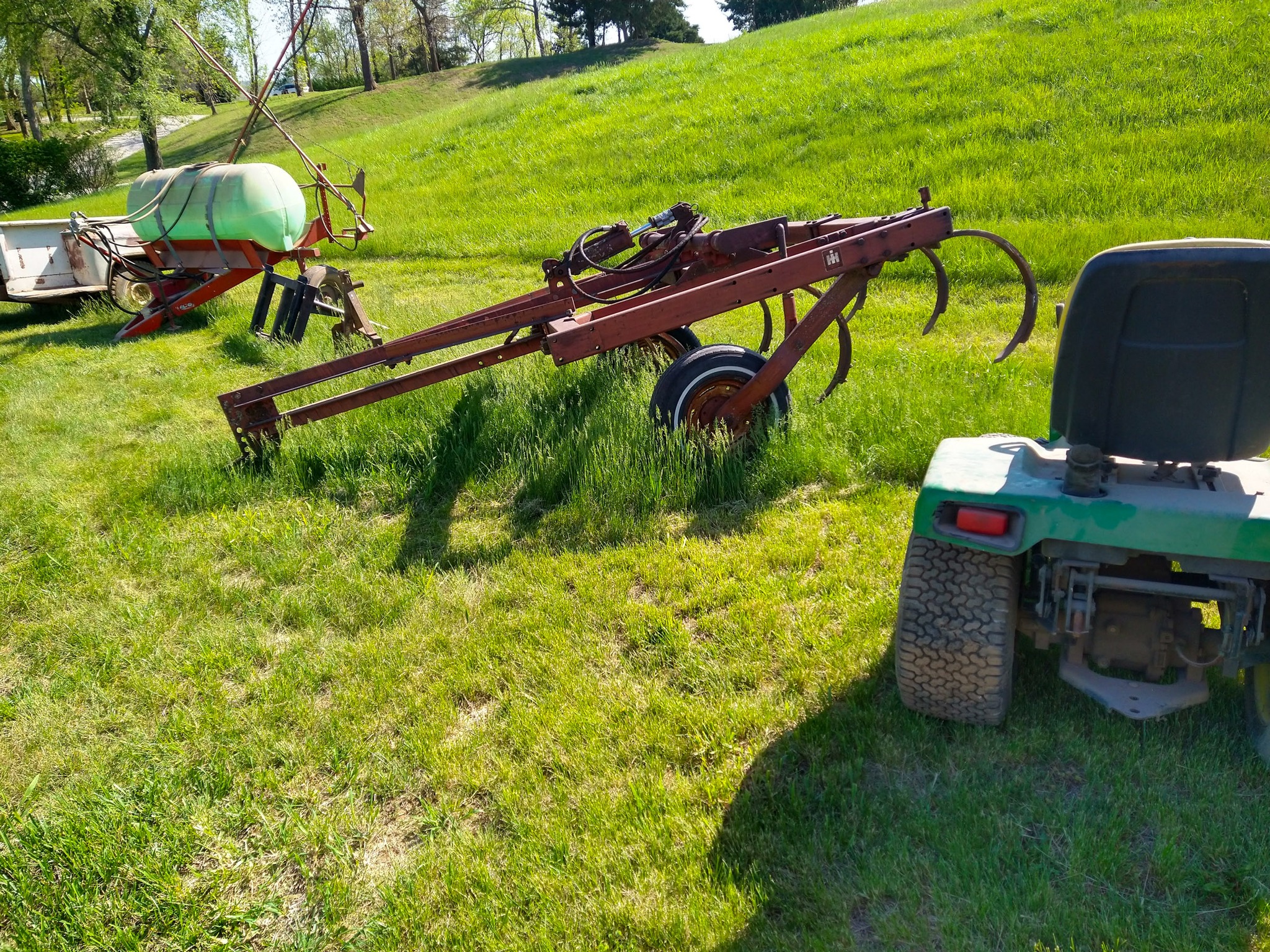 FARM MACHINERY & EQUIPMENT: JD 2 ROW PLANTER, PULL TYPE w/ SEED & FERT BOXES – CLEAN NEW HOLLAND #56 SIDE DELIVERY HAY RAKE – CLEAN ALLIS CHALMERS 3 PT 3 BOTTOM PLOW – 3 PT PTO SPREADER – 2 WHEEL FIELD SPRAYER w/ 21 FT BOOMS & POLY TANK – BALE SPEAR – 3 PT SKID LOADER – IHC 7 FT CHISEL PLOW 7 SHANK w/ HYD CYCLINDER – IHC #540 3 BOTTOM PULL PLOW – 12 FT METAL GAIN ELEVATOR – LARGE GRAIN FAN w/ ELECT MOTOR – VERY CLEAN HOWSE HVY DUTY 3 PT ROTARY MOWER – 2 JOHN DEERE 4 WHEEL WAGON GEARS w/ 14 FT FLAT BEDS – JD TRACTOR UMBRELLA – TRACTOR TIRE CHAINS – 300 GAL FUEL TANK w/ STAND –