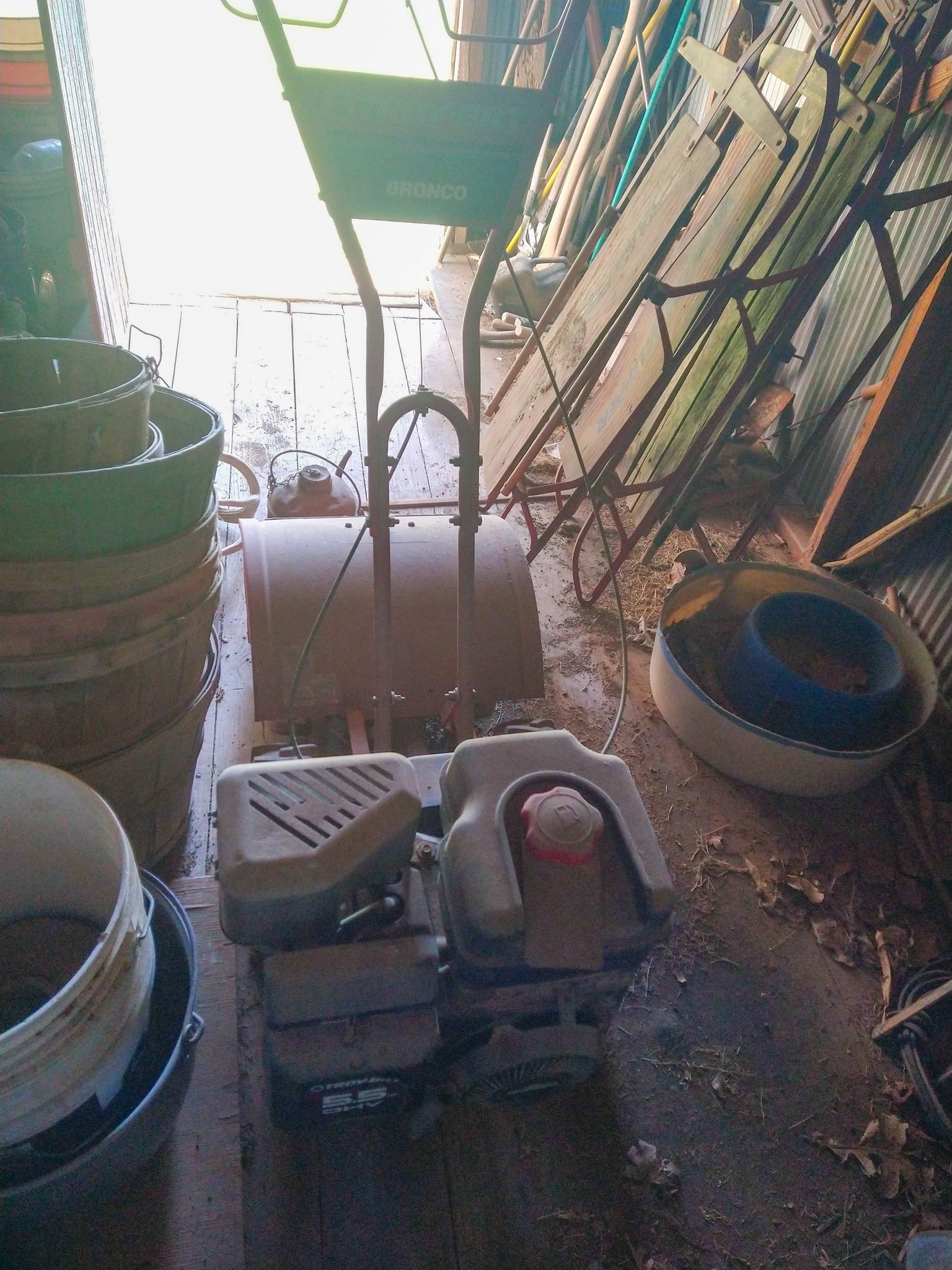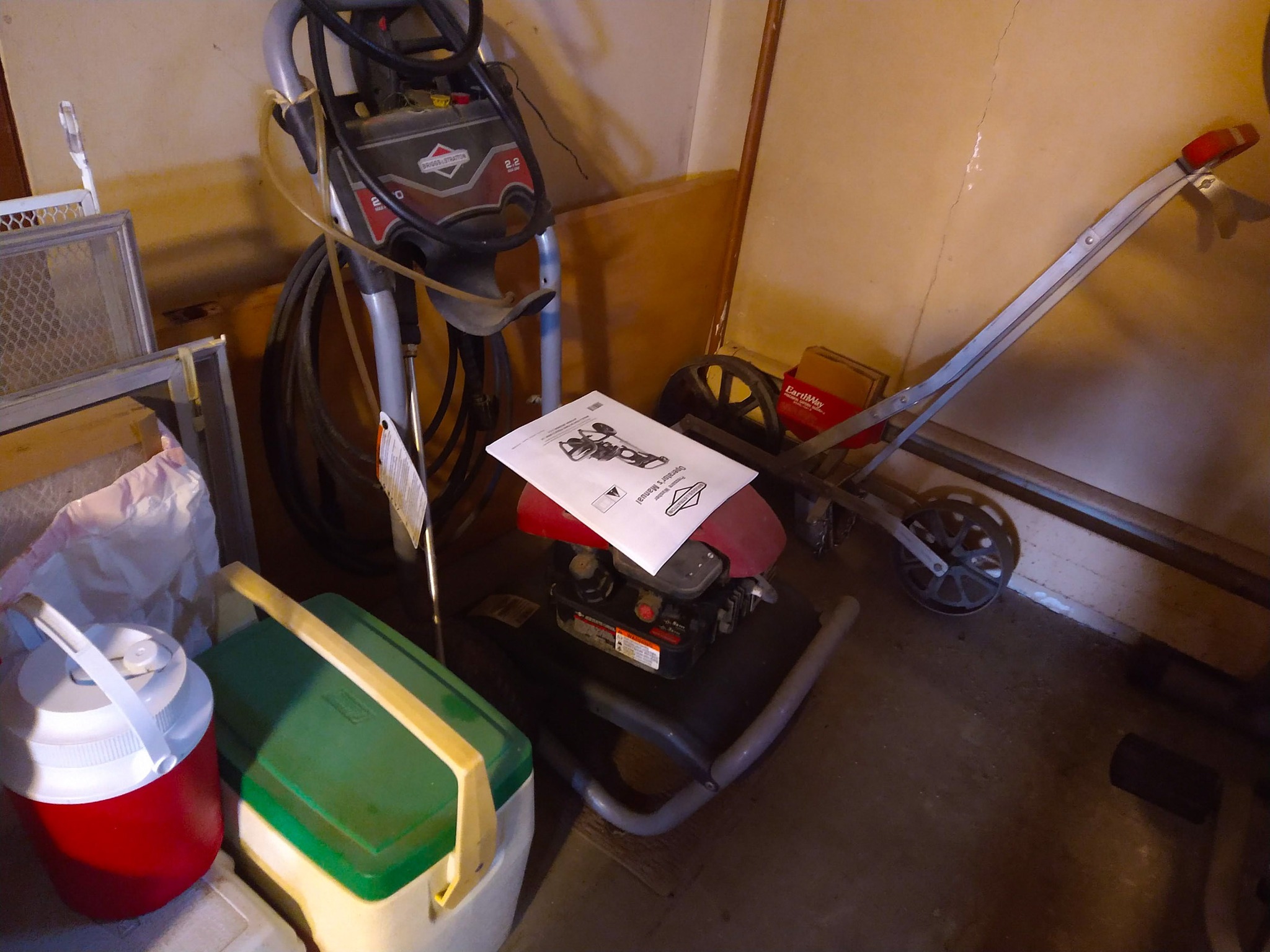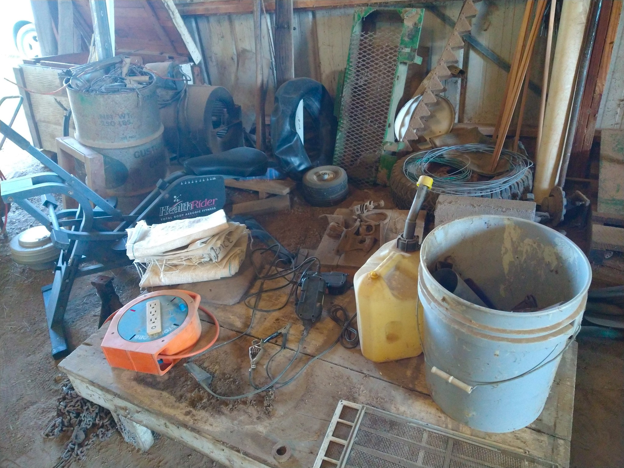 HAND & POWER TOOLS: BRIGGS & STRATTON 2200 POWER WASHER ON WHEELS w/ BOOK – SPRAY PAINT TANK – CRAFTSMAN 2.5 GAL WET & DRY VAC – SET CRAFTSMAN DRILL BITS 1 / 16 TO ½ IN w/ INDEX BOX – 2 DEWALT 18 VOLT DRILLS w/ BATTERY & CHARGERS & CASE – ½ IN TORQUE WRENCH w/ CASE – ADJ WRENCHES – ¼ IN DR SOCKET SET – S&K 3 / 8 & ½ IN RATCHETS – CRAFTSMAN ¼ TO 7 / 8 COMB WRENCHES – LOCK JOINT PLIERS – SET SNAP RING PLIERS – BROWN AIR PAINT GUN – 15 PIECE SAE & METRIC 3 / 8 IN DR SOCKET SET – PUSH DRILL – SET CRAFTSMAN 6 MM TO 17 MM COMB WRENCHES – PLANE – TOOL BOXES w/ ASST SOCKETS – CRAFTSMAN 6 GAL WET & DRY VAC – PTO PUMP – CARVING SET – NEW 10 IN SAW CHAIN – REMINGTON ELECT POLE SAW – CRAFTSMAN ½ IN IMPACT WRENCH – PUROX ACY TORCH & TIPS – WAGNER #775 HEAT GUN – 12 VOLT AG SPRAYER PUMP – VOLTS & AMP MUTI METER – HVY DUTY EXT CORD – RAKES – HOES – AXES – CORN KNIVES – HEDGE KNIFE – HATCHETS – SHOVELS – MOLE TRAPS – WRECKING BARS – 27 FT METAL EXT LADDER – ACYTELENE WELDING SET w/ BOTTLES, GAUGES, HOSE ON 2 WHEEL DOLLY – SCREW JACK – SEARS PORT AIR COMPRESSOR – 4 & 6 TINE PITCH FORKS – POST VISE – HYD BOTTLE JACK – SPLITTING WEDGES – HOMELITE 16 IN E.Z. GAS CHAINSAW – WIRE STRETCHERS – POST HOLE TAMPER – DEWALT 4 ½ IN ANGLE GRINDER – CRAFTSMAN ¼ IN AIR DIE GRINDER – C CLAMPS – METAL & WOOD PULLEYS – ¾ IN DR SOCKET SET w/ RATCHET & EXT – RATCHET DRIVER SET – HAMMERS – 8 IN RIGID PIPE WRENCH – ¾ IN DR BREAKOVER BAR – SHOP LIGHT – BELT TIE DOWN STRAPS – MECHANICS STOOL – WELLER SOLDER GUN – OLD WRENCHES – TROUBLE LIGHT – TRAILER BALLS – CRAFTSMAN AIR IMPACT WRENCH – SET PIPE THREADERS – SCHAUER 200 AMP BATTERY CHARGER – SCHUMACHER 200 AMP BATTERY CHARGER – WELDING HOODS – CRAFTSMAN 18 IN PIPE WRENCH – CHAIN BOOMERS – 5 ½ CRAFTSMAN BENCH VISE – PARMAK ELECT FENCE CHARGER – PARTS ORGANIZERS – TAP & DIE SET – LINCOLN 225 AMP ARC WELDER ON WHEELS – WALL MOUNTED DRILL PRESS – SLEDGES – CUB CADET HTC #550 HYD MOWER LIFT – TSC #58 ELECT FENCE CHARGER –