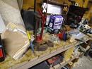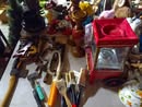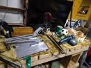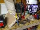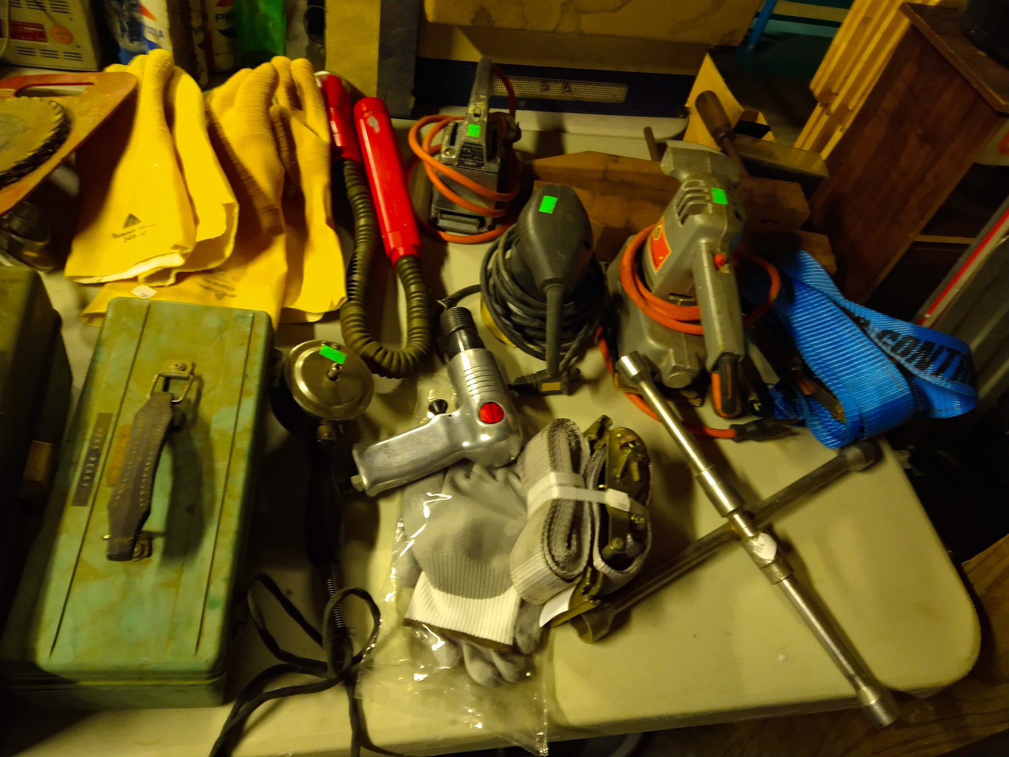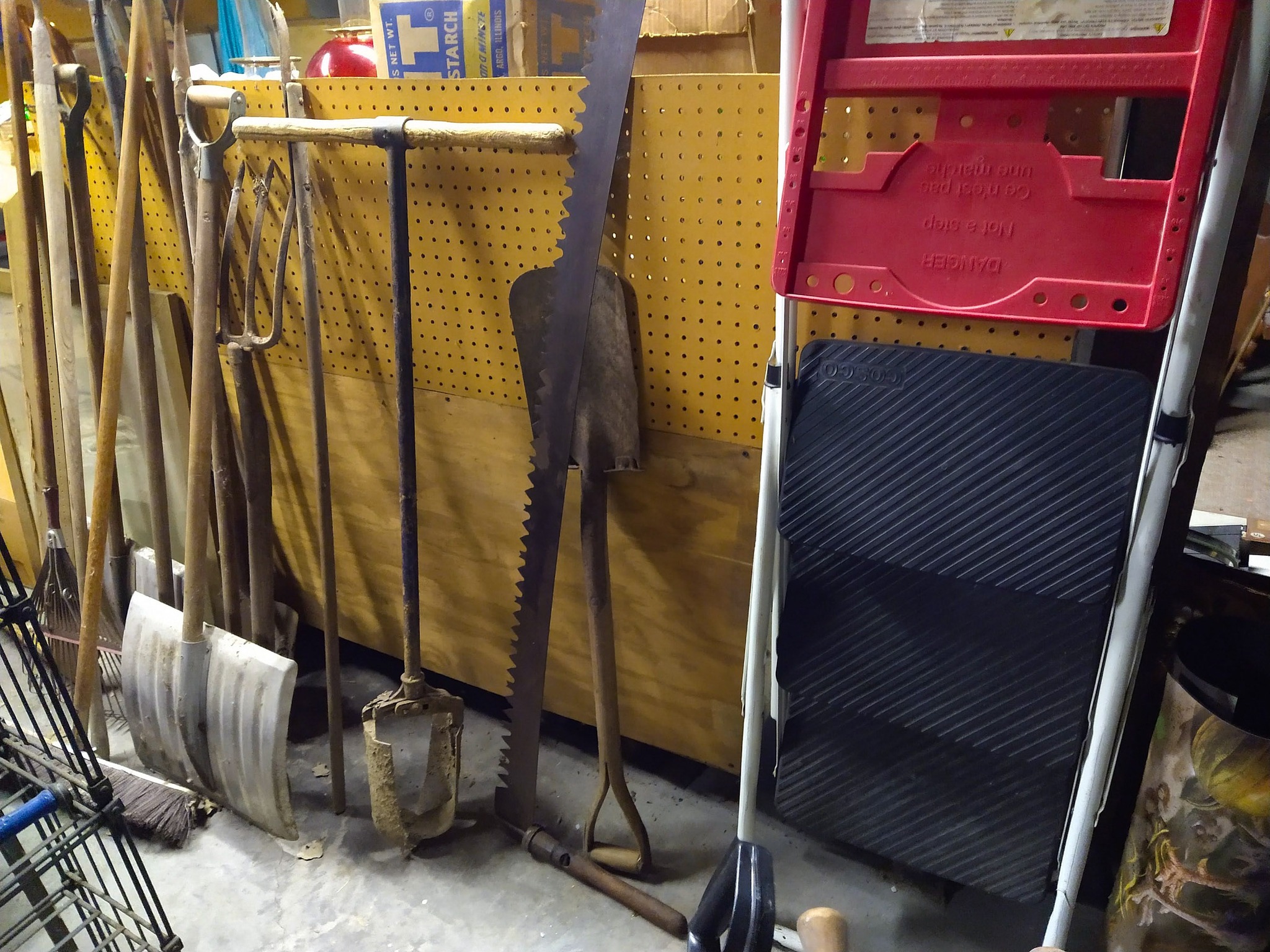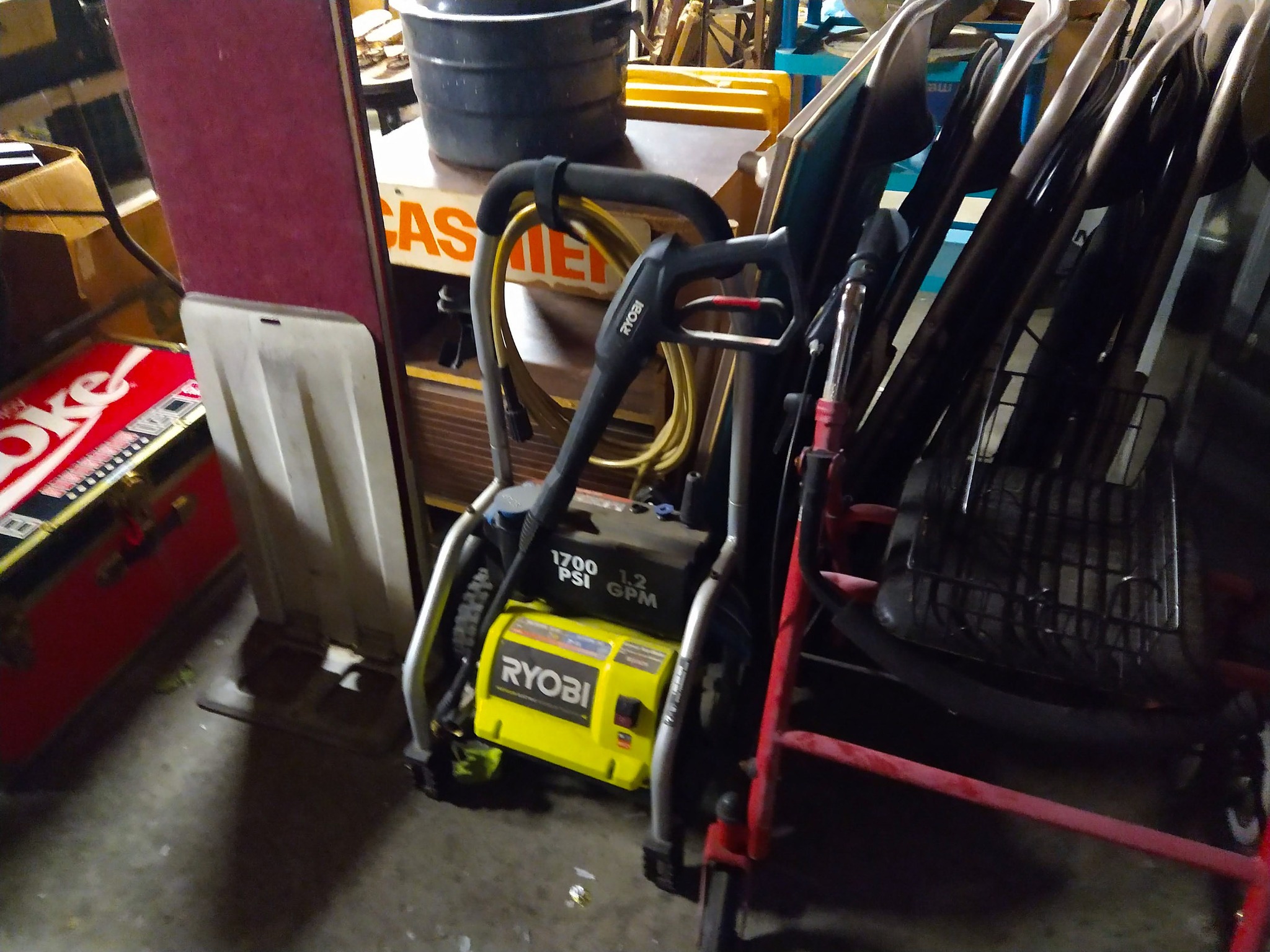 TOOLS: 26 FT METAL EXT LADDER – 2 PCS SCAFFOLD – HOES – SHOVELS – PICKS – 3 FT STEP LADDER – 8 FT WOOD STEP LADDER – EXT CORD w/ ROLLER – TOOL BOX – ASST HAND TOOLS – 12 DRAWER PARTS ORGANIZER – SHOP VAC – HARDWARE – HATCHETS – MONKEY WRENCH – WERNER 6 FT METAL STEP LADDER – 2 STEP FOLDING STOOL – TOOL BOX w/ TRAY – RYOBI POWER WASHER 1700 PSI ON ROLLERS – 2 WHEEL DOLLY – JORGENSEN WOOD CLAMP – B& D SANDER – CRAFTSMAN PALM SANDER – CRAFTSMAN AIR CHISEL – CIRC SAW BLADES – 5 IN AIR SANDER – DRILL BIT SHARPENER – LG HEAVY DUTY WORK BENCH – 3 TINE FORK – POTATO FORK – POST AUGER – COSCO FOLDING LADDER – CRAFTSMAN 16" SCROLL SAW – TOOL BOXES –