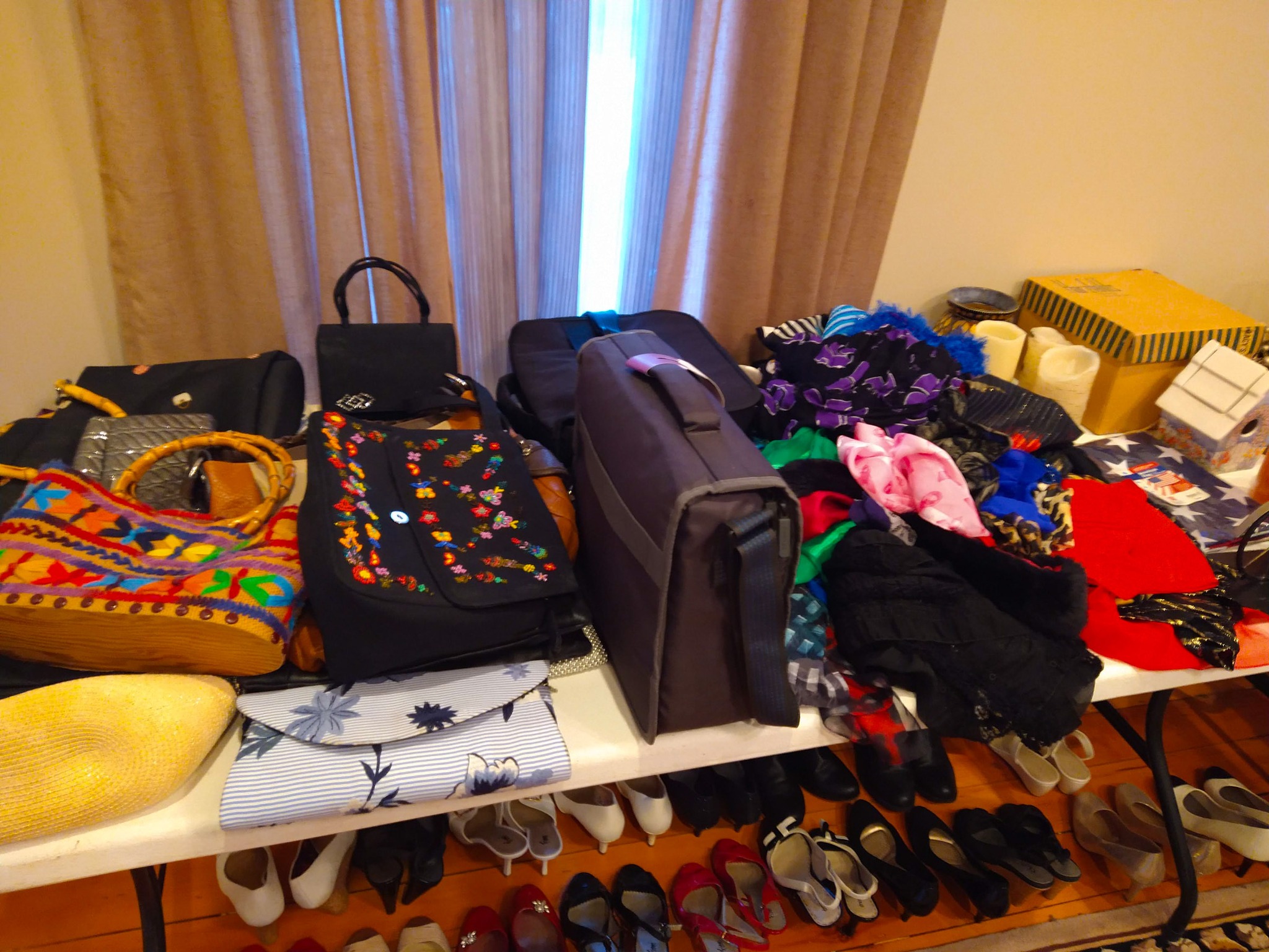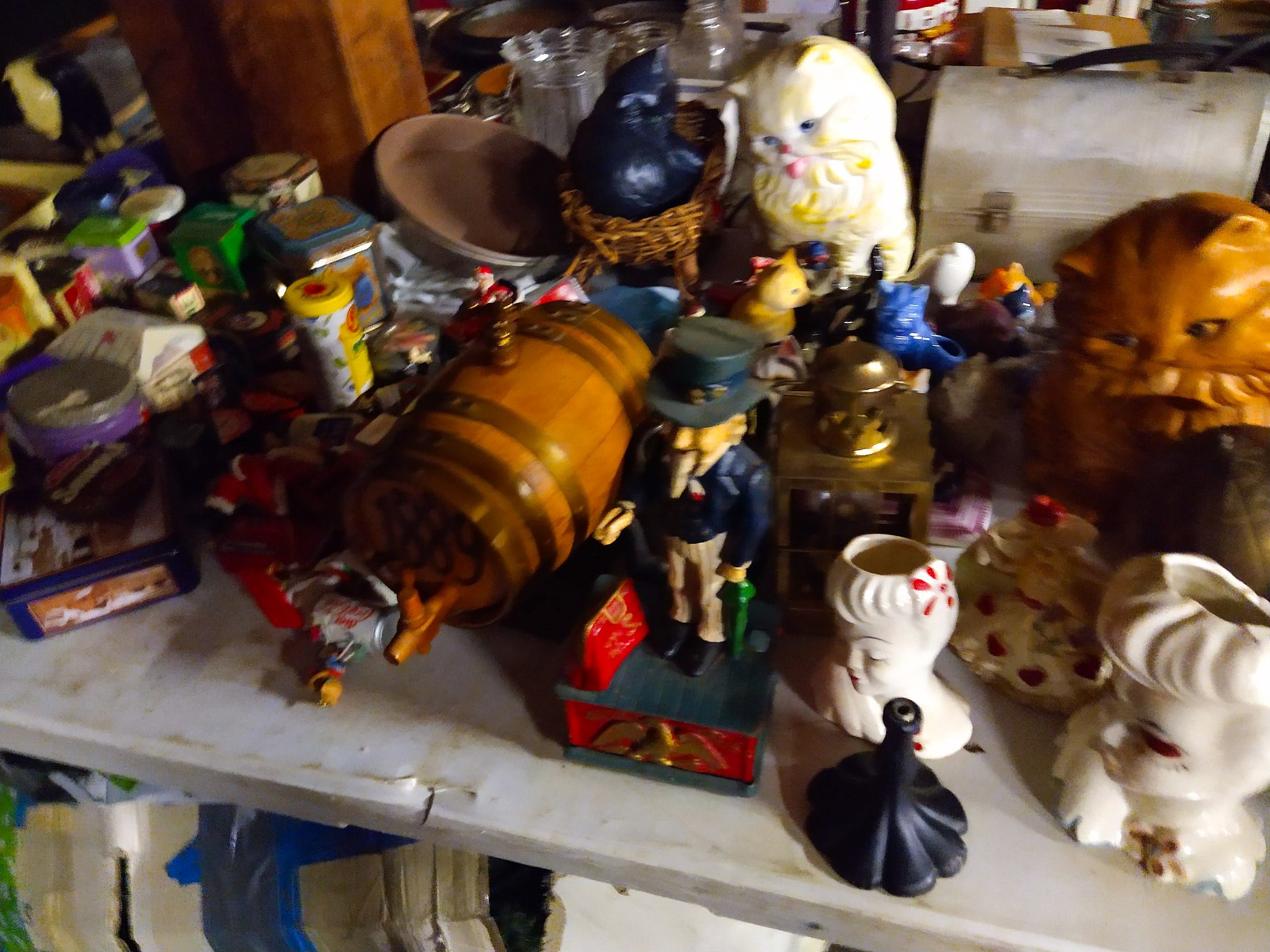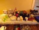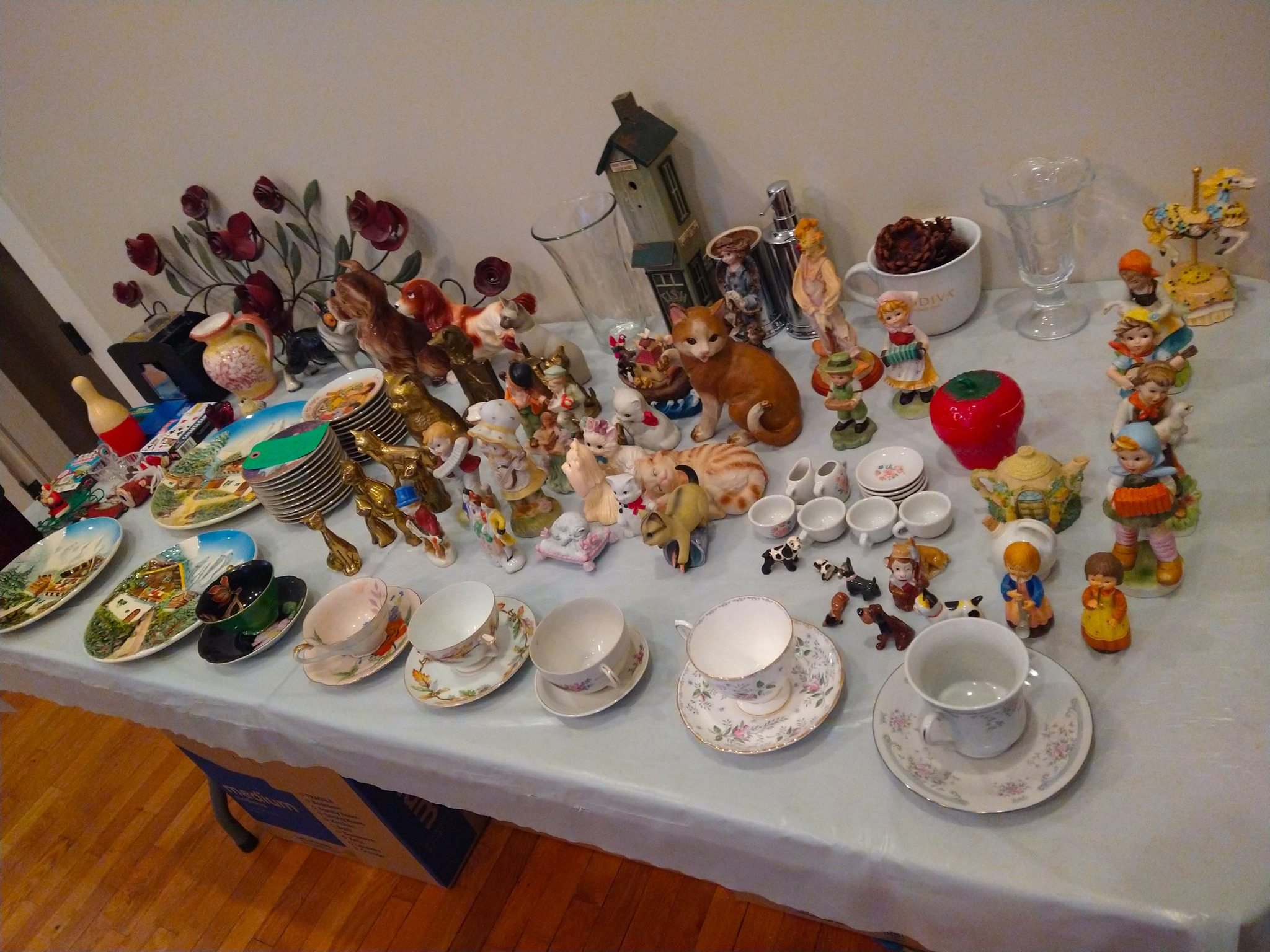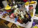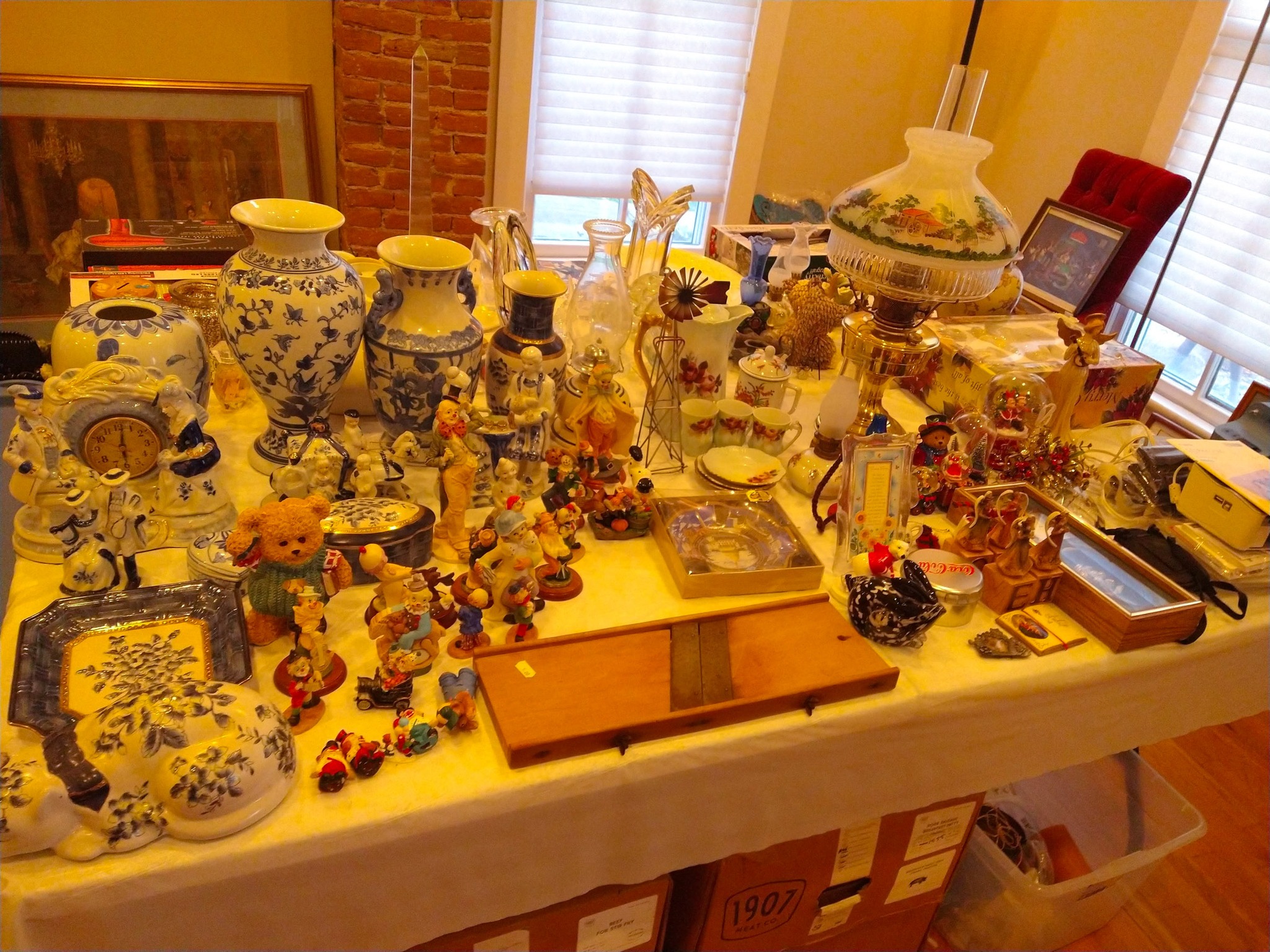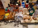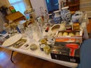 HOUSEHOLD: LADIES HANKIES – CLOTHES RACKS – NATIONAL # 25 PRESSURE COOKER – NESCO 18 QT ROASTER – ELECT POPCORN MACHINE – THREAD HOLDER – CORNING WARE – MINI TEA POTS – CAKE MOLDS – HB IRON – SEWING NOTIONS – COOKBOOKS – SET CHRIS MADDEN DISHES – SET XMAS DISHES – SET POINSETTA CHINA – GIBSON BOWLS, PLATES & GLASSES – MANY TEA POTS – MANY S&P SHAKERS – PATTERN GLASS PIECES – TEA KETTLES – SKILLETS – NICE 8 PLACE SET SOMERSET # 5317 CHINA – KNIFE BLOCK – GLASS PYREX PIE PANS – MR COFFEE MAKER – EGG PLATE – PYREX CASSEROLES – BAKING & CAKE PANS – ADV SPORT FIGURES PLATES – GERMAN HAND PAINTED PLATES – TUPPERWARE – BELLA BLENDER – OSTER DEEP FRYER – NESCO 4 QT ROASTER OVEN – BEER MUGS – DRINK GLASSES – HB CROCK POT – STAINLESS STEW POT – LINEN TABLE CLOTHS & NAPKINS – APRONS – BLANKETS – COMFORTER – ELECT NECK MASSAGER – ART DECO CLOCKS – MANY CLOCKS – CHRISTMAS FIGURES – BISQUE FIGURINES – FULL SET AVON MOTHERS DAY PLATES – METAL ART DECO WALL RACK – PORCELAIN VASES – MINI FIGURINES – GERMANY CHINA TEA SET – MINI OIL LAMPS – HEAVY ART GLASS PCS – GLASS ELEPHANTS – NEW BLOW DRYER – NEW ELECT KNIFE – MUSTACHE CUPS – LADIES PURSES – SCARVES – LADIES HATS – HAT BOXES – LADIES SHOES – ARTIFICIAL FLOWERS – WALL DÉCOR – CHAIR PADS – RED OVERLAY TALL VASES – PITCHER & BOWL SETS – 2 DRAWER CLOSE TOP SEWING BASKET – WICKER DOLL SEAT – LARGE THREAD SPOOL HOLDER – MUSICAL XMAS FIGURES – WOMENS CLOTHES, COATS & JACKETS – HB IRON – 2 BURNER GAS GRILL – MUSHROOM CANISTER SET – PORCELAIN COLD PACKER – SNACK TRAYS w/ HOLDER –