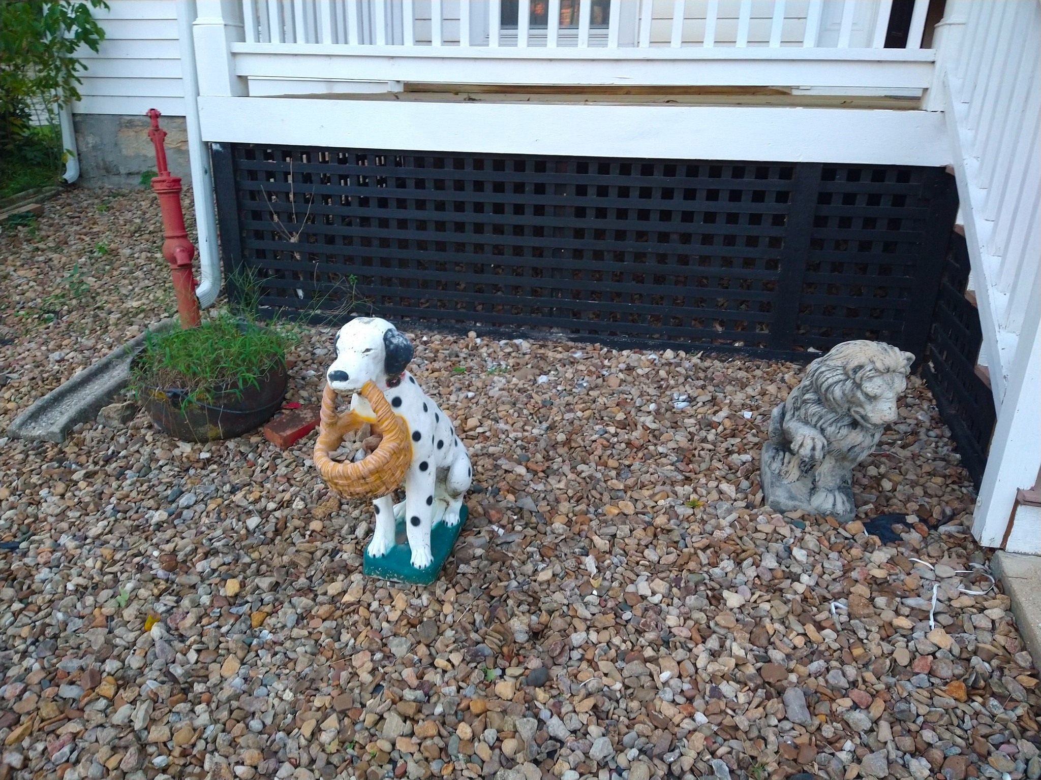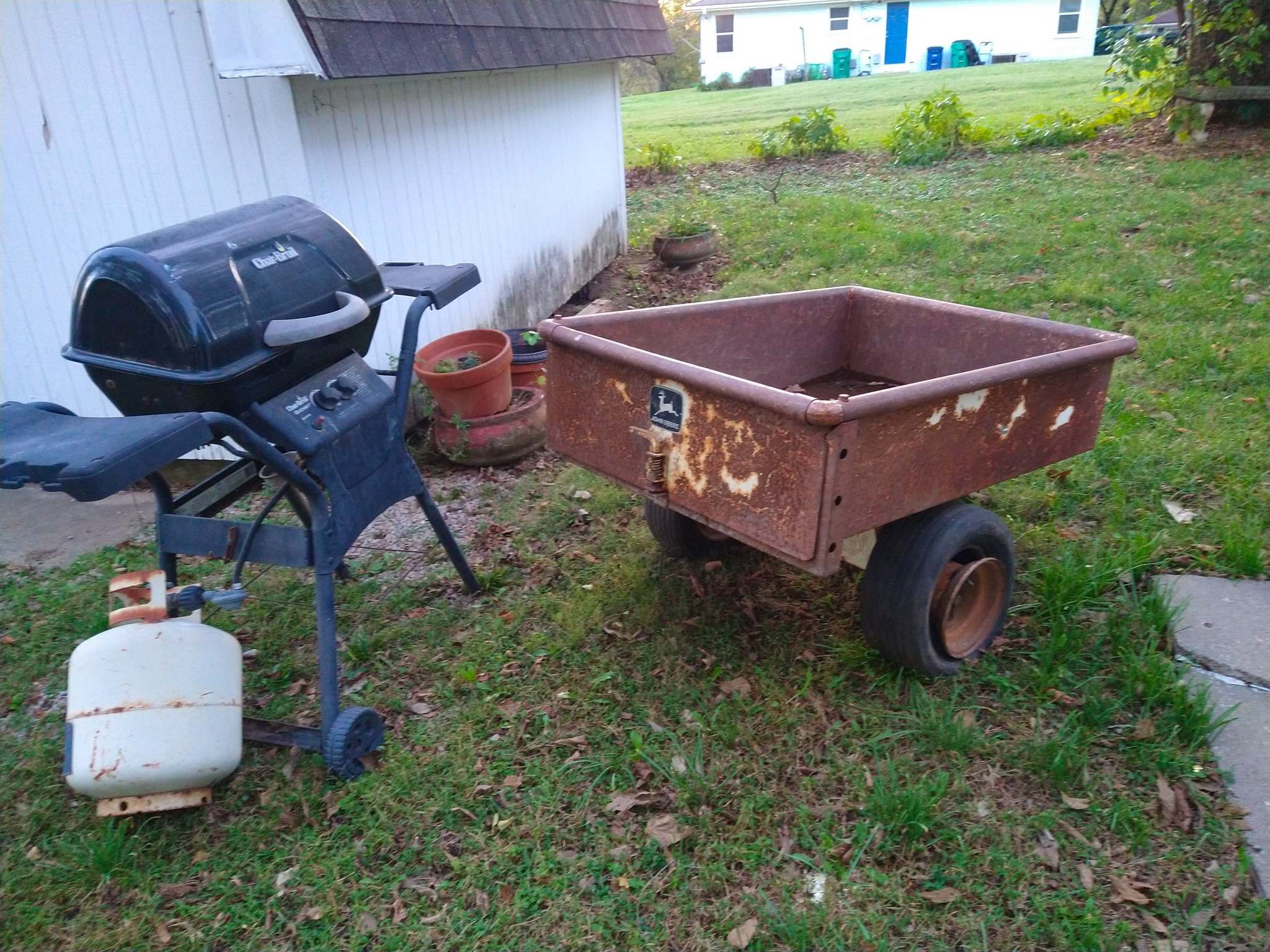 YARD & PATIO: CEMENT LIONS, FROGS, 4 DEER, DALMATION DOG w/ BASKET, CAT, RABBIT, - IRON CHAIR – NICE YARD WINDMILL – SUN GLOBE – PORCH BENCH w/ COCA COLA ADV – PLANTERS – WELL PUMP – BIRD BATH – BARBECUE GRILL – SWAN – 2 WHEEL JD YARD TRAILER – PLANTERS – CEMENT BENCH – FOLDING YARD CHAIR – CROCK PLANTER – PRUNERS – CRAFTSMAN SELF PROP M-220 POWER MOWER w/ BAGGER – BIRD FEEDERS – HAND CRANK SEEDER – PICNIC TABLE – LG. FLOWER POT –