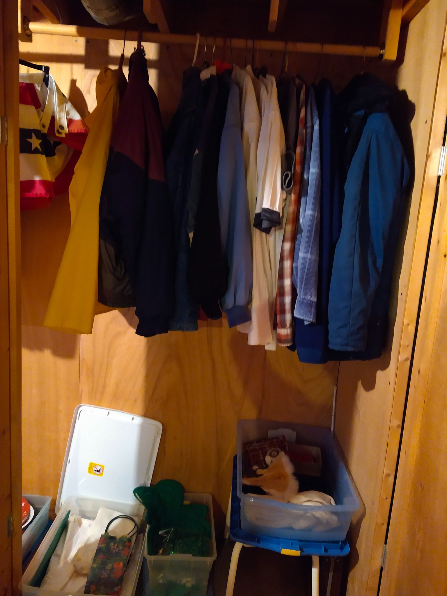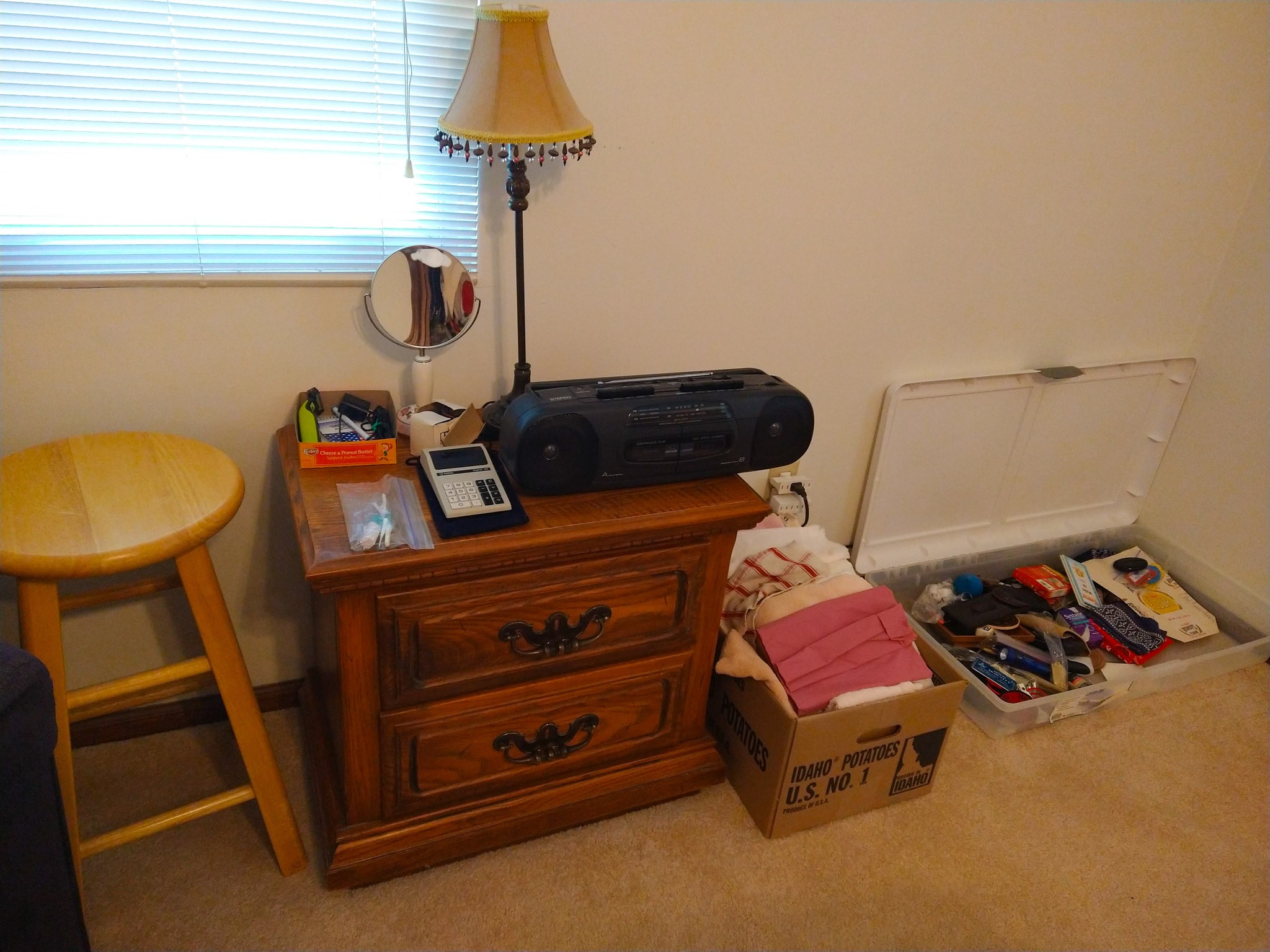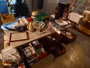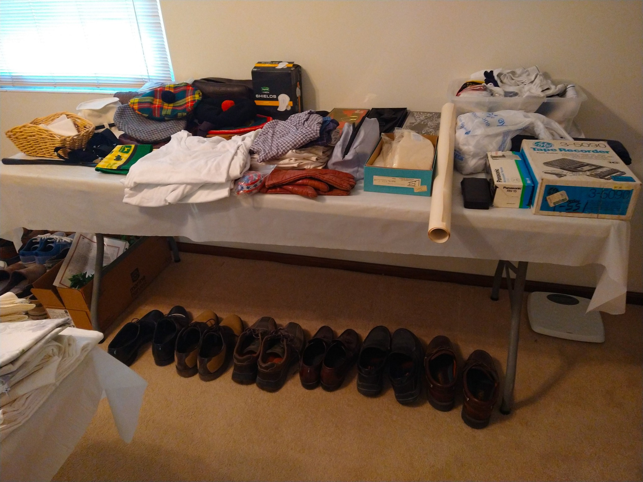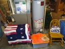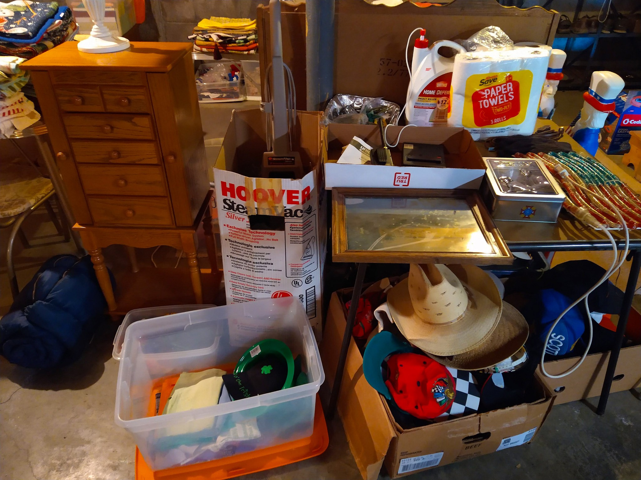 MISCELLANEOUS: GAS CANS – MILK CRATES – TRASH CAN w/ LID – BOX FAN – BBQ TOOL CADDY – REALISTIC 40 CHANNEL EMERGENCY CITIZEN BAND RADIO & CASE – COLEMAN ICE CHESTS – COLEMAN PROPANE LANTERN – TACKLE BOX w/ TACKLE – ZEBCO 113 ROD & REEL – ZEBCO ROCK ROD & REEL – FIRE EXT – 2 EA 4 TIER METAL SHELF – CHARCOAL HOD – PROPANE TANK – METAL STOOL – SIZE 10 RUBBER BOOTS – TOTES – CAMP PAD SLEEPING MAT – BROTHERS ELECT TYPEWRITER – REALISTIC 400 CHANNEL PRO 2206 SCANNER RECIEVER – SLEEPING BAG – LARGE OFFERING MENS CAPS & HATS – ELECT HOLIDAY FLAG – UNIDEN BEARCAT SCANNER BC350A – STUFFED ANIMALS – MANY MUSIC BOOKS – DOUBLE WIDE 5 TIER METAL SHELF – MENS & WOMENS CLOTHING & COATS – SHOES – BOOKS – MIDLAND READY RESCUE 77-911A, 4 WATT, 40 CHANNEL, 2 WAY CB RADIO w/ CASE – SIZE 11 INSULATED BOOTS – NEW 6 FT X 10 FT AMERICAN FLAG – SET 5 LB HAND WEIGHTS – METAL CASH BOX w/ TRAY – BAD MITTEN SET – LUGGAGE – ELECT HEATER – STEP STOOL – 3 UNCLE SAM FIGURES – 10 EA SMALL US FLAGS ON POLES – LASKO ELECT HEATER – WICKER PICNIC CASE – MENS TIES – MENS SHOES – SUSPENDER SETS – GE TAPE RECORDER – BLOOD PRESS MONITOR – STEAM ENG PICTURES & FRAMES – METAL MINI WINDMILL – CHIEFS, KU SPORT T-SHIRTS – DALLAS COWBOYS SWEATSHIRT – SHOE SHINE KIT – SHARP ELECT CALCULATOR – CURTIS AM / FM CD PLAYER – SONY CLOCK RADIO – WORLD GLOBE – VCR TAPES – DVDS – CD'S & RACK –