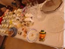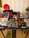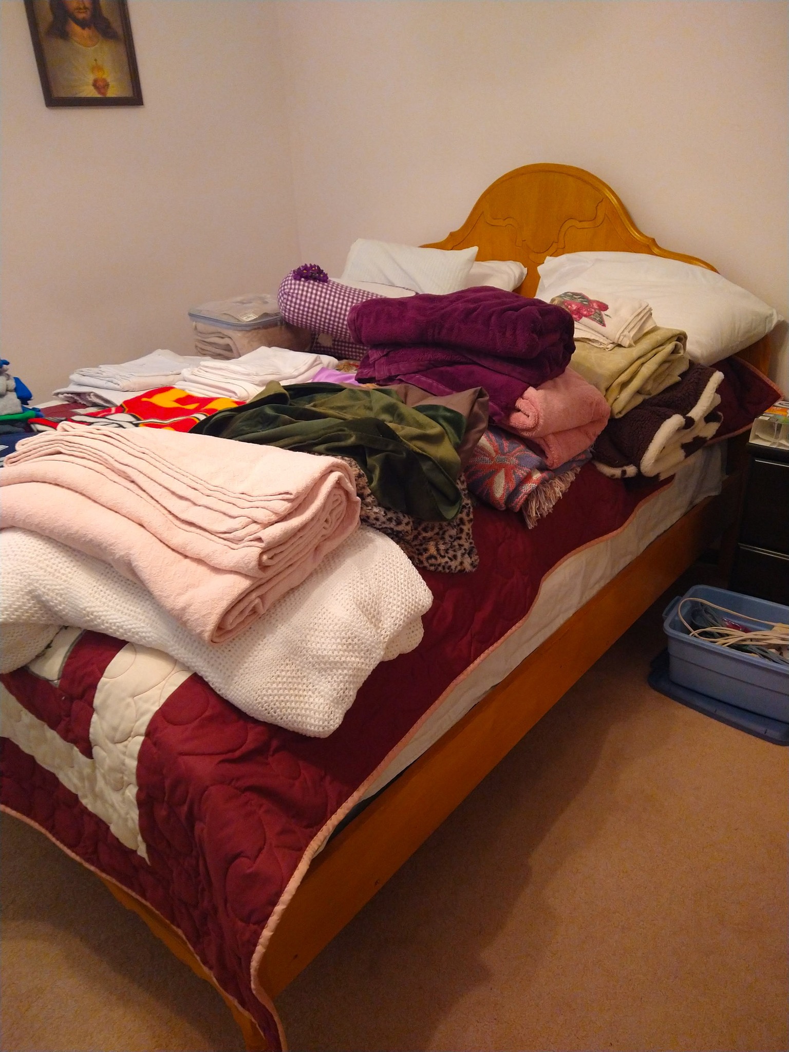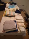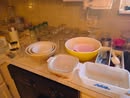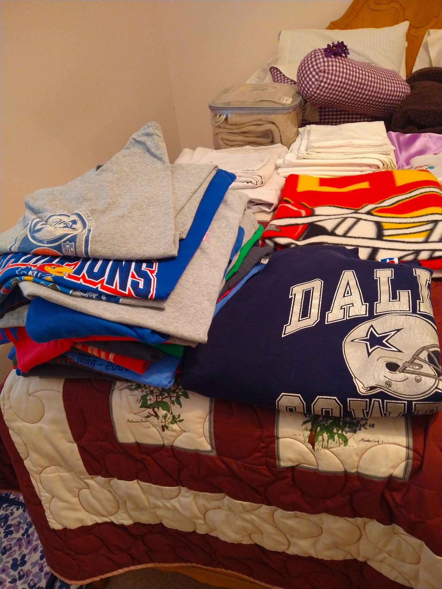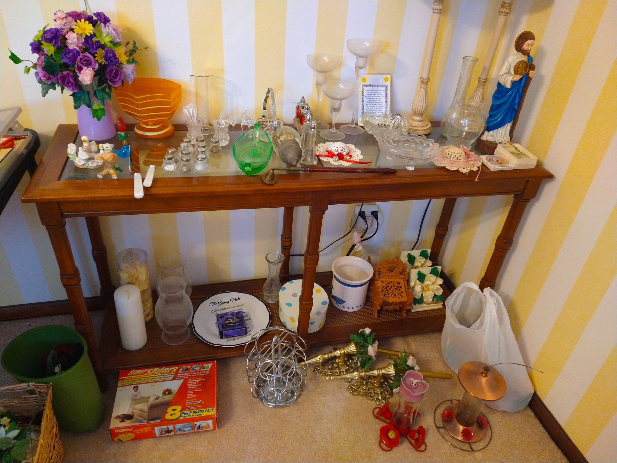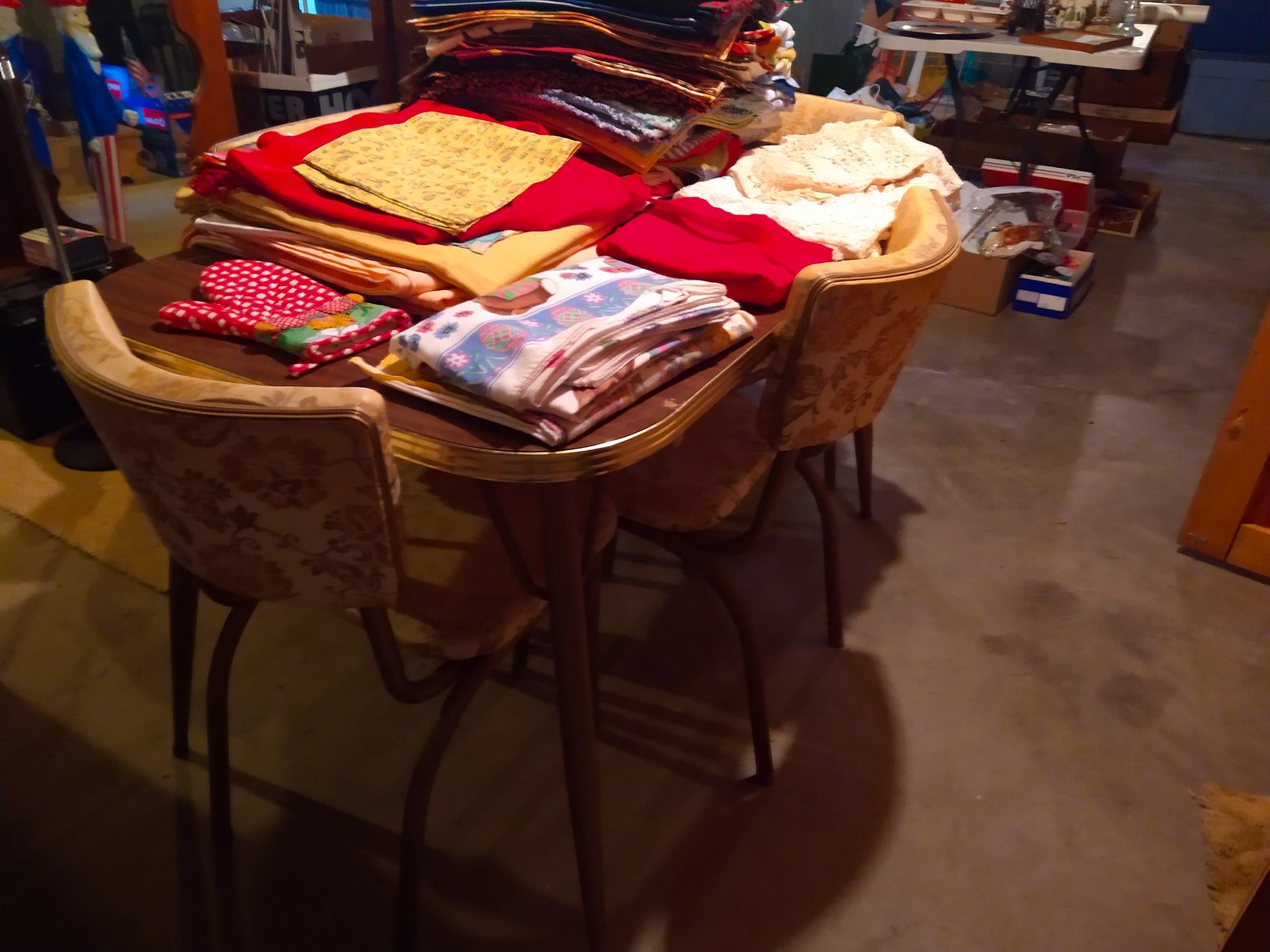 HOUSEHOLD: RAG RUGS – CLOTHES PIN BAG – LAUNDRY BASKETS – LAUNDRY SORTER – WICKER BASKETS – IRONING BOARD – STEMWARE - MUGS – SHOT GLASSES – ART FLOWERS – TOWELS – PRYEX WARE – CANNISTER SET – HVY CRYSTAL GL CENTER BOWL – TUPPERWARE – OSTER BLENDER – CORNING WARE w/ LIDS - MR COFFEE MAKER – WEST BEND FOOD PROCESSOR – STAINLESS STOCK POT – WHIRLY CORN POPPER – CANDLES – WIGS & HOLDERS – NAUTICA FULL FEATHER BED w/ CASE – BLANKETS – THROWS – AFGHANS – LINEN TABLE CLOTHS & NAPKINS – LINEN PLACEMATS – BREAD HOLDER – KRUPS COFFEE MAKER – NEW PEWTER LITE CARAFE – XMAS DECORATIONS & TREE – SNOW GLOBE – PICTURES & FRAMES – LACE DOILIES – APRONS – PAINTED COMPOTE – BOARD GAMES – B&D HAND MIXER – OVAL PICTURE w/ FRAME – NEW MOP & BUCKET – OIL LAMPS – ELGIN ANNIV CLOCK – PRESTO GRIDDLE – COVERED CAKE & PIE PANS – COLLANDER – BUNT CAKE & BAKING PANS – WEST BEND SLOW COOKER – H.B. ELECT KNIFE – EMERIL IRON SKILLET – FLOUR SIFTER – B&D TOASTER OVEN – AH MEASURE PITCHER – KITCHEN UTENSILS – RIVAL CROCK POT – REVERE WARE PAN – TEA KETTLE – GRANITE ROASTERS – GIAOA STAINLESS POT w/ LID – WESTBEND ELECT SKILLET – PORCELAIN PAN w/ LID – 3 PC PYREX BOWL SET – PYREX MIXING BOWL – 6 PLACE SET ROYAL WORCESTER CHINA & SERVING PCS – CORELLE WARE – BETTY CROCKER HAND BLENDER – SET HAMPTON FORGE KNIVES w/ BLOCK – LOCK TOP CONTAINERS – HAND TOWELS – WASH CLOTHS – SHEETS & PILLOW CASES – ELECT THROW BLANKET – CHIEFS BLANKET – COOK BOOKS – ART GL BOWL – CANDLE HOLDERS – SERVANT BELL – NOBILITY SERVING CHINA – WILLIAM ROGERS S.P. FLATWARE – REED & BARTON S.P. FLATWARE – SMALL CRYSTAL BASKET – LAMP w/ CATS – AH & PYREX GLASS PIE PANS -