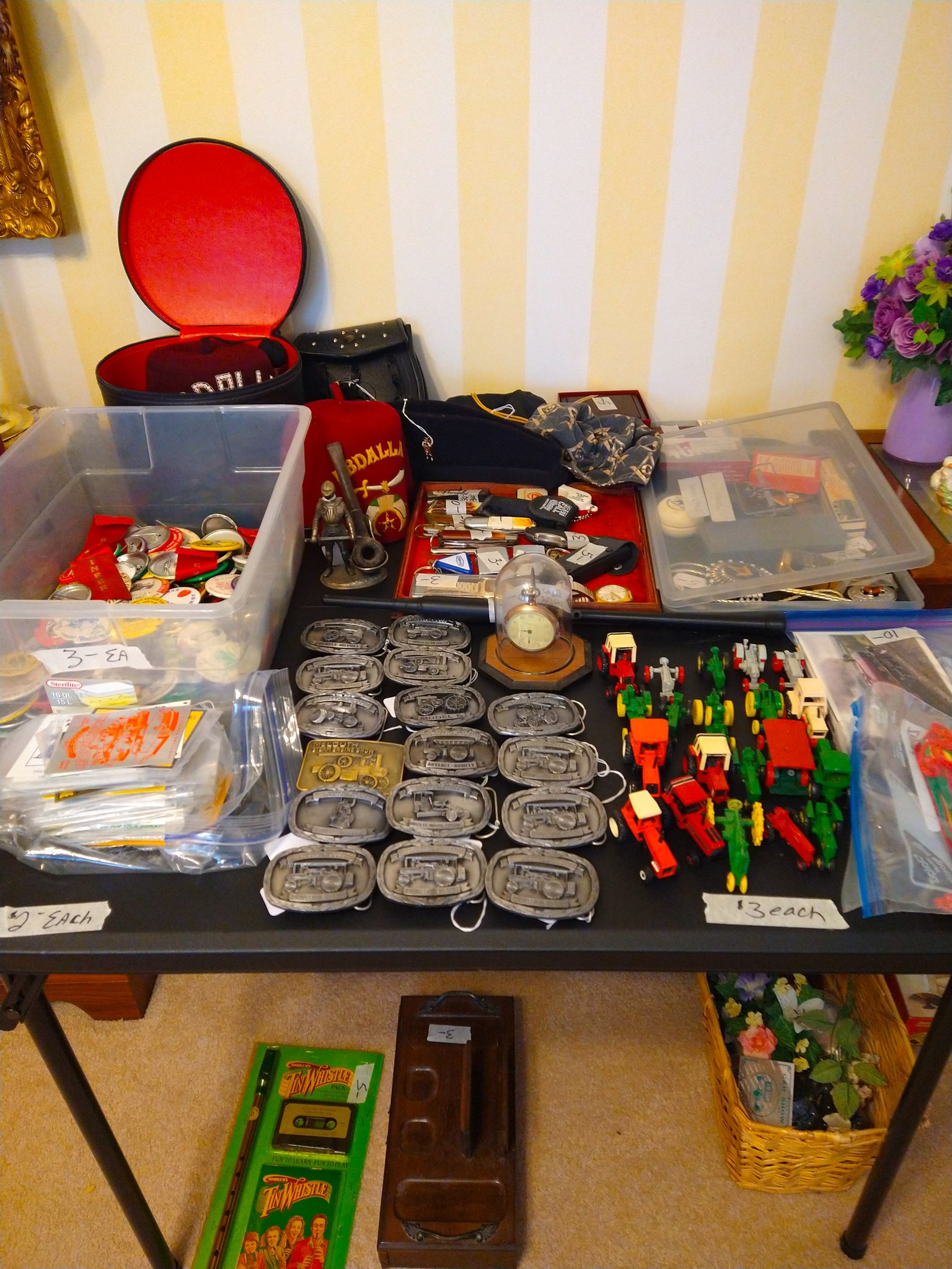 ANTIQUES & COLLECTIBLES: MCLOUTH THRESHING BEE BELT BUCKLES 1988 TO 1997 – THRESHING BEE PINS – ABDALLAH SHRINE FEZ w/ CASE – MASONIC HATS – JD MINI TRACTORS & STEAM ENGINS – IHC MINI TRACTORS – KNIGHT PIPE HOLDER – HOHNER HARMONICA – REMINGTON KNIFE – BUCK # 313 KNIFE – GERBER & HOLUB POCKET KNIVES – 1902 ELGIN POCKET WATCH – GALVANIZED SPRINKLER CANS – METAL MODEL STEAM ENGINE – ½ WOOD BARREL – PITCHER PUMP – GALVANIZED BUCKET – PLUMB HATCHET - LARGE OFFERING HALLMARK TRAIN & BIRD ORNAMENTS IN ORIG BOXES – HALLMARK LIONEL 726 BERKSHIRE 20TH CENTURY SERIES GREAT AMERICAN RAILWAY SERIES – SETH THOMAS KEY WIND MANTLE CLOCK – NICE UTILITY TABLE w/ PORCELAIN TOP – IRON MODEL HUBER STEAM ENGINE – 27 DEMITASSE CUPS & SAUCERS – 9 EA FARMLAND MEMORIE PLATES – QUILTS – GREEN URANIUM DEP GLASS SERVER – GERMAN HAND CONCERTINA #502, 20 KEYS w/ CASE – DIE CAST 2019 FORD F-150 LARIAT CREW CAB, MODEL IN ORIG BOX 1.27 –